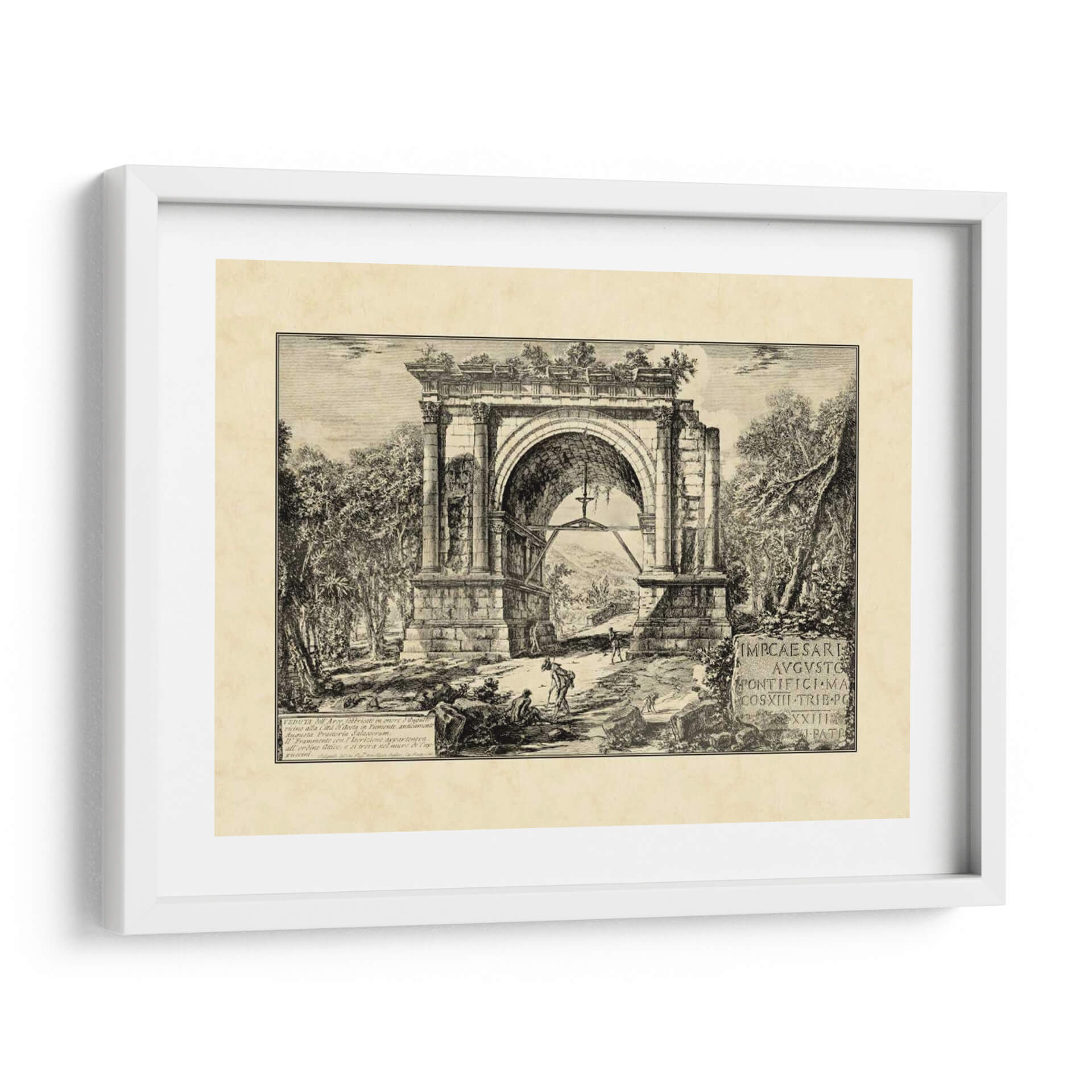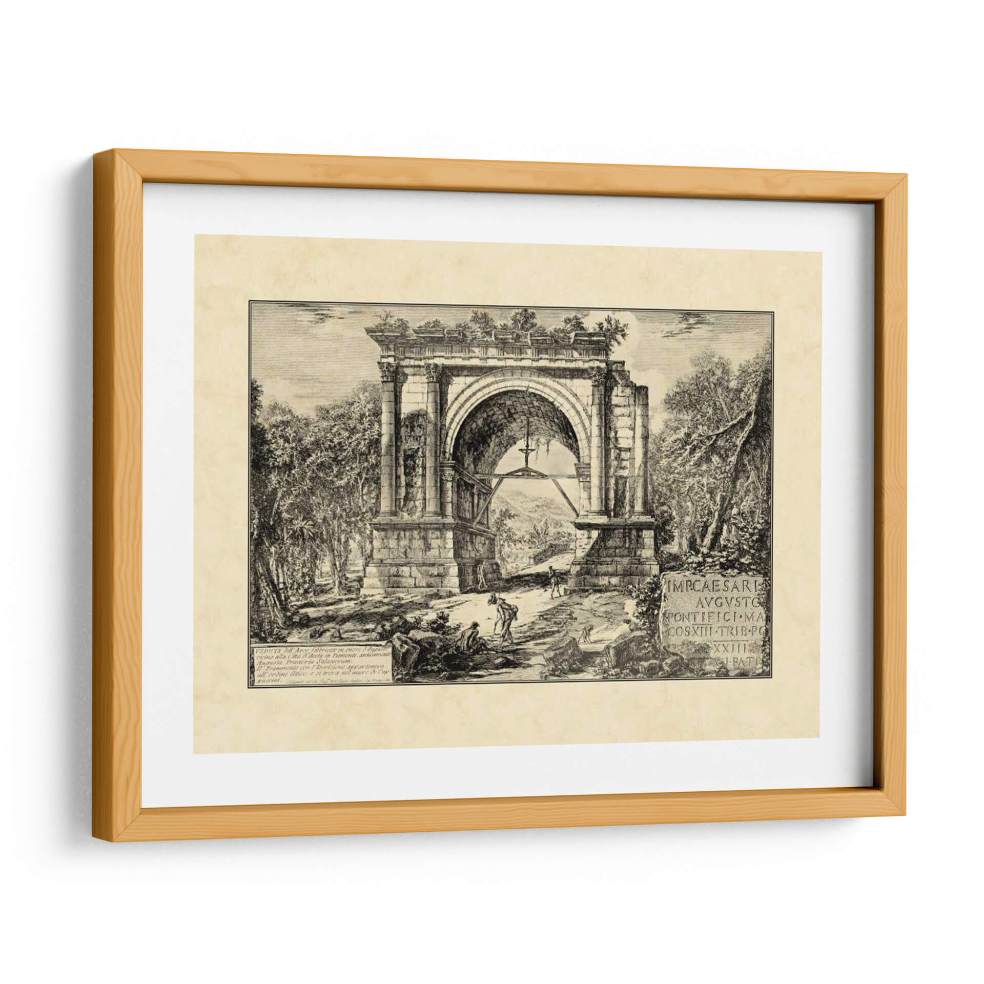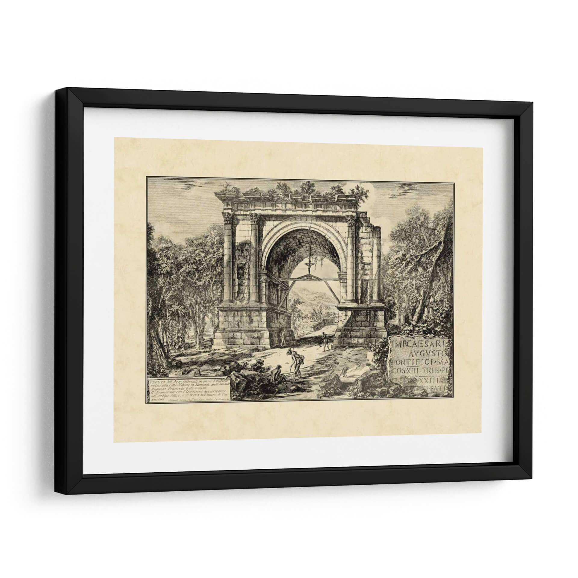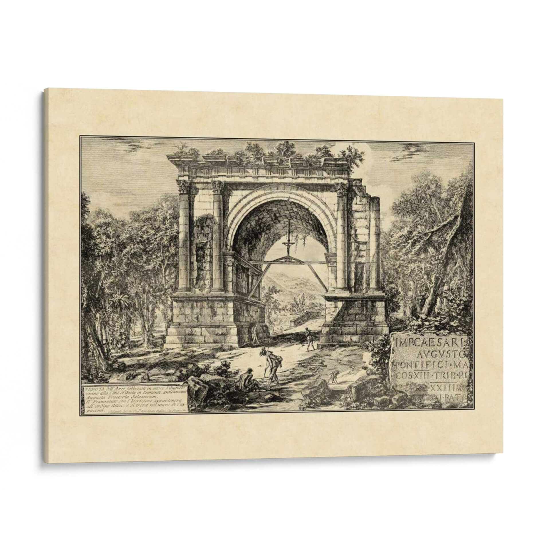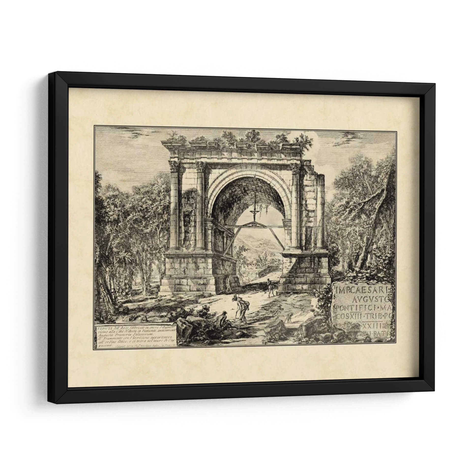 Transporta tu hogar a la majestuosidad del Imperio Romano con "Ruinas Romanas Vintage II", una obra de arte que captura la esencia de la antigüedad a través de los ojos del artista Giovanni Piranesi. Este grabado detallado presenta un imponente arco de triunfo en un estado de semi-ruina, abrazado por una exuberante vegetación que evoca el paso del tiempo y la naturaleza reclamando su espacio. La paleta monocromática, con sus profundos contrastes de luz y sombra, otorga a la pieza una atmósfera dramática y a la vez serena, invitando a la contemplación y al asombro. Figuras humanas de escala modesta interactúan con la monumental arquitectura, resaltando la grandiosidad de las ruinas y añadiendo un toque de vida y misterio a la escena. La intrincada técnica de grabado y la composición equilibrada crean una sensación de profundidad y realismo histórico, perfecta para aquellos que buscan infundir a sus espacios un aire de sofisticación clásica, cultura y un profundo sentido de la historia. Ideal para salones, estudios o bibliotecas, este cuadro decorativo es una ventana a un pasado glorioso, aportando un toque de carácter y elegancia atemporal a cualquier decoración.