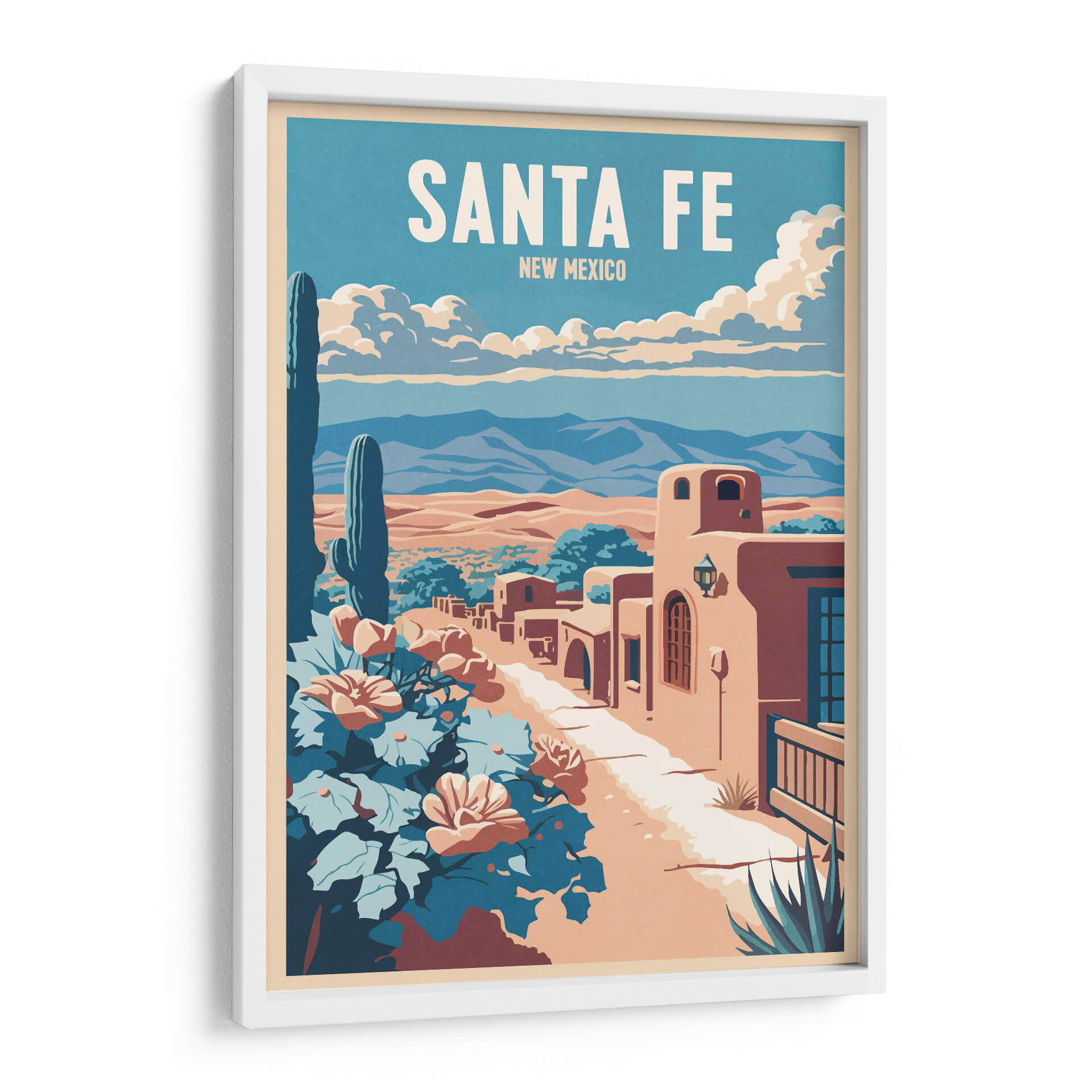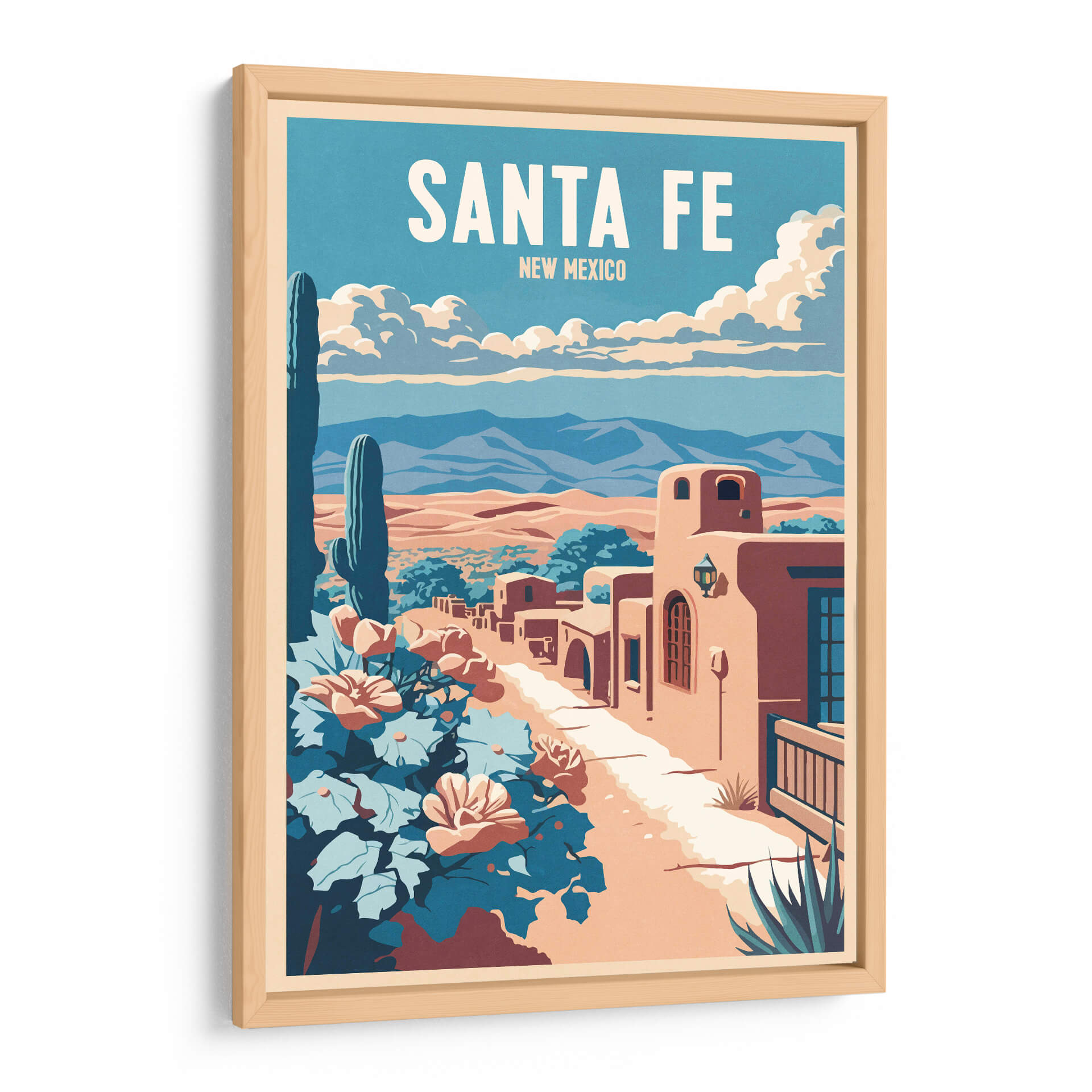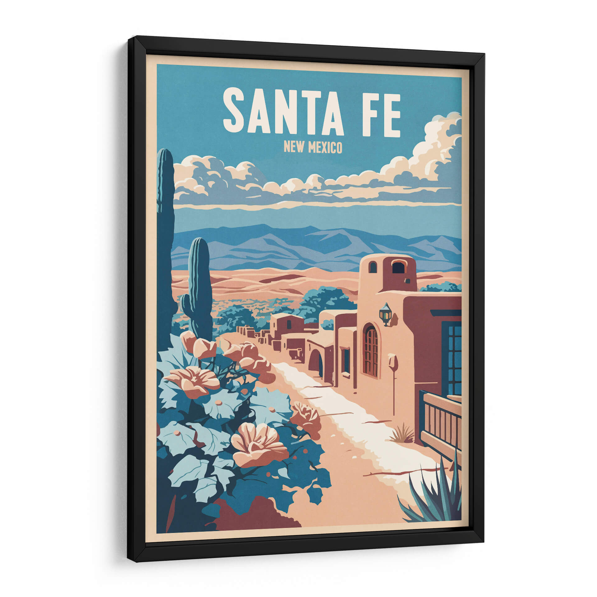 Sumérgete en la atmósfera vibrante y el encanto del suroeste americano con este cautivador cuadro decorativo 'Santa Fe' de Thomas Chedeville. La obra evoca la esencia de Nuevo México a través de una paleta de colores cálidos y terrosos, contrastados con el azul profundo del cielo y los tonos frondosos de la vegetación desértica. El diseño, con un estilo que recuerda a los carteles de viaje clásicos, presenta una icónica vista de Santa Fe, con sus característicos edificios de adobe bañados por la luz del sol. Un imponente cactus saguaro se alza majestuoso en primer plano, junto a flores vibrantes que añaden un toque de color y vida a la escena. Las montañas distantes y las nubes algodonosas completan un paisaje sereno pero lleno de carácter. Este cuadro decorativo es perfecto para añadir un aire de aventura y tranquilidad a tu hogar u oficina. Imagina esta pieza como un punto focal en tu sala de estar, un recordatorio de un viaje o un sueño de explorar los paisajes únicos de Santa Fe, aportando calidez y una estética distintiva a cualquier espacio. El arte de Thomas Chedeville captura la belleza atemporal de los lugares icónicos, transformándolos en declaraciones visuales impactantes para tu decoración.