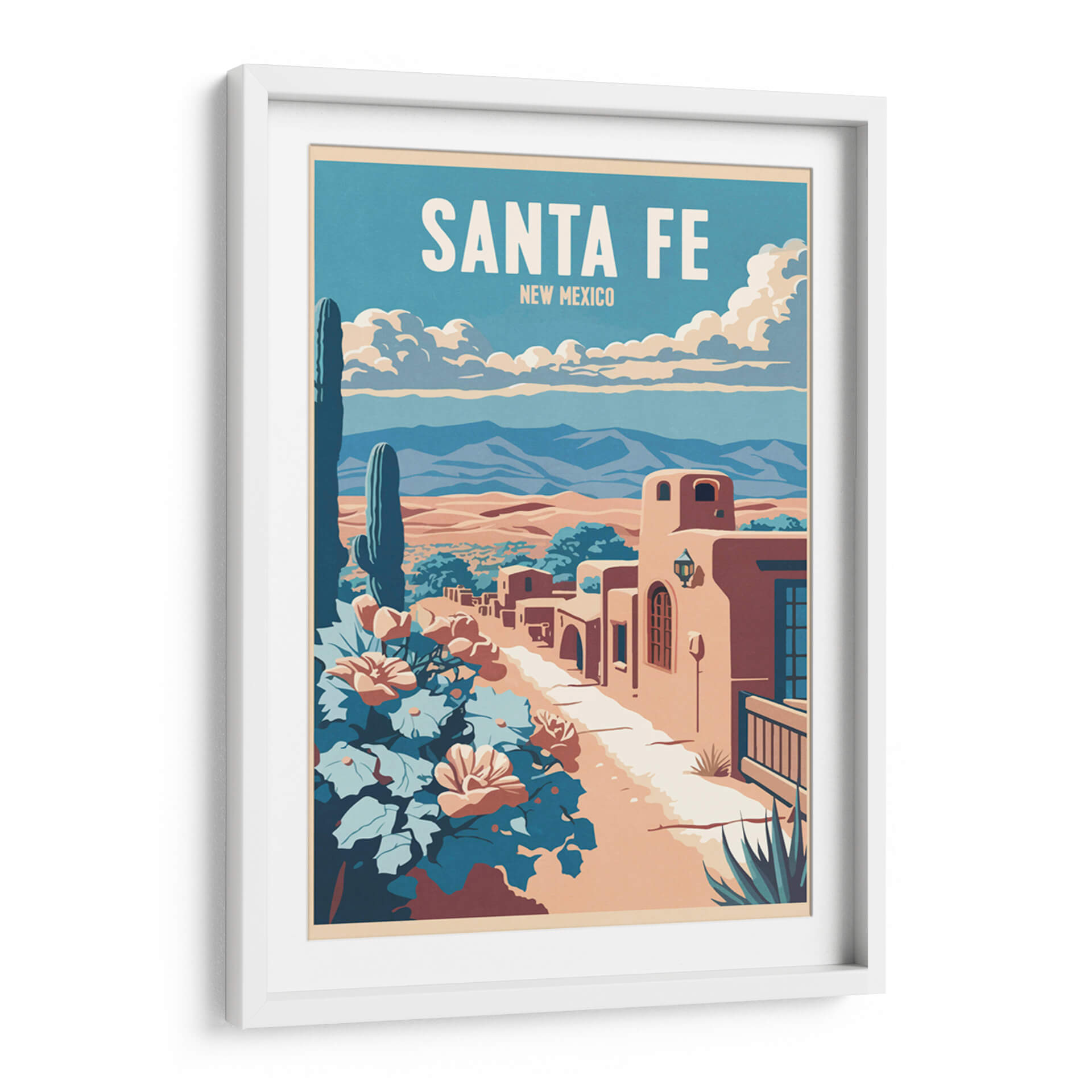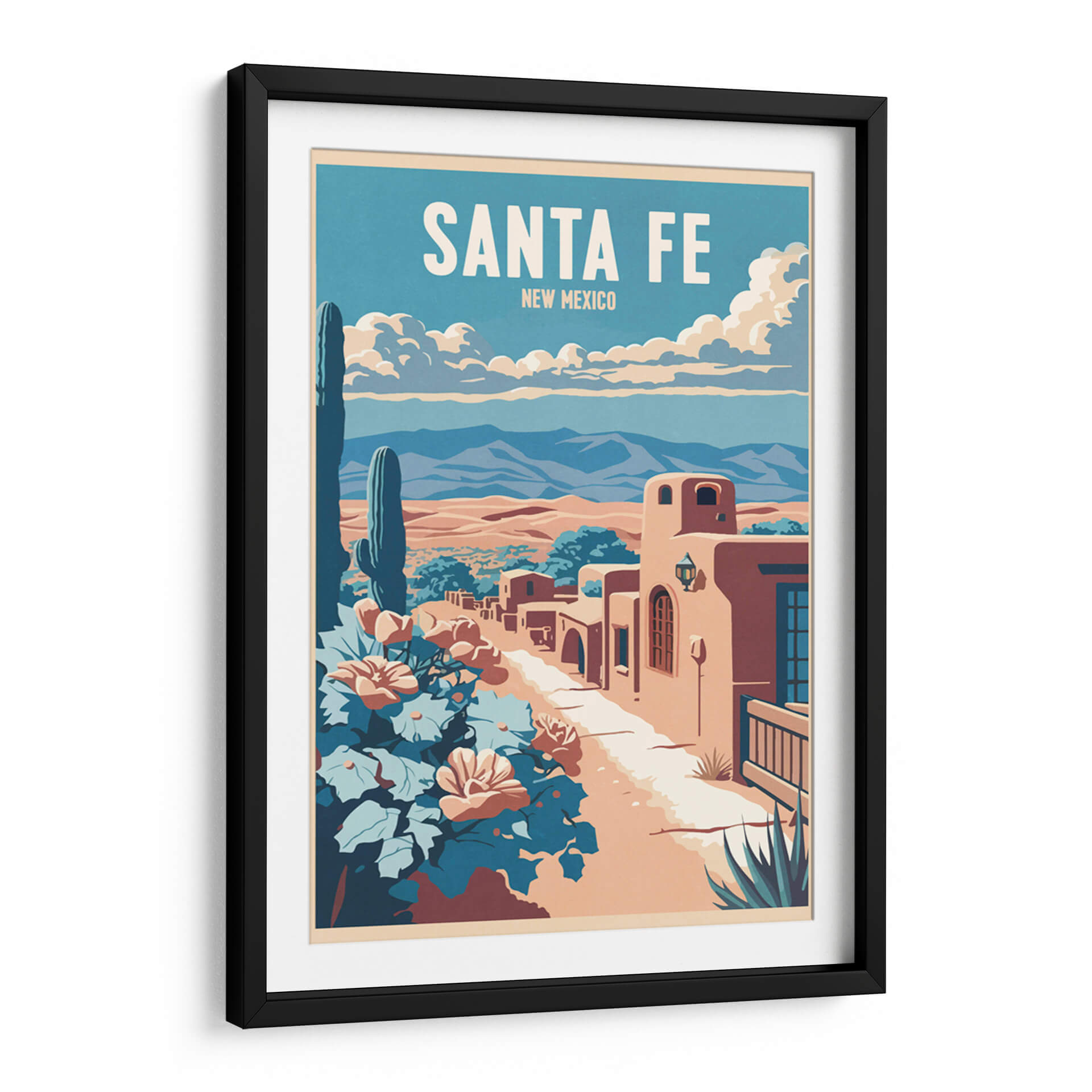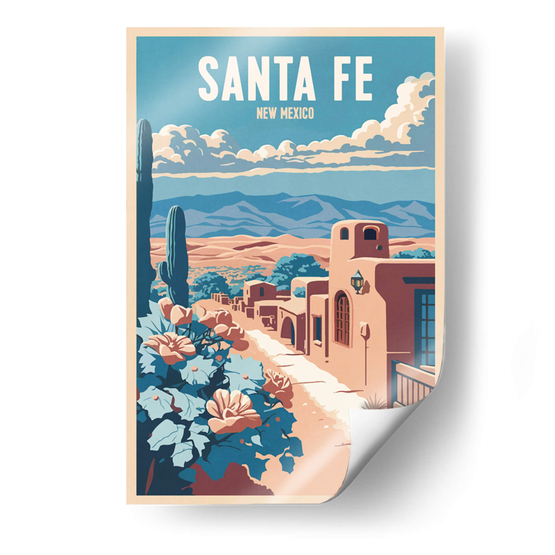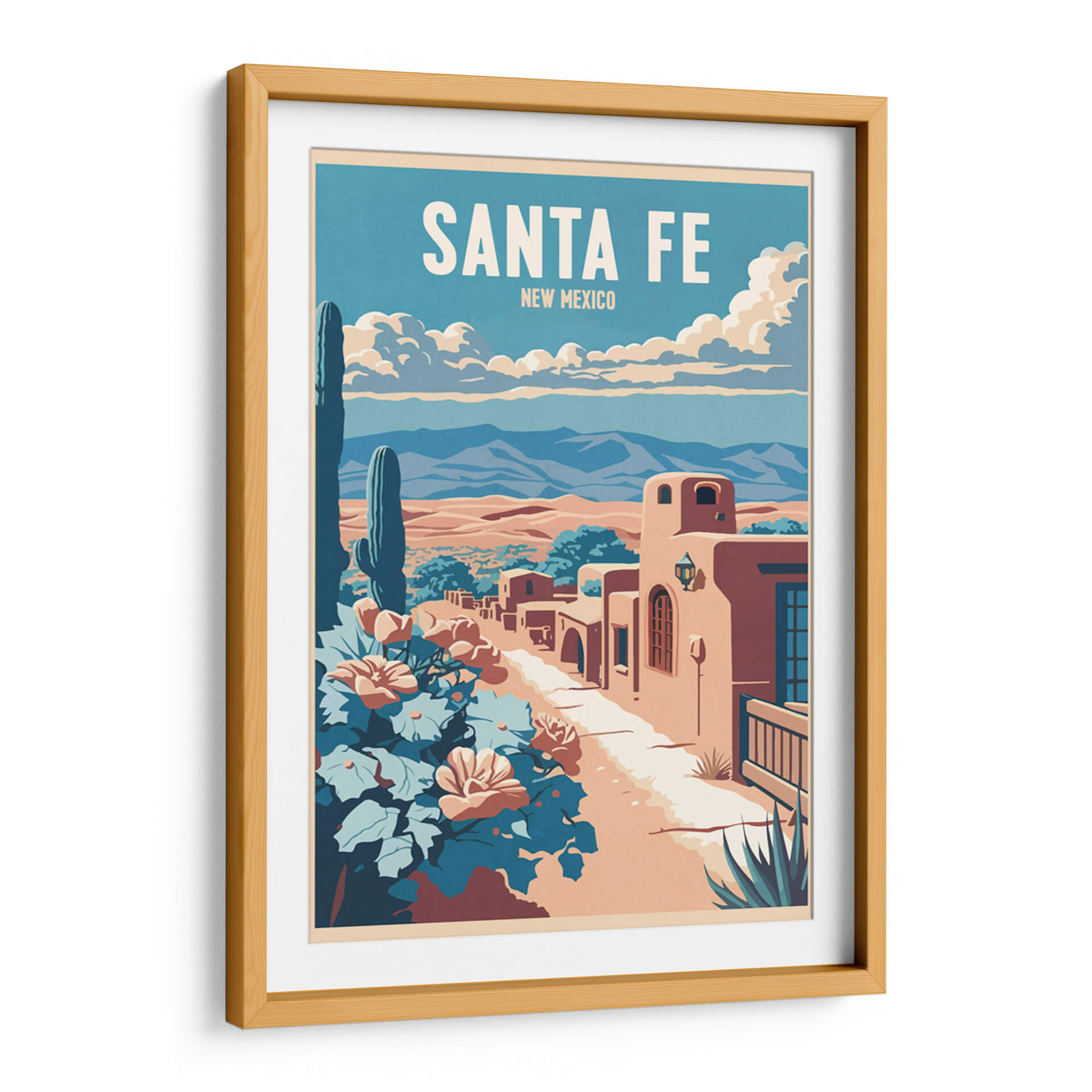 Sumérgete en la atmósfera vibrante y el encanto del suroeste americano con este cautivador cuadro decorativo 'Santa Fe' de Thomas Chedeville. La obra evoca la esencia de Nuevo México a través de una paleta de colores cálidos y terrosos, contrastados con el azul profundo del cielo y los tonos frondosos de la vegetación desértica. El diseño, con un estilo que recuerda a los carteles de viaje clásicos, presenta una icónica vista de Santa Fe, con sus característicos edificios de adobe bañados por la luz del sol. Un imponente cactus saguaro se alza majestuoso en primer plano, junto a flores vibrantes que añaden un toque de color y vida a la escena. Las montañas distantes y las nubes algodonosas completan un paisaje sereno pero lleno de carácter. Este cuadro decorativo es perfecto para añadir un aire de aventura y tranquilidad a tu hogar u oficina. Imagina esta pieza como un punto focal en tu sala de estar, un recordatorio de un viaje o un sueño de explorar los paisajes únicos de Santa Fe, aportando calidez y una estética distintiva a cualquier espacio. El arte de Thomas Chedeville captura la belleza atemporal de los lugares icónicos, transformándolos en declaraciones visuales impactantes para tu decoración.