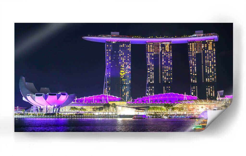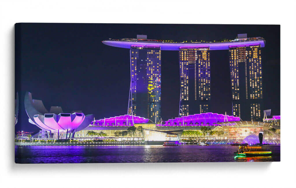 Captura la vibrante energía nocturna de una de las ciudades más icónicas del mundo con este impresionante cuadro decorativo de Singapur. La obra plasma la majestuosidad del Marina Bay Sands y sus alrededores, iluminados por un espectáculo de luces púrpuras y doradas que reflejan en las aguas tranquilas. Las altas torres se elevan hacia el cielo estrellado, creando un horizonte urbano futurista y elegante. La iluminación detallada de cada ventana y las estructuras arquitectónicas únicas, como el icónico edificio en forma de loto, añaden una profundidad y un realismo cautivadores. Este arte de pared digital es perfecto para quienes buscan infundir a sus espacios un aire de sofisticación moderna, dinamismo y un toque cosmopolita. Ideal para salones, oficinas o cualquier ambiente que desee ser transformado con una pieza que evoca viajes, lujo y el pulso de la vida urbana contemporánea. Transforma tu hogar en una galería de arte con esta vista nocturna espectacular.