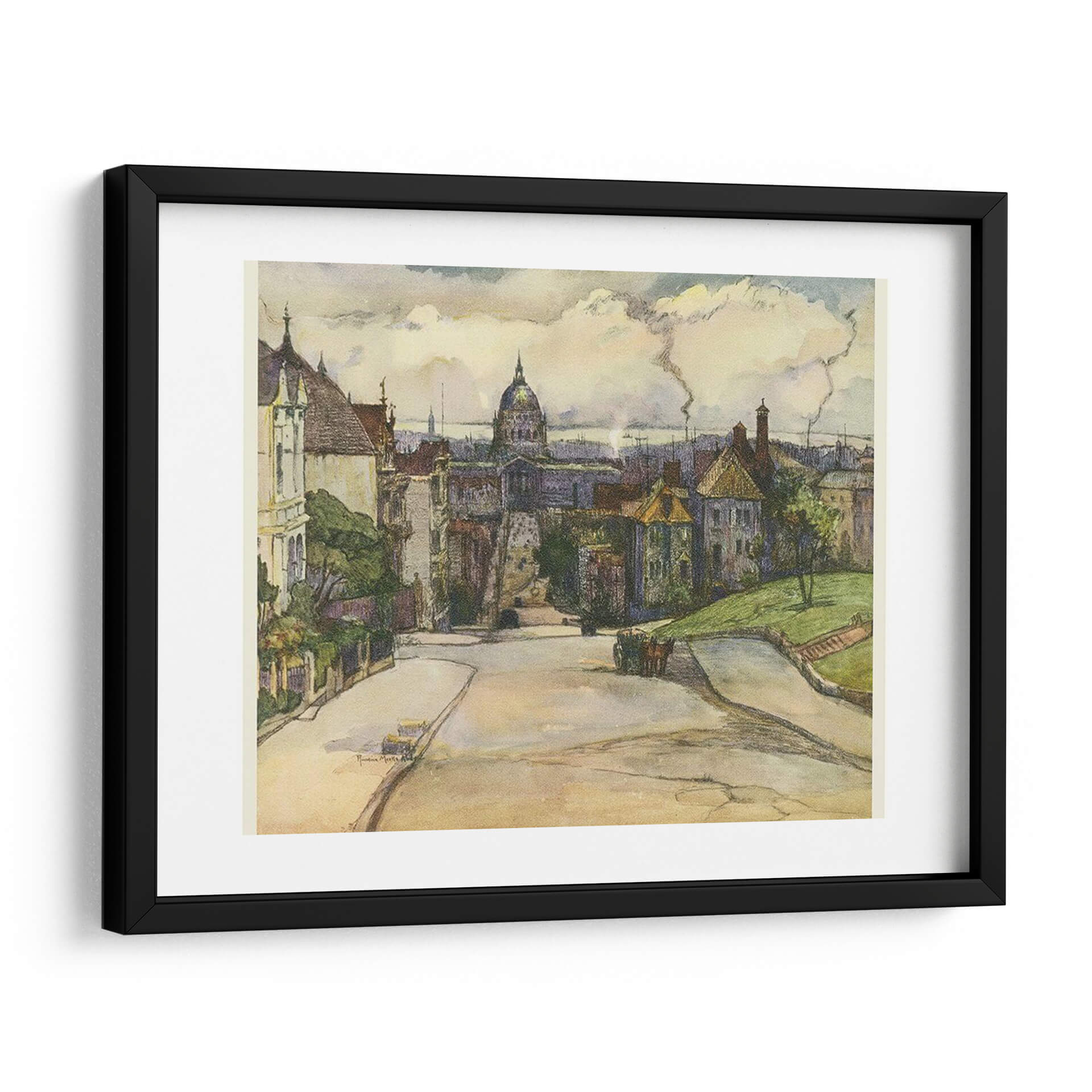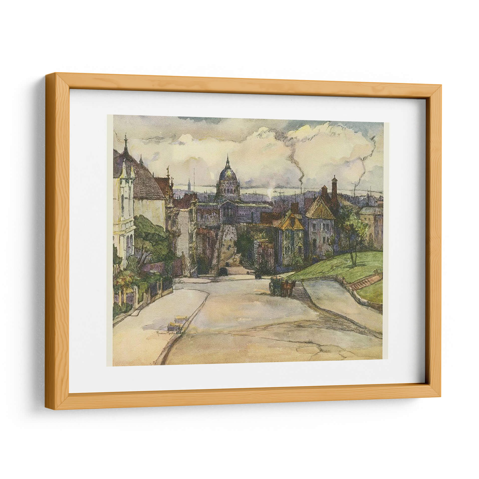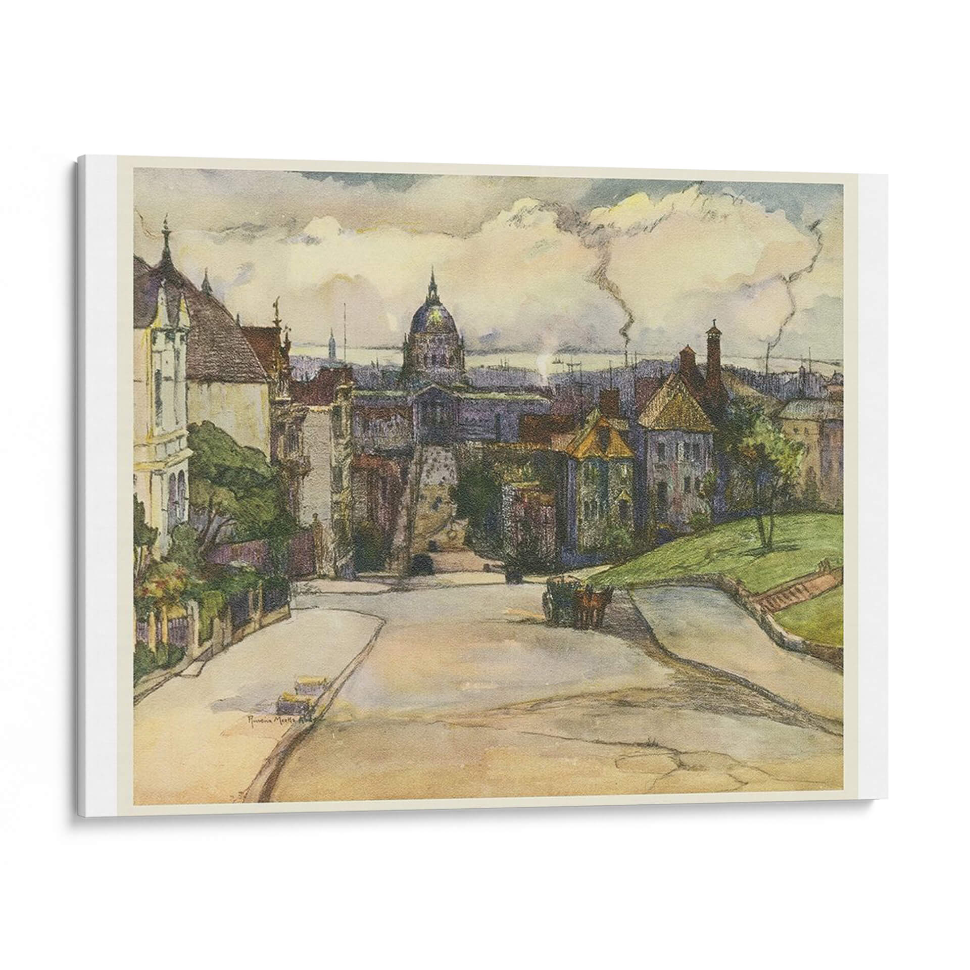 Sumérgete en la atmósfera de 'Sketchbook Europeo I' de Lily Liama, una obra que captura la esencia de una ciudad con encanto histórico y una vida que transcurre. Este cuadro decorativo presenta una perspectiva de calle sinuosa que invita a explorar, flanqueada por edificios de arquitectura europea con tejados inclinados y detalles ornamentales. En el centro, una imponente cúpula se alza contra un cielo nublado, sugiriendo un punto de referencia significativo y añadiendo profundidad a la composición. La paleta de colores, dominada por tonos tierra, ocres y verdes apagados, evoca una sensación de nostalgia y tranquilidad, como si se tratara de un recuerdo plasmado en papel. Las pinceladas o trazos evidentes confieren a la obra una textura vibrante y un aire de boceto espontáneo, propio de un cuaderno de artista. Es una pieza ideal para quienes buscan infundir a sus espacios un aire de sofisticación artística y un toque de viaje imaginario. Perfecta para salones, estudios o despachos que deseen transmitir una sensación de calma reflexiva y aprecio por la belleza de lo cotidiano y lo arquitectónico.