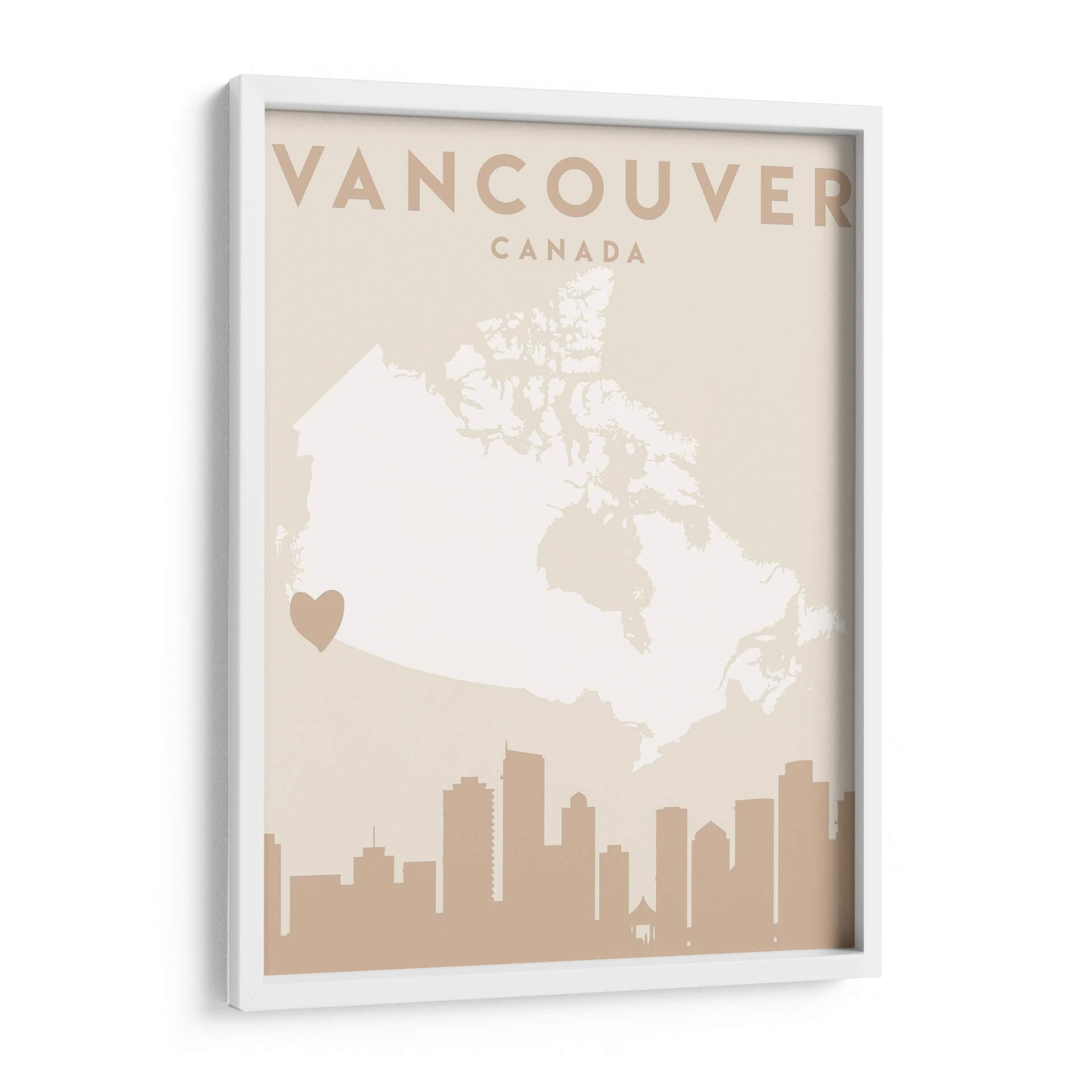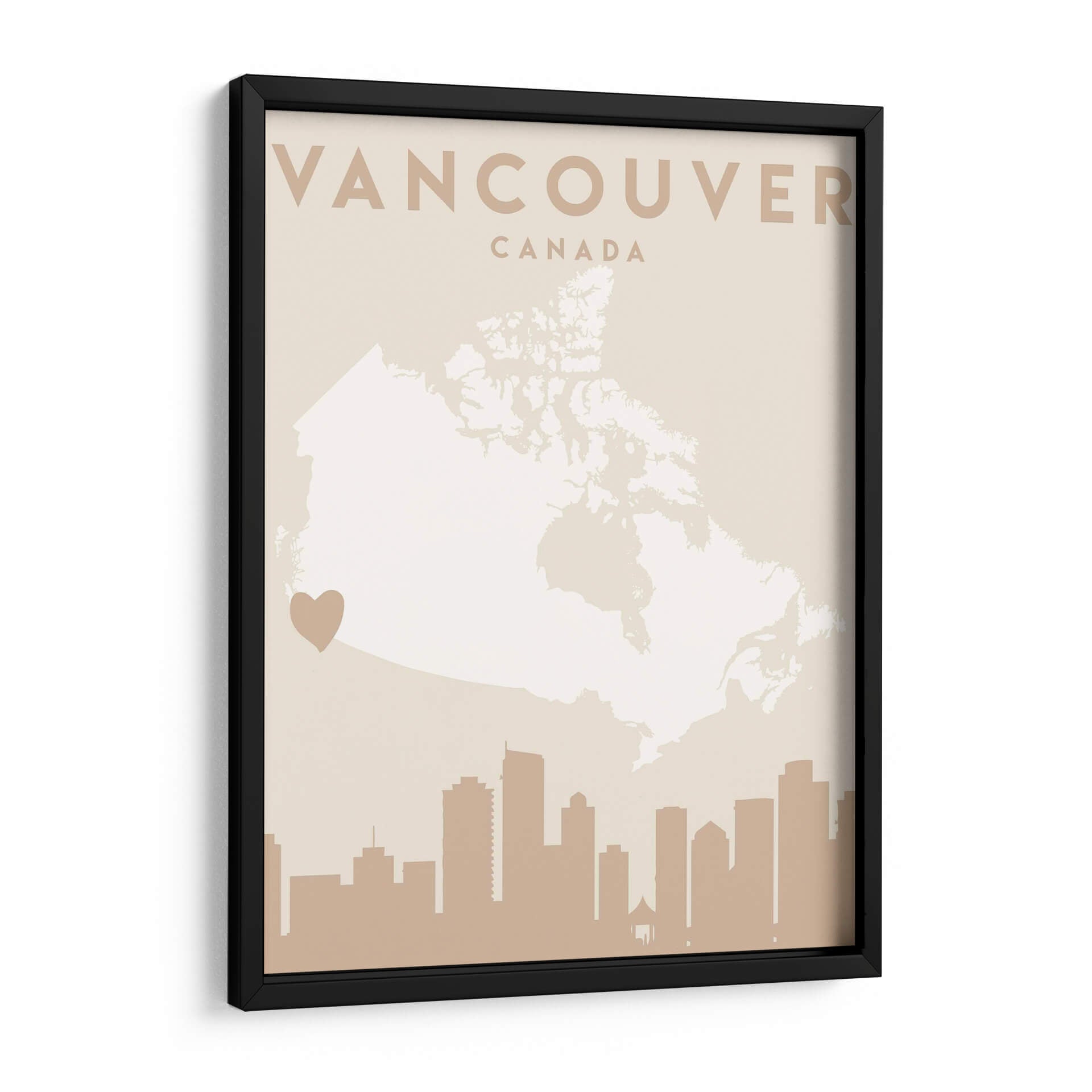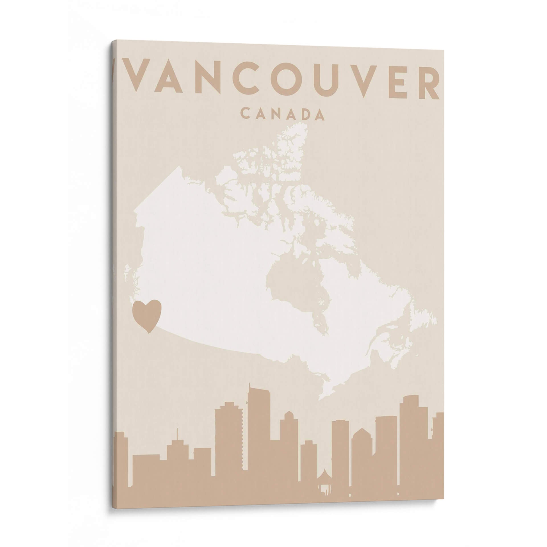 Celebra tu amor por Vancouver con este cautivador cuadro decorativo, una pieza de arte contemporáneo que fusiona la geografía con la emoción. La obra presenta un mapa estilizado de Canadá, con Vancouver destacado sutilmente, y coronado por la silueta icónica de su horizonte urbano. La paleta de colores, dominada por tonos tierra suaves y un delicado crema, crea una atmósfera de serenidad y sofisticación, perfecta para añadir un toque de calidez a cualquier espacio. Este diseño minimalista y moderno es ideal para aquellos que buscan una conexión personal con la ciudad, ya sea como recuerdo de un viaje, un símbolo de pertenencia o una apreciación del diseño urbano. El discreto corazón que señala la ubicación de Vancouver añade un toque íntimo y personal, haciendo de esta pieza un punto focal que invita a la contemplación y al diálogo. Es una adición elegante para salones, oficinas o estudios, aportando una vibración única y un aire de aventura urbana a tu decoración. Descubre la belleza de Vancouver a través de los ojos del arte.