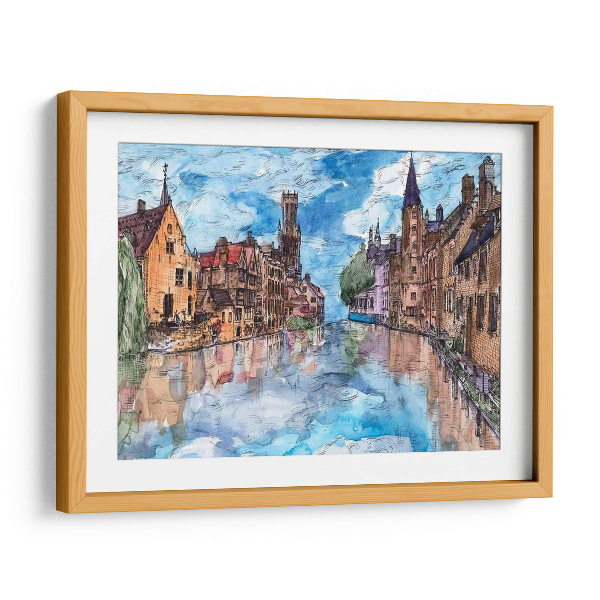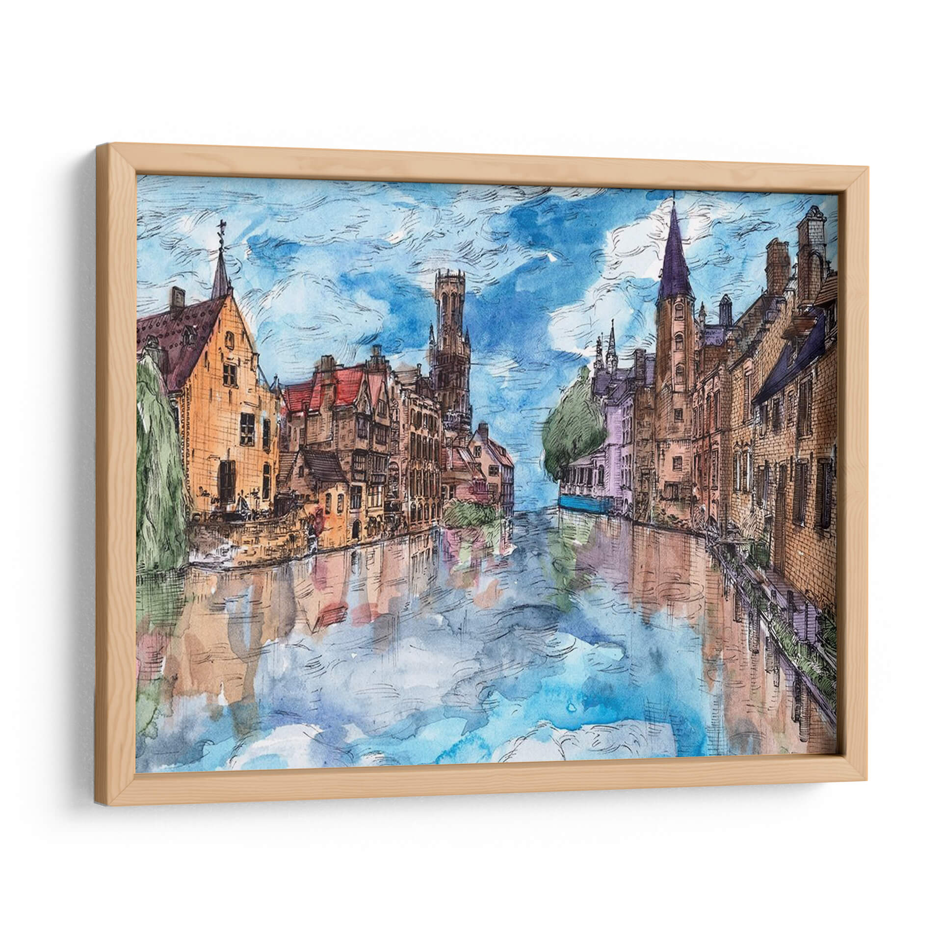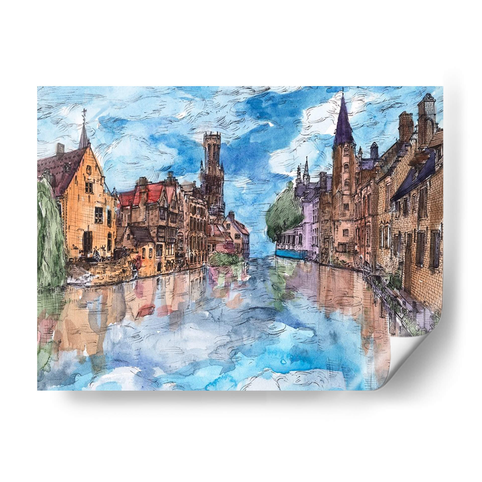 Embárquese en un cautivador viaje visual con "Viaje a Europa I", una obra de arte que captura la esencia pintoresca de una ciudad europea a través de sus canales y arquitectura histórica. La artista Melissa Wang nos transporta a un escenario urbano idílico, donde las edificaciones de tonos cálidos, con sus tejados rojos y fachadas de ladrillo, se reflejan serena y mágicamente en las tranquilas aguas de un canal. La paleta de colores, dominada por azules celestes vibrantes, tonos tierra cálidos y sutiles toques de violeta y verde, crea una atmósfera de paz y nostalgia, evocando la sensación de un paseo tranquilo al atardecer. El estilo, que recuerda a una acuarela detallada con contornos definidos, aporta un encanto artístico y atemporal a la composición. Este cuadro decorativo es perfecto para añadir un toque de elegancia europea y serenidad a cualquier sala de estar, comedor o estudio. Su capacidad para inspirar tranquilidad y evocar recuerdos de viajes lo convierte en una pieza de conversación excepcional y en una adición valiosa a cualquier colección de arte de pared, transformando su espacio en un remanso de belleza y contemplación.