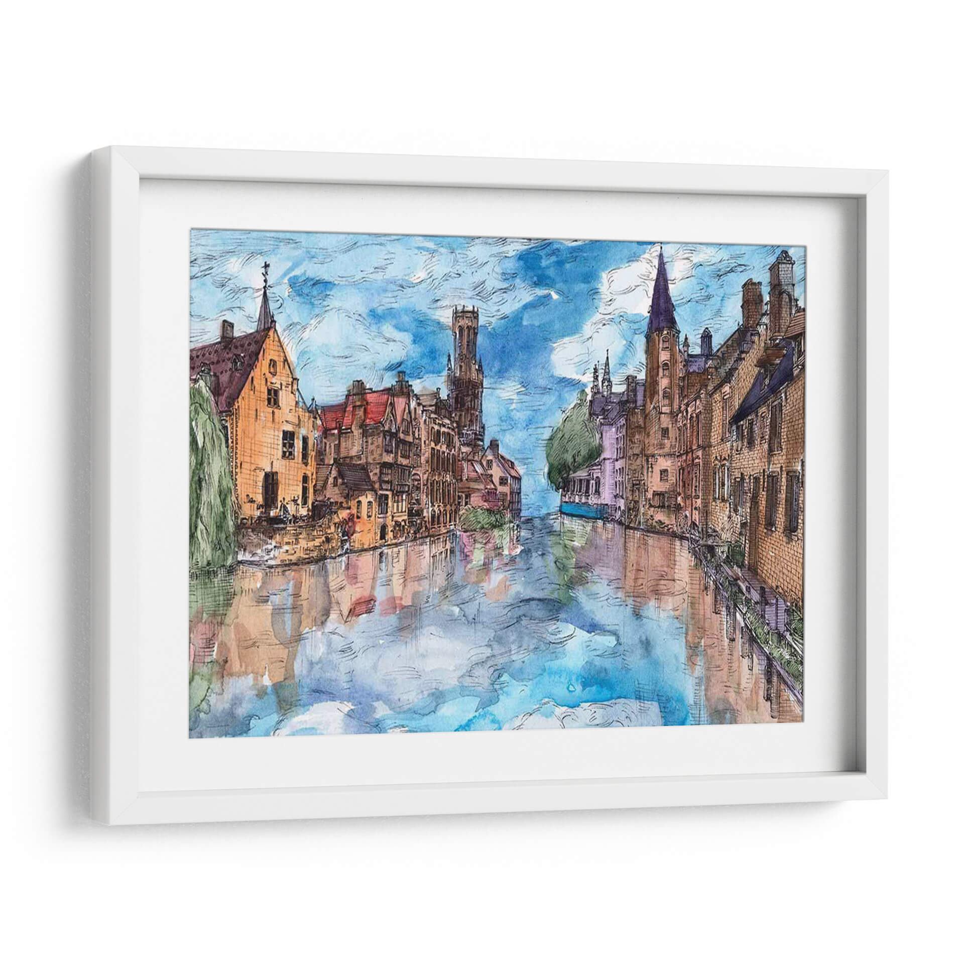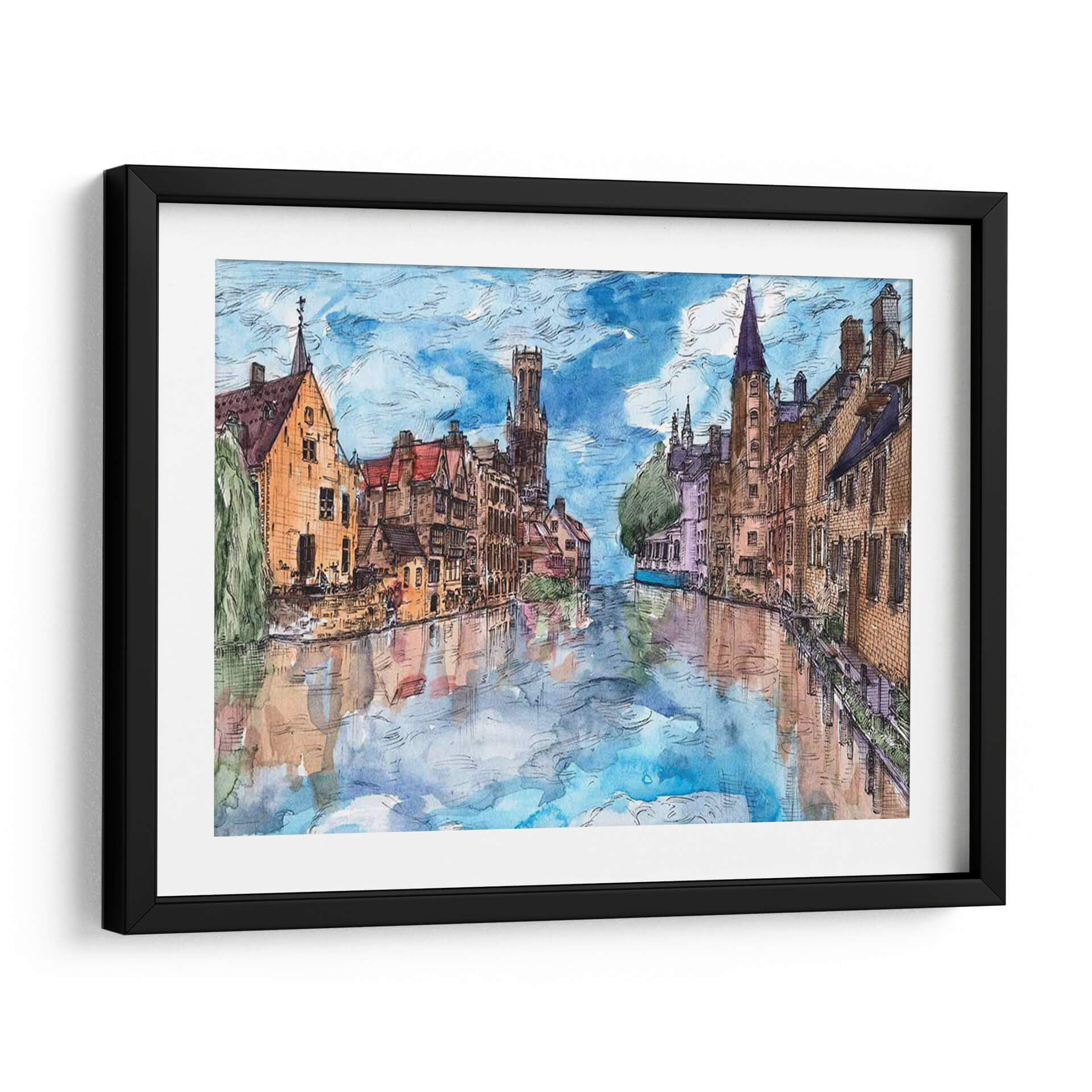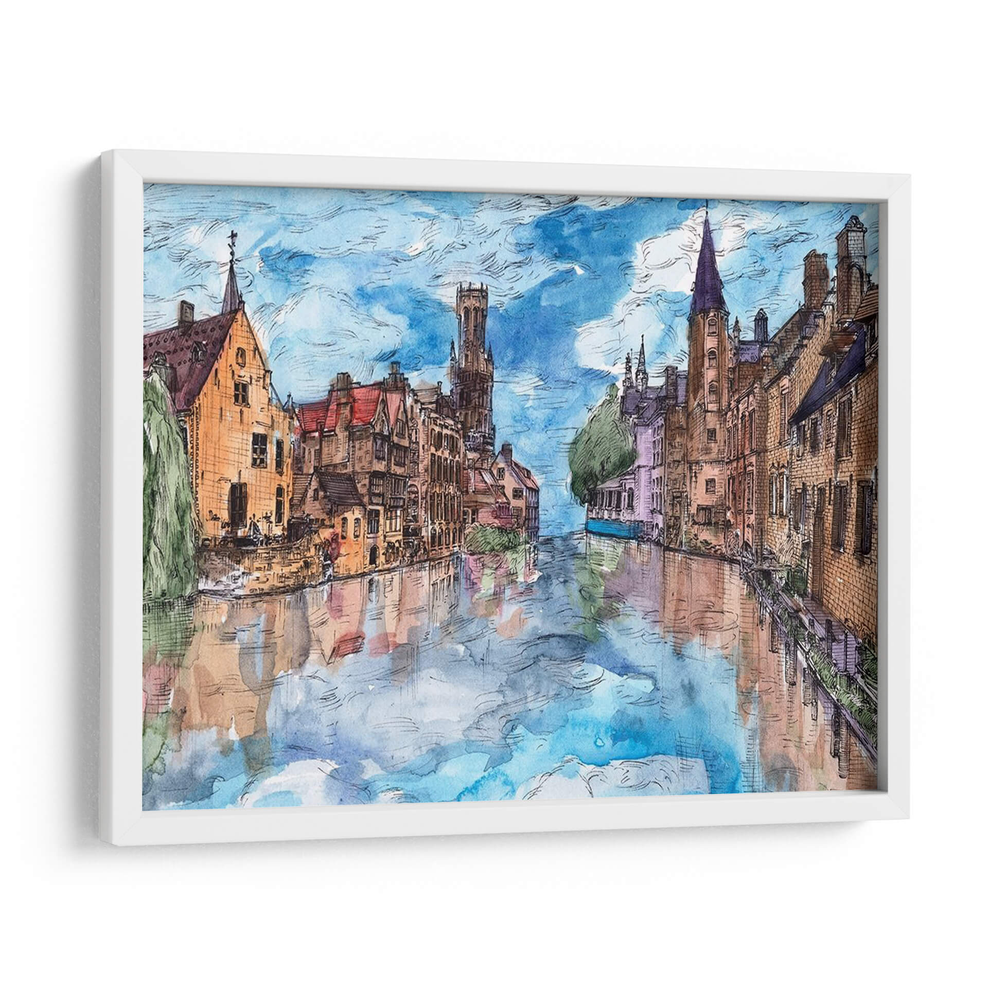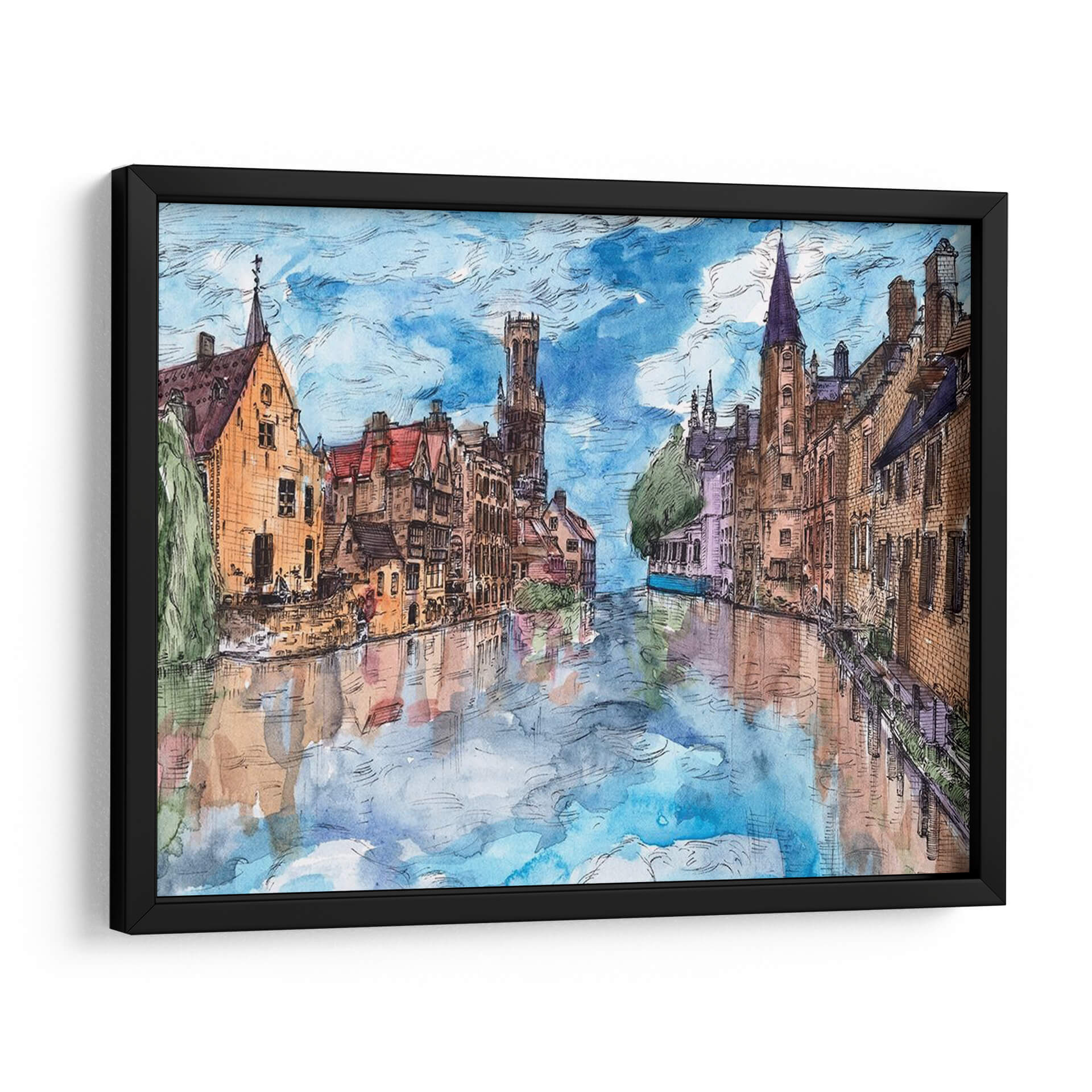 Embárquese en un cautivador viaje visual con "Viaje a Europa I", una obra de arte que captura la esencia pintoresca de una ciudad europea a través de sus canales y arquitectura histórica. La artista Melissa Wang nos transporta a un escenario urbano idílico, donde las edificaciones de tonos cálidos, con sus tejados rojos y fachadas de ladrillo, se reflejan serena y mágicamente en las tranquilas aguas de un canal. La paleta de colores, dominada por azules celestes vibrantes, tonos tierra cálidos y sutiles toques de violeta y verde, crea una atmósfera de paz y nostalgia, evocando la sensación de un paseo tranquilo al atardecer. El estilo, que recuerda a una acuarela detallada con contornos definidos, aporta un encanto artístico y atemporal a la composición. Este cuadro decorativo es perfecto para añadir un toque de elegancia europea y serenidad a cualquier sala de estar, comedor o estudio. Su capacidad para inspirar tranquilidad y evocar recuerdos de viajes lo convierte en una pieza de conversación excepcional y en una adición valiosa a cualquier colección de arte de pared, transformando su espacio en un remanso de belleza y contemplación.
