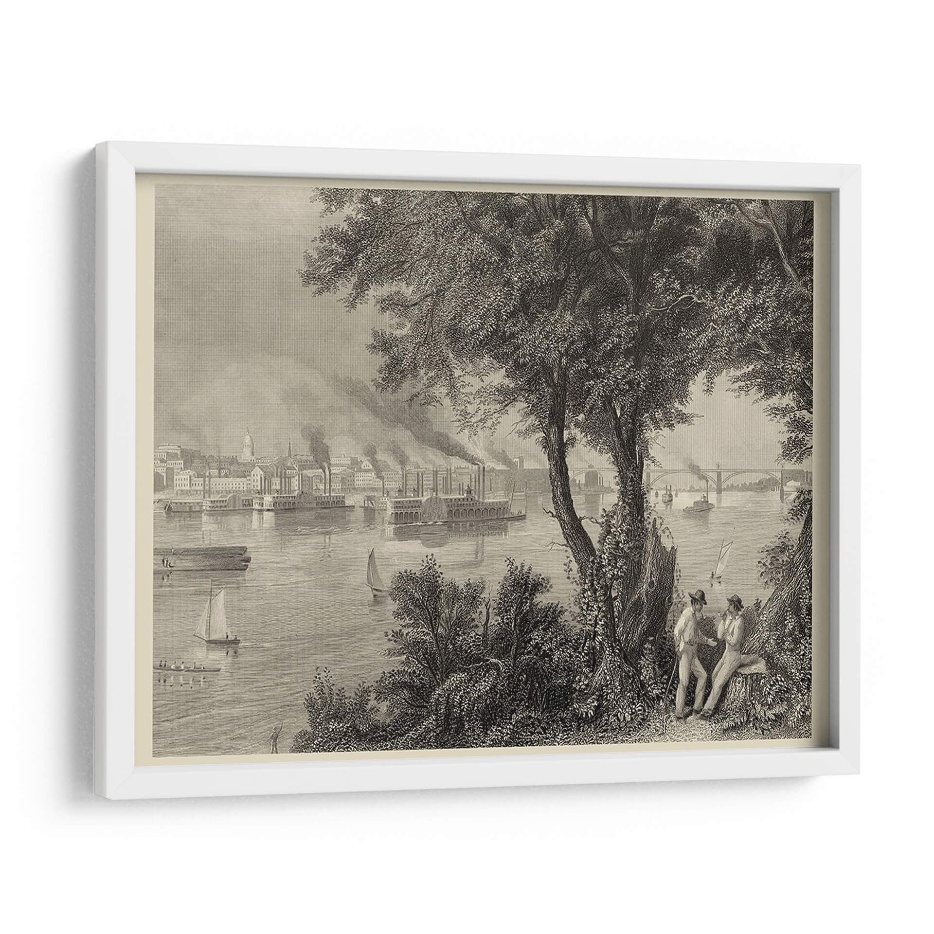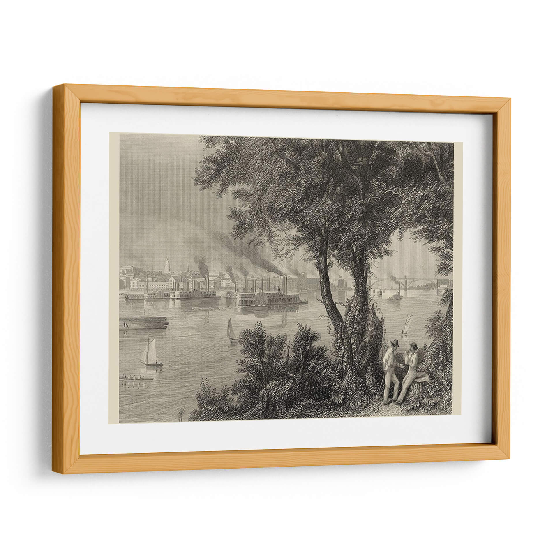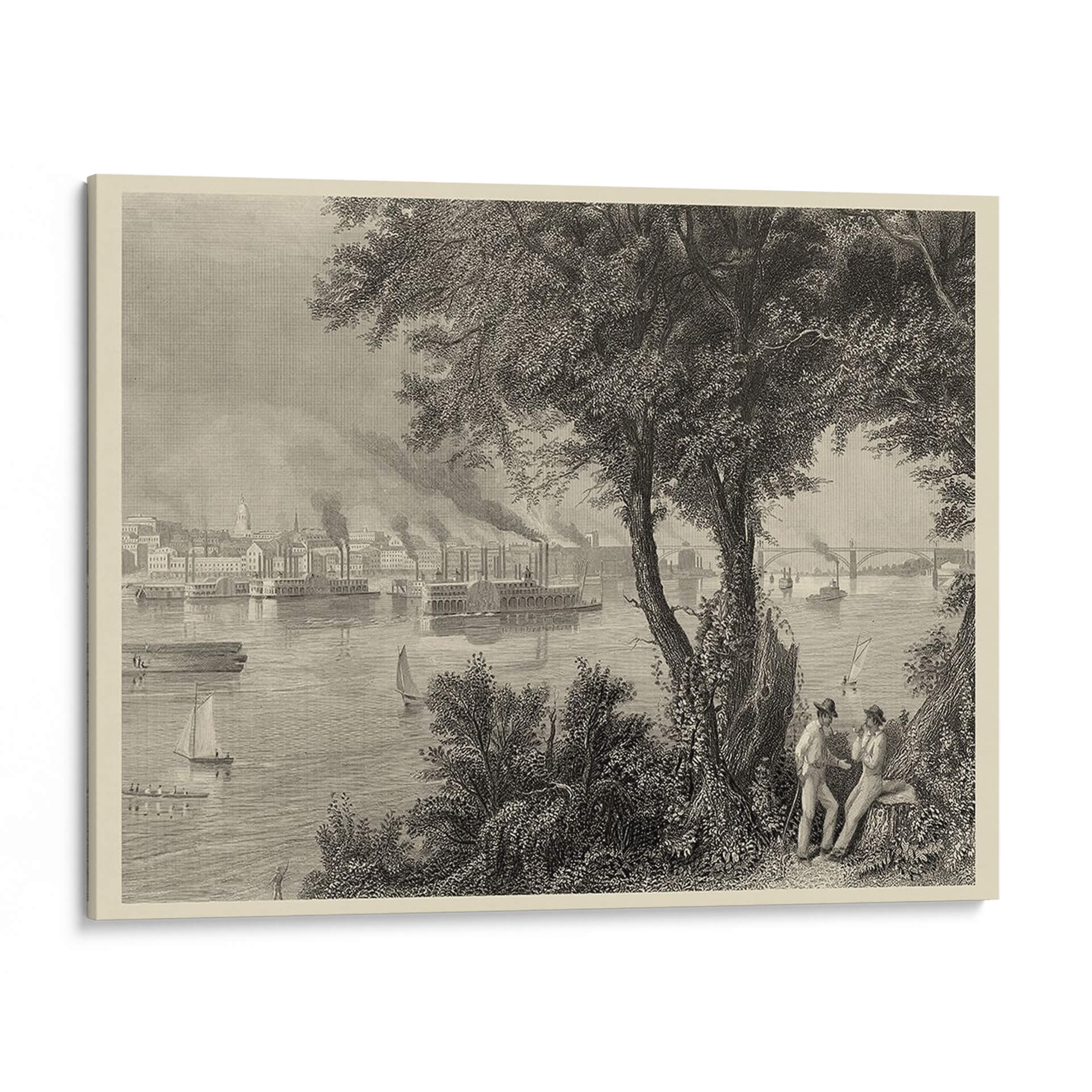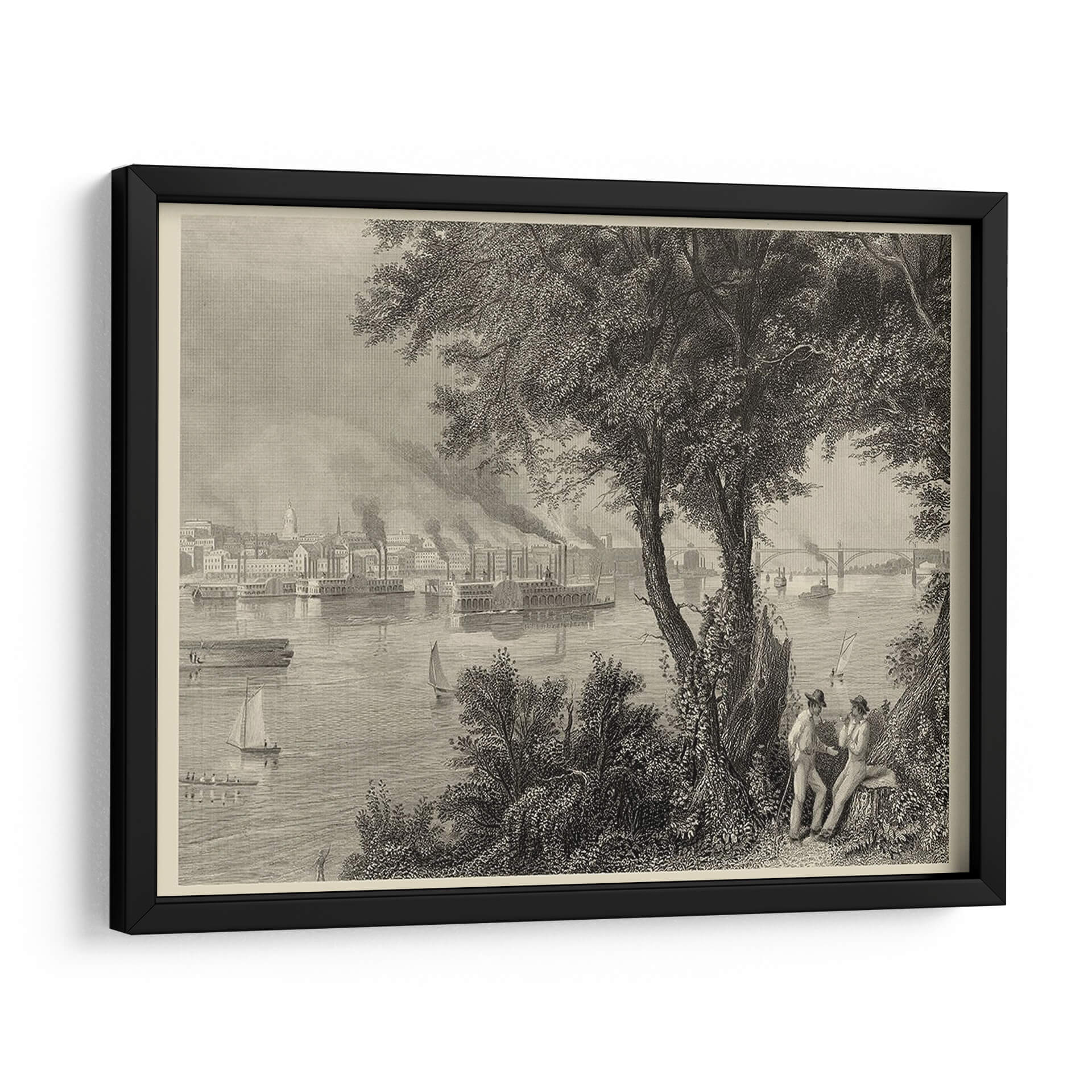 Transporte a una época pasada con este evocador cuadro decorativo, 'Vistas Panorámicas De La Ciudad Iv'. La obra maestra del artista W. Wellstood captura una bulliciosa ciudad ribereña, con barcos de vapor humeantes navegando por un río sereno y veleros elegantes deslizándose. La detallada estampa muestra la arquitectura histórica y la actividad industrial, contrastando con la tranquilidad de la naturaleza circundante. Dos figuras sentadas bajo la sombra de un árbol frondoso observan la escena, invitando a la contemplación y la reflexión sobre el progreso y la vida. La paleta de grises y negros, con sutiles contrastes tonales, otorga una atmósfera nostálgica y sofisticada. Este cuadro decorativo es ideal para añadir un toque de elegancia histórica y profundidad a salones, estudios u oficinas. Su composición detallada y su narrativa visual lo convierten en un punto focal cautivador que enriquece cualquier espacio con una sensación de historia y aventura. Perfecto para amantes del arte clásico y la decoración con carácter.