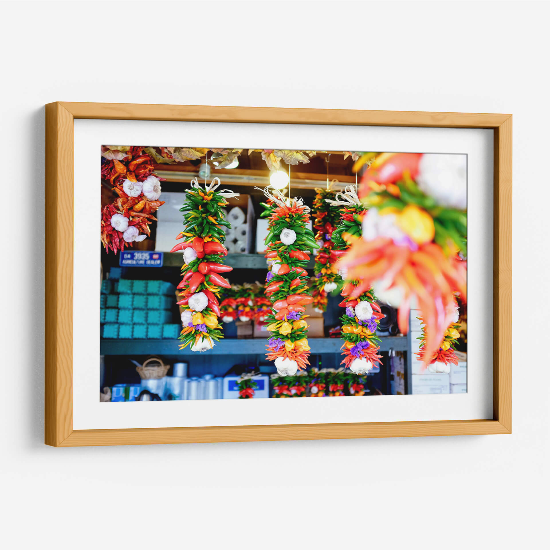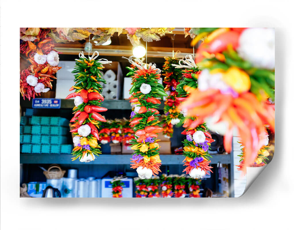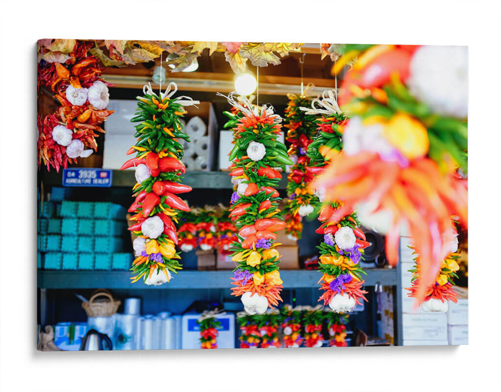 Embellece tu cocina o comedor con el vibrante y apetitoso lienzo "Ajos y Chiles Colgantes". Esta obra de arte captura la esencia de un mercado tradicional, presentando guirnaldas de ajos y chiles de diversos colores, desde rojos intensos y naranjas ardientes hasta verdes vibrantes y morados profundos. La composición, con un enfoque nítido en las ristras colgantes y un fondo ligeramente desenfocado que sugiere la abundancia de un puesto, evoca una sensación de calidez, vitalidad y autenticidad culinaria. La paleta de colores es rica y saturada, aportando energía y un toque rústico y festivo a cualquier espacio. Ideal para cocinas, comedores o incluso restaurantes, esta pieza de arte contemporáneo es perfecta para aquellos que buscan infundir sus hogares con un espíritu alegre y una conexión con la frescura y la abundancia de los ingredientes. Su estilo realista y detallado permite apreciar la textura y la forma de cada ajo y chile, convirtiéndola en un punto focal que estimula los sentidos y añade carácter a la decoración.