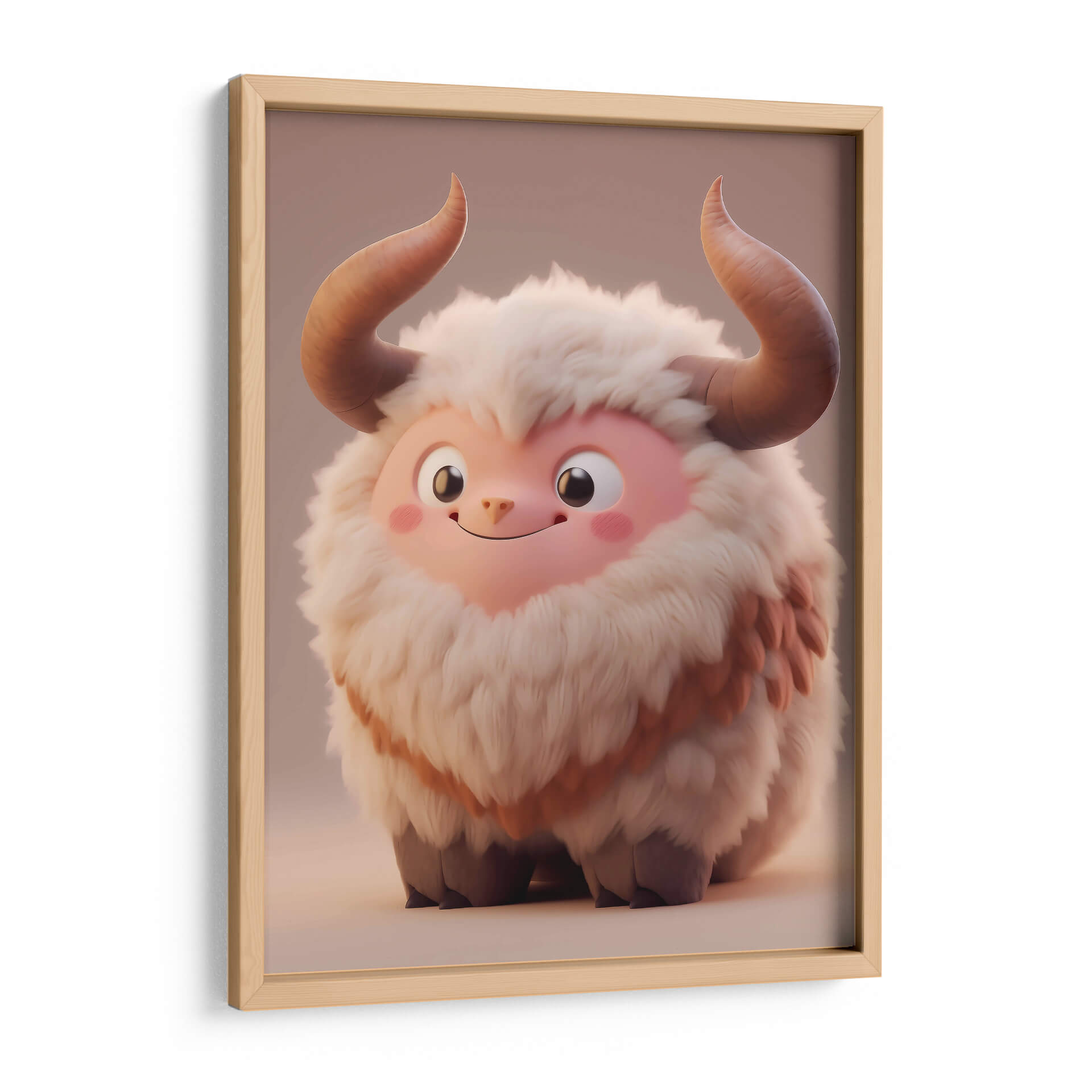 Transforma tu espacio con el encantador cuadro decorativo "BAH - El Bisonte" de DeLaVegaGaming. Esta obra de arte digital, con su estilo caricaturesco y adorable, presenta un tierno bisonte de pelaje esponjoso en tonos blancos y marrones, adornado con grandes cuernos curvos. Su rostro, con grandes ojos expresivos y mejillas sonrosadas, irradia una dulzura contagiosa y una personalidad amigable que cautivará a cualquier espectador. La paleta de colores suaves y neutros, dominada por beiges y rosados, crea una atmósfera de calidez y confort, haciendo de este cuadro una adición perfecta para cualquier habitación que busque un toque de alegría y originalidad. Ideal para dormitorios infantiles, salas de juego o incluso como una pieza inesperada en una oficina moderna, "El Bisonte" aporta una dosis de carácter y buen humor. Su composición central y el enfoque en el personaje lo convierten en un punto focal instantáneo, capaz de iniciar conversaciones y añadir un toque lúdico y contemporáneo a tu decoración. Descubre la magia de este personaje único y dale vida a tus paredes con este impresionante cuadro decorativo.