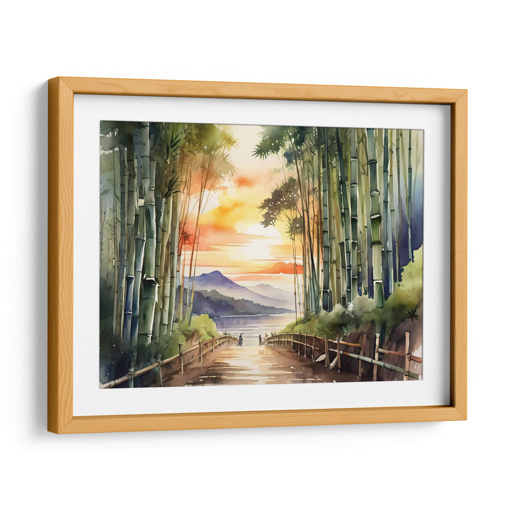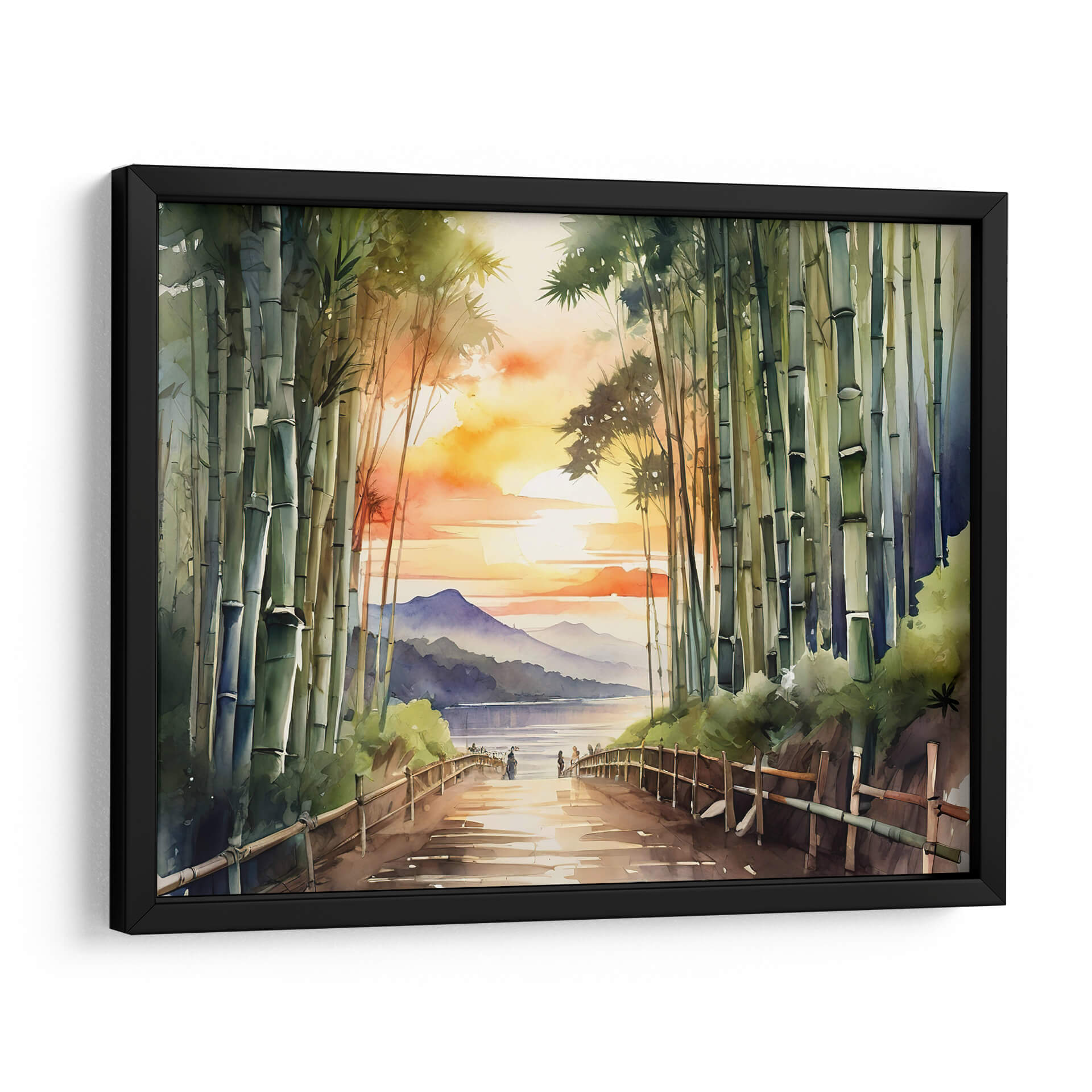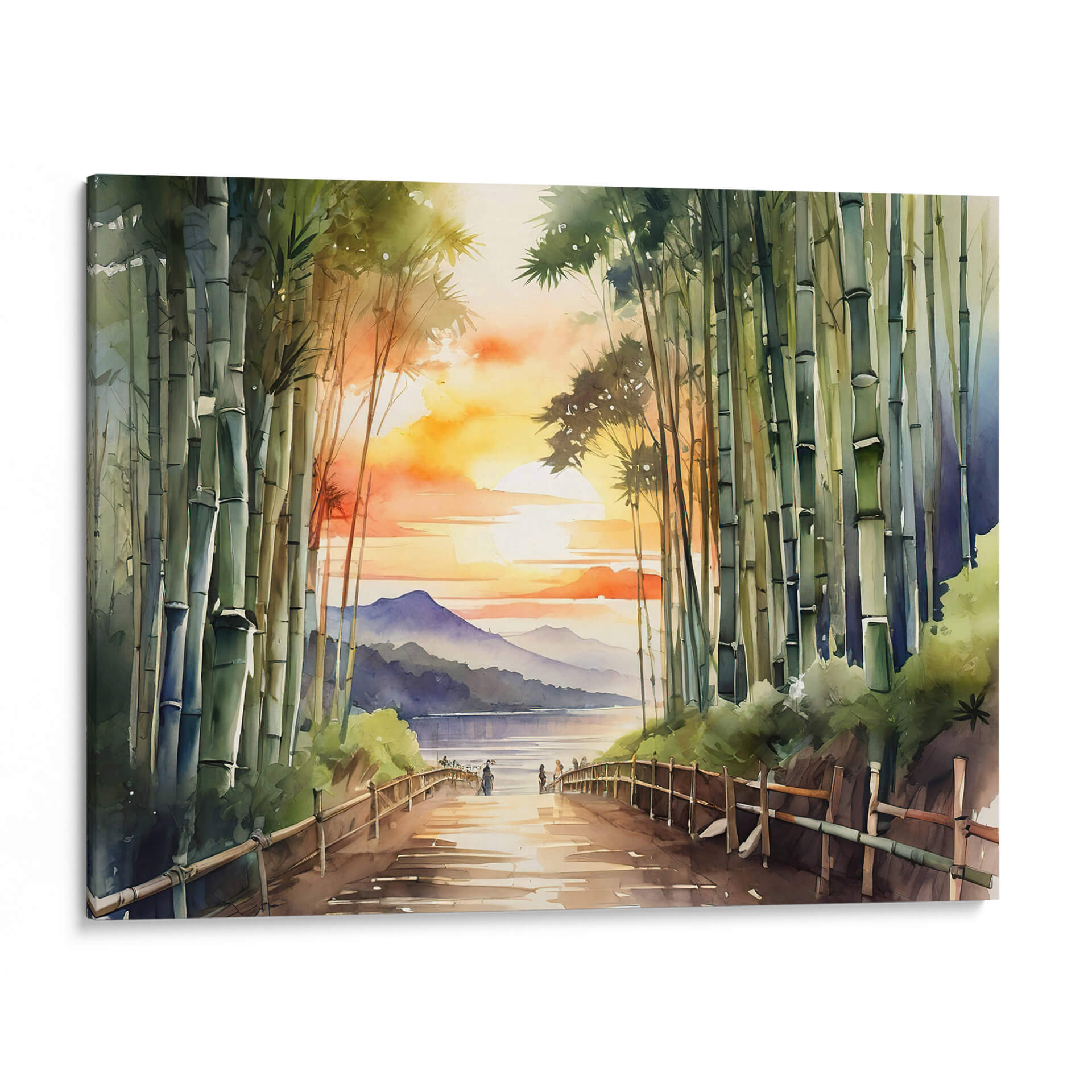 Sumérgete en la serena belleza del "Bosque de Bamboo Arashiyama", una obra de arte que captura la esencia de un atardecer etéreo en un entorno natural. Esta pieza, realizada con una técnica que recuerda a la acuarela, presenta una exuberante arboleda de bambú en primer plano, cuyos tallos verdes y texturizados guían la mirada hacia un sereno cuerpo de agua. A lo lejos, suaves montañas se recortan contra un cielo vibrante, teñido de naranjas, amarillos y rosados intensos, propios de un atardecer espectacular. La luz dorada se refleja en el camino y en el agua, creando una atmósfera de paz y contemplación. El estilo, que combina realismo con una pincelada suelta y expresiva, otorga a la escena una cualidad onírica y tranquilizadora. Este cuadro decorativo es perfecto para infundir calma y un toque de naturaleza a cualquier espacio, ya sea un dormitorio, un estudio o una sala de estar que busque un refugio de paz visual. Ideal para quienes aprecian la delicadeza de los paisajes asiáticos y la atmósfera introspectiva de los bosques de bambú.