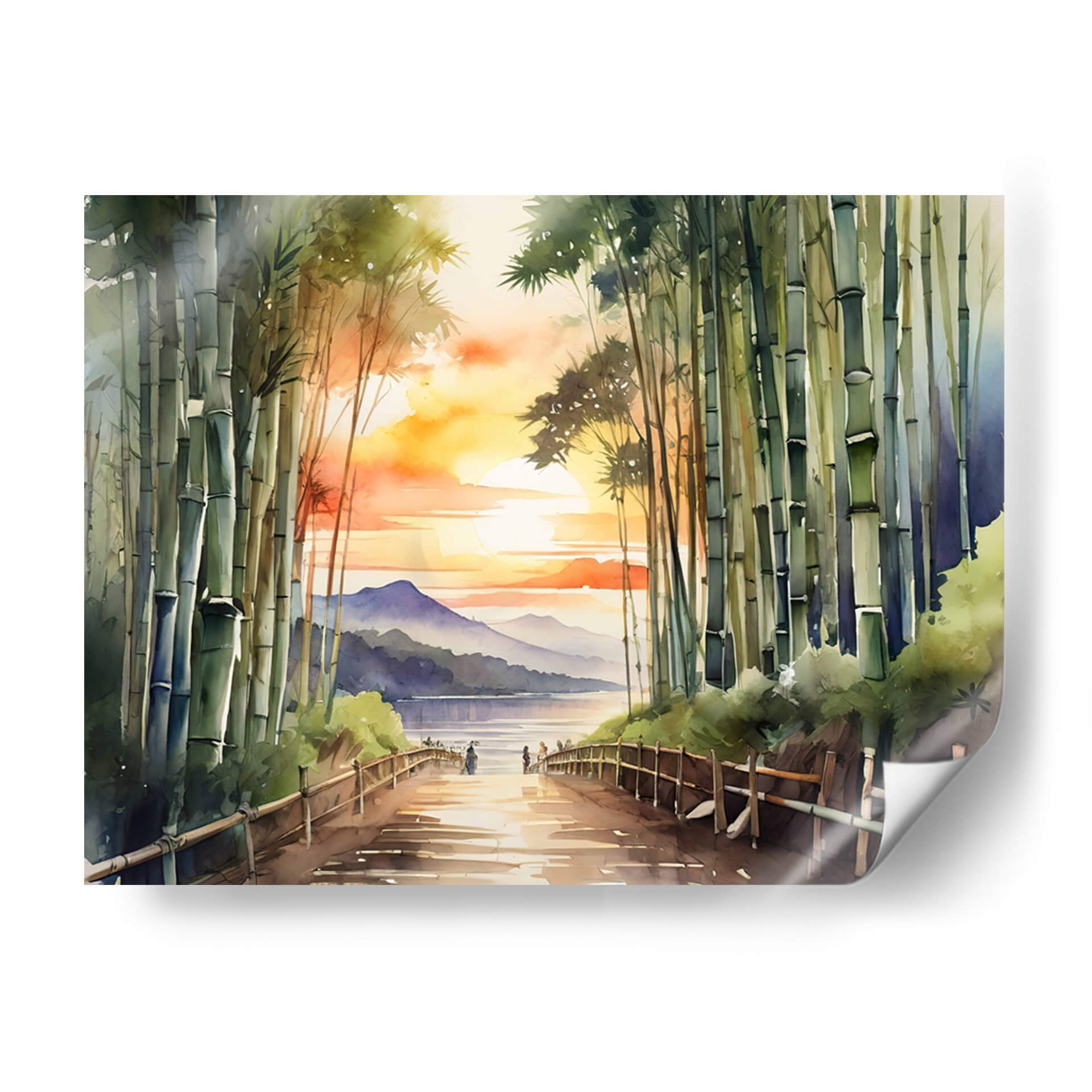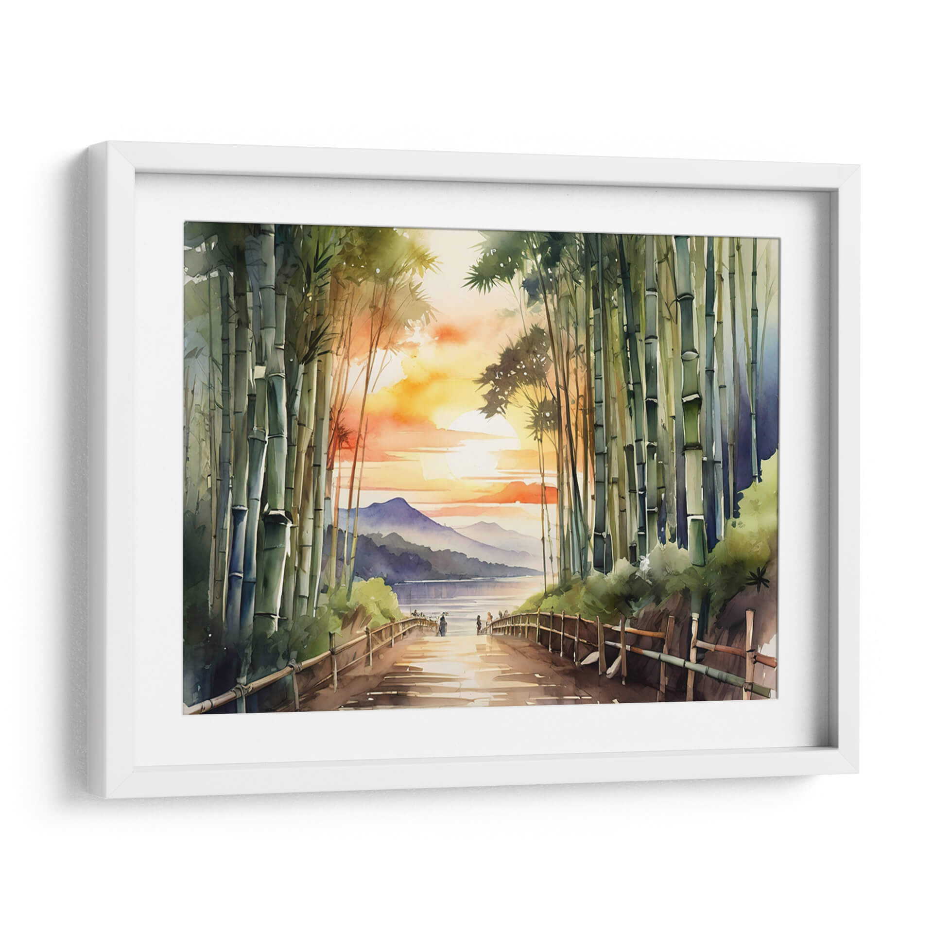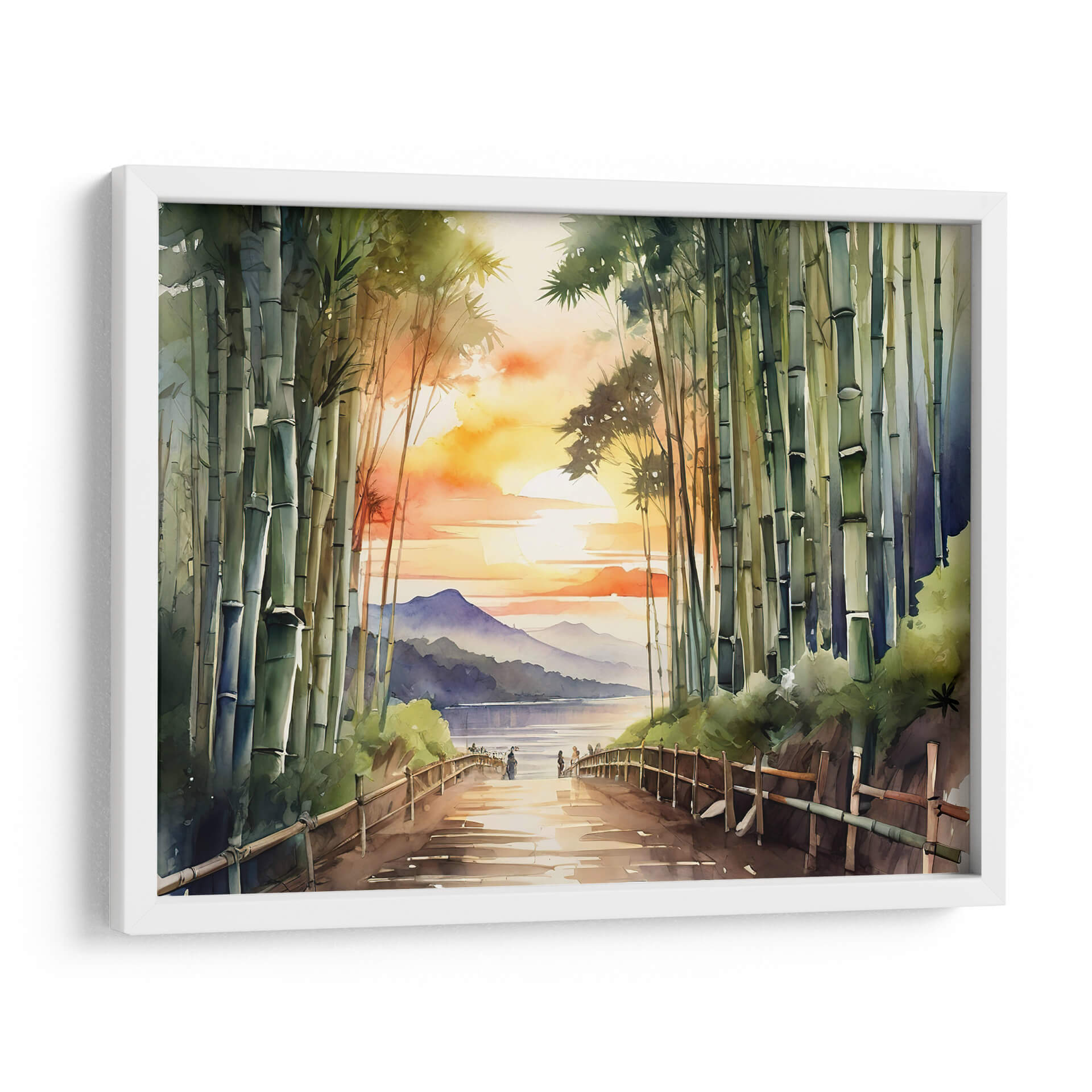 Sumérgete en la serena belleza del "Bosque de Bamboo Arashiyama", una obra de arte que captura la esencia de un atardecer etéreo en un entorno natural. Esta pieza, realizada con una técnica que recuerda a la acuarela, presenta una exuberante arboleda de bambú en primer plano, cuyos tallos verdes y texturizados guían la mirada hacia un sereno cuerpo de agua. A lo lejos, suaves montañas se recortan contra un cielo vibrante, teñido de naranjas, amarillos y rosados intensos, propios de un atardecer espectacular. La luz dorada se refleja en el camino y en el agua, creando una atmósfera de paz y contemplación. El estilo, que combina realismo con una pincelada suelta y expresiva, otorga a la escena una cualidad onírica y tranquilizadora. Este cuadro decorativo es perfecto para infundir calma y un toque de naturaleza a cualquier espacio, ya sea un dormitorio, un estudio o una sala de estar que busque un refugio de paz visual. Ideal para quienes aprecian la delicadeza de los paisajes asiáticos y la atmósfera introspectiva de los bosques de bambú.