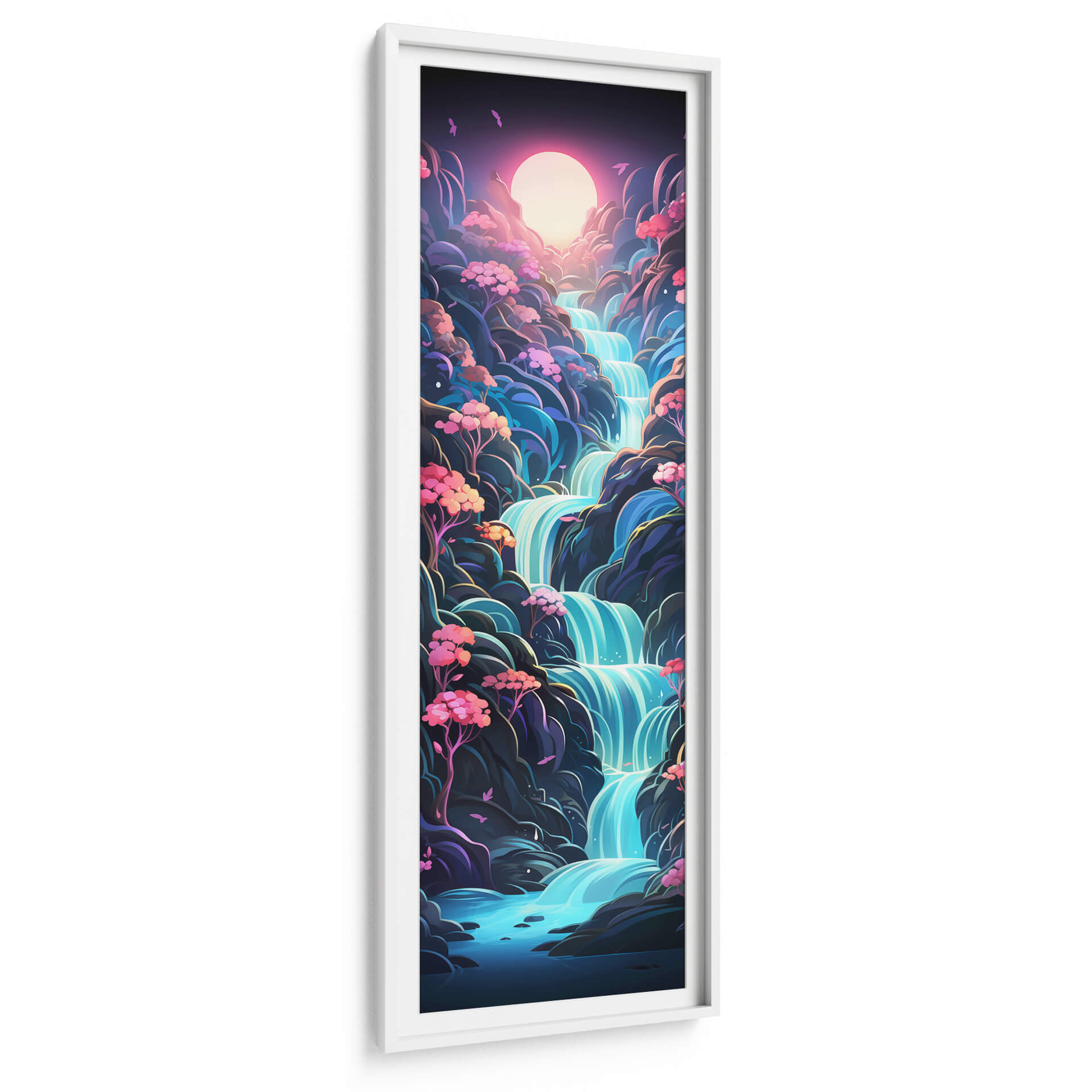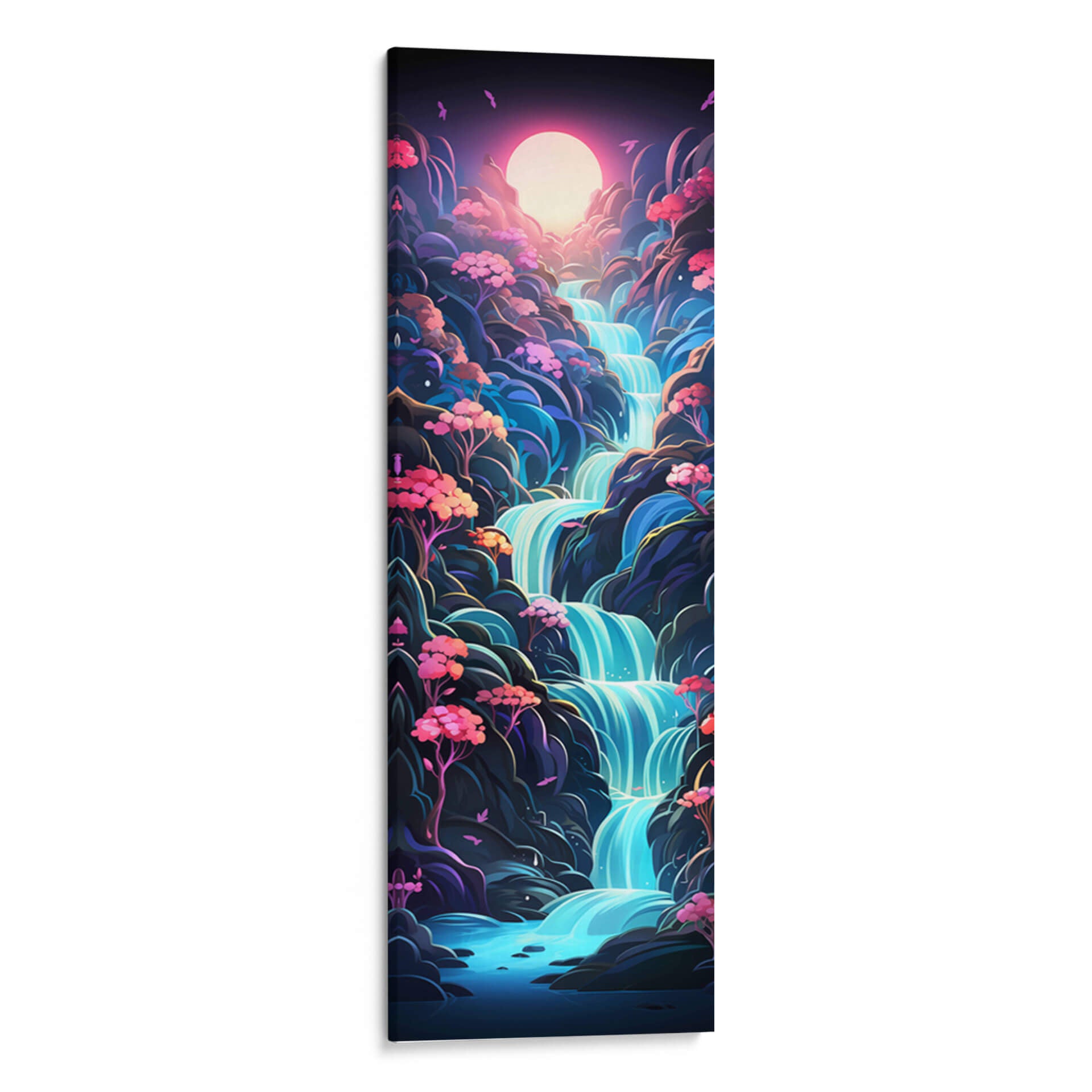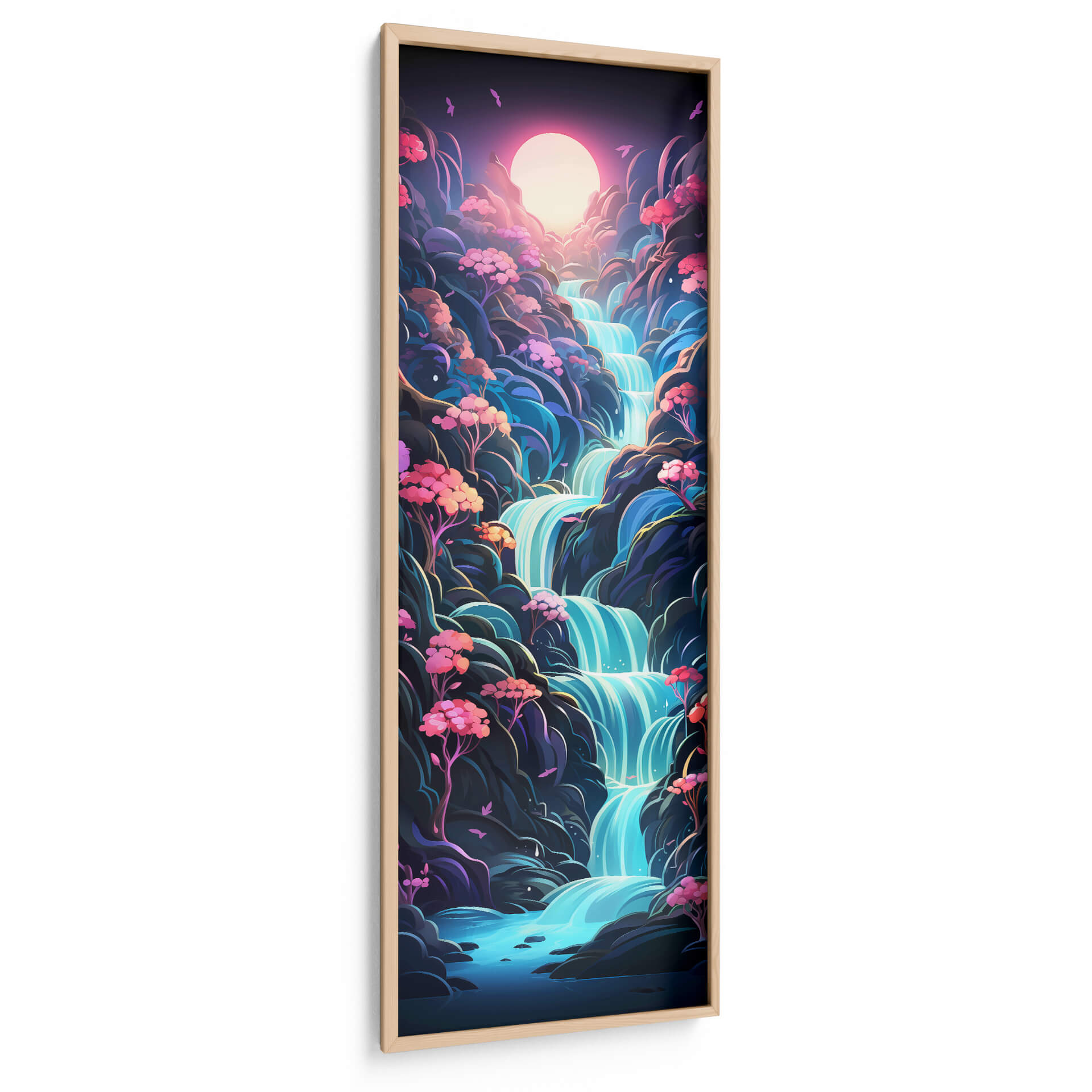 Sumérgete en la serenidad y el misterio con "Cascada de la Vida - 1", una obra de arte digital que te transportará a un reino de fantasía serena. Esta pieza cautivadora presenta una majestuosa cascada de tonos azul turquesa brillante que desciende en cascada por un paisaje rocoso oscuro, salpicado de vibrantes árboles de color rosa fucsia y un sol poniente que emana una luz cálida y etérea. La paleta de colores, una armoniosa fusión de azules profundos, púrpuras místicas y rosas vibrantes, crea una atmósfera de ensueño y tranquilidad. El estilo artístico, que evoca un toque de realismo mágico y estética de fantasía, con su composición vertical y detallada, lo convierte en el cuadro decorativo ideal para añadir un punto focal de calma y belleza a tu sala de estar, dormitorio o estudio. Deja que la energía revitalizante de esta cascada transforme tu espacio y fomente una sensación de paz interior. "Cascada de la Vida - 1" es más que una simple decoración de pared; es una invitación a la contemplación y un escape visual a un mundo de maravillas naturales.