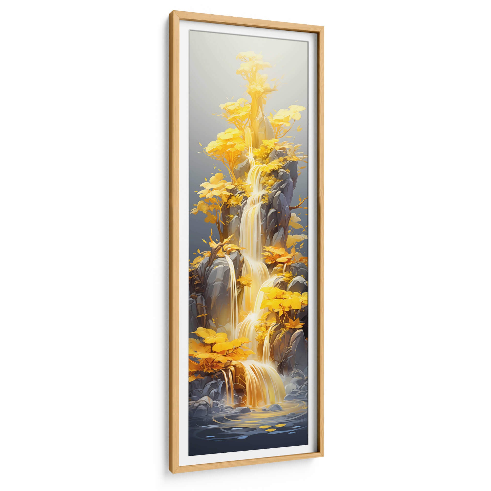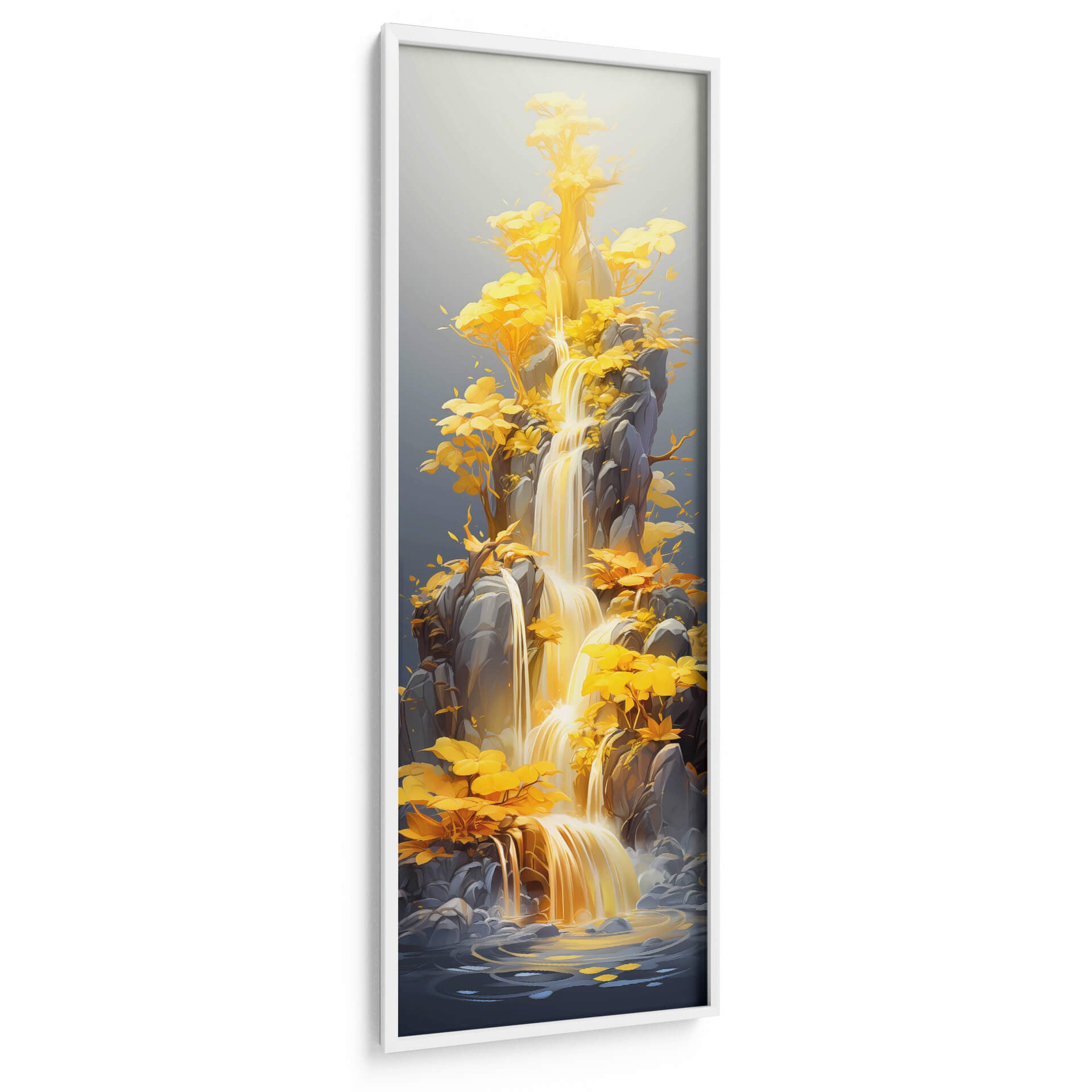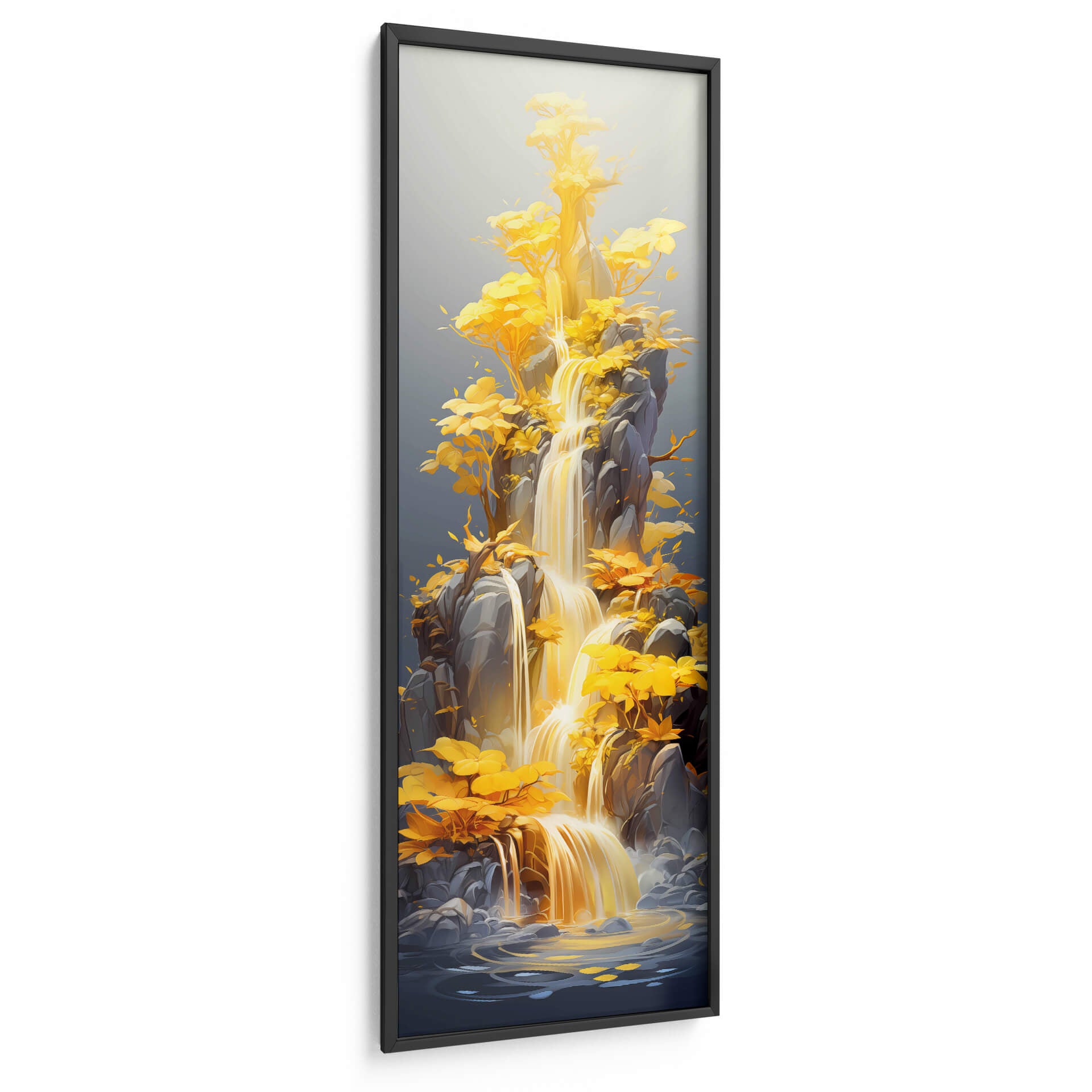 Sumérgete en la serenidad y el dinamismo con 'Cascada de la Vida - 3', una obra de arte digital que captura la esencia de la naturaleza en su máxima expresión. Este cuadro decorativo se destaca por su vibrante paleta de colores, dominada por intensos tonos dorados y amarillos que fluyen a través de una cascada de piedra, evocando la vitalidad y la energía de la vida misma. Las texturas de las rocas, representadas con un estilo semi-abstracto, contrastan armónicamente con la fluidez del agua y la delicadeza de las hojas doradas que salpican la composición. La atmósfera que emana de esta pieza es de calma profunda y renacimiento, ideal para transformar cualquier espacio en un santuario de paz y optimismo. Su formato vertical y su composición centralizada la convierten en un punto focal perfecto para salones modernos, recibidores o estudios, aportando un toque de sofisticación y color. Este cuadro decorativo es una invitación a la contemplación, un recordatorio constante de la belleza y el flujo incesante de la existencia. Añade un toque de naturaleza estilizada y energía positiva a tu hogar u oficina con esta pieza única de arte mural.