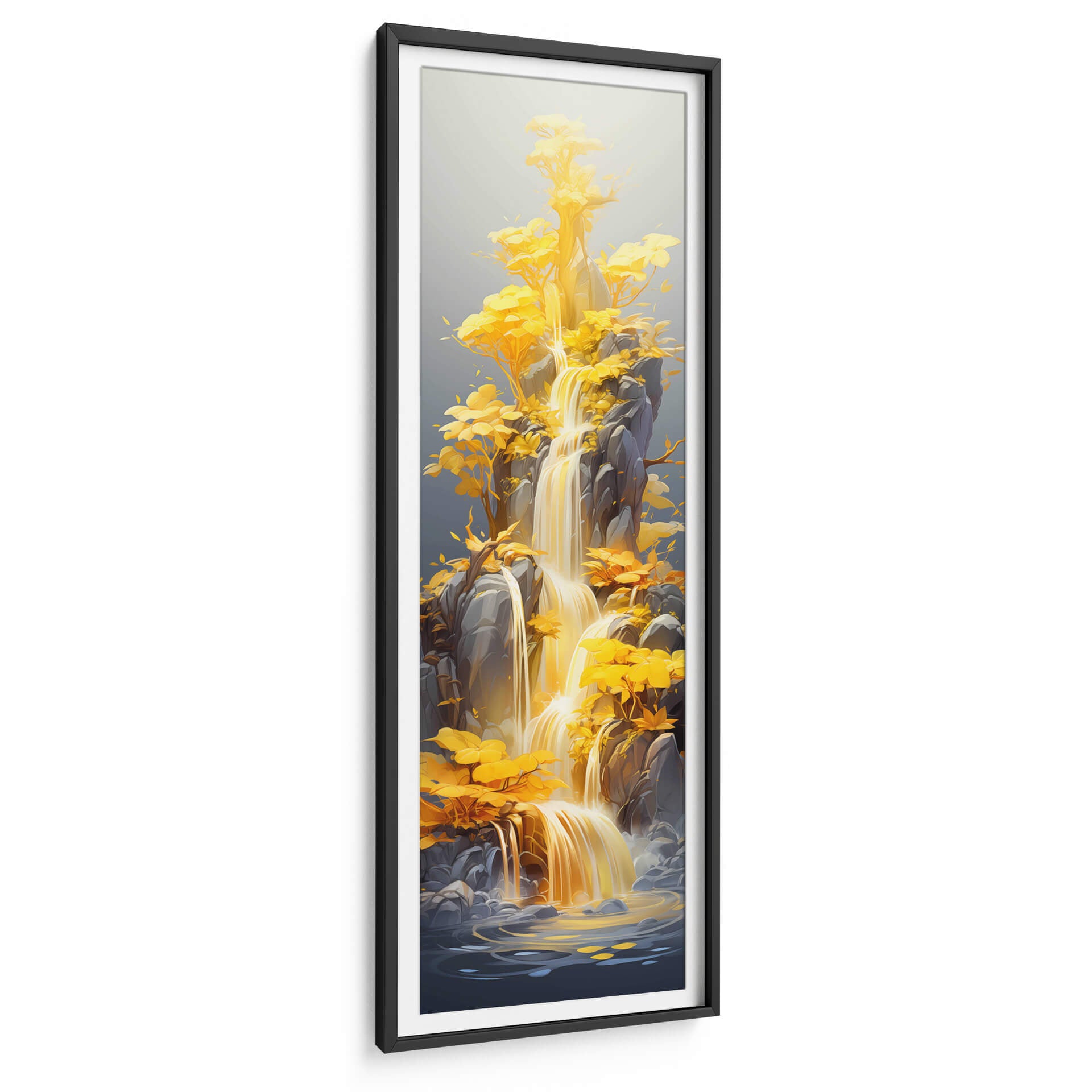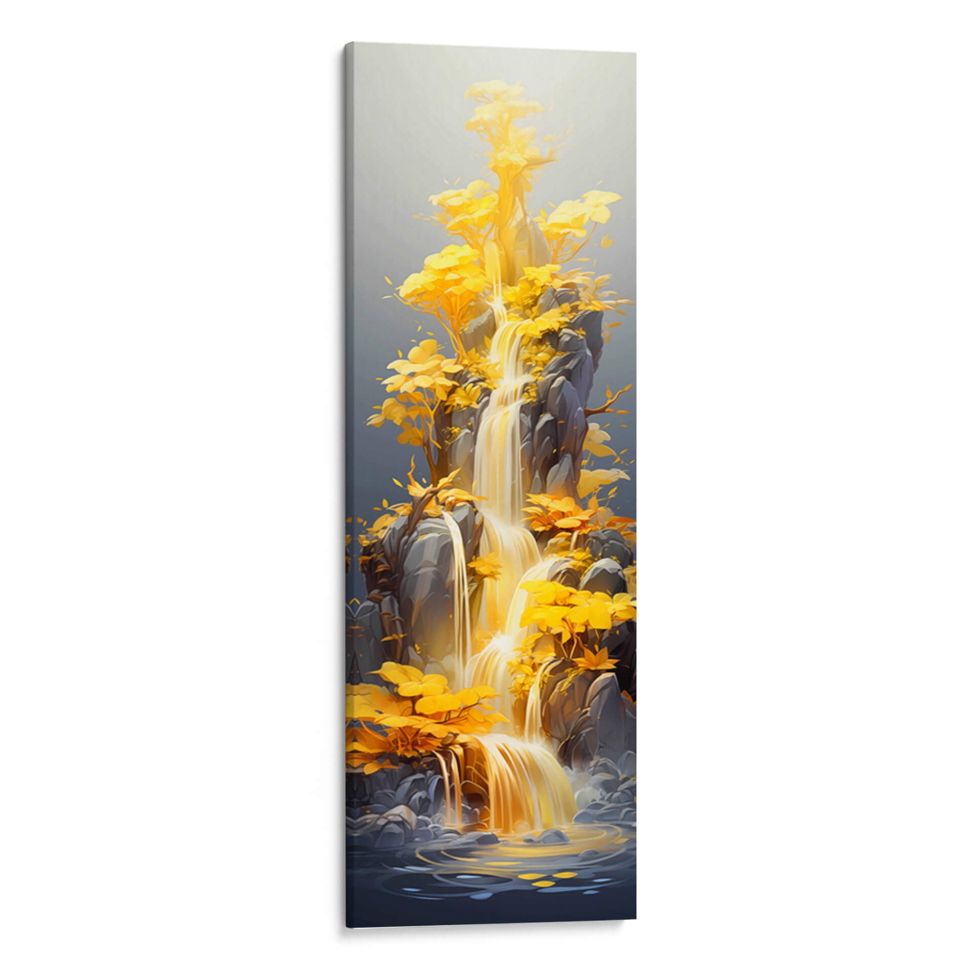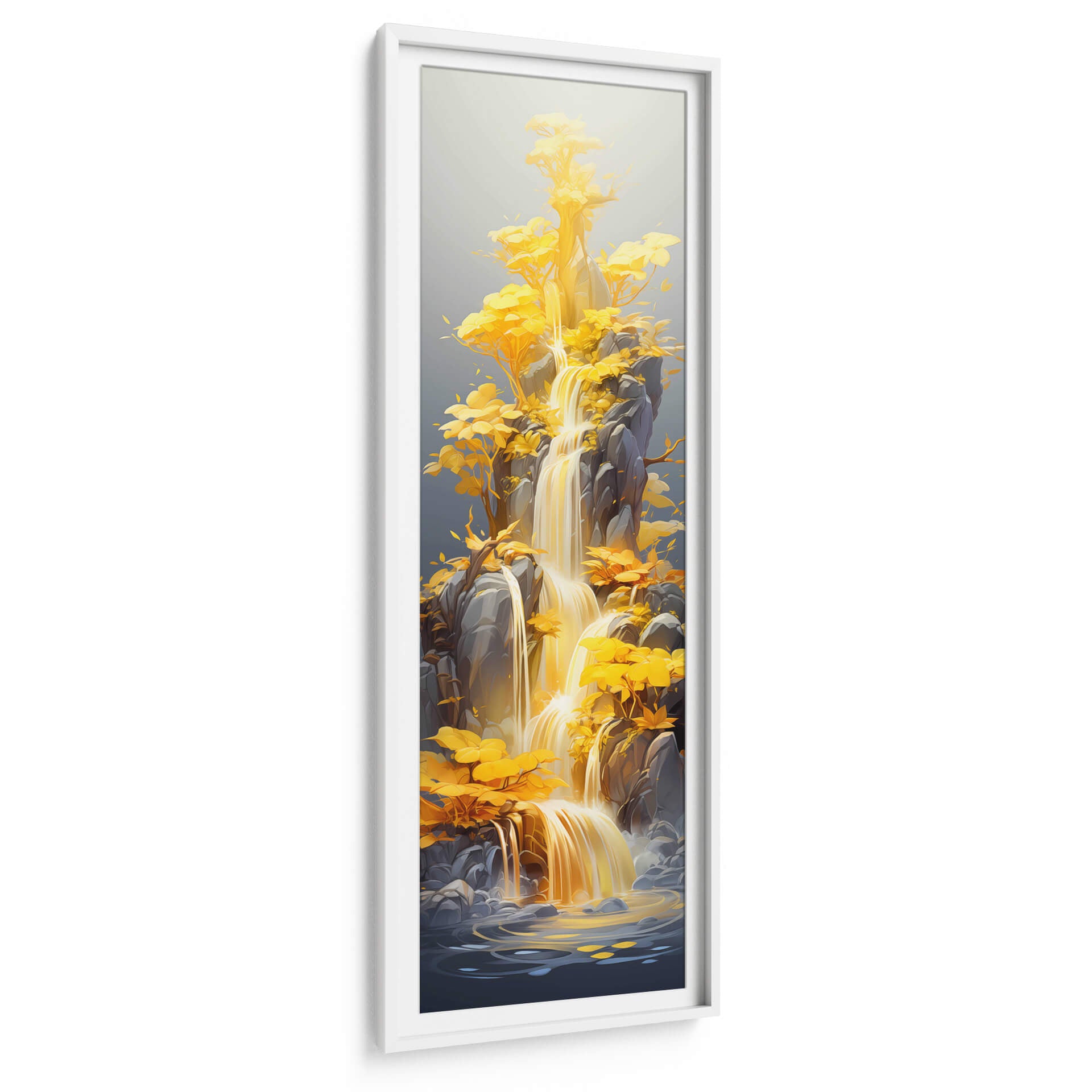 Sumérgete en la serenidad y el dinamismo con 'Cascada de la Vida - 3', una obra de arte digital que captura la esencia de la naturaleza en su máxima expresión. Este cuadro decorativo se destaca por su vibrante paleta de colores, dominada por intensos tonos dorados y amarillos que fluyen a través de una cascada de piedra, evocando la vitalidad y la energía de la vida misma. Las texturas de las rocas, representadas con un estilo semi-abstracto, contrastan armónicamente con la fluidez del agua y la delicadeza de las hojas doradas que salpican la composición. La atmósfera que emana de esta pieza es de calma profunda y renacimiento, ideal para transformar cualquier espacio en un santuario de paz y optimismo. Su formato vertical y su composición centralizada la convierten en un punto focal perfecto para salones modernos, recibidores o estudios, aportando un toque de sofisticación y color. Este cuadro decorativo es una invitación a la contemplación, un recordatorio constante de la belleza y el flujo incesante de la existencia. Añade un toque de naturaleza estilizada y energía positiva a tu hogar u oficina con esta pieza única de arte mural.