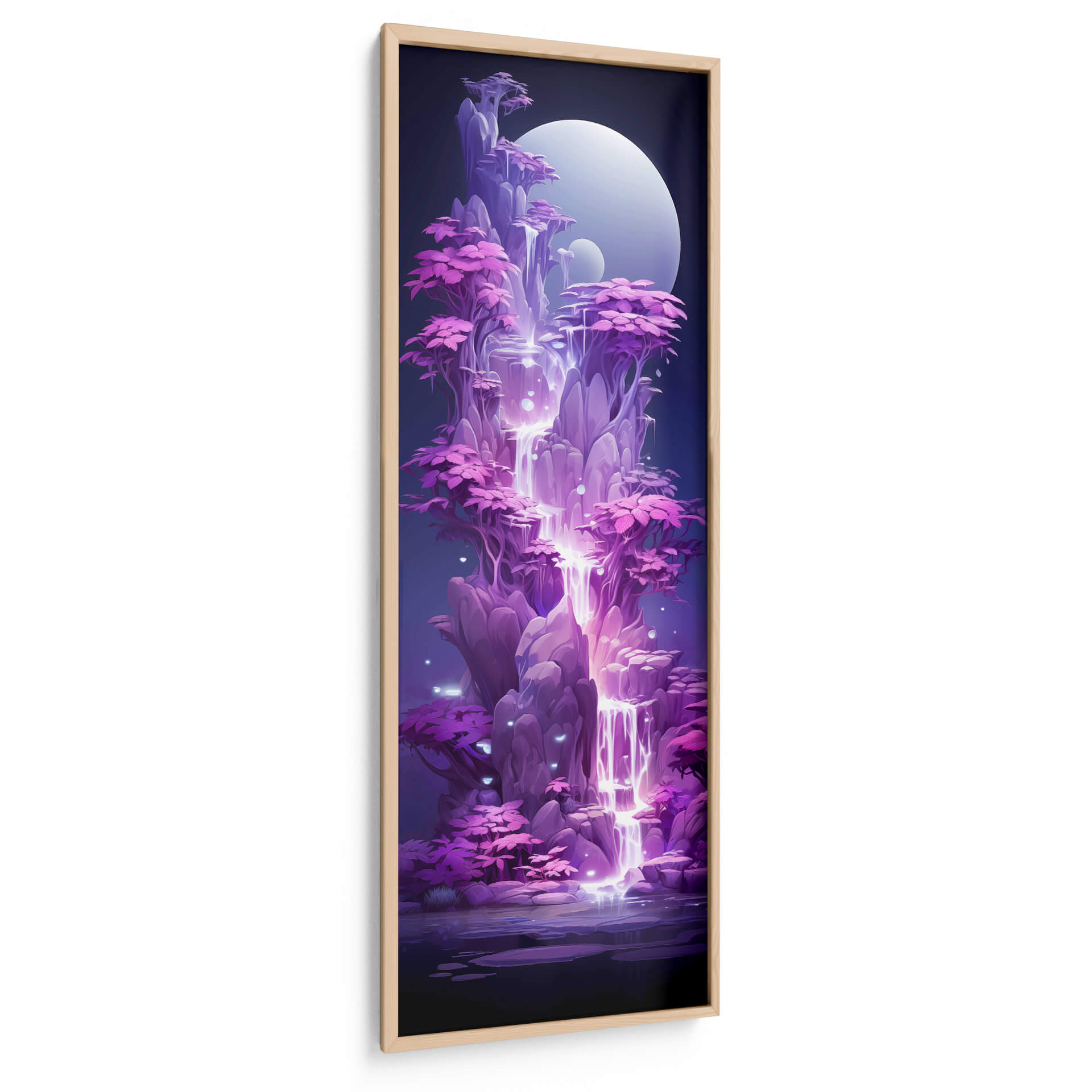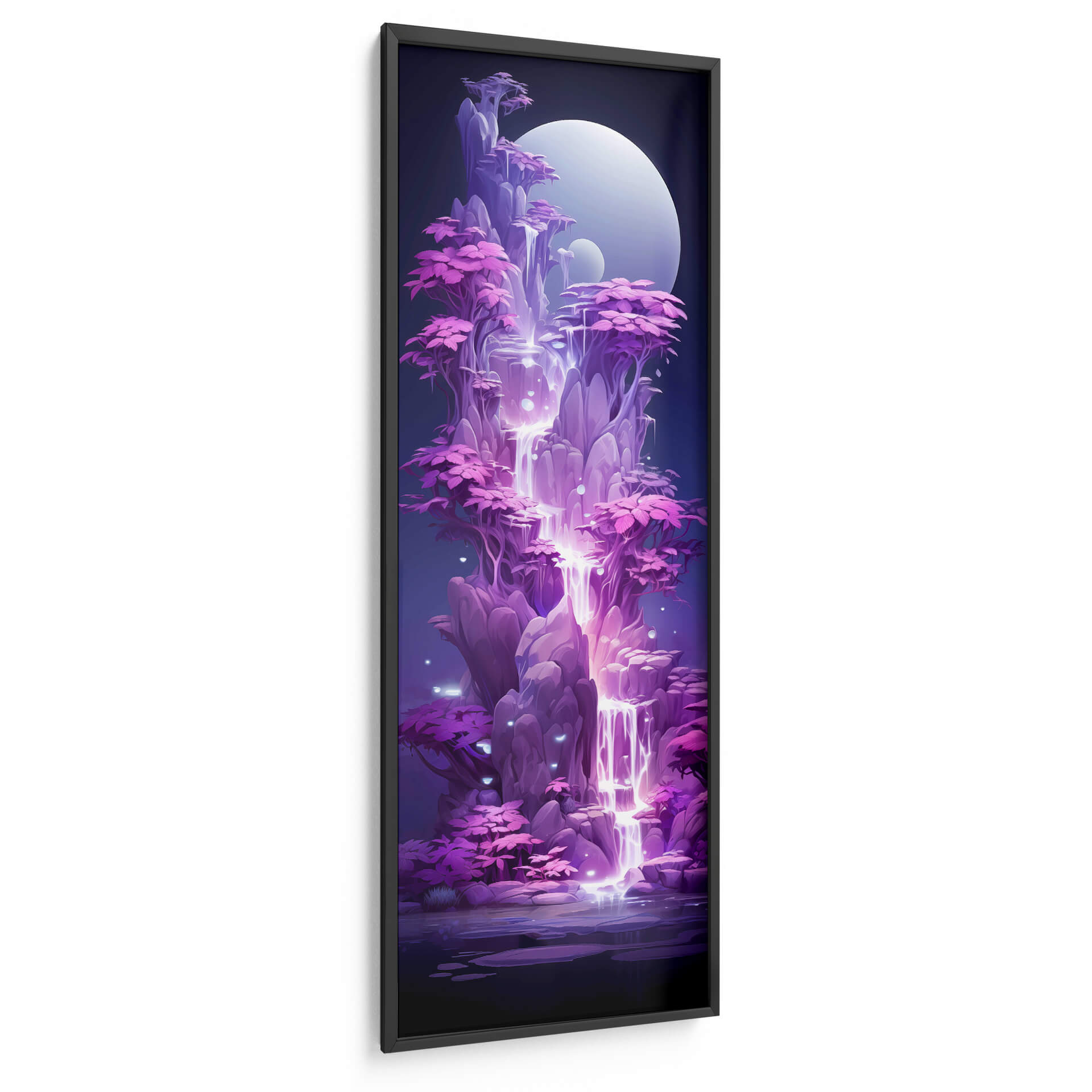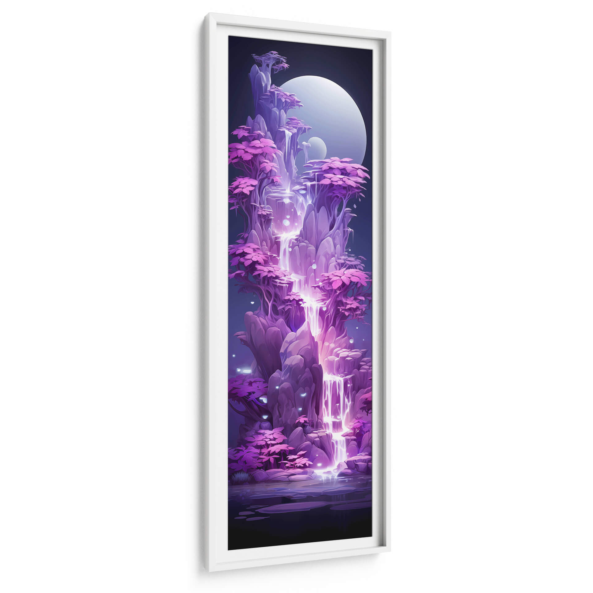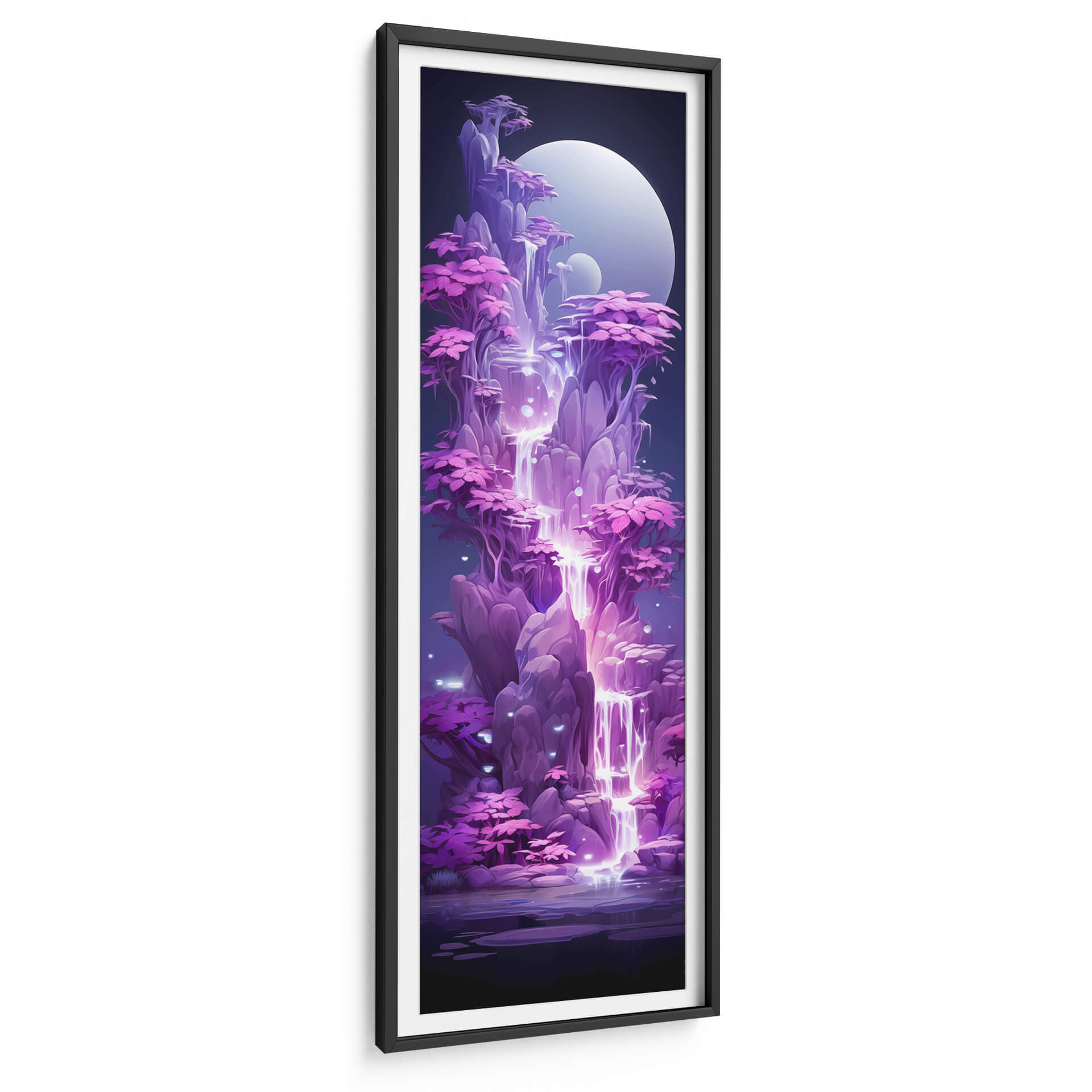 Sumérgete en la serenidad y el misterio de "Cascada de la Vida - 6", una obra de arte digital que transporta al espectador a un paisaje onírico y vibrante. Esta pieza maestra captura la esencia de una cascada etérea que fluye entre formaciones rocosas de tonos púrpuras y lavandas, bañada por la suave luz de una luna serena y dos lunas más pequeñas. Los árboles frondosos, con sus hojas en vibrantes matices de magenta y violeta, añaden un toque de vitalidad exótica a la composición, mientras que los pequeños destellos de luz que flotan alrededor de la cascada insinúan una magia oculta. La paleta de colores, dominada por morados profundos y acentos brillantes, crea una atmósfera de ensueño y tranquilidad, ideal para aquellos que buscan un rincón de paz en su hogar u oficina. Este cuadro decorativo abstracto, con su estilo fantasioso y su composición vertical, es perfecto para añadir un punto focal impactante y evocador a cualquier espacio, desde un dormitorio acogedor hasta un salón moderno o un estudio creativo. "Cascada de la Vida - 6" no es solo una imagen, es una invitación a explorar un mundo de fantasía y calma.