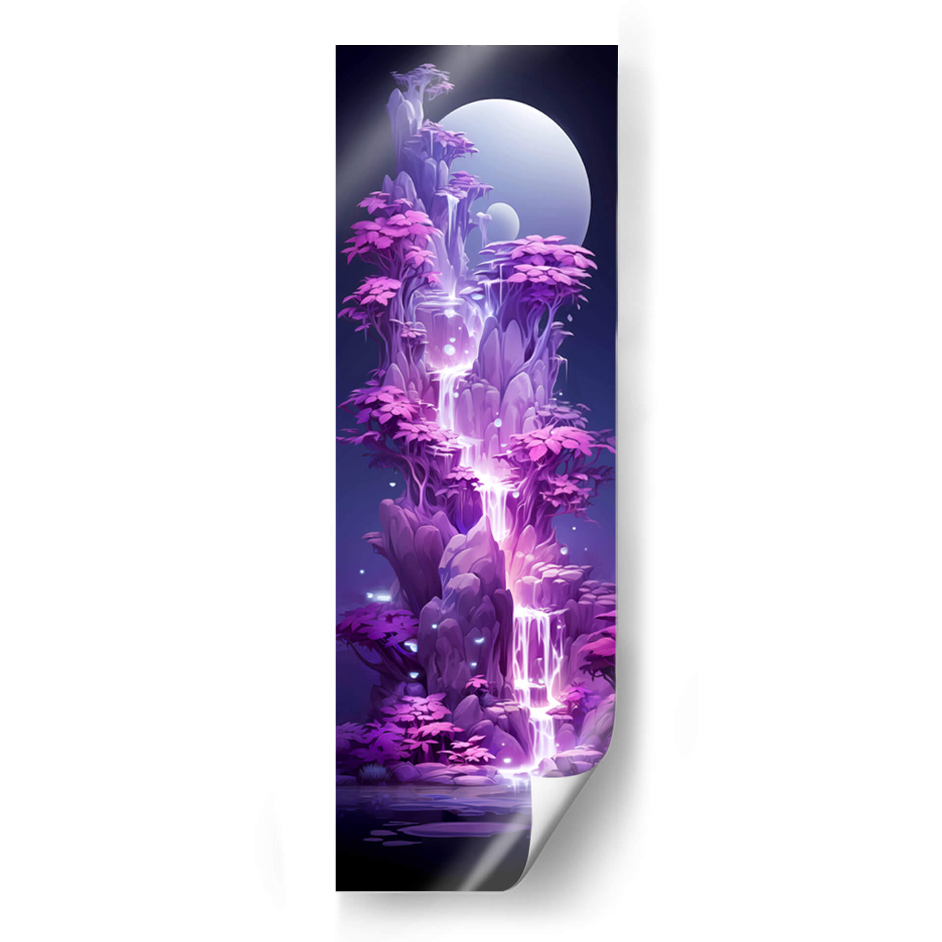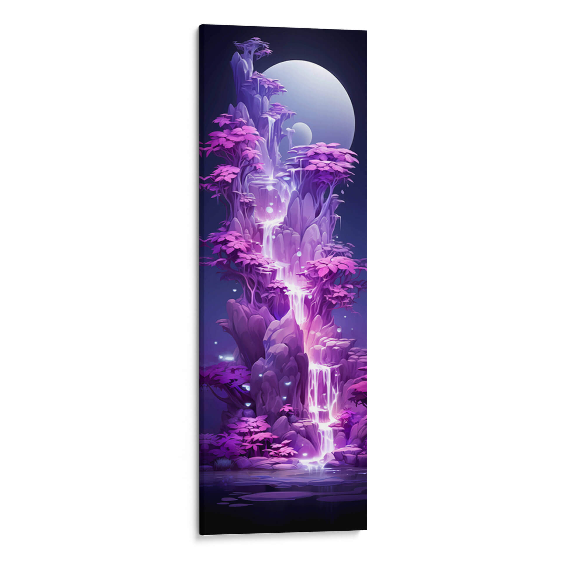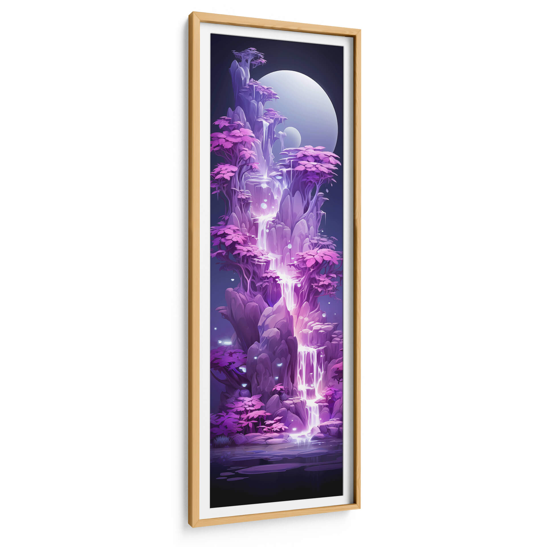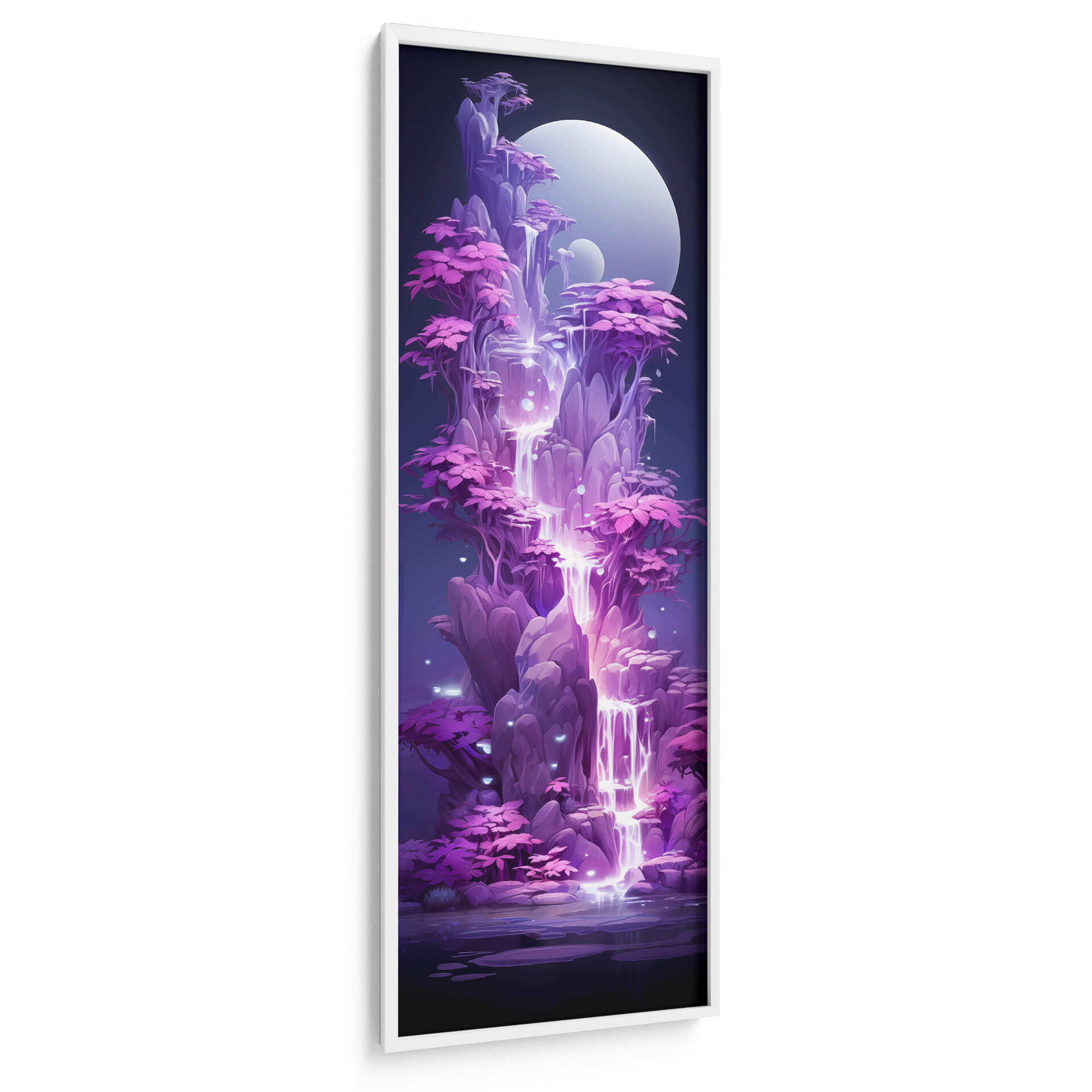 Sumérgete en la serenidad y el misterio de "Cascada de la Vida - 6", una obra de arte digital que transporta al espectador a un paisaje onírico y vibrante. Esta pieza maestra captura la esencia de una cascada etérea que fluye entre formaciones rocosas de tonos púrpuras y lavandas, bañada por la suave luz de una luna serena y dos lunas más pequeñas. Los árboles frondosos, con sus hojas en vibrantes matices de magenta y violeta, añaden un toque de vitalidad exótica a la composición, mientras que los pequeños destellos de luz que flotan alrededor de la cascada insinúan una magia oculta. La paleta de colores, dominada por morados profundos y acentos brillantes, crea una atmósfera de ensueño y tranquilidad, ideal para aquellos que buscan un rincón de paz en su hogar u oficina. Este cuadro decorativo abstracto, con su estilo fantasioso y su composición vertical, es perfecto para añadir un punto focal impactante y evocador a cualquier espacio, desde un dormitorio acogedor hasta un salón moderno o un estudio creativo. "Cascada de la Vida - 6" no es solo una imagen, es una invitación a explorar un mundo de fantasía y calma.