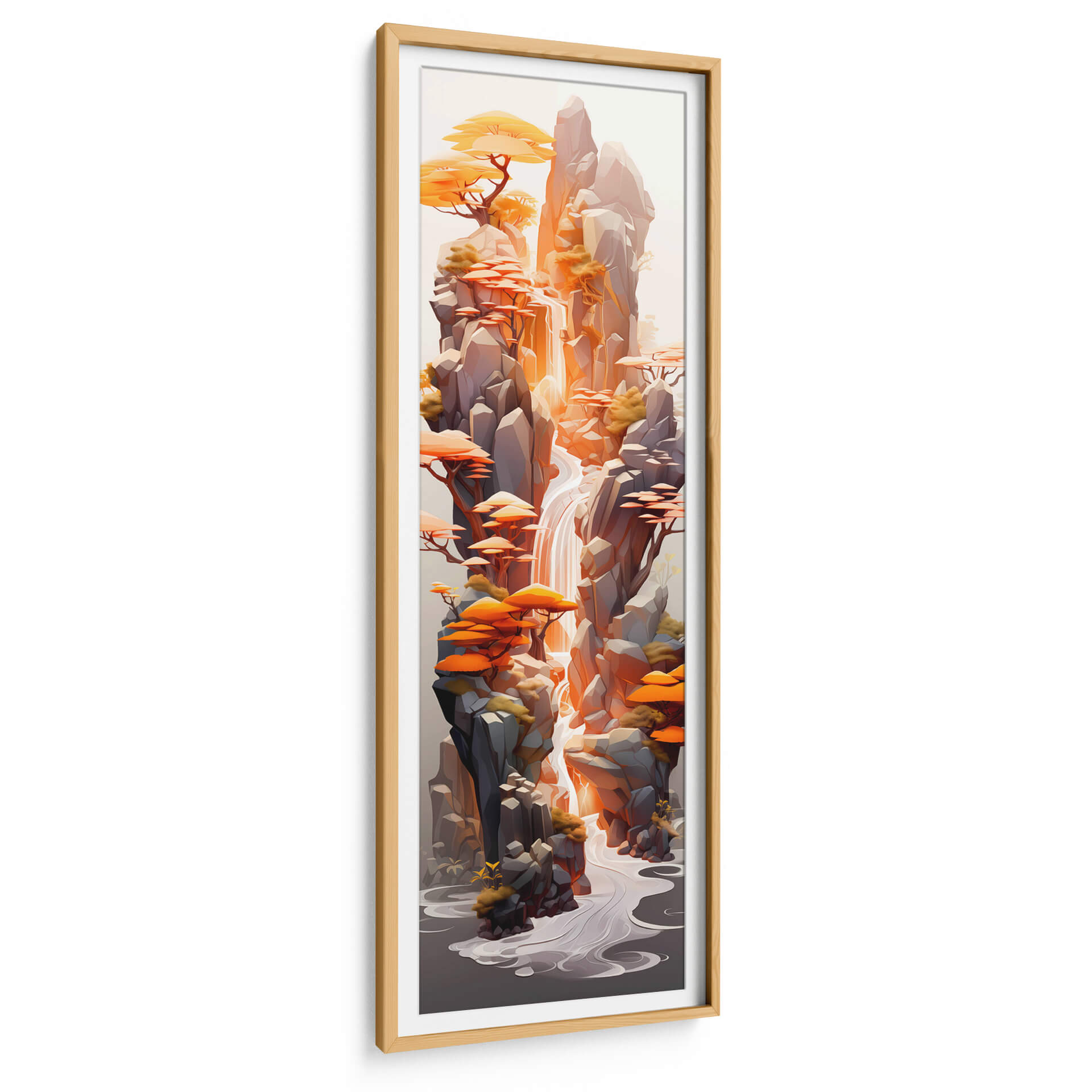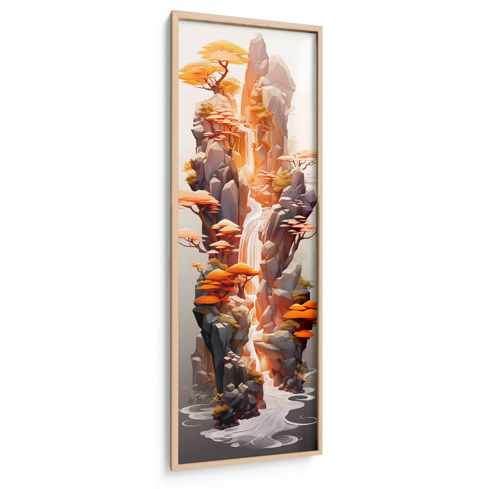 Sumérgete en la serenidad y la vitalidad de "Cascada de la Vida - 8", una obra de arte contemporáneo que captura la esencia de la naturaleza en su máxima expresión. Este cuadro decorativo, con su vibrante paleta de naranjas cálidos y grises pétreos, evoca una atmósfera de tranquilidad y fuerza. Las imponentes formaciones rocosas se elevan majestuosamente, entrelazadas con cascadas de agua que fluyen con gracia, mientras árboles estilizados con follaje anaranjado salpican las laderas, añadiendo toques de color y vida. La composición vertical y detallada invita a la contemplación, creando un punto focal cautivador para cualquier espacio. Ideal para quienes buscan infundir sus hogares u oficinas con una sensación de paz y energía renovada, este lienzo abstracto pero evocador se integra perfectamente en decoraciones modernas o de inspiración zen. Transforma tu ambiente con esta pieza única que celebra la belleza perenne del mundo natural, añadiendo un toque de sofisticación y serenidad a tu vida.