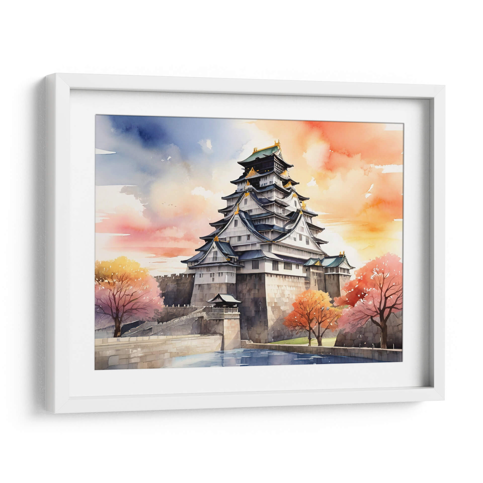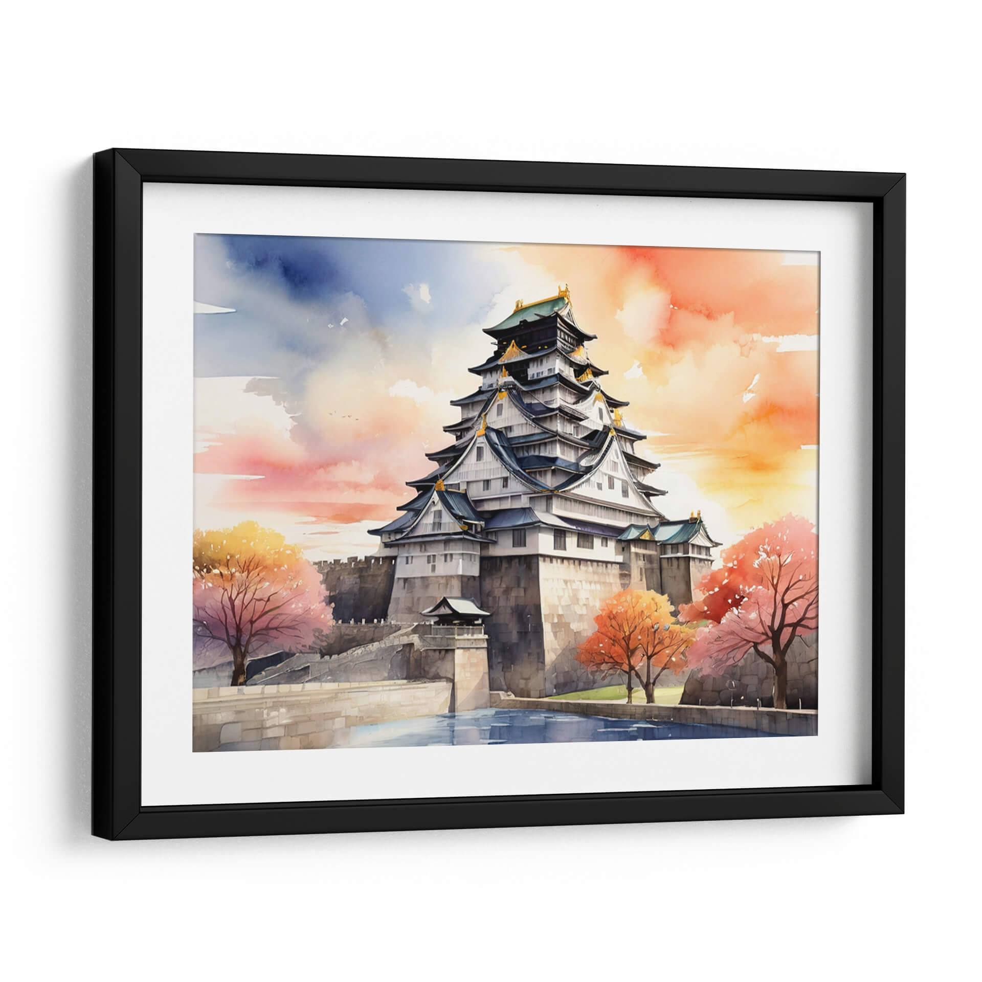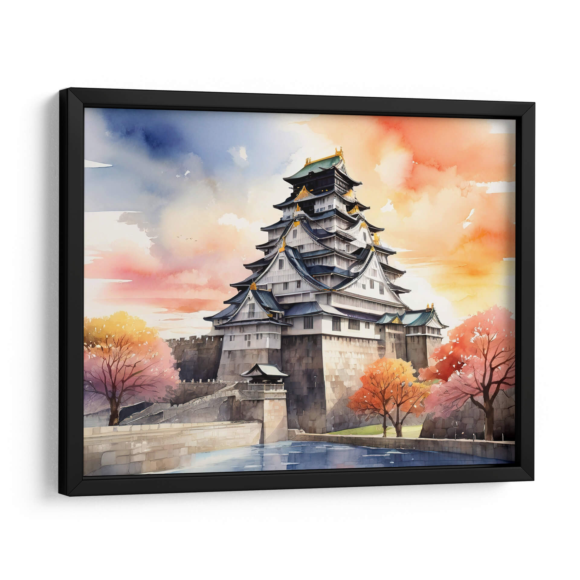 Sumérgete en la majestuosidad del Castillo de Osaka con esta cautivadora obra de arte digital, pintada con la delicadeza de la acuarela. La pieza captura la imponente arquitectura del castillo japonés, con sus múltiples niveles y tejados curvos adornados con detalles dorados, contrastando con la fortaleza de sus muros de piedra. La atmósfera se enriquece con un cielo vibrante de tonos anaranjados, rosados y azules, que evocan un atardecer sereno o un amanecer lleno de energía. Los árboles de follaje otoñal en tonos rojizos y amarillos añaden un toque de calidez y color, creando un paisaje equilibrado y lleno de vida. El reflejo del agua en primer plano aporta profundidad y serenidad a la composición. Este cuadro decorativo es ideal para quienes buscan infundir a su hogar u oficina una sensación de paz, historia y belleza exótica. Perfecto como pieza central en una sala de estar moderna, un estudio o un dormitorio, este arte de pared invita a la contemplación y añade un toque de sofisticación cultural. Añade un toque de Japón a tu decoración con este evocador cuadro.