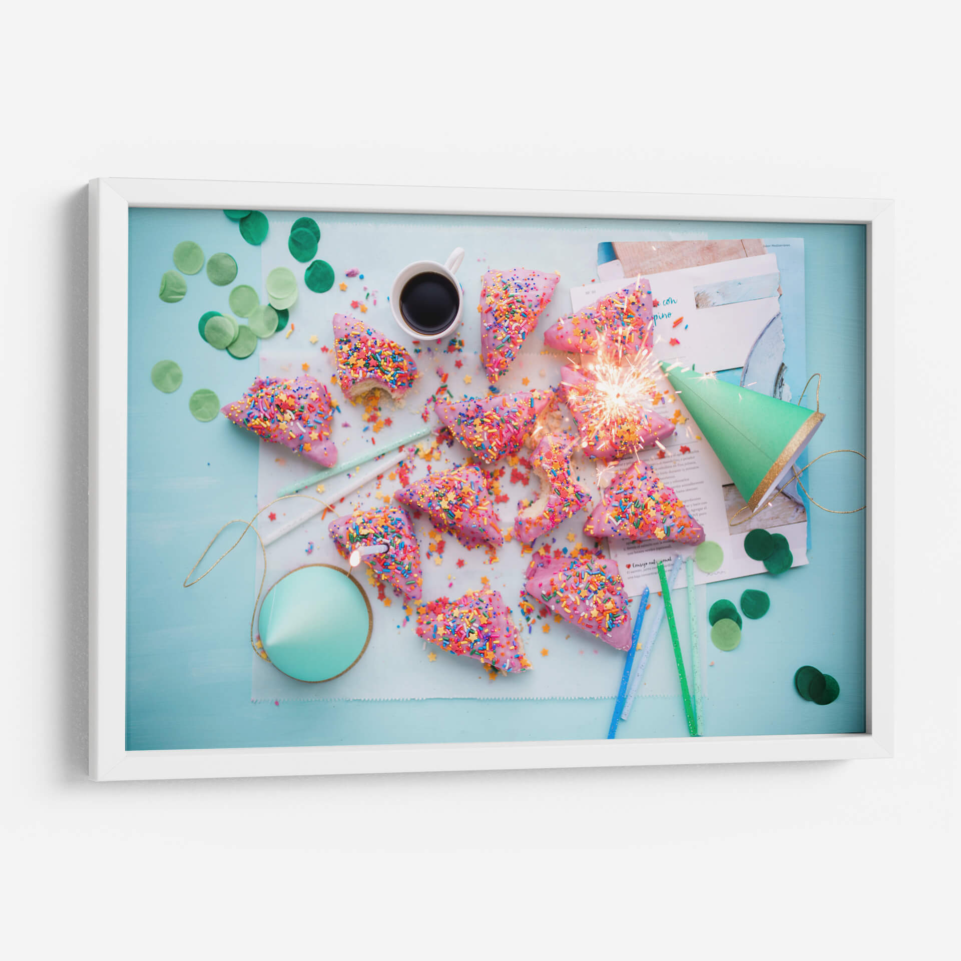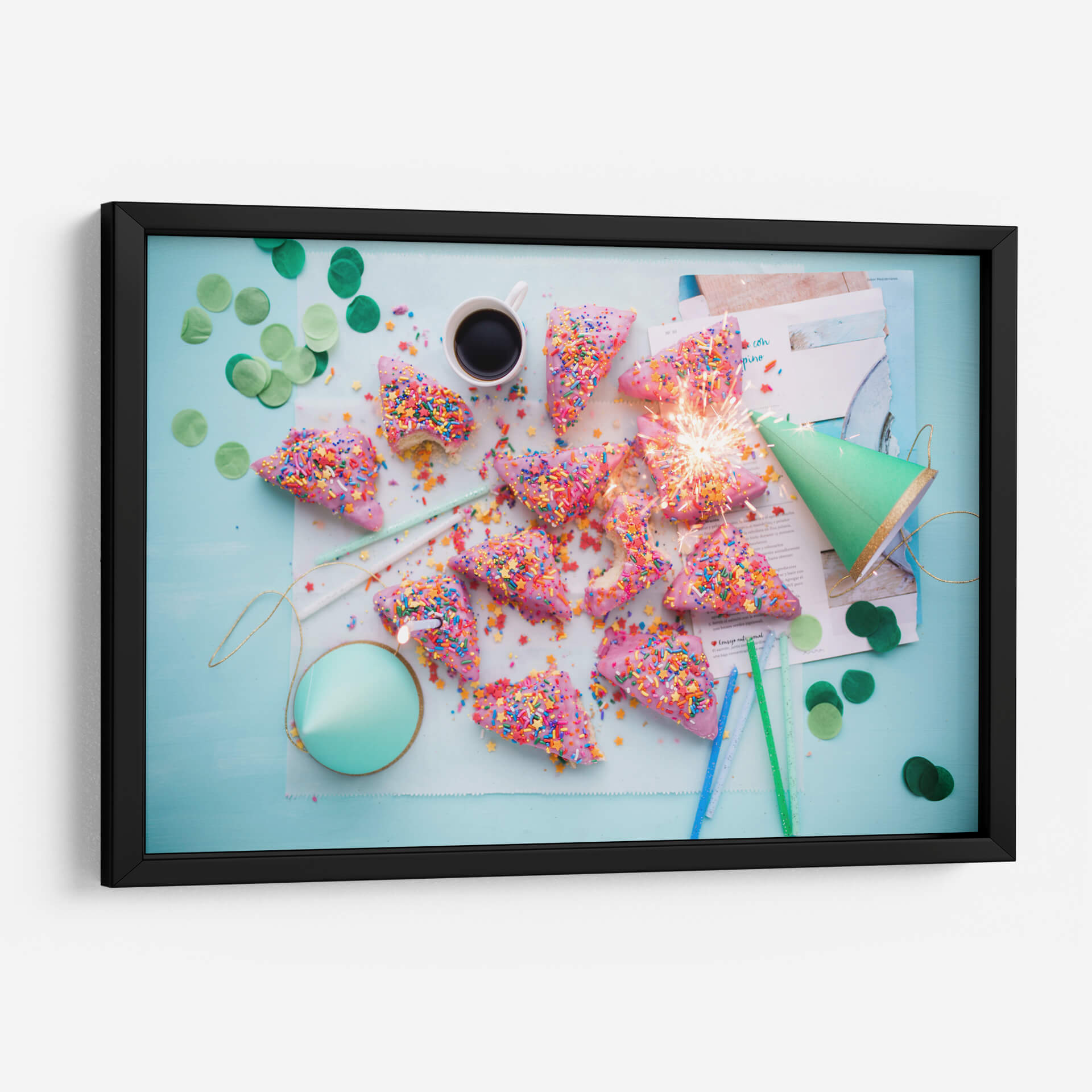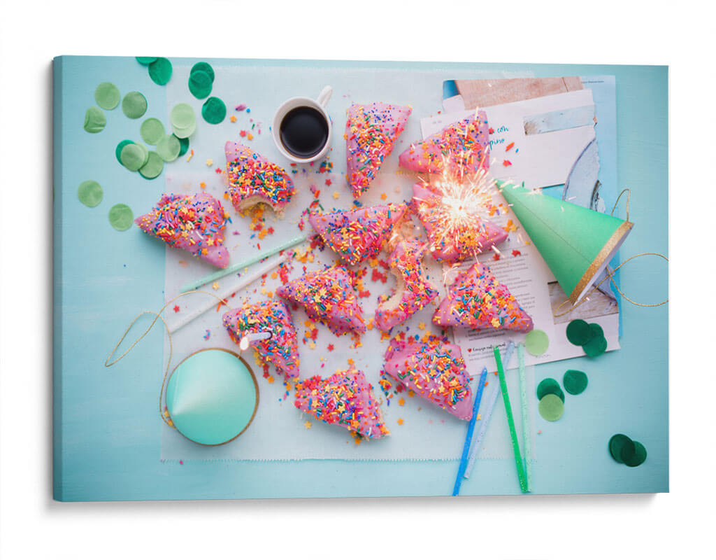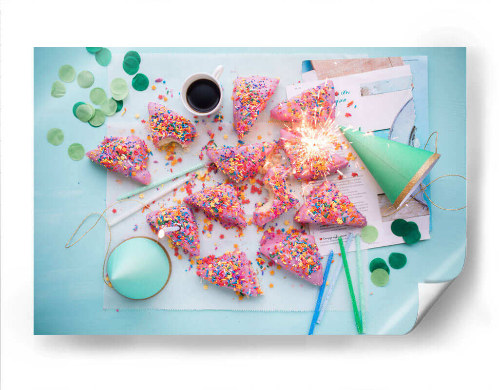 Celebra la alegría y la espontaneidad con este vibrante cuadro decorativo, cuyo título captura la esencia de una fiesta inesperada y deliciosa. La obra presenta una disposición lúdica de dulces con forma de cuña, cubiertos de un glaseado rosa vibrante y espolvoreados con una explosión de coloridas virutas. Un festivo cono verde y confeti disperso añaden un toque de celebración, mientras que un chispeante artículo pirotécnico ilumina el centro de la composición, evocando la emoción de un momento fugaz pero inolvidable. Los colores pastel y las texturas azucaradas crean una atmósfera de pura felicidad y diversión, perfecta para quienes buscan inyectar energía positiva en su hogar u oficina. Este cuadro es ideal para espacios que buscan reflejar una personalidad alegre y optimista, como cocinas, salas de estar o comedores, aportando un toque de dulzura y vivacidad. Integra la esencia de la celebración y el placer en tu decoración, creando un ambiente acogedor y lleno de vida que encantará a tus invitados y te recordará la importancia de disfrutar los pequeños momentos.