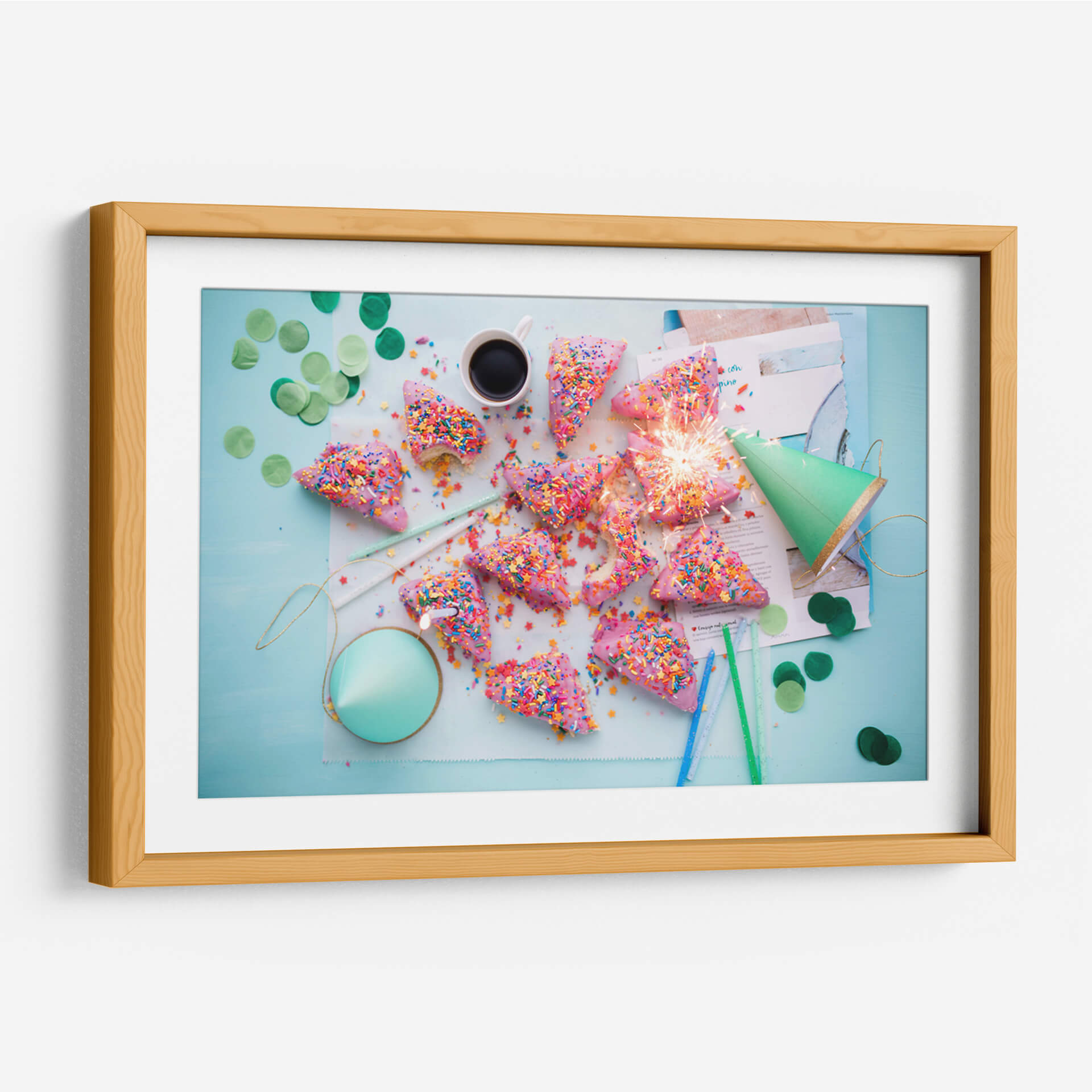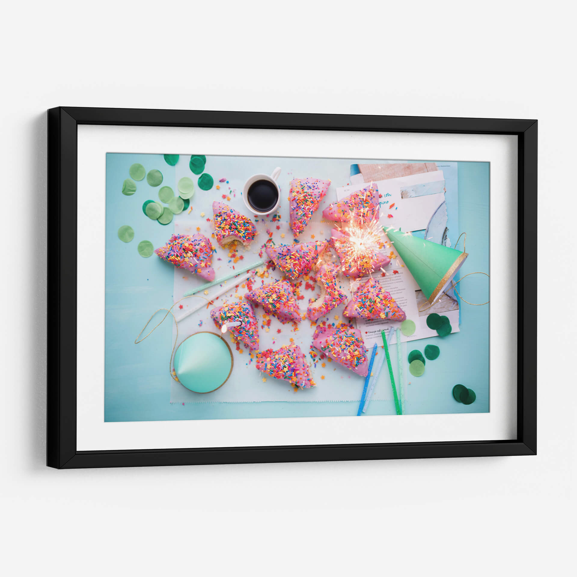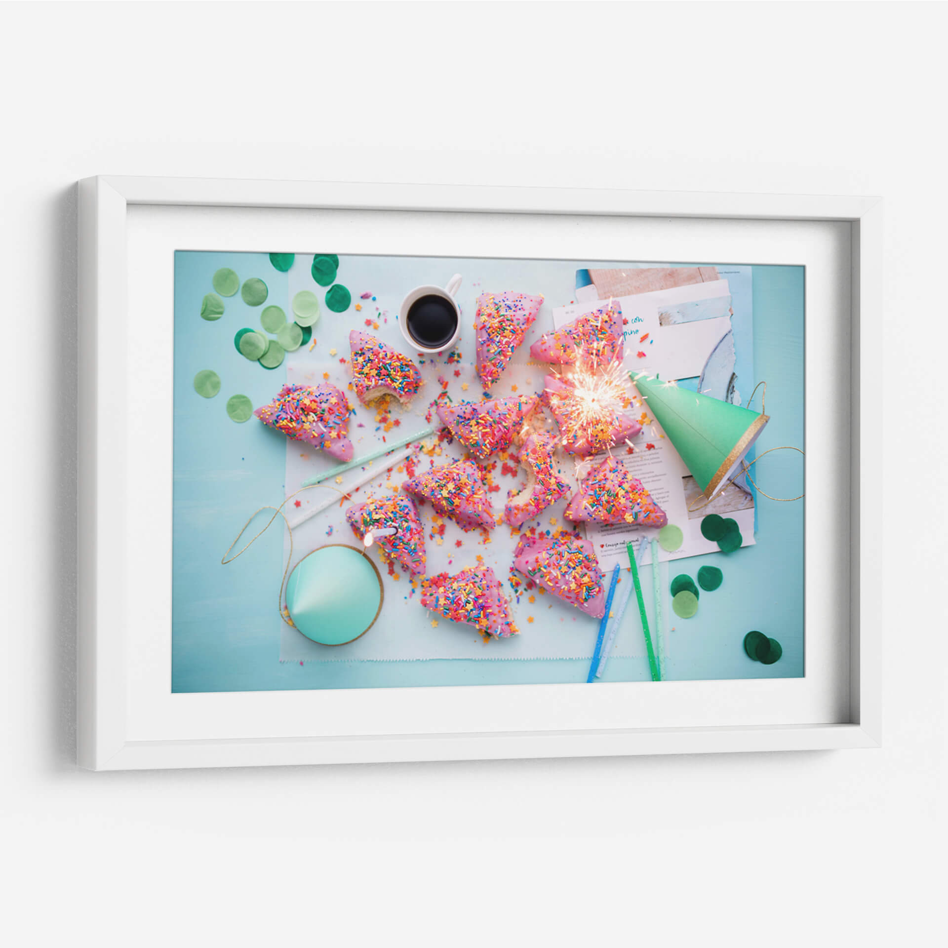 Celebra la alegría y la espontaneidad con este vibrante cuadro decorativo, cuyo título captura la esencia de una fiesta inesperada y deliciosa. La obra presenta una disposición lúdica de dulces con forma de cuña, cubiertos de un glaseado rosa vibrante y espolvoreados con una explosión de coloridas virutas. Un festivo cono verde y confeti disperso añaden un toque de celebración, mientras que un chispeante artículo pirotécnico ilumina el centro de la composición, evocando la emoción de un momento fugaz pero inolvidable. Los colores pastel y las texturas azucaradas crean una atmósfera de pura felicidad y diversión, perfecta para quienes buscan inyectar energía positiva en su hogar u oficina. Este cuadro es ideal para espacios que buscan reflejar una personalidad alegre y optimista, como cocinas, salas de estar o comedores, aportando un toque de dulzura y vivacidad. Integra la esencia de la celebración y el placer en tu decoración, creando un ambiente acogedor y lleno de vida que encantará a tus invitados y te recordará la importancia de disfrutar los pequeños momentos.