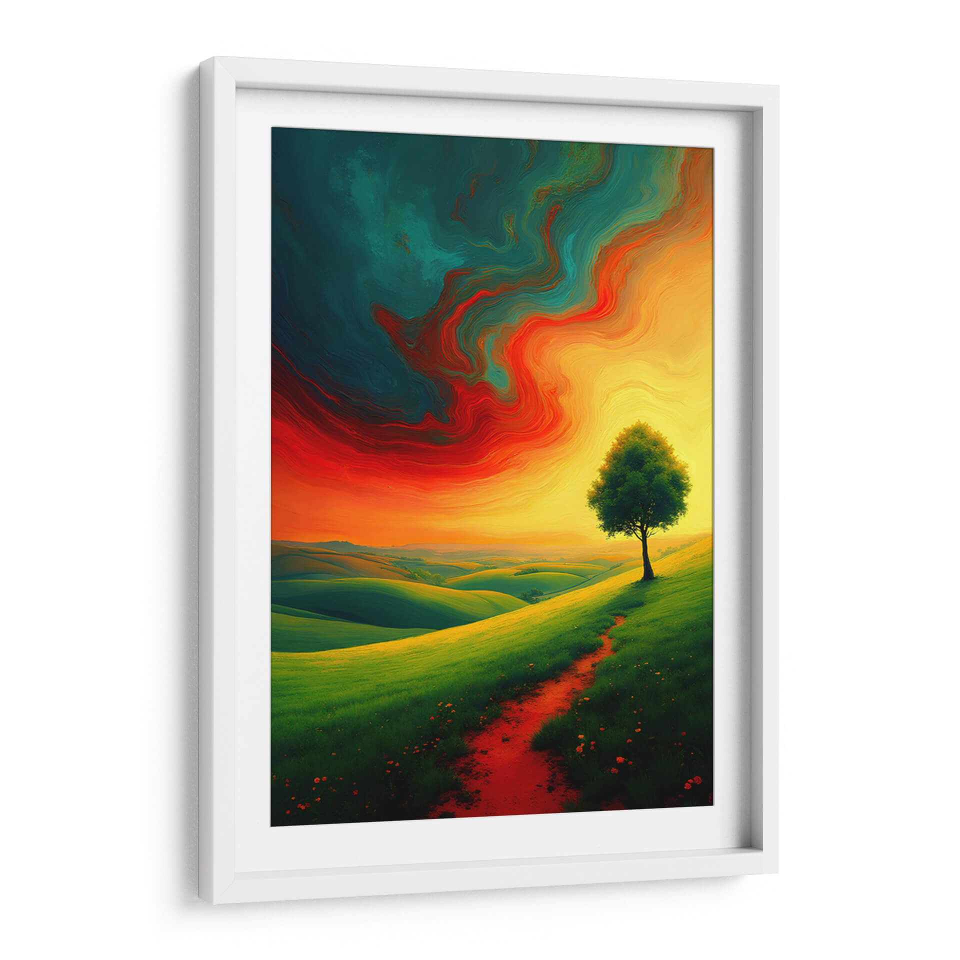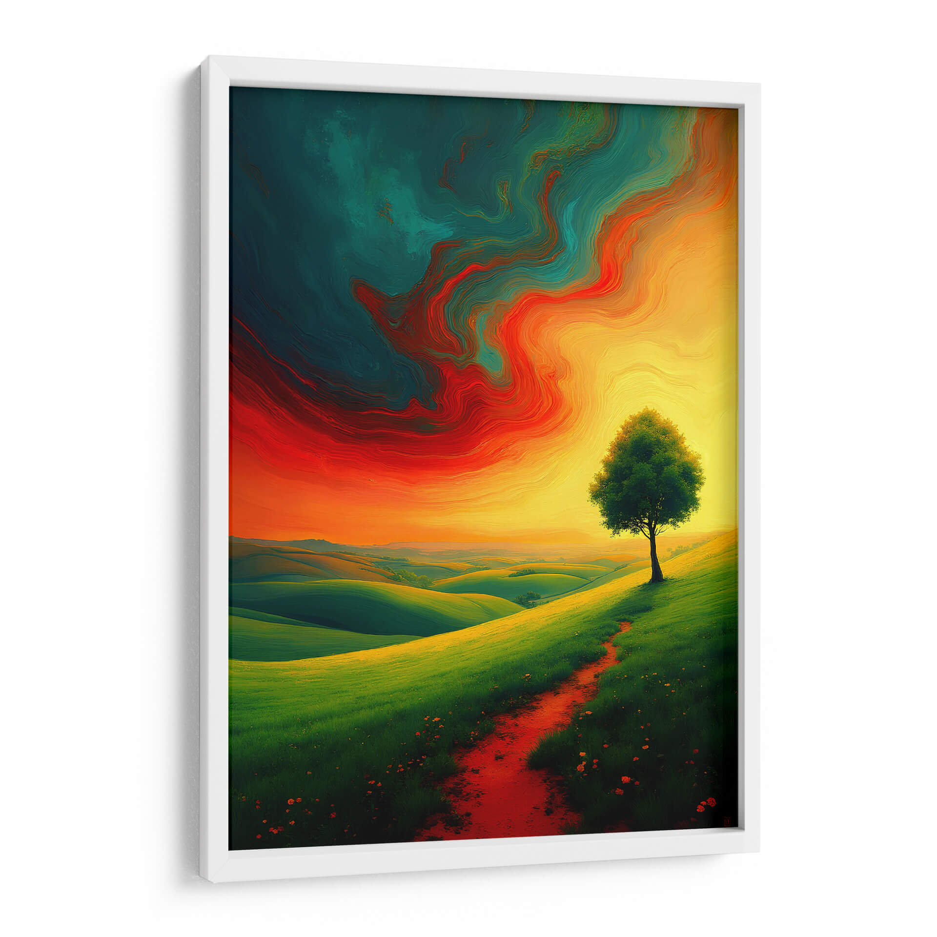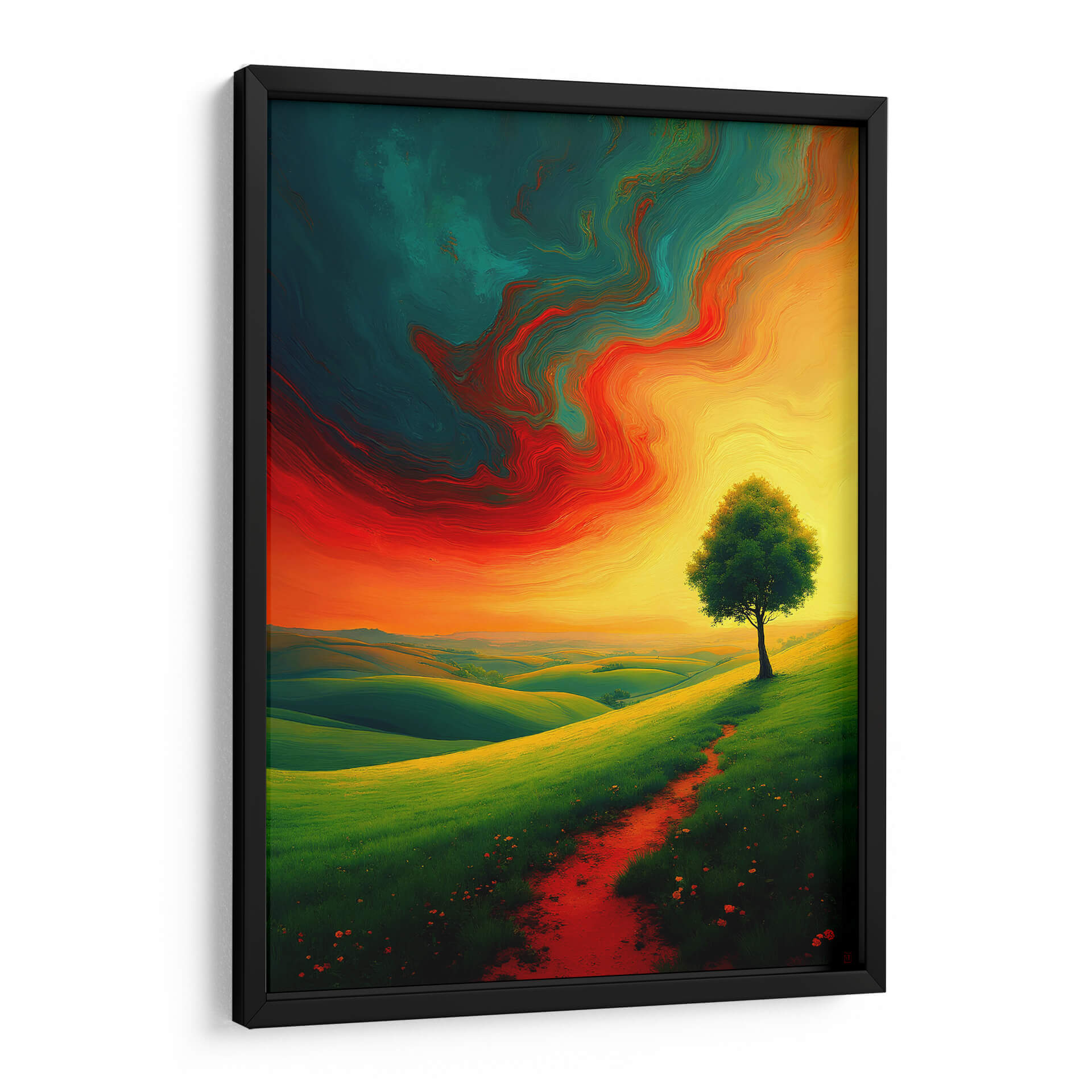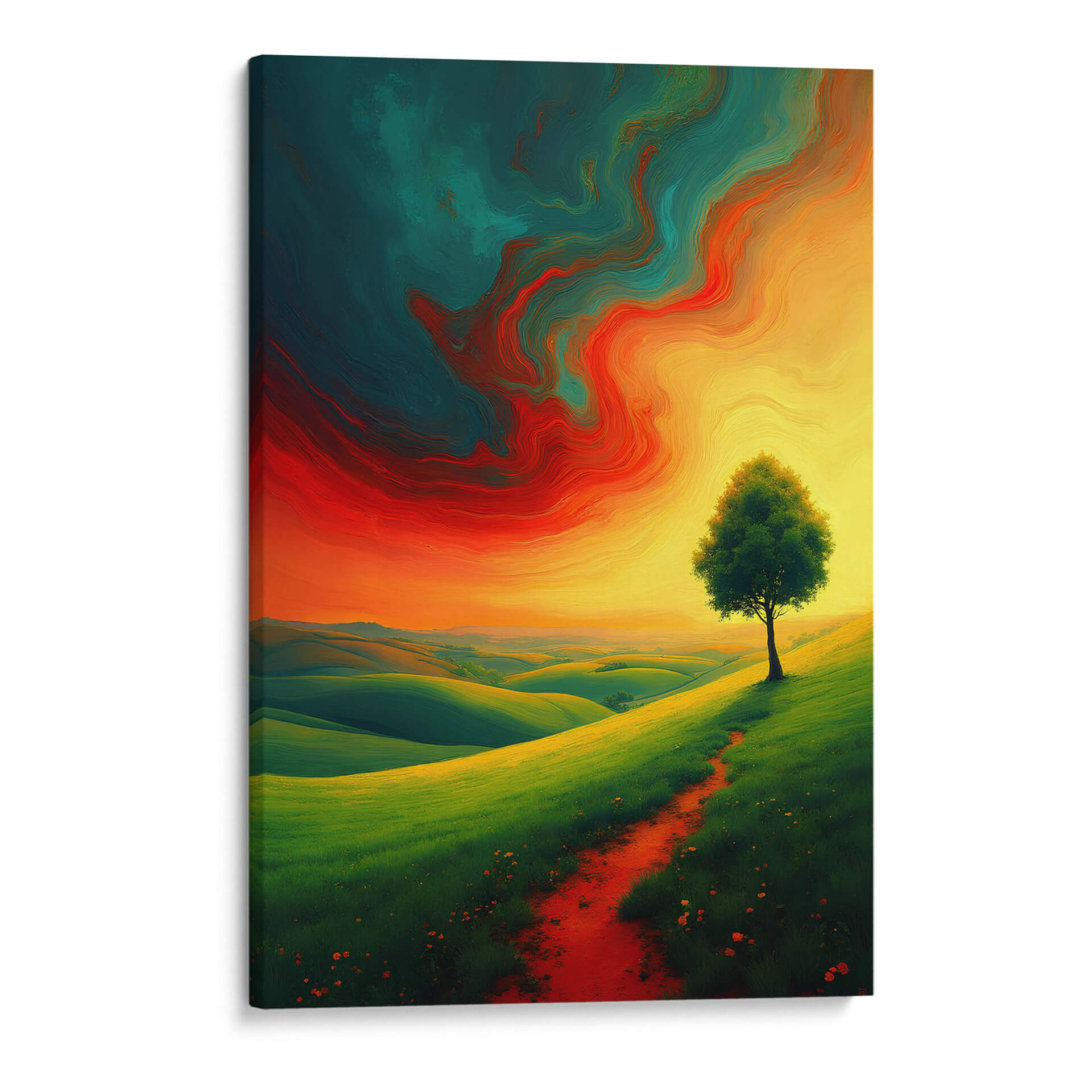 Sumérgete en la majestuosidad de "Landscape Expresionismo Vibrante", una obra de arte digital que captura la esencia de la naturaleza con una energía desbordante. La pieza presenta un paisaje ondulado de colinas verdes intensas, bañadas por una luz dorada que emana de un cielo dramático. Un único árbol se alza con vigor en la ladera, flanqueado por un camino rojizo que invita a la contemplación. El cielo es un torbellino de colores vibrantes, con remolinos de rojo intenso, naranja ardiente y un azul verdoso profundo que crean una atmósfera casi etérea, contrastando poderosamente con la serenidad terrenal del paisaje. El estilo expresionista se manifiesta en las pinceladas audaces y en la emotividad cruda de la composición, transmitiendo una sensación de vitalidad y movimiento. Este cuadro decorativo es perfecto para añadir un toque de dinamismo y color a cualquier sala de estar, estudio u oficina, transformando el espacio en un lienzo de emociones y belleza natural. Es una invitación a conectar con la fuerza del paisaje y la intensidad de la expresión artística, ideal para quienes buscan piezas que inspiren y provoquen sentimientos.