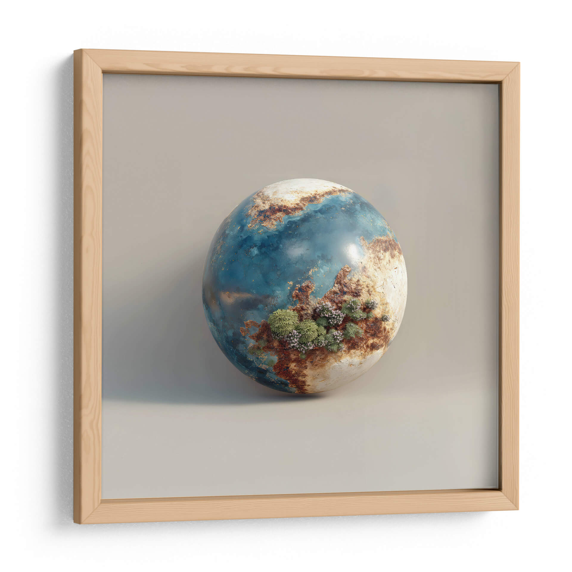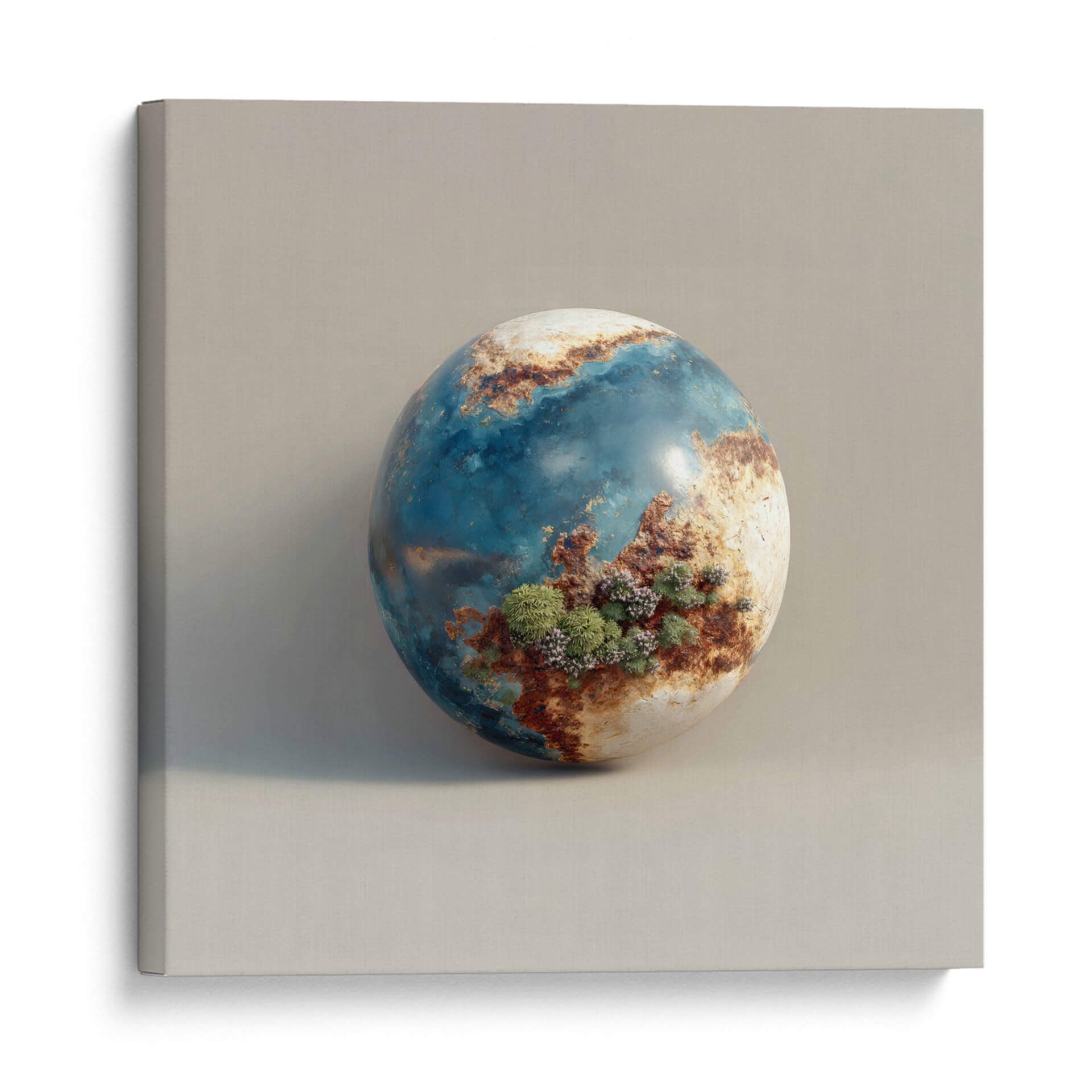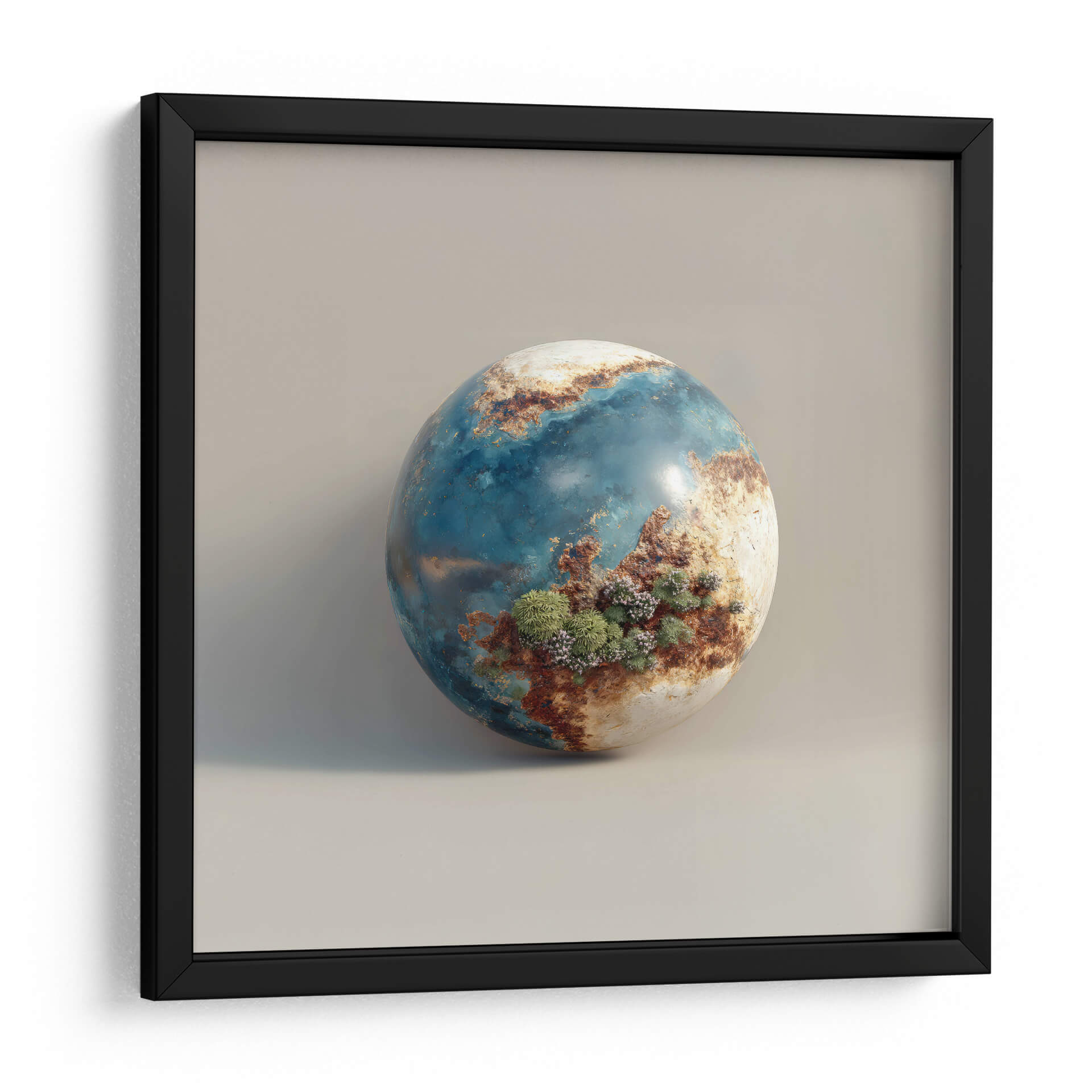 Sumérgete en la enigmática belleza de 'Lejos de Casa - 043', una obra de arte digital que te transportará a mundos imaginarios. Este cuadro decorativo presenta una esfera surrealista que evoca la imagen de un planeta o un orbe misterioso, texturizado con detalles que sugieren la erosión del tiempo y la intrusión de la naturaleza. Predominan los tonos azules profundos y los ocres terrosos, salpicados por toques de vegetación exuberante y delicadas flores, creando un contraste visual fascinante. La composición, centrada en el orbe sobre un fondo neutro y texturizado, realza su misterio y profundidad. "Lejos de Casa - 043" es más que una simple decoración de pared; es una invitación a la contemplación, a reflexionar sobre la vida, la decadencia y la resiliencia de la naturaleza. Ideal para quienes buscan una pieza de arte contemporáneo que inspire conversación y añada un toque de intriga y sofisticación a su hogar u oficina. Su estética única la convierte en un punto focal perfecto para salones modernos, estudios o cualquier espacio que aspire a una identidad distintiva y cautivadora. Deja que esta obra te lleve a explorar los límites de tu imaginación y a reimaginar la belleza en lo inesperado. Una pieza que redefine el arte de pared abstracto.