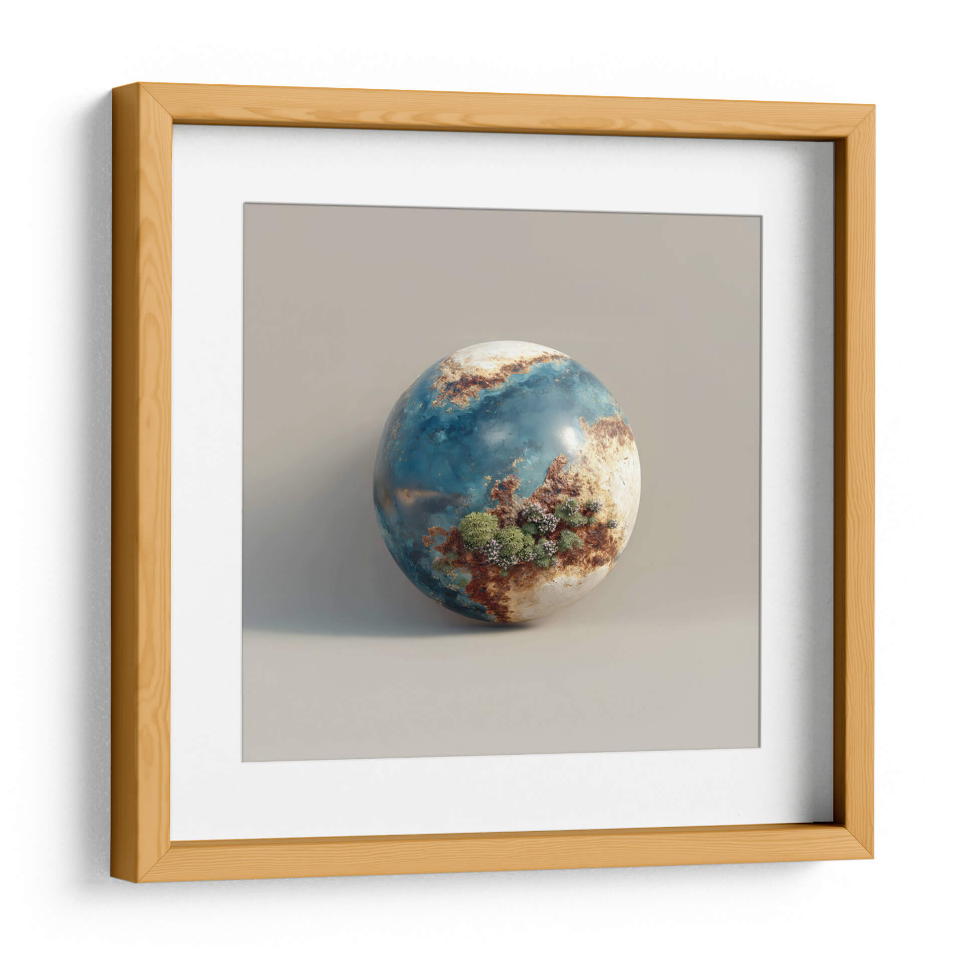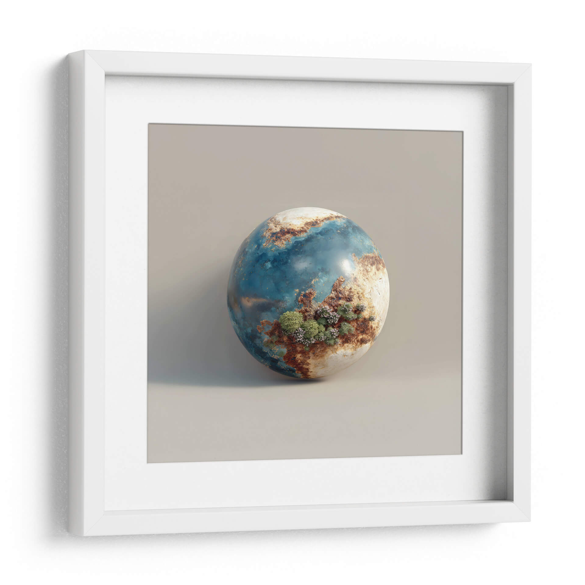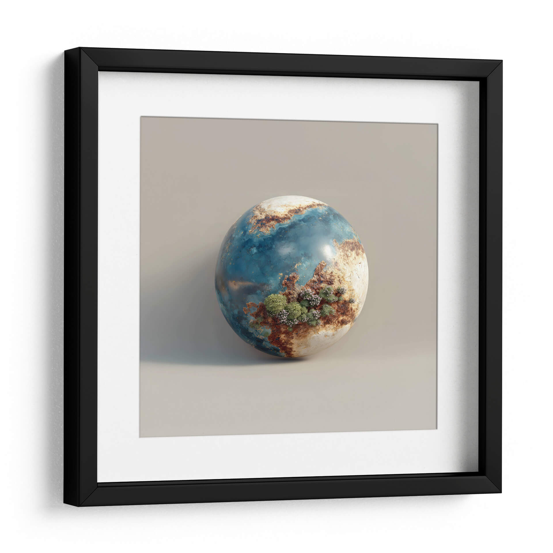 Sumérgete en la enigmática belleza de 'Lejos de Casa - 043', una obra de arte digital que te transportará a mundos imaginarios. Este cuadro decorativo presenta una esfera surrealista que evoca la imagen de un planeta o un orbe misterioso, texturizado con detalles que sugieren la erosión del tiempo y la intrusión de la naturaleza. Predominan los tonos azules profundos y los ocres terrosos, salpicados por toques de vegetación exuberante y delicadas flores, creando un contraste visual fascinante. La composición, centrada en el orbe sobre un fondo neutro y texturizado, realza su misterio y profundidad. "Lejos de Casa - 043" es más que una simple decoración de pared; es una invitación a la contemplación, a reflexionar sobre la vida, la decadencia y la resiliencia de la naturaleza. Ideal para quienes buscan una pieza de arte contemporáneo que inspire conversación y añada un toque de intriga y sofisticación a su hogar u oficina. Su estética única la convierte en un punto focal perfecto para salones modernos, estudios o cualquier espacio que aspire a una identidad distintiva y cautivadora. Deja que esta obra te lleve a explorar los límites de tu imaginación y a reimaginar la belleza en lo inesperado. Una pieza que redefine el arte de pared abstracto.
