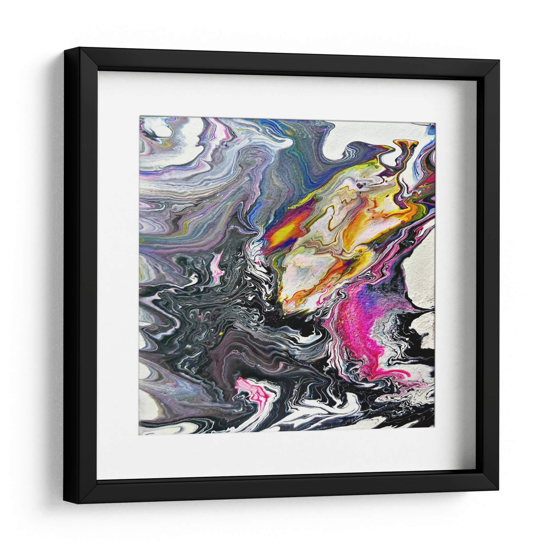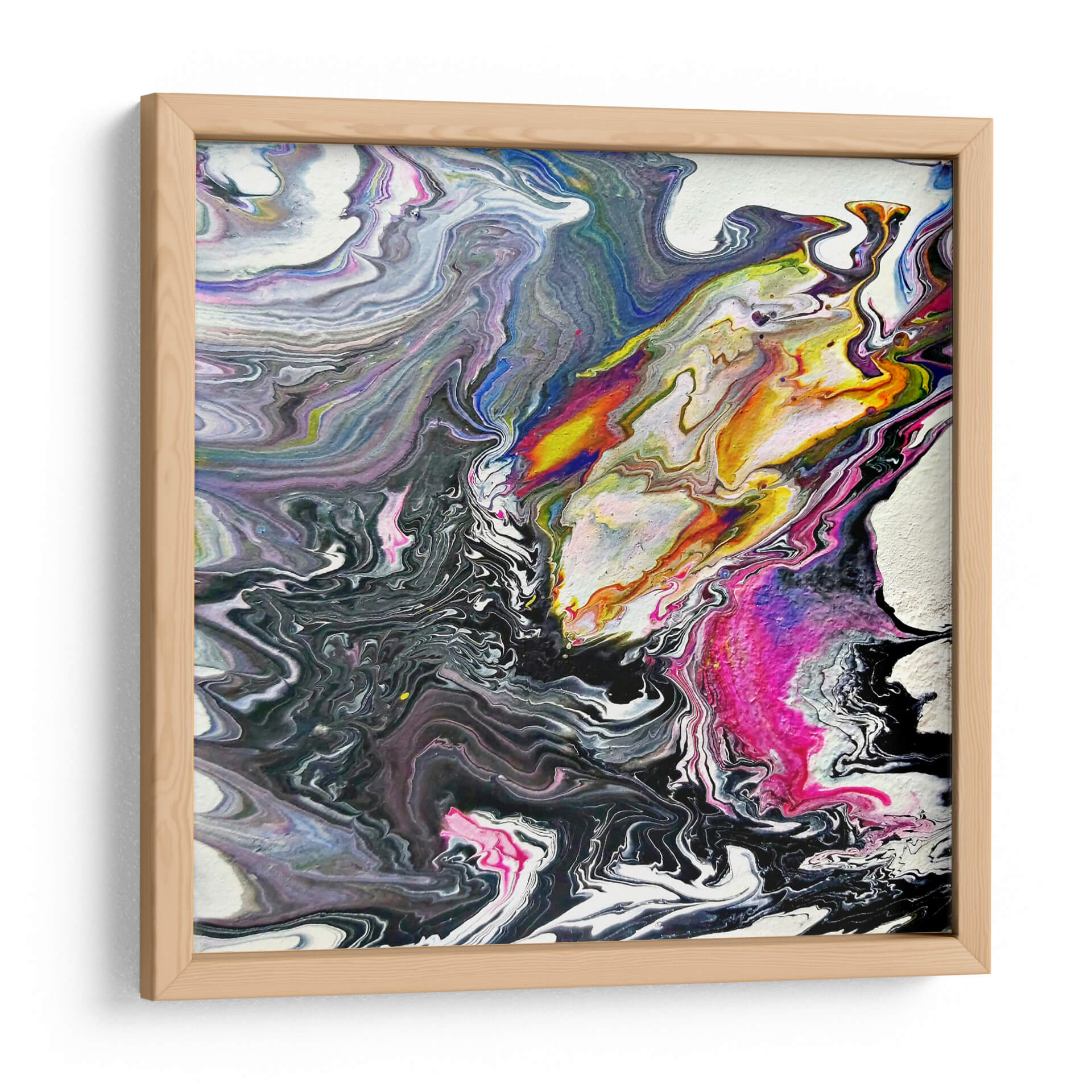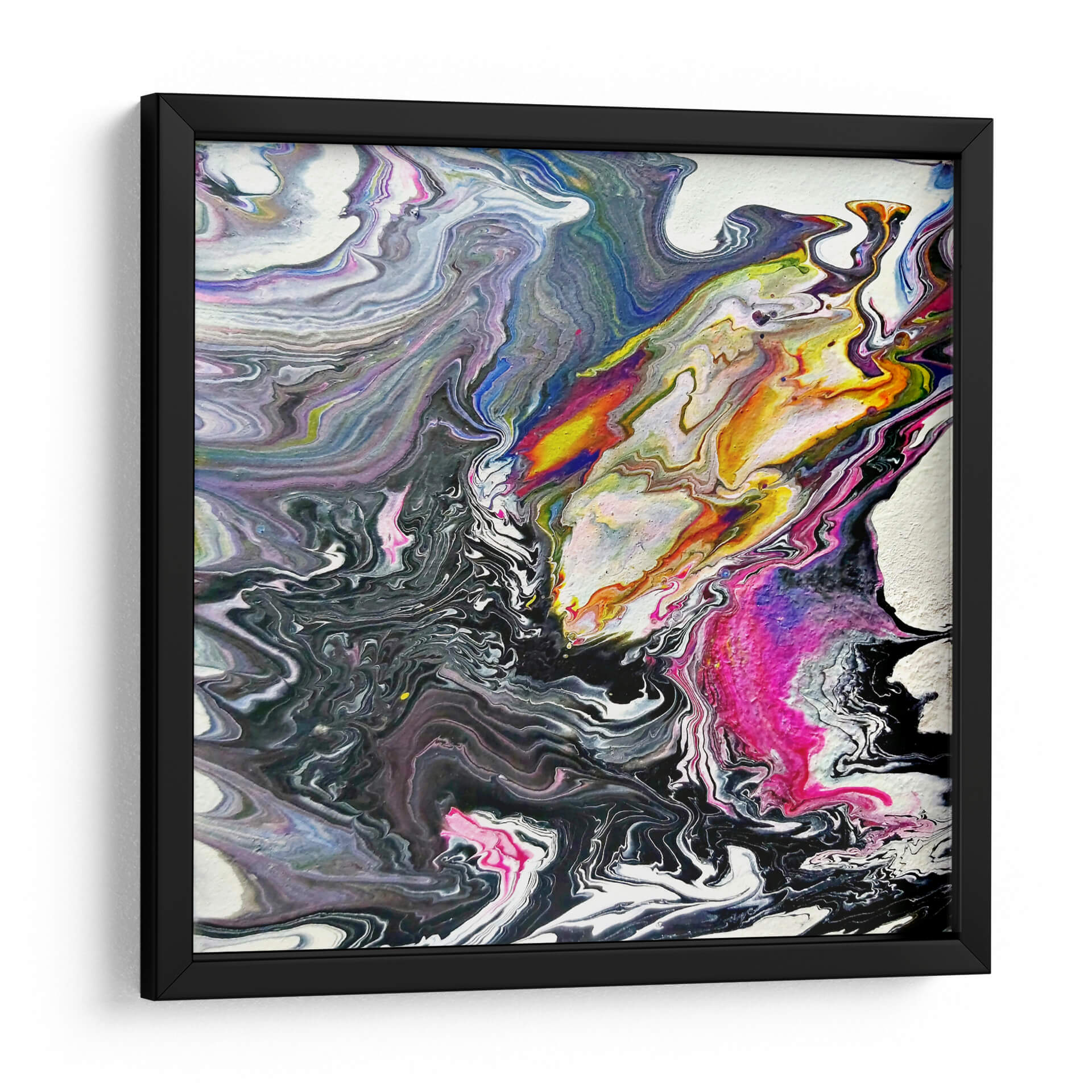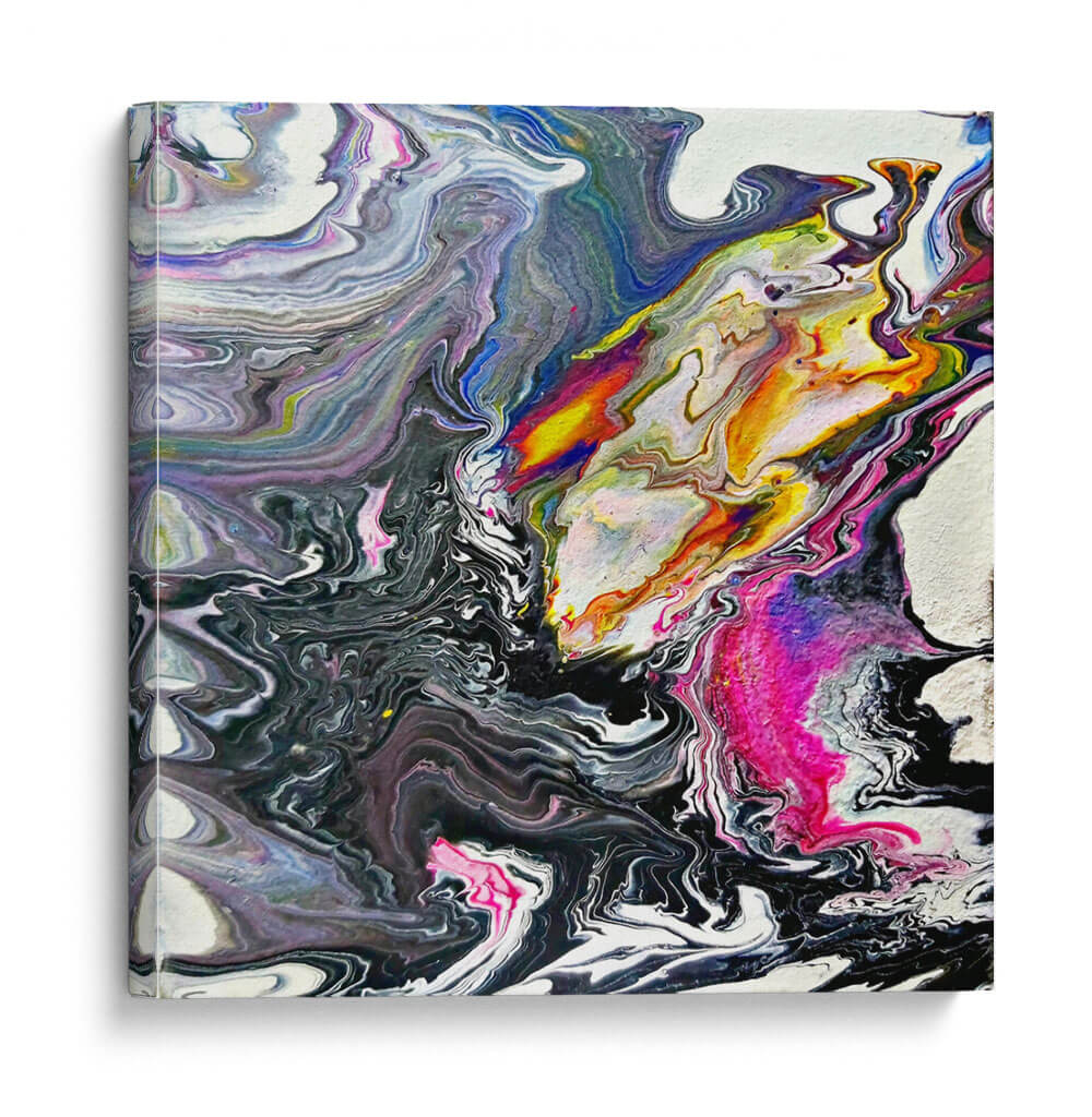Sumérgete en la hipnótica obra de arte "Minerales" de Rodrigo Barrera, una explosión de color y movimiento que captura la esencia del arte abstracto contemporáneo. Esta pieza evoca la fluidez y la complejidad de las formaciones geológicas, con remolinos de pintura que fluyen y se entrelazan en una danza visual cautivadora. La paleta de colores, que transita desde profundos negros y grises hasta vibrantes toques de amarillo, naranja, fucsia y azul eléctrico, crea un contraste dinámico que atrae la mirada y estimula la imaginación. La técnica de vertido (pour painting) empleada por Barrera da lugar a texturas orgánicas y patrones únicos, haciendo que cada detalle de este cuadro decorativo sea una nueva revelación. "Minerales" es más que una simple obra de arte; es una expresión de energía y caos controlado, perfecta para añadir un toque de sofisticación moderna a cualquier espacio. Ideal para salones, oficinas o cualquier lugar donde se desee un punto focal vibrante y lleno de carácter. Deja que esta obra maestra abstracta inspire conversaciones y eleve la estética de tu hogar u oficina.