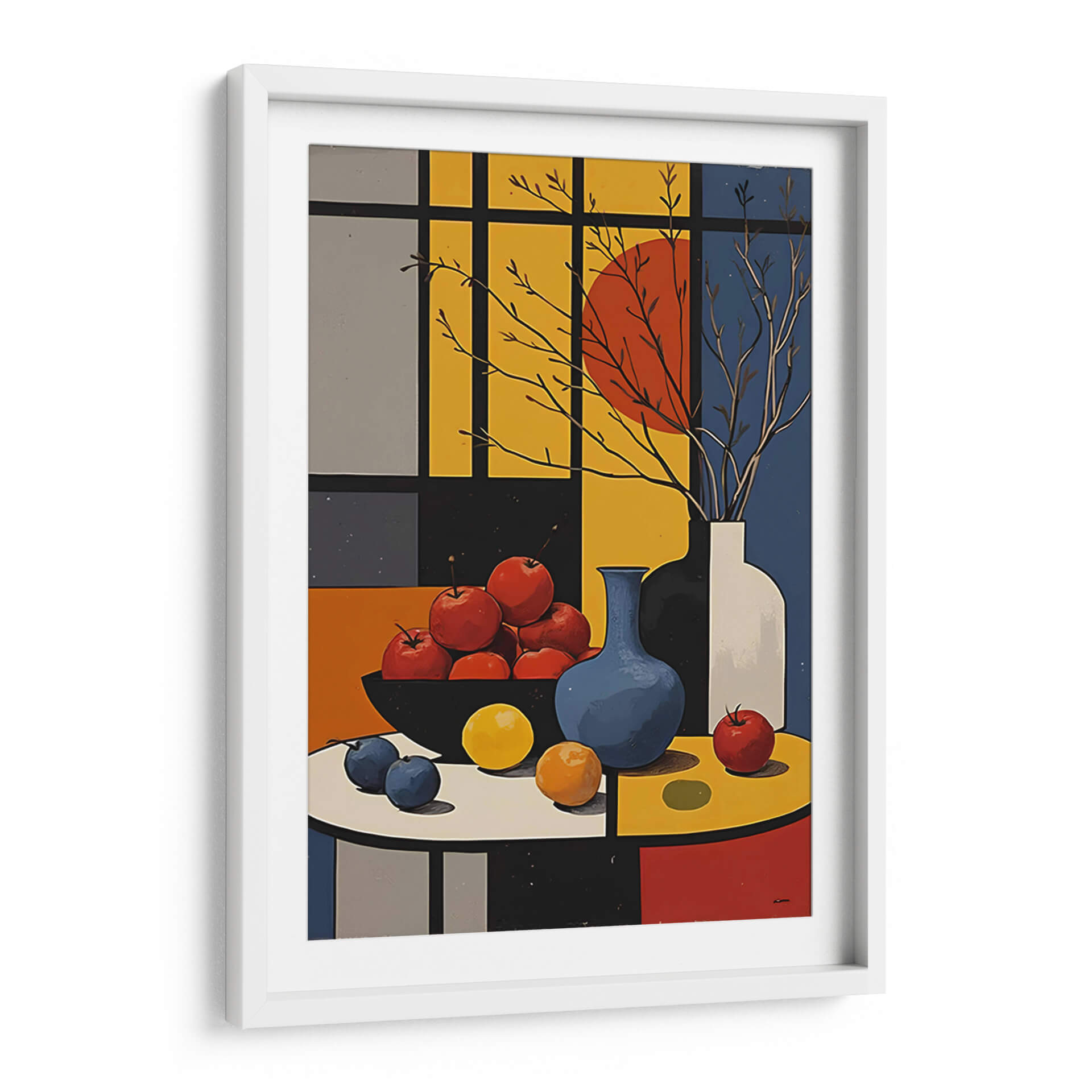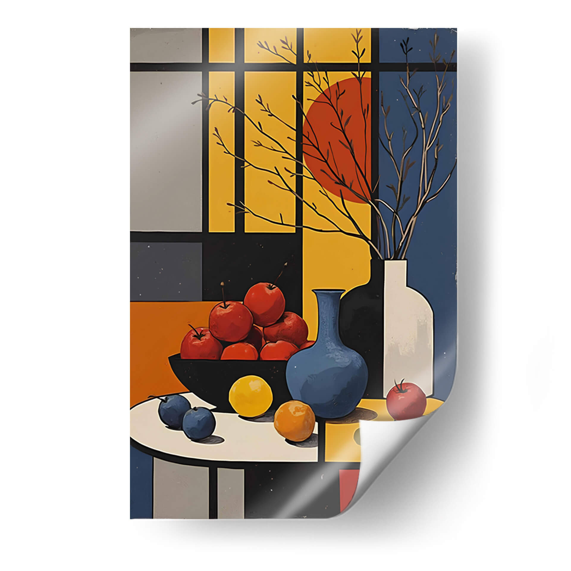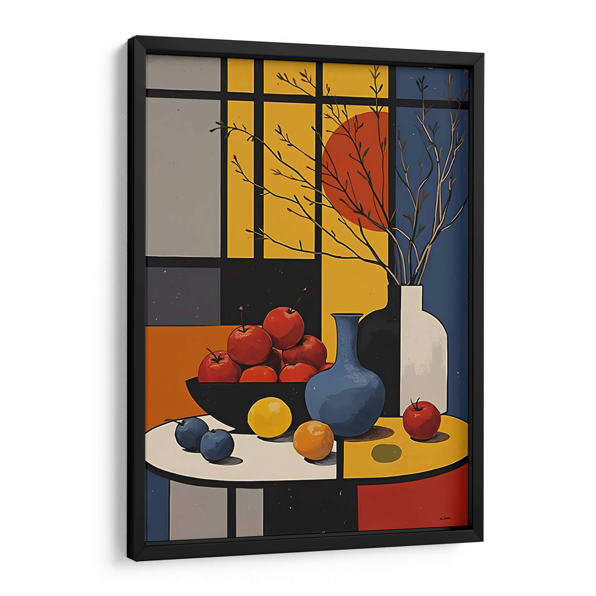 Sumérgete en la vibrante composición de "Mondrian Encuentra Estructura", una obra de arte digital que fusiona la audacia geométrica con la calidez de una naturaleza muerta. Este cuadro decorativo cautiva por su uso de líneas rectas y bloques de color primarios y secundarios, evocando un diálogo entre el orden abstracto y la vitalidad de los elementos representados. El contraste entre el azul profundo del fondo y el sol anaranjado crea una atmósfera dinámica, mientras que la disposición de las frutas en un cuenco y el jarrón azul añade un toque de realismo estilizado a la escena. Las ramas secas que se extienden aportan un elemento orgánico y etéreo, equilibrando la rigidez de la estructura. "Mondrian Encuentra Estructura" es una pieza versátil, ideal para espacios que buscan un punto focal con carácter, ya sea una sala de estar moderna, un comedor contemporáneo o un estudio de diseño. Su paleta de colores, que incluye grises, amarillos, azules y rojos, permite integrarla fácilmente en diversas decoraciones, aportando un toque de sofisticación y energía. Este cuadro decorativo es perfecto para quienes aprecian el arte abstracto con influencias del neoplasticismo y buscan añadir una pieza única y estimulante a su hogar u oficina, transformando cualquier ambiente en una galería personal.