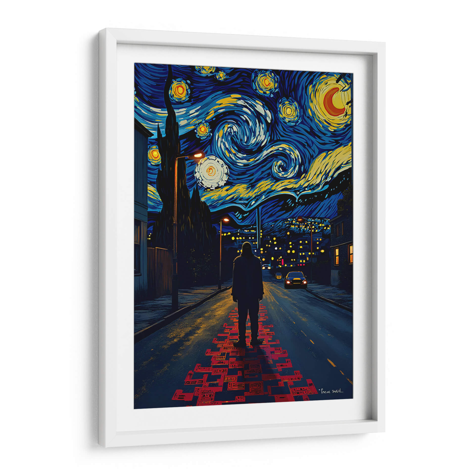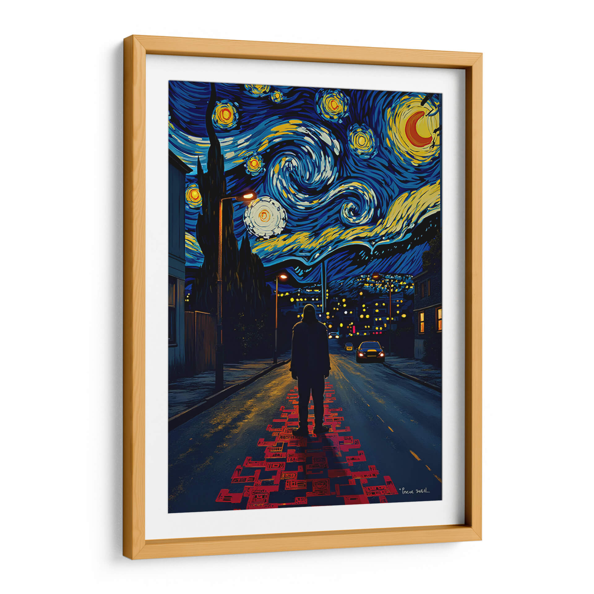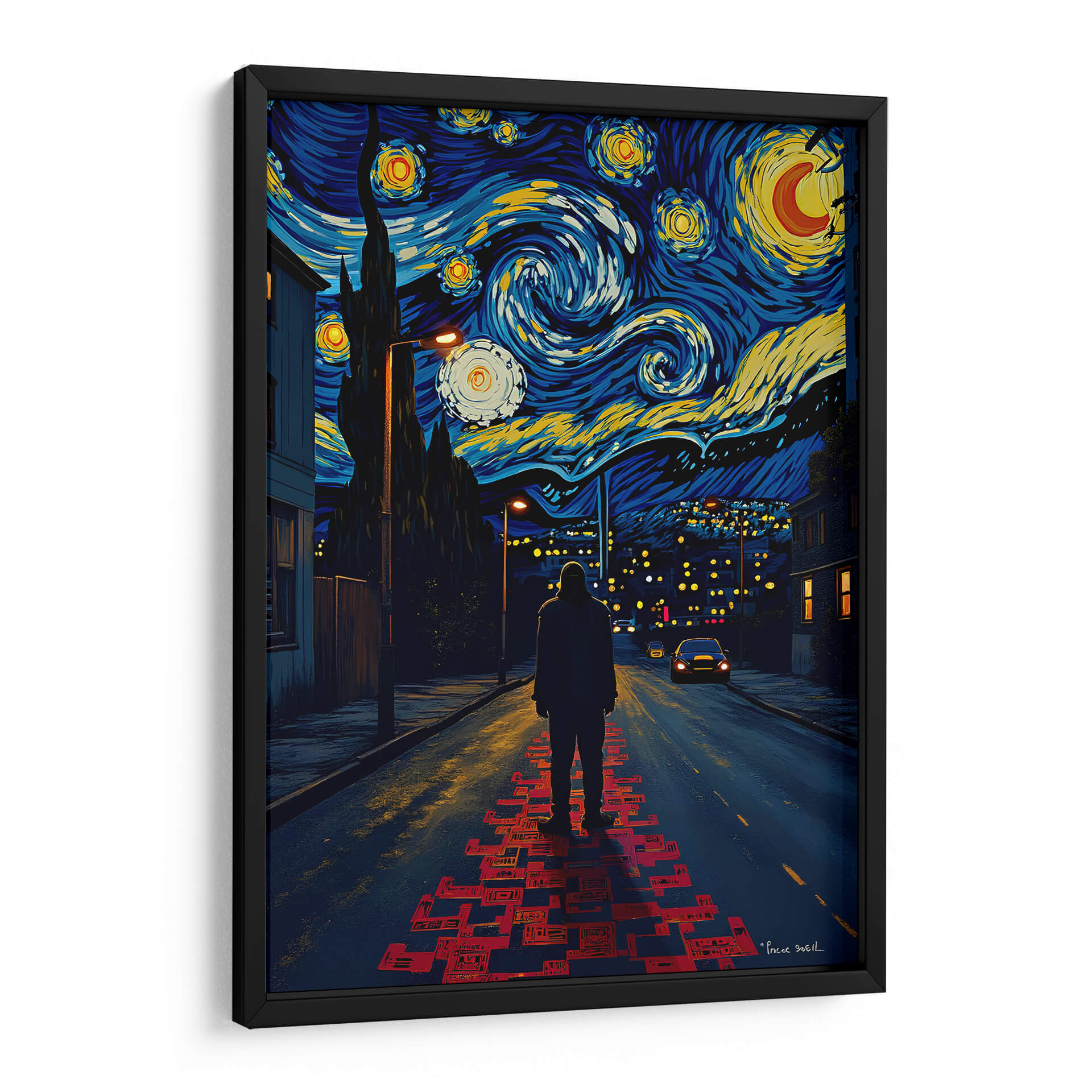 Sumérgete en la enigmática fusión de lo clásico y lo contemporáneo con "Pop Urbano Van Gogh", una obra de arte digital que reimagina la icónica "Noche Estrellada" de Van Gogh en un entorno urbano moderno. La pieza presenta un cielo nocturno turbulento, vibrante con los remolinos celestiales característicos del maestro, pero aquí se superpone a una calle de ciudad iluminada por farolas y el resplandor distante de las luces urbanas. Una figura solitaria, de espaldas al espectador, se alza sobre un sendero de intrincados patrones rojos, añadiendo un toque de misterio y contemplación. Los intensos azules y amarillos del cielo contrastan con las sombras profundas y los puntos de luz cálida de la ciudad, creando una atmósfera de ensueño y melancolía. Este cuadro decorativo es perfecto para quienes buscan infundir a su hogar u oficina una dosis de arte evocador y con una historia. Ideal para salas de estar modernas, estudios o dormitorios que buscan un punto focal que invite a la reflexión y al diálogo. La técnica digital de DEA Digital Esoteric Art ofrece una interpretación fresca y audaz, capturando la esencia emocional de Van Gogh mientras la transporta a una nueva dimensión.