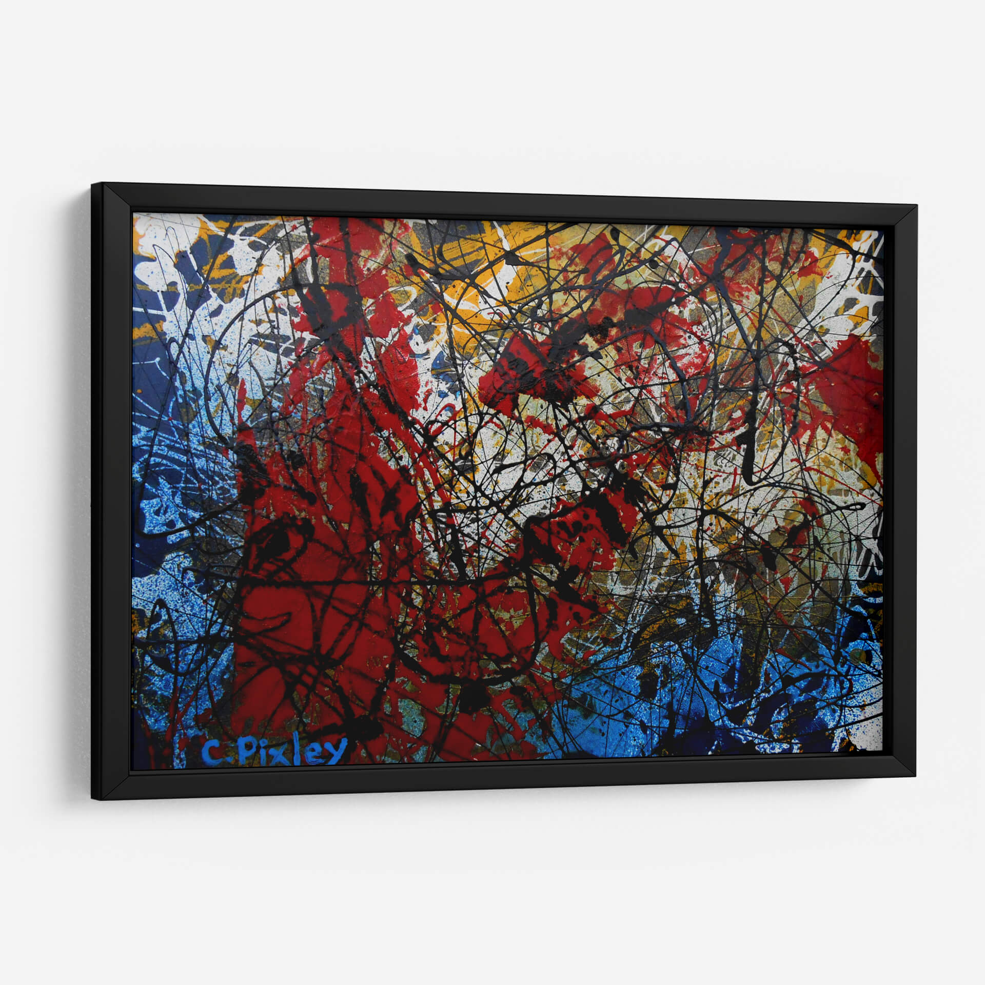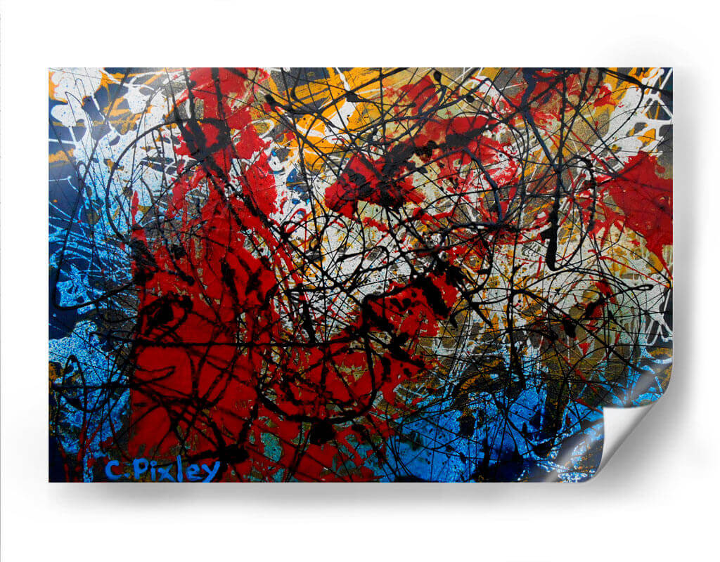 Sumérgete en la intensidad y el dinamismo de "Sangre Real", una obra de arte abstracto contemporáneo del artista Carlos Pixley. Este cuadro decorativo cautiva con su audaz composición y una paleta de colores vibrante que evoca pasión y energía. Predominan los rojos intensos y los azules profundos, salpicados con trazos enérgicos de negro y destellos de amarillo y blanco, creando un contraste visual impactante. La técnica de goteo y salpicadura genera una sensación de movimiento y espontaneidad, invitando a la interpretación personal y a la contemplación. "Sangre Real" es más que una simple pieza decorativa; es una expresión artística que puede transformar cualquier espacio, añadiendo un toque de carácter y sofisticación. Ideal para salas de estar modernas, oficinas o cualquier ambiente que busque un punto focal vibrante y lleno de vida. Este cuadro abstracto contemporáneo es perfecto para quienes aprecian el arte que provoca emociones y estimula la conversación, aportando un aire de vanguardia y audacia a tu decoración.