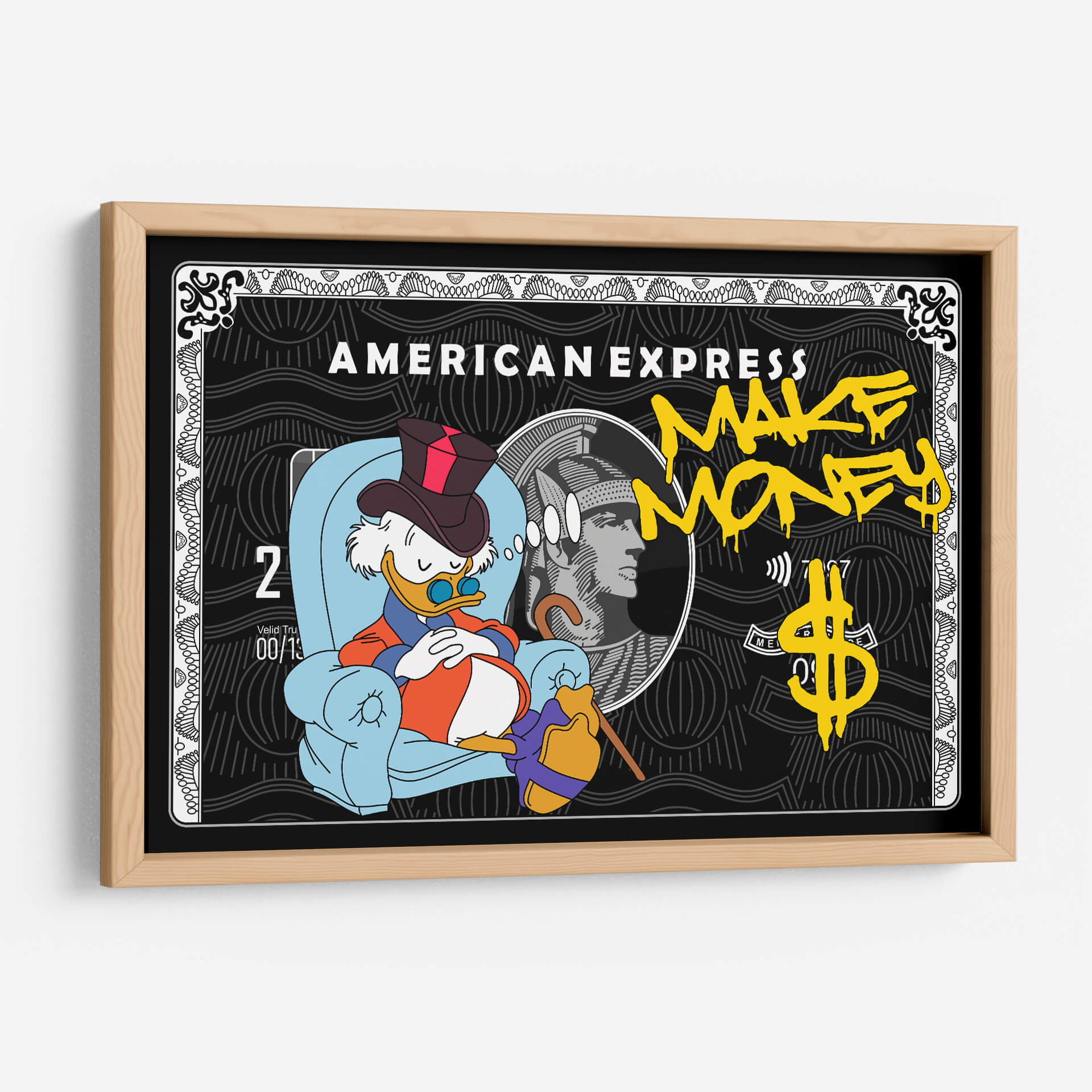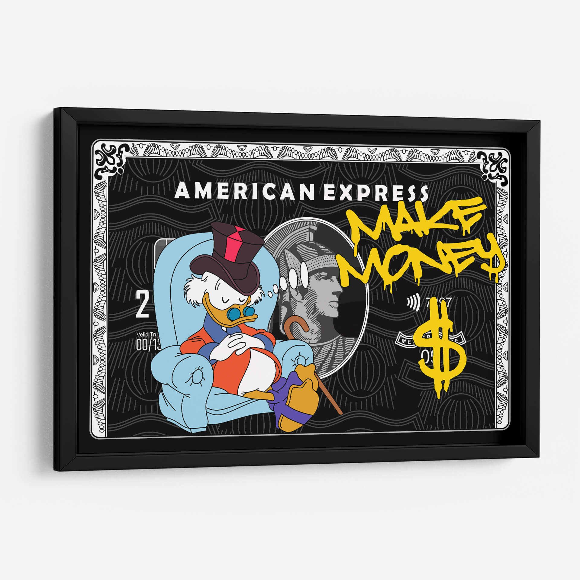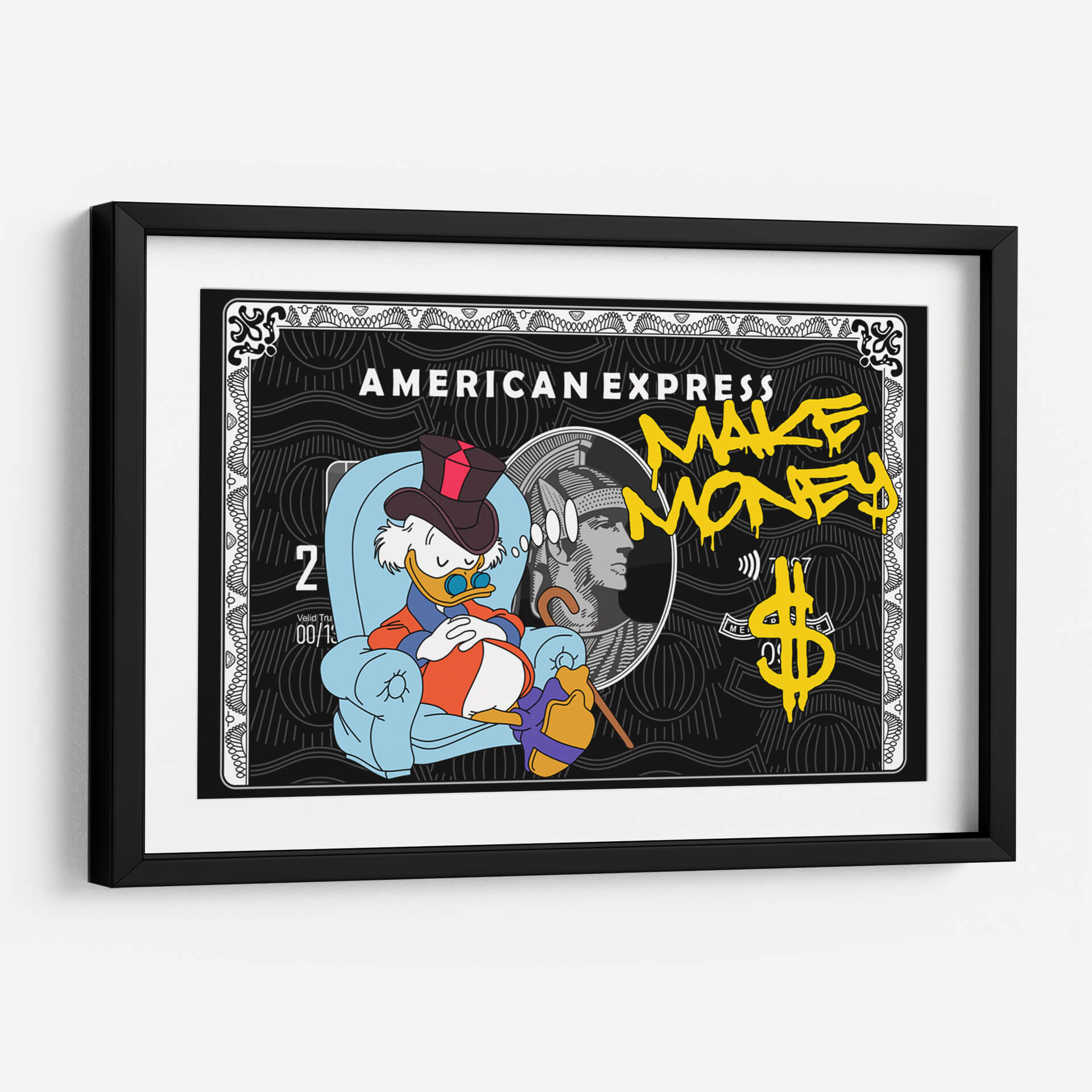 Transforma tu espacio con este cautivador cuadro decorativo que fusiona la nostalgia de un personaje icónico con un mensaje moderno sobre la prosperidad. La obra presenta a un pato millonario caricaturesco, cómodamente recostado en un sillón azul, con gafas de sol y soñando despierto. El fondo negro, inspirado en una tarjeta de crédito American Express, está adornado con detalles gráficos estilizados y la contundente frase 'Make Money' en vibrante amarillo neón, que contrasta dramáticamente con la sobriedad del diseño. Un símbolo de dólar amarillo brillante complementa el tema financiero, mientras que la efigie del Jefe Indio, característica de la tarjeta, se asoma sutilmente. Esta pieza, con su audaz paleta de colores (negro, amarillo, azul y toques de rojo y naranja) y su estilo pop art contemporáneo, es perfecta para inyectar personalidad y una dosis de humor sofisticado a cualquier sala de estar, oficina o espacio de entretenimiento. Ideal para quienes aprecian el arte con un toque de ingenio y buscan piezas que generen conversación y reflejen una mentalidad de éxito. Este cuadro decorativo es una declaración de intenciones, combinando arte pop, crítica social y aspiración en una sola imagen impactante.
