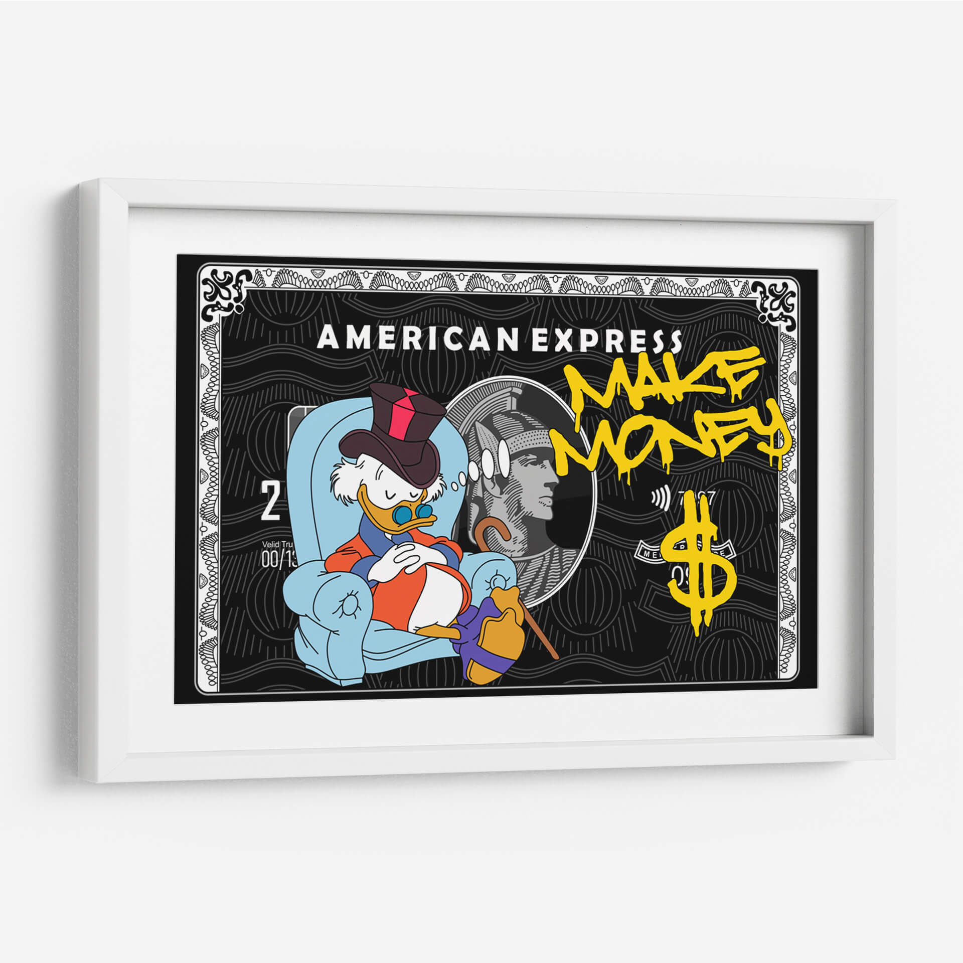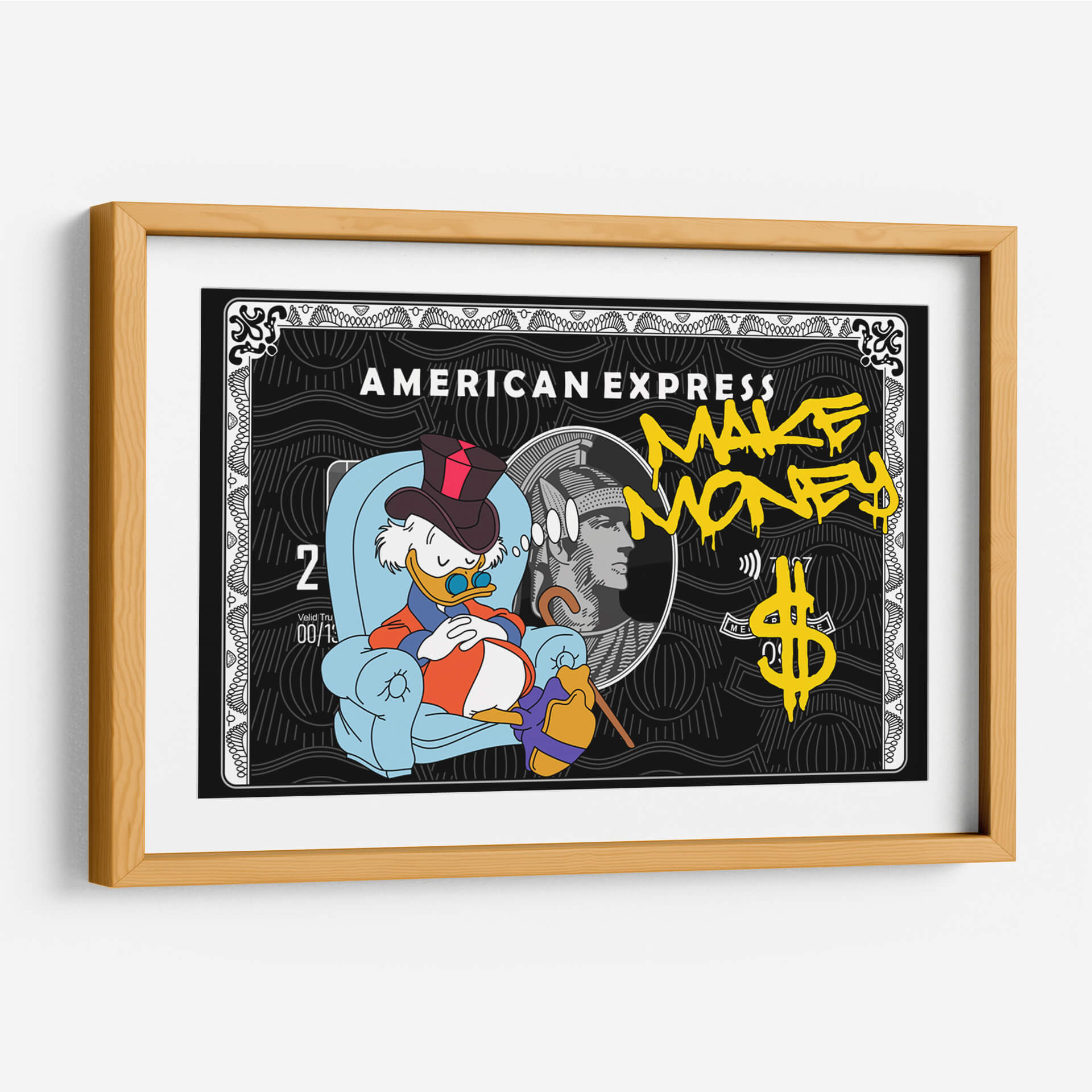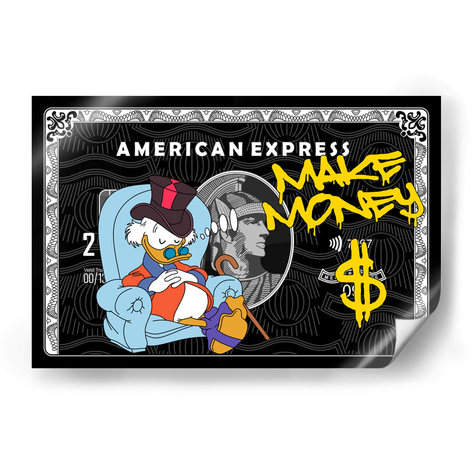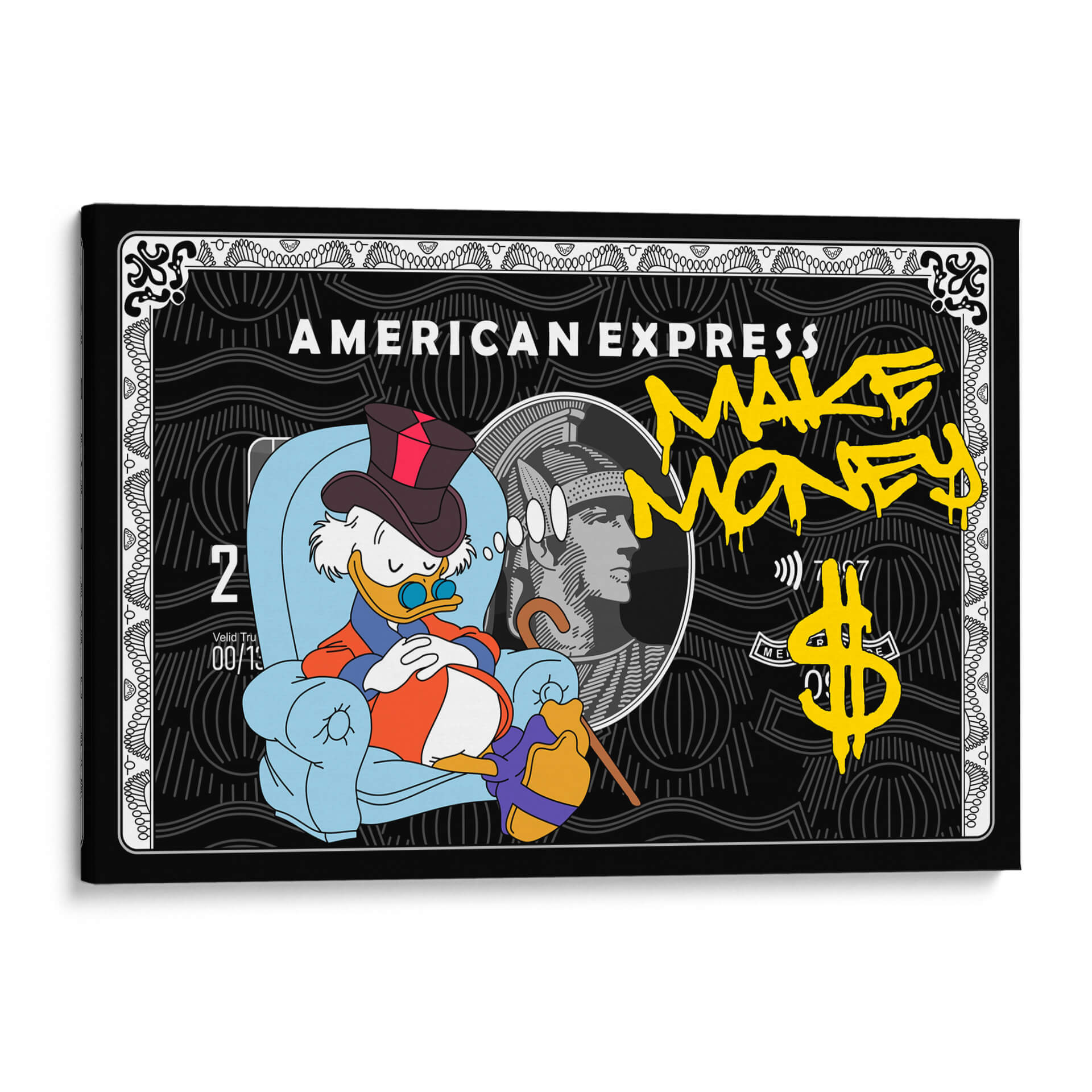 Transforma tu espacio con este cautivador cuadro decorativo que fusiona la nostalgia de un personaje icónico con un mensaje moderno sobre la prosperidad. La obra presenta a un pato millonario caricaturesco, cómodamente recostado en un sillón azul, con gafas de sol y soñando despierto. El fondo negro, inspirado en una tarjeta de crédito American Express, está adornado con detalles gráficos estilizados y la contundente frase 'Make Money' en vibrante amarillo neón, que contrasta dramáticamente con la sobriedad del diseño. Un símbolo de dólar amarillo brillante complementa el tema financiero, mientras que la efigie del Jefe Indio, característica de la tarjeta, se asoma sutilmente. Esta pieza, con su audaz paleta de colores (negro, amarillo, azul y toques de rojo y naranja) y su estilo pop art contemporáneo, es perfecta para inyectar personalidad y una dosis de humor sofisticado a cualquier sala de estar, oficina o espacio de entretenimiento. Ideal para quienes aprecian el arte con un toque de ingenio y buscan piezas que generen conversación y reflejen una mentalidad de éxito. Este cuadro decorativo es una declaración de intenciones, combinando arte pop, crítica social y aspiración en una sola imagen impactante.