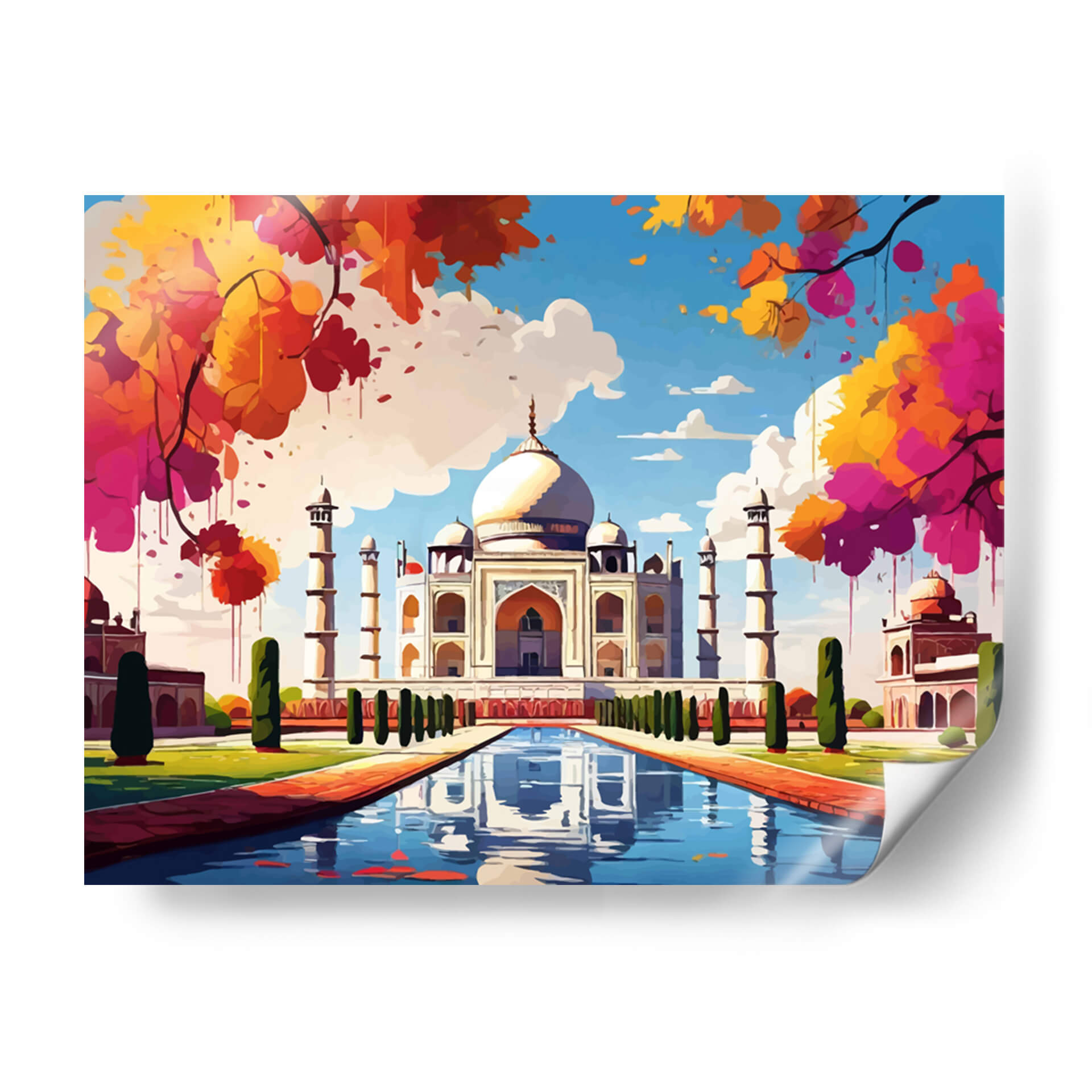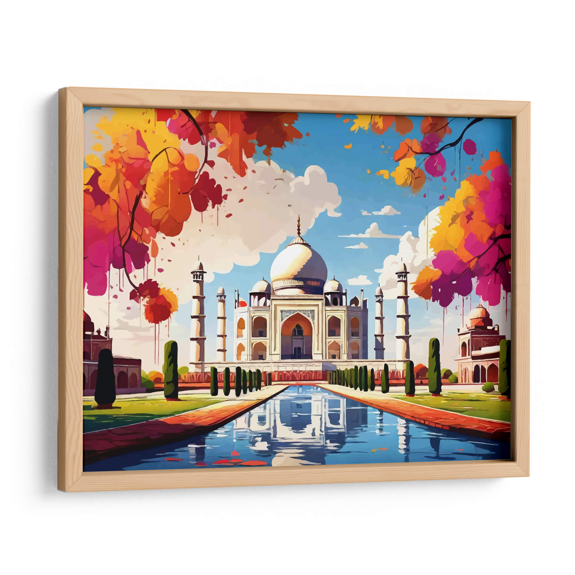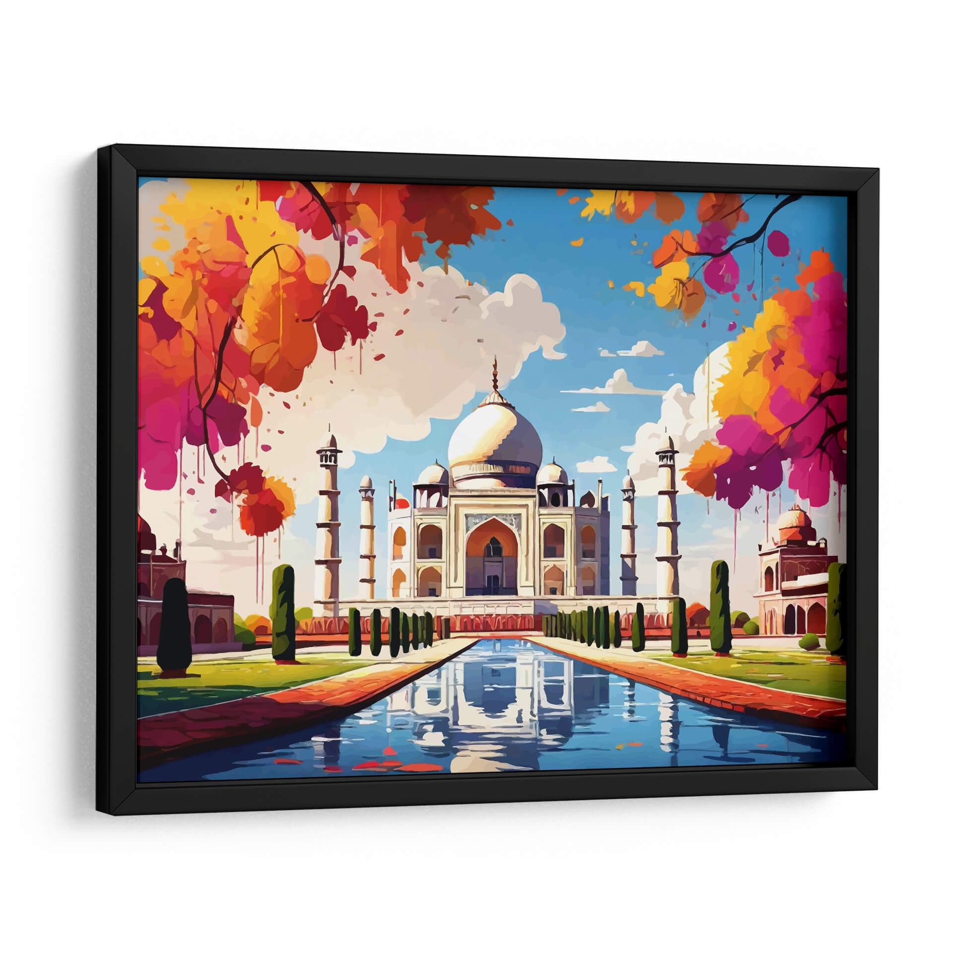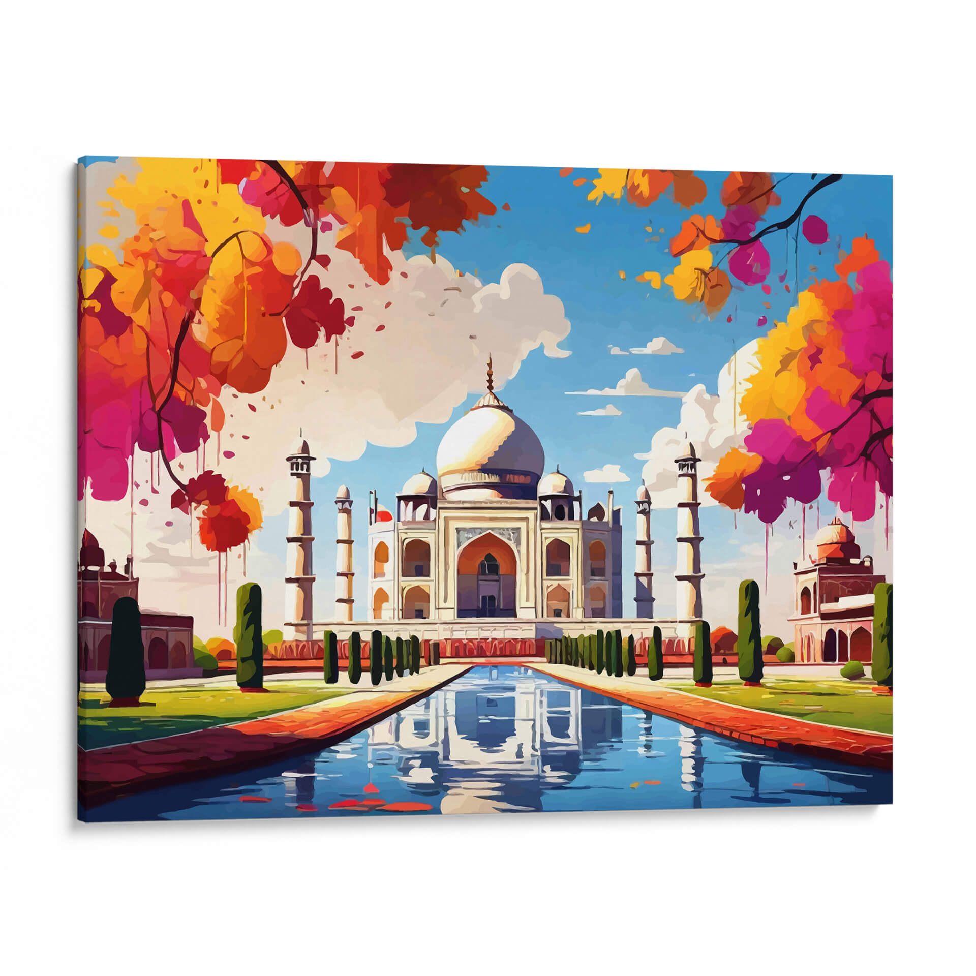 Sumérgete en la majestuosidad y el color con este cautivador cuadro decorativo del Taj Mahal. La obra presenta una interpretación vibrante y artística de uno de los monumentos más icónicos del mundo, transportando la belleza arquitectónica a tu hogar. Los colores intensos y las pinceladas audaces, que van desde los cálidos tonos anaranjados y rosados de la vegetación circundante hasta el azul sereno del cielo, crean una atmósfera de alegría y vitalidad. La composición central, con el imponente Taj Mahal reflejado en el estanque de agua, evoca una sensación de paz y asombro. Este cuadro decorativo, con su estilo contemporáneo y su rica paleta cromática, es perfecto para añadir un punto focal de interés a cualquier sala de estar moderna, comedor o incluso una oficina. Su diseño versátil lo hace ideal para espacios que buscan un toque de inspiración exótica y un estallido de color. Transforma tus paredes con esta pieza única que celebra la maravilla arquitectónica y la exuberancia de la naturaleza en una explosión de arte. Ideal para amantes de los viajes y la cultura que buscan una decoración de pared que hable de belleza y sofisticación.