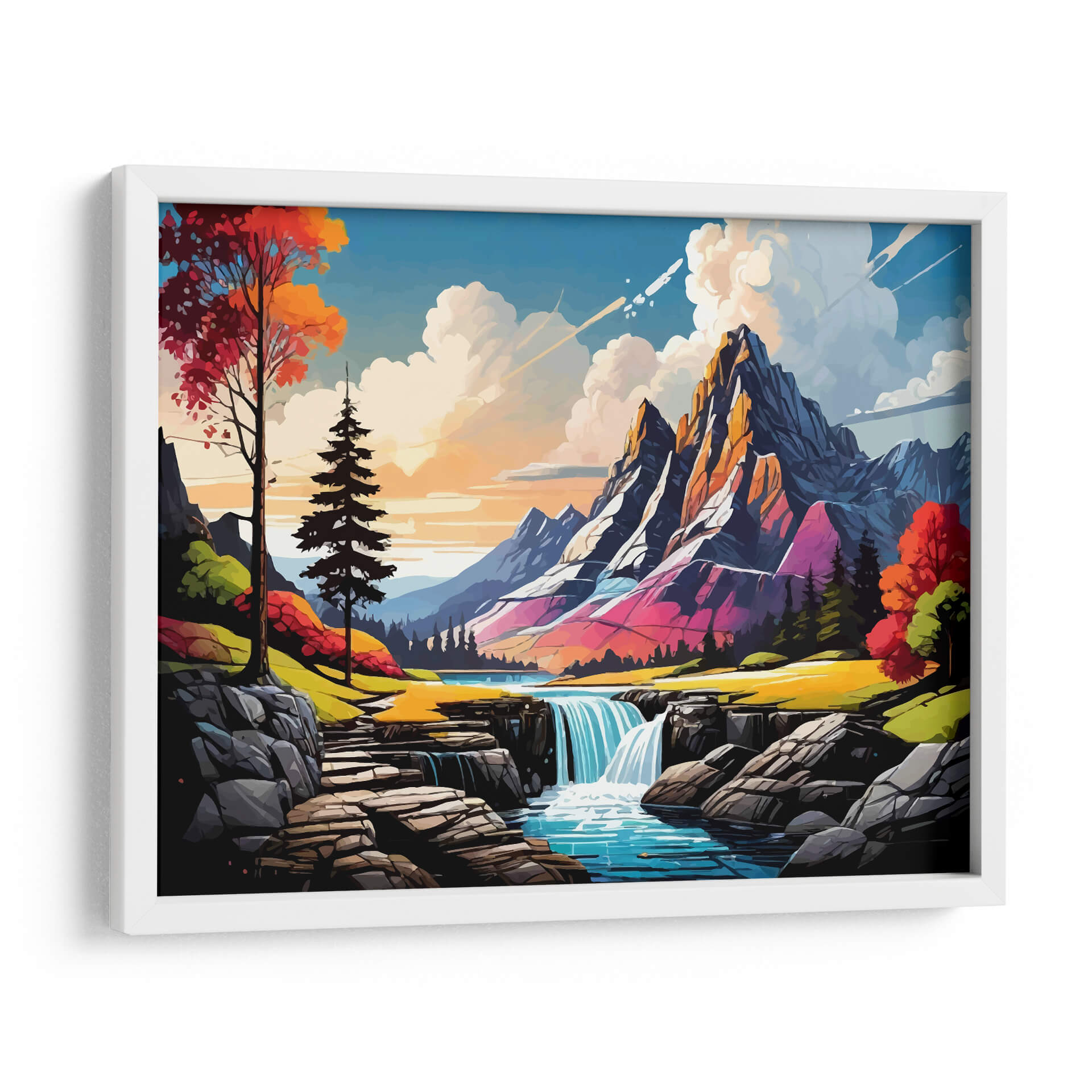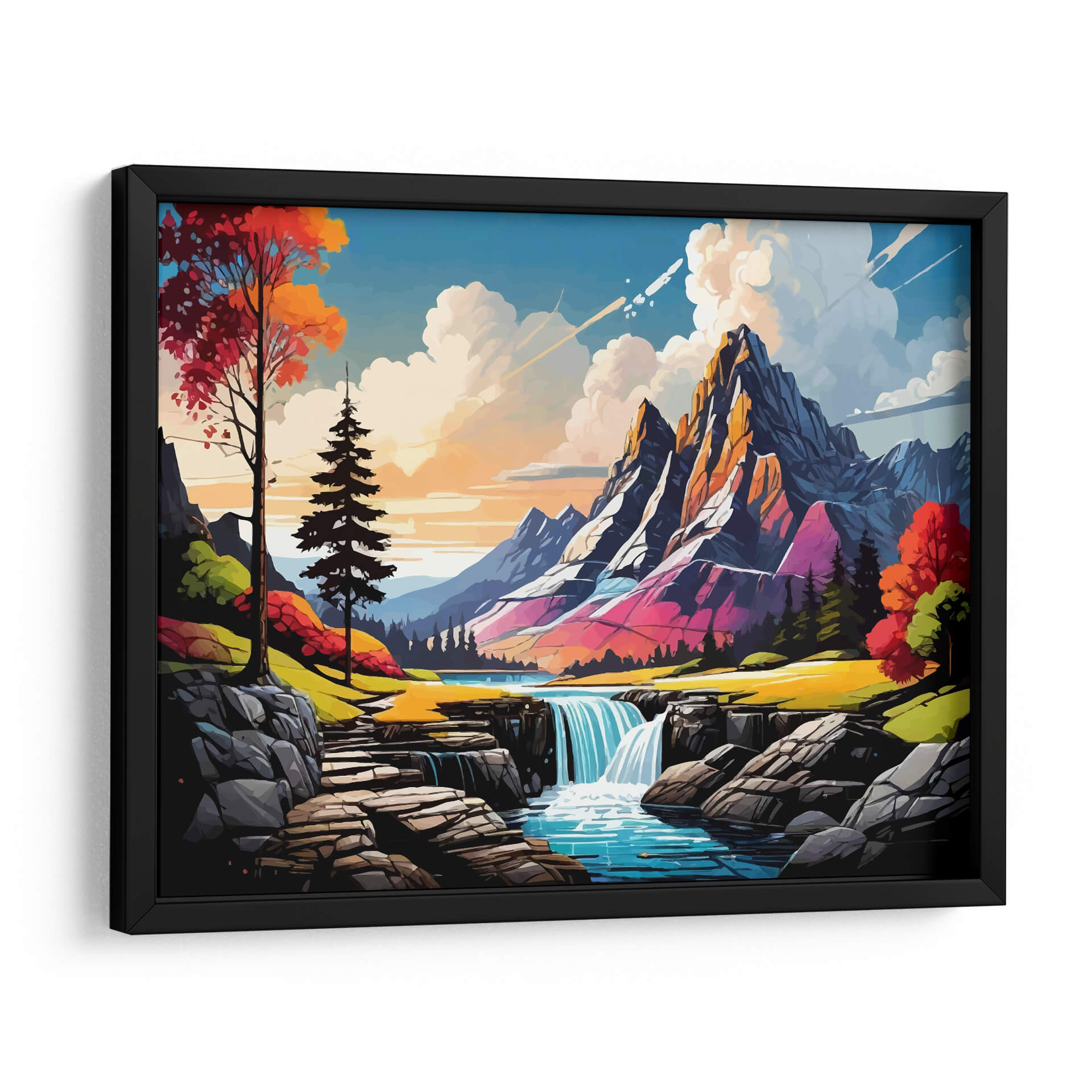 Sumérgete en la majestuosidad de la naturaleza con "Vista de la Montaña", una obra de arte digital que captura la esencia de un paisaje sereno y vibrante. Este cuadro decorativo presenta una imponente cadena montañosa bañada por una luz cálida y dorada del atardecer, con picos escarpados que se alzan hacia un cielo azul intenso salpicado de nubes algodonosas. Una cascada cristalina desciende elegantemente entre rocas, alimentando un río de aguas turquesas que fluye a través de un valle exuberante. El primer plano se adorna con rocas texturizadas y una vibrante arboleda otoñal, con tonos rojos y naranjas intensos que contrastan maravillosamente con el verde circundante. El estilo pictórico, con pinceladas audaces y una paleta de colores saturados, evoca una sensación de asombro y tranquilidad, ideal para transformar cualquier espacio. Este cuadro de paisaje es perfecto para añadir un toque de color y serenidad a salones modernos, dormitorios acogedores u oficinas que buscan inspiración natural. Descubre cómo esta "Vista de la Montaña" puede convertirse en el punto focal de tu decoración, aportando vitalidad y una conexión profunda con la belleza indómita de la naturaleza.