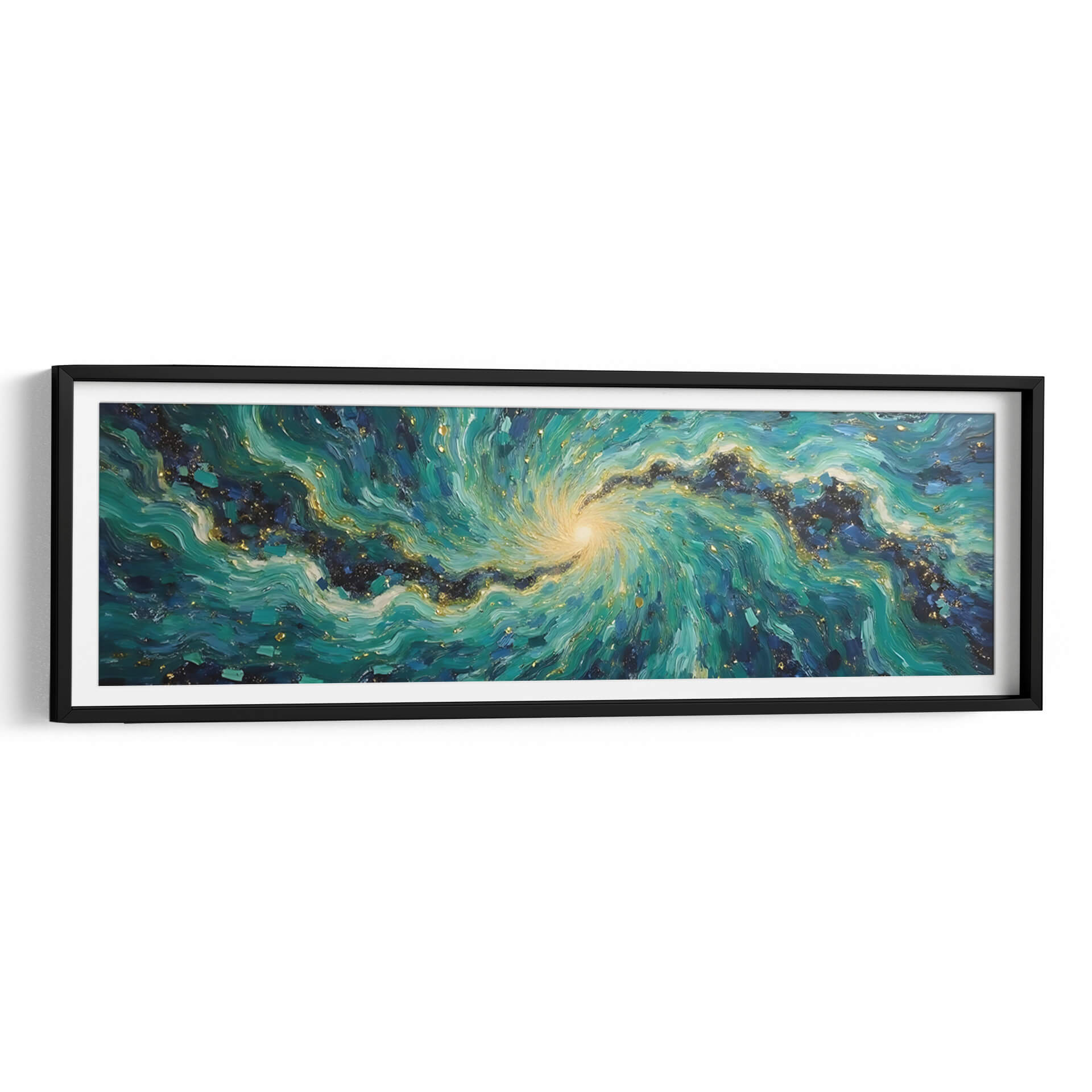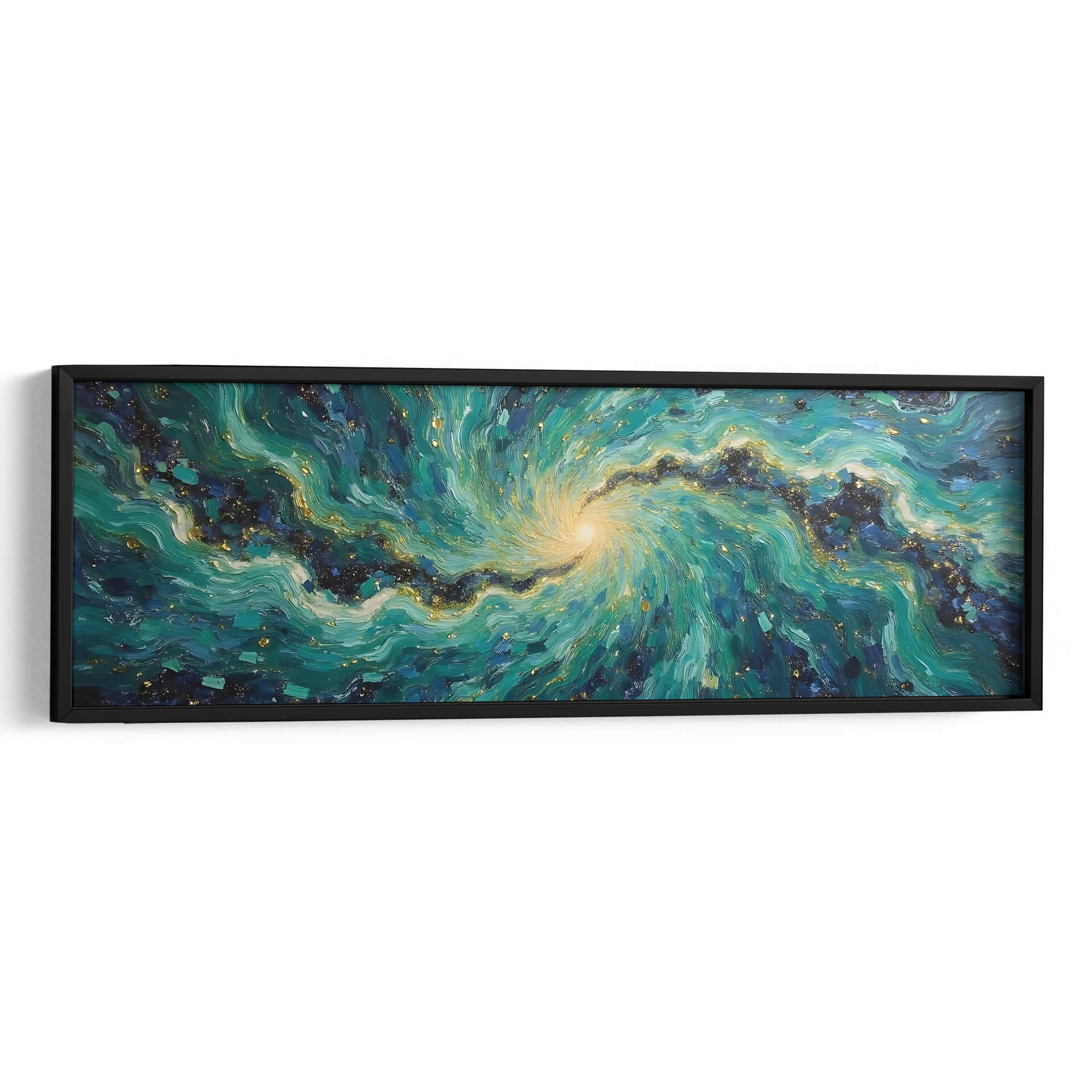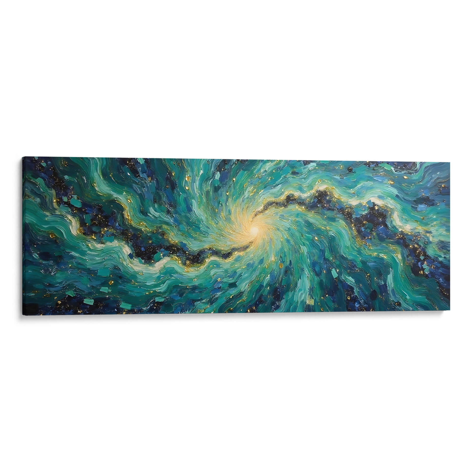 Sumérgete en la hipnótica belleza de "Vórtice Esmeralda", una obra de arte abstracto que captura la energía dinámica de la naturaleza y el cosmos. Tito Massia nos transporta a través de un remolino de tonos verdes intensos, azules profundos y toques de oro centelleante, evocando la majestuosidad de una galaxia o la fuerza indomable de las olas marinas. Las pinceladas expresivas y la composición espiral crean una sensación de movimiento y profundidad, invitando al espectador a perderse en sus detalles intrincados. Este cuadro decorativo es perfecto para añadir un punto focal vibrante y sofisticado a cualquier espacio moderno, ya sea una sala de estar, un comedor o una oficina. Su paleta de colores rica y texturizada aporta calidez y un toque de lujo, transformando cualquier pared en una ventana a un universo de ensueño. "Vórtice Esmeralda" no es solo una pieza de decoración, es una experiencia visual que estimula la imaginación y aporta una atmósfera de misterio y elegancia contemporánea a tu hogar u oficina, invitando a la contemplación y al asombro.