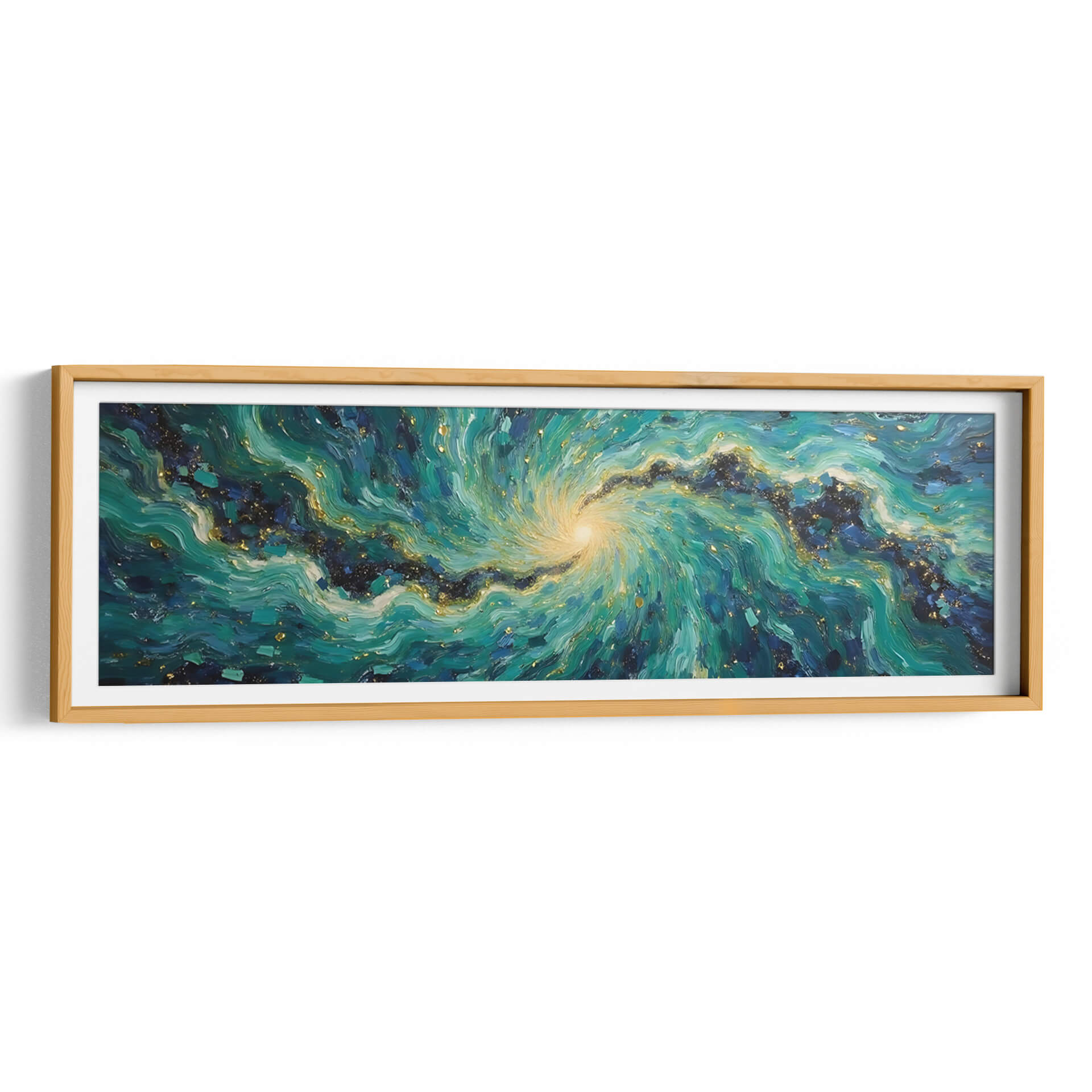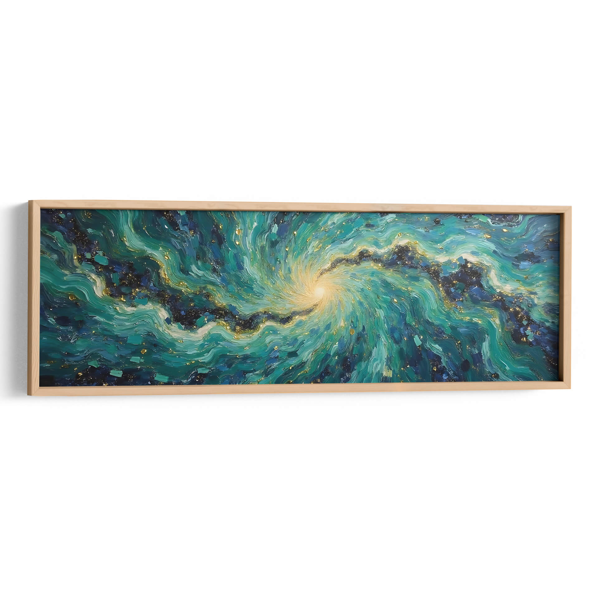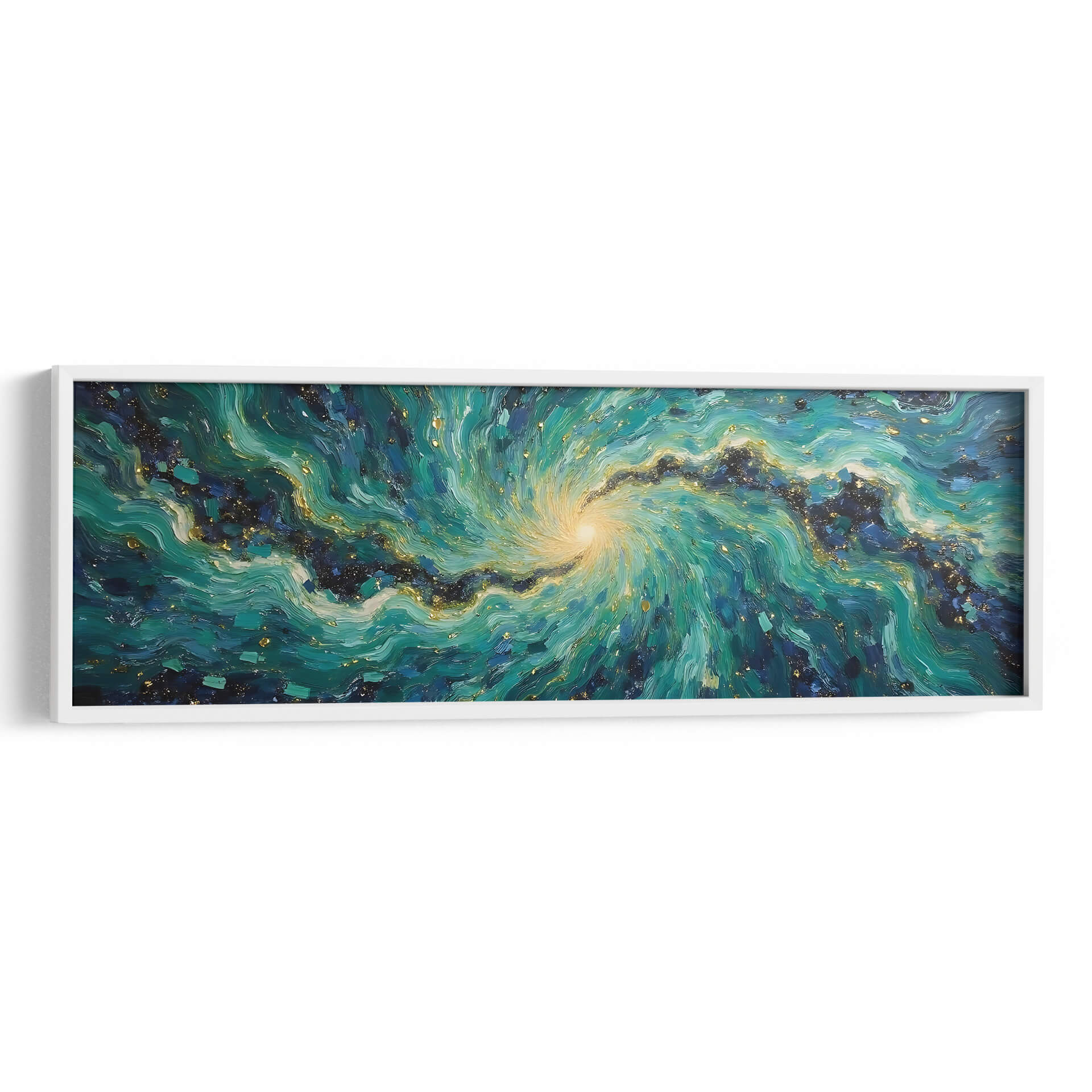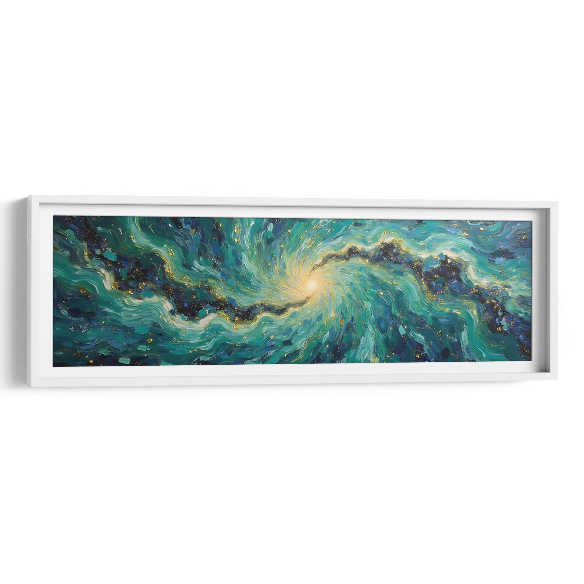 Sumérgete en la hipnótica belleza de "Vórtice Esmeralda", una obra de arte abstracto que captura la energía dinámica de la naturaleza y el cosmos. Tito Massia nos transporta a través de un remolino de tonos verdes intensos, azules profundos y toques de oro centelleante, evocando la majestuosidad de una galaxia o la fuerza indomable de las olas marinas. Las pinceladas expresivas y la composición espiral crean una sensación de movimiento y profundidad, invitando al espectador a perderse en sus detalles intrincados. Este cuadro decorativo es perfecto para añadir un punto focal vibrante y sofisticado a cualquier espacio moderno, ya sea una sala de estar, un comedor o una oficina. Su paleta de colores rica y texturizada aporta calidez y un toque de lujo, transformando cualquier pared en una ventana a un universo de ensueño. "Vórtice Esmeralda" no es solo una pieza de decoración, es una experiencia visual que estimula la imaginación y aporta una atmósfera de misterio y elegancia contemporánea a tu hogar u oficina, invitando a la contemplación y al asombro.