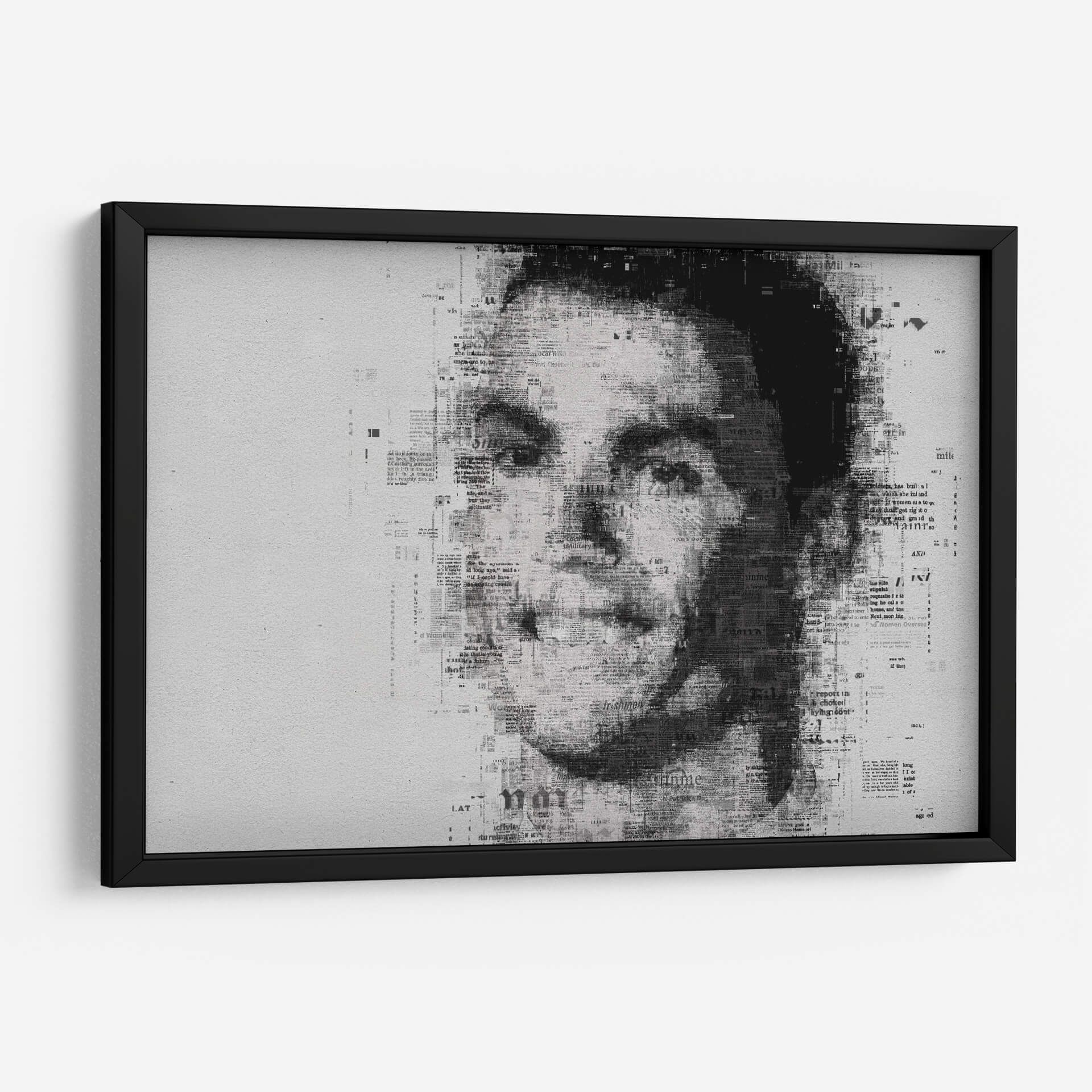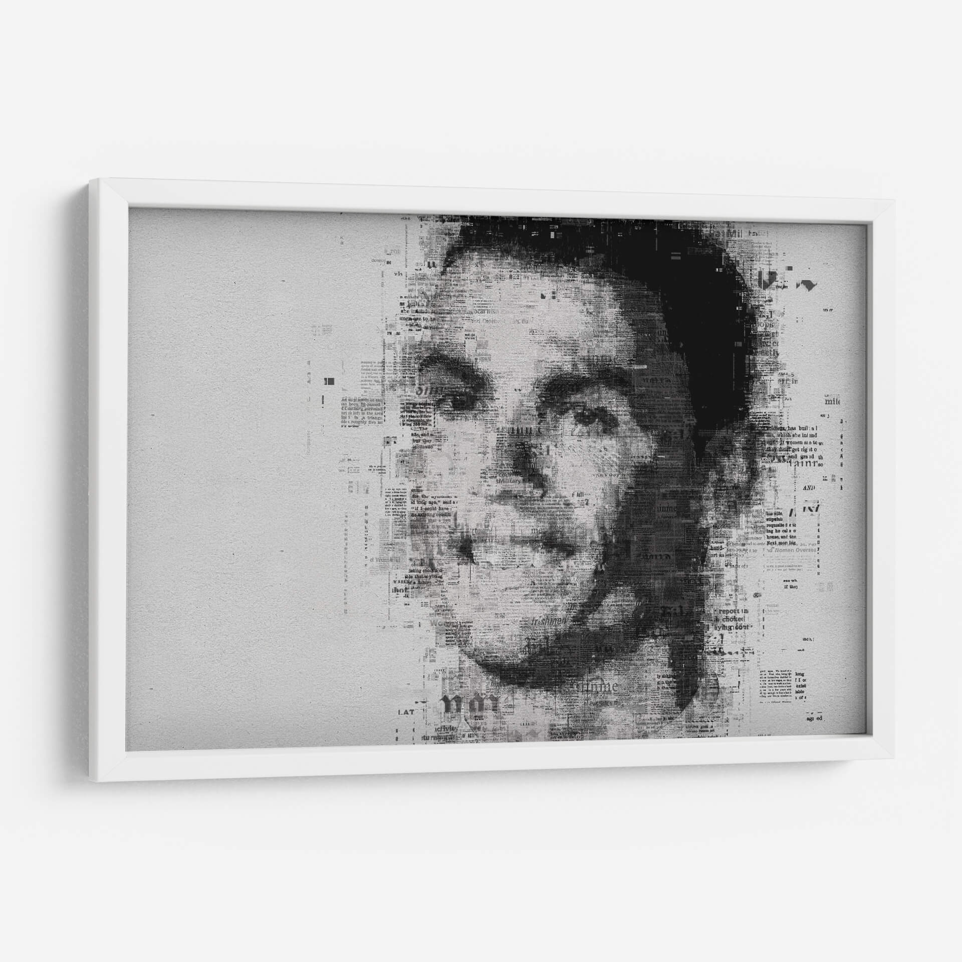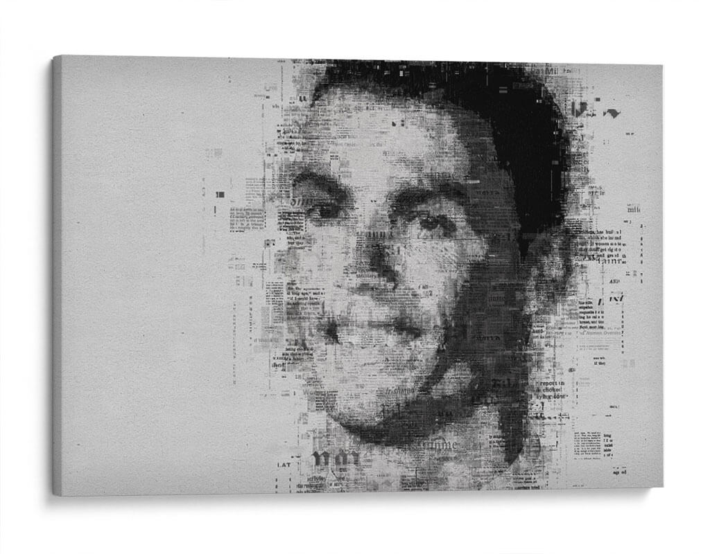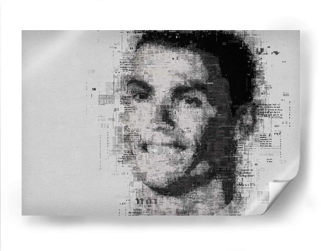 Embárcate en un viaje visual cautivador con este impresionante cuadro decorativo, una obra de arte contemporáneo que redefine el retrato. La pieza presenta el rostro de una figura icónica, construido intrincadamente a partir de texto de periódico, creando un efecto de collage dinámico y lleno de texturas. La paleta de colores monocromática, dominada por blancos, grises y negros, confiere a la obra una elegancia atemporal y un aire de sofisticación, ideal para complementar una amplia gama de estilos decorativos, desde el moderno y minimalista hasta el industrial o incluso el ecléctico. La composición se centra en el poderoso impacto de la mirada, con el texto de las noticias difuminándose y fusionándose para dar forma a los contornos del rostro, sugiriendo una narrativa oculta o la omnipresencia de la información en nuestras vidas. Este cuadro decorativo es perfecto para espacios que buscan un punto focal distintivo y una pieza que invite a la reflexión. Añade carácter a tu sala de estar, estudio u oficina con este retrato único que fusiona el arte con la comunicación escrita, creando una atmósfera de intriga y estilo.