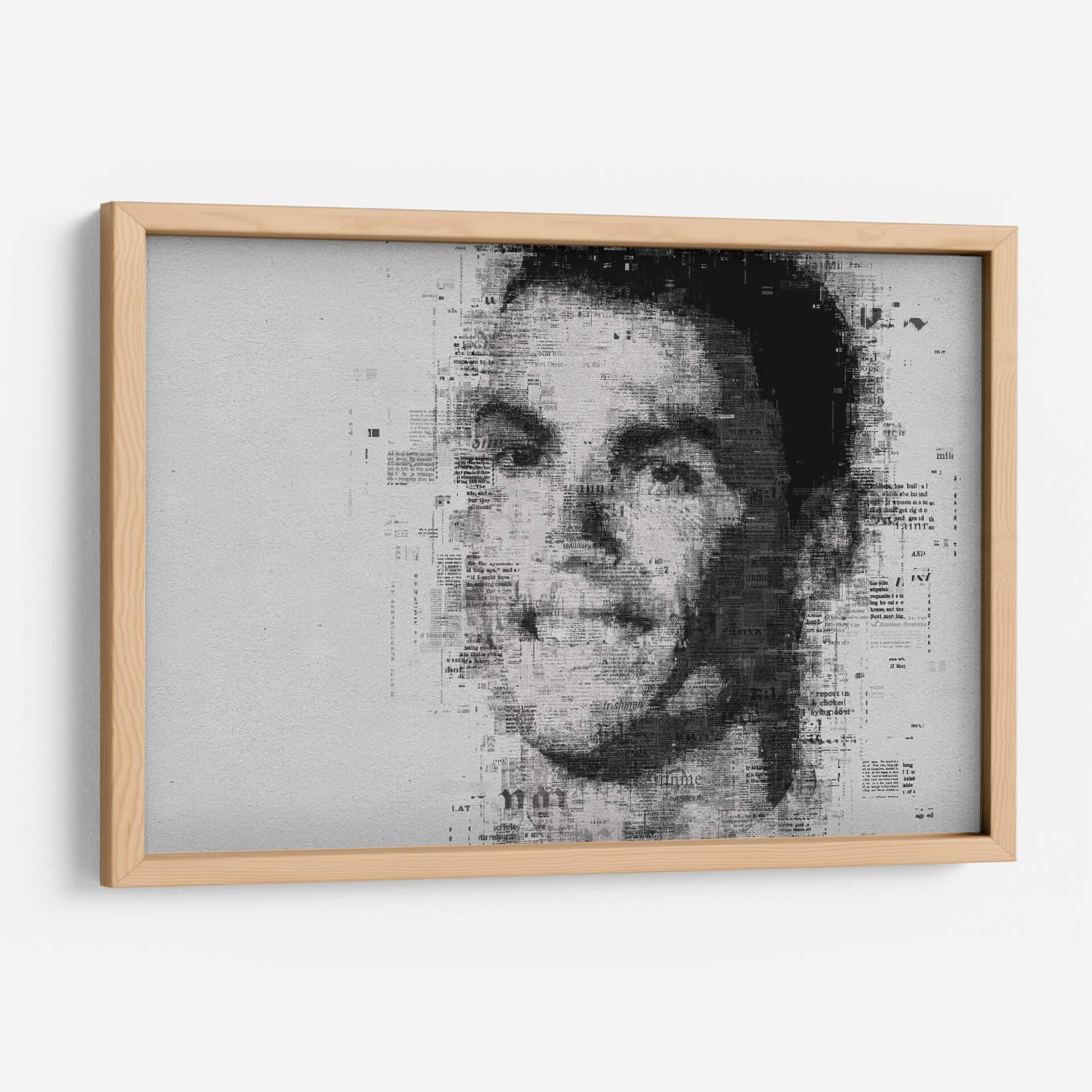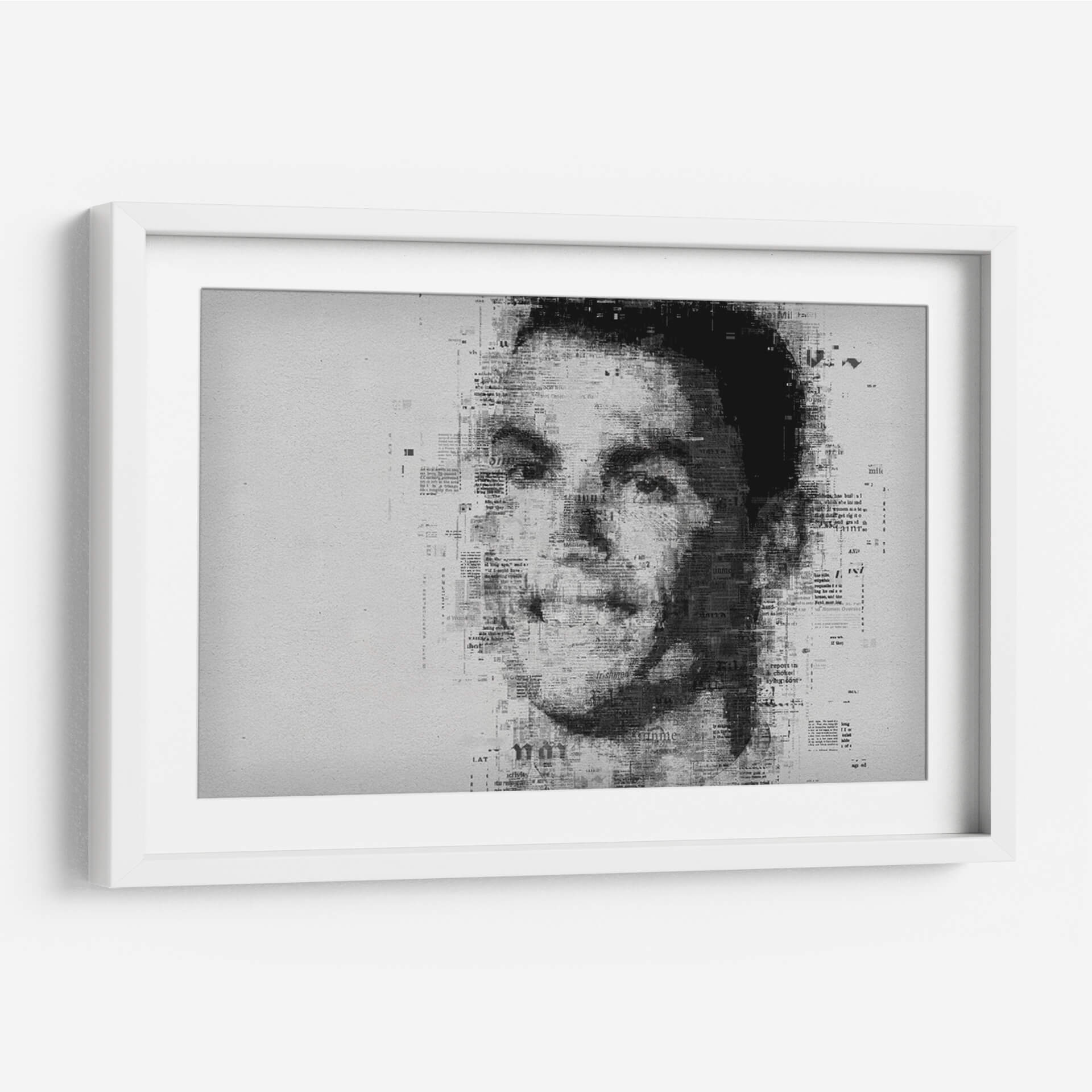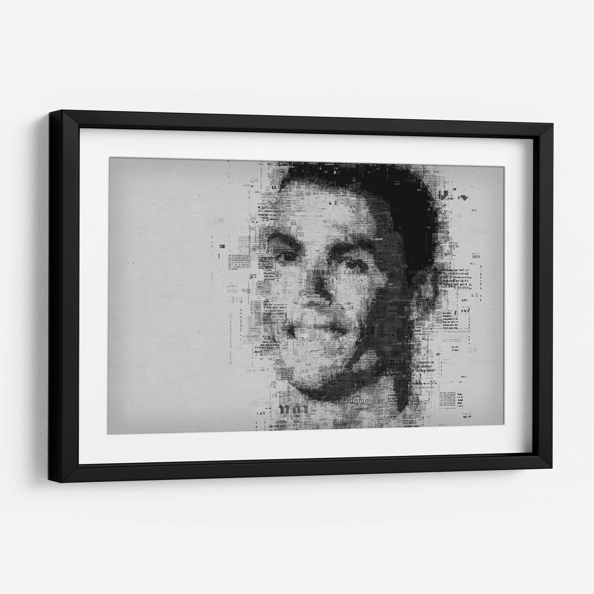 Embárcate en un viaje visual cautivador con este impresionante cuadro decorativo, una obra de arte contemporáneo que redefine el retrato. La pieza presenta el rostro de una figura icónica, construido intrincadamente a partir de texto de periódico, creando un efecto de collage dinámico y lleno de texturas. La paleta de colores monocromática, dominada por blancos, grises y negros, confiere a la obra una elegancia atemporal y un aire de sofisticación, ideal para complementar una amplia gama de estilos decorativos, desde el moderno y minimalista hasta el industrial o incluso el ecléctico. La composición se centra en el poderoso impacto de la mirada, con el texto de las noticias difuminándose y fusionándose para dar forma a los contornos del rostro, sugiriendo una narrativa oculta o la omnipresencia de la información en nuestras vidas. Este cuadro decorativo es perfecto para espacios que buscan un punto focal distintivo y una pieza que invite a la reflexión. Añade carácter a tu sala de estar, estudio u oficina con este retrato único que fusiona el arte con la comunicación escrita, creando una atmósfera de intriga y estilo.