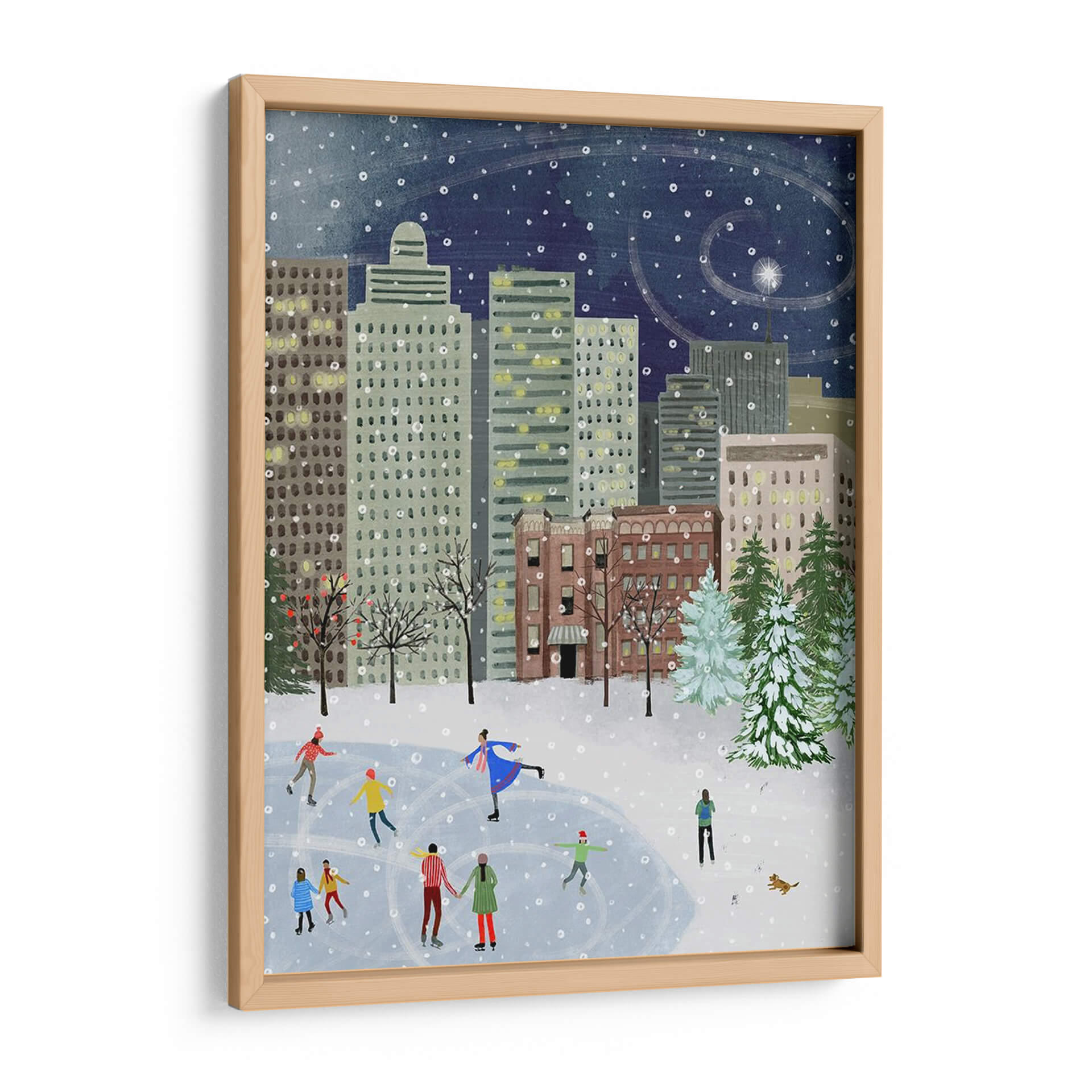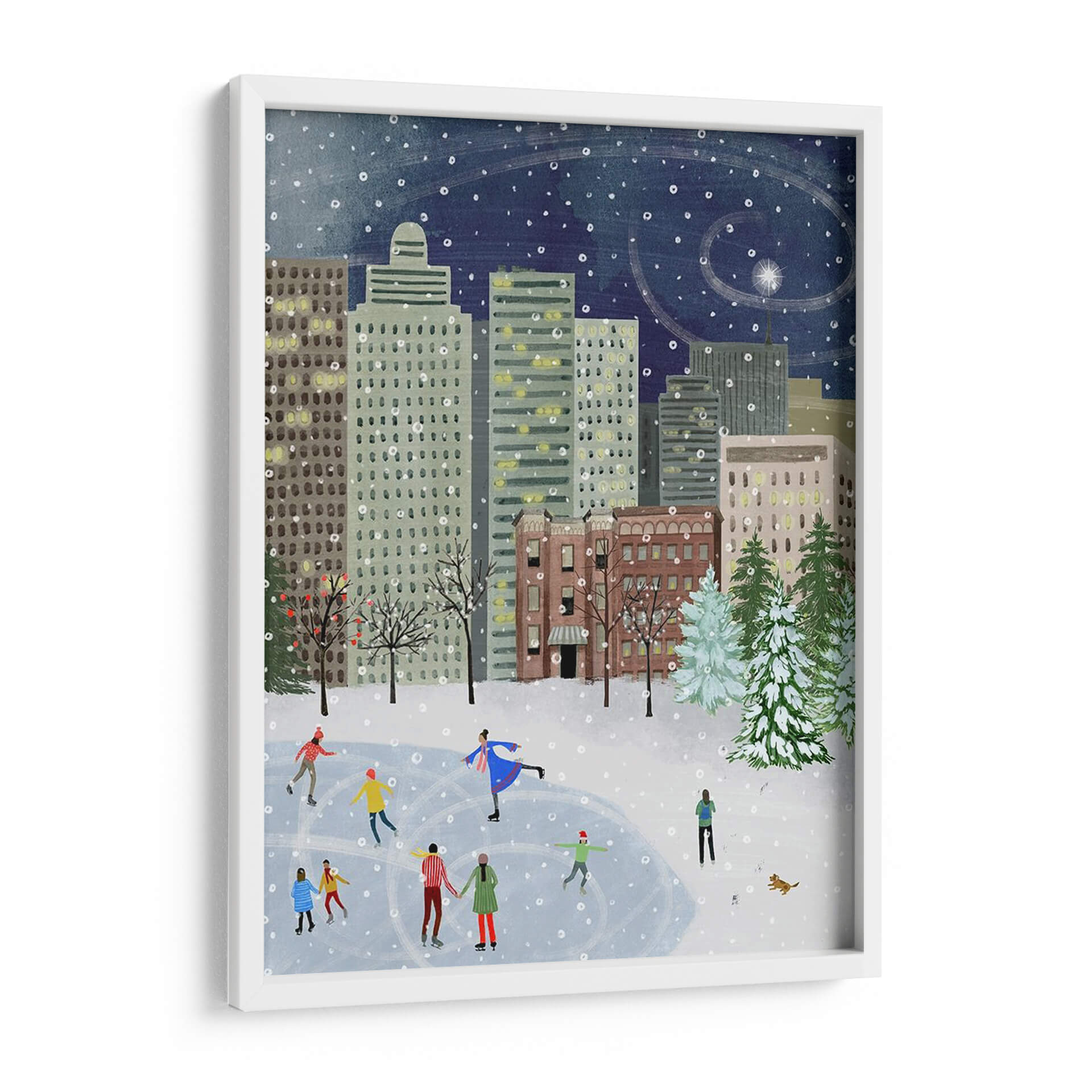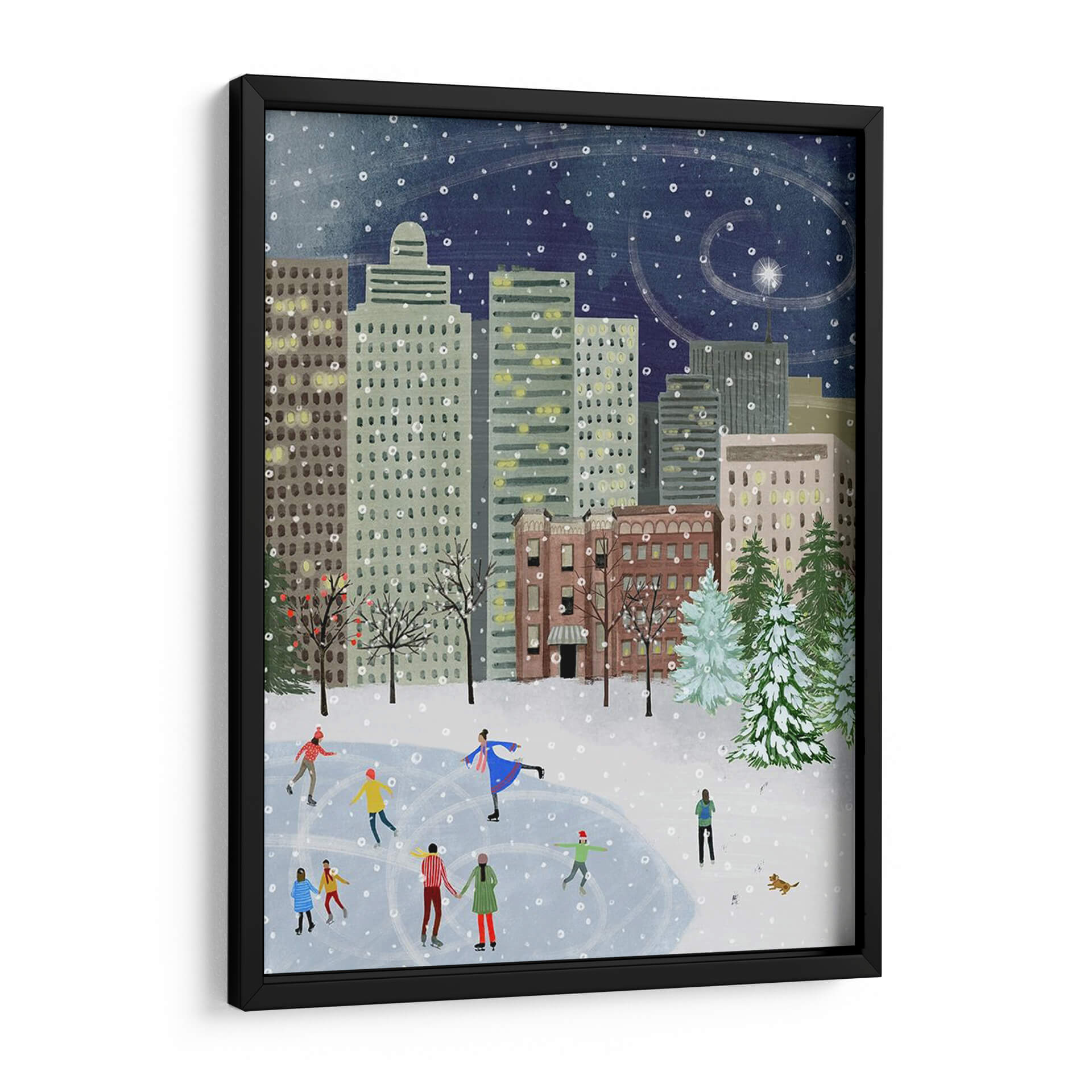 Sumérgete en la mágica atmósfera de "Navidad En La Ciudad II", una encantadora obra de arte de Grace Popp que captura la esencia de una noche invernal en la metrópoli. Este cuadro decorativo presenta una vibrante escena de patinaje sobre hielo en medio de imponentes rascacielos, bajo un cielo estrellado salpicado de copos de nieve danzantes. La paleta de colores, dominada por profundos azules nocturnos, grises urbanos y toques cálidos de las luces de las ventanas, evoca una sensación de serenidad y festividad. El estilo distintivo de Popp, con sus formas amigables y una composición detallada, invita a la contemplación y trae consigo una dosis de nostalgia y alegría. "Navidad En La Ciudad II" es perfecto para añadir un toque de calidez y carácter a cualquier sala de estar, comedor u oficina, convirtiéndose en un punto focal acogedor que celebra la belleza de los momentos compartidos y la magia de la temporada invernal. Un lienzo que trasciende la simple decoración para convertirse en una ventana a un recuerdo entrañable.