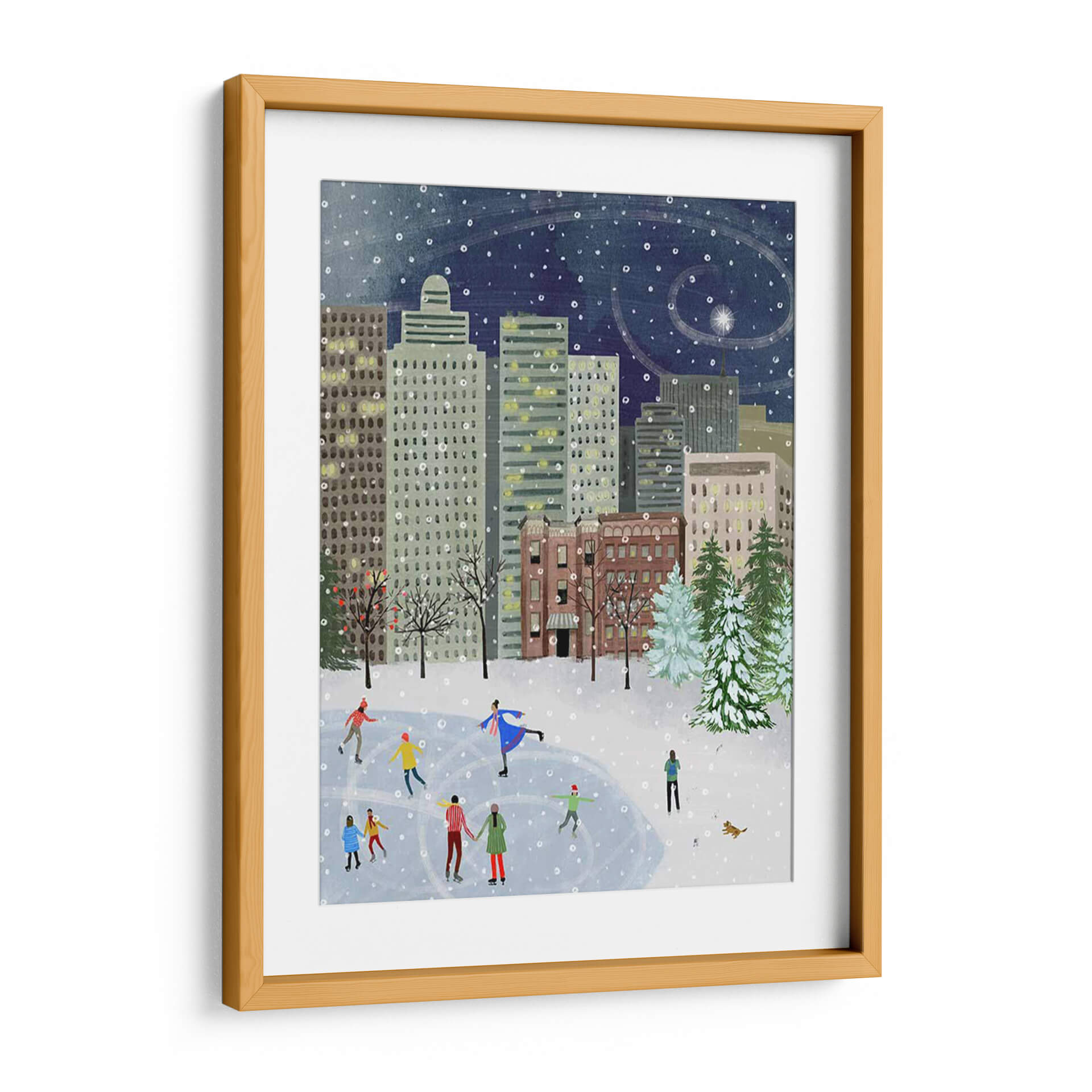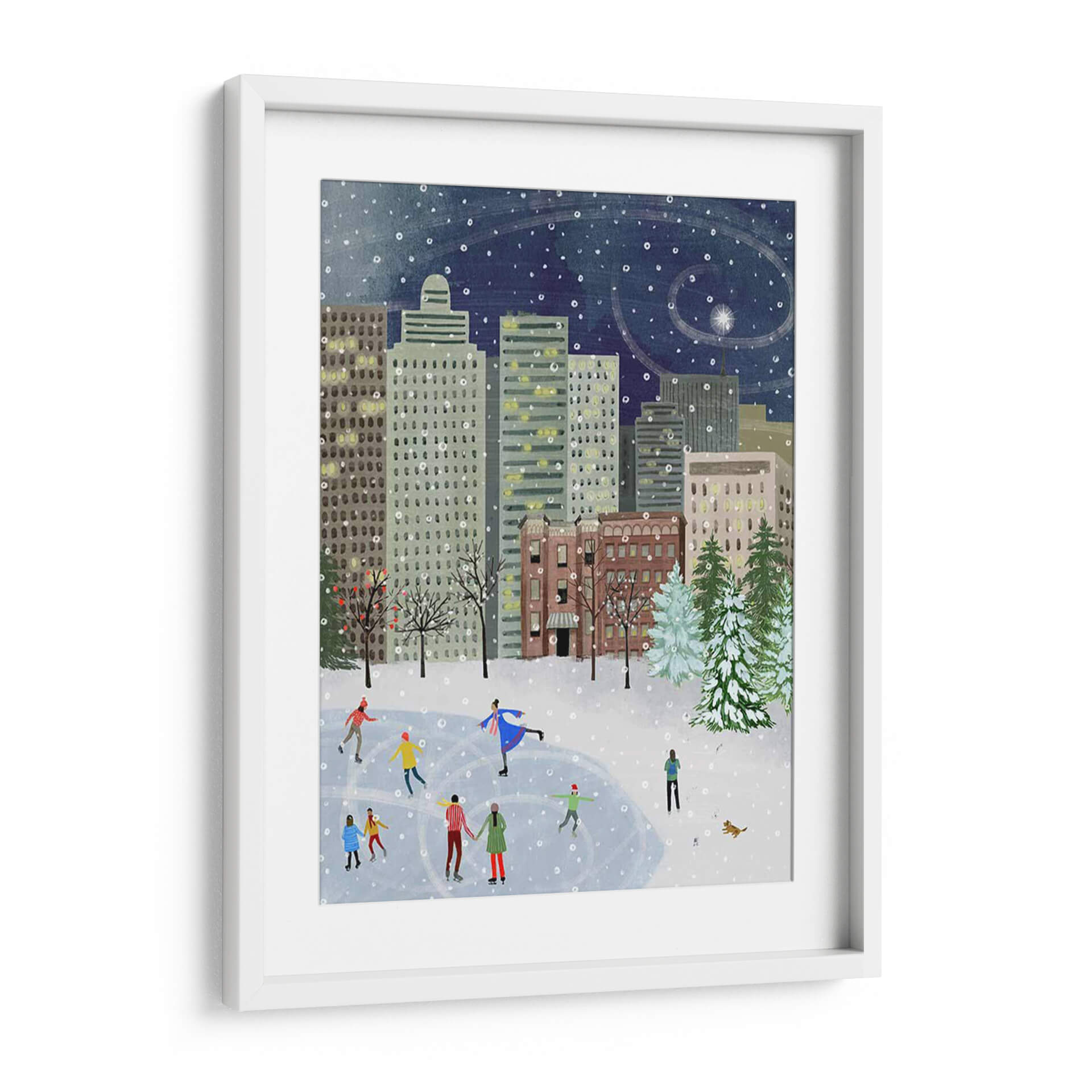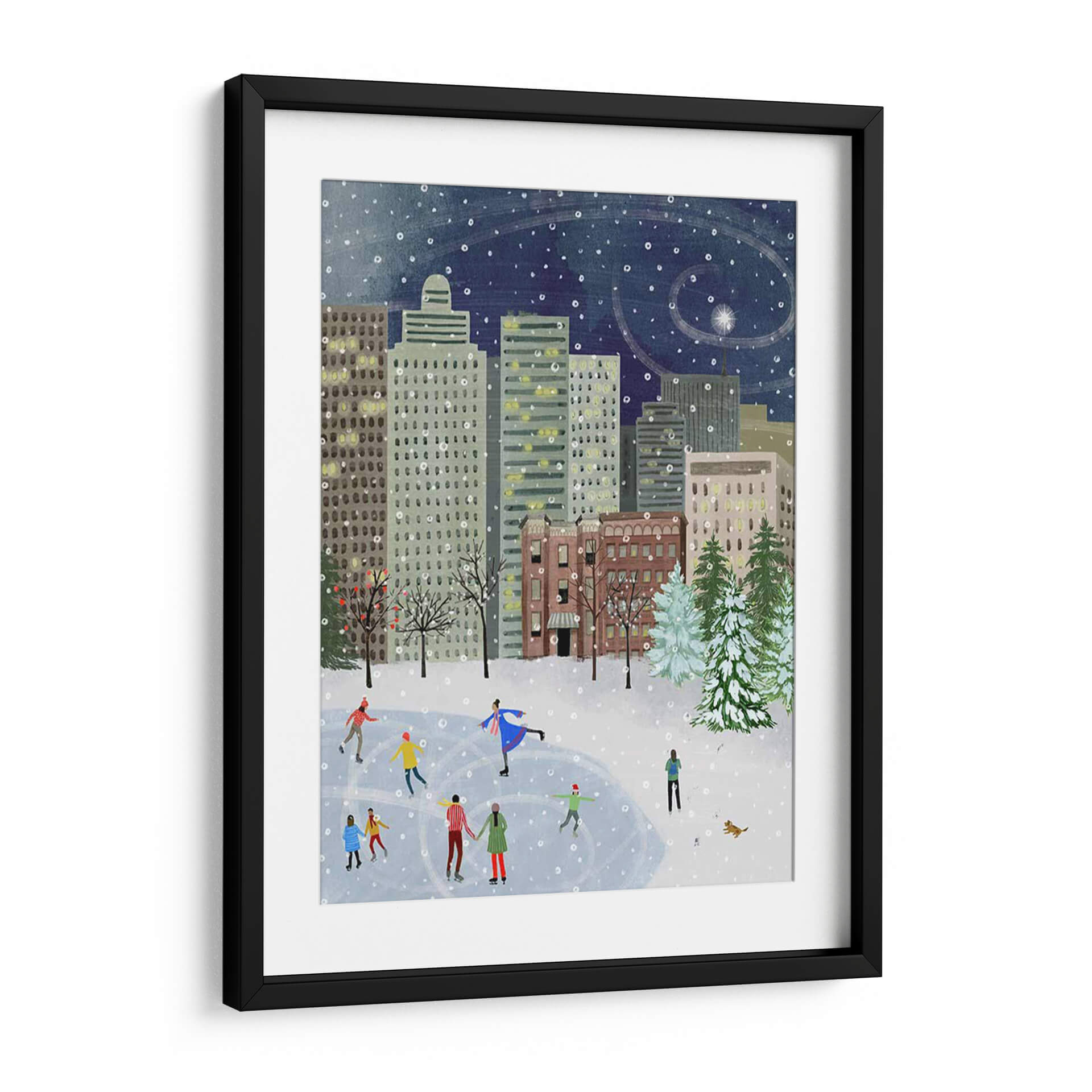 Sumérgete en la mágica atmósfera de "Navidad En La Ciudad II", una encantadora obra de arte de Grace Popp que captura la esencia de una noche invernal en la metrópoli. Este cuadro decorativo presenta una vibrante escena de patinaje sobre hielo en medio de imponentes rascacielos, bajo un cielo estrellado salpicado de copos de nieve danzantes. La paleta de colores, dominada por profundos azules nocturnos, grises urbanos y toques cálidos de las luces de las ventanas, evoca una sensación de serenidad y festividad. El estilo distintivo de Popp, con sus formas amigables y una composición detallada, invita a la contemplación y trae consigo una dosis de nostalgia y alegría. "Navidad En La Ciudad II" es perfecto para añadir un toque de calidez y carácter a cualquier sala de estar, comedor u oficina, convirtiéndose en un punto focal acogedor que celebra la belleza de los momentos compartidos y la magia de la temporada invernal. Un lienzo que trasciende la simple decoración para convertirse en una ventana a un recuerdo entrañable.