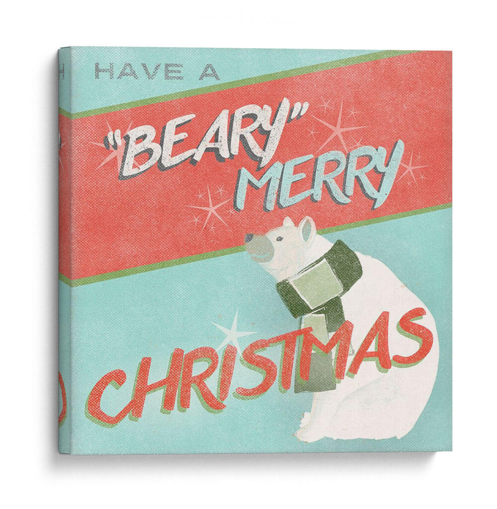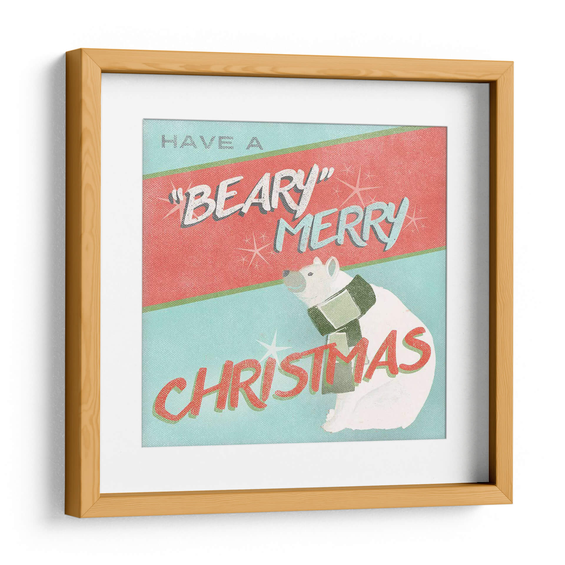 Celebra la temporada navideña con estilo y encanto a través de este cautivador cuadro decorativo titulado 'Retro Navidad II'. La obra, del artista June Erica Vess, evoca una nostálgica atmósfera festiva con su paleta de colores vibrantes y un diseño retro distintivo. Un tierno oso polar, ataviado con una bufanda verde, se asoma con una sonrisa, invitando a un ""beary"" merry Christmas. El texto, en tipografía audaz y retro, se complementa con sutiles destellos y estrellas que añaden un toque mágico. Los tonos predominantes, como el rojo festivo, el verde esmeralda y un suave azul turquesa, crean un contraste llamativo y alegre. Este cuadro es perfecto para añadir un toque de espíritu navideño y personalidad a cualquier espacio, desde la sala de estar hasta una oficina o un dormitorio infantil. Su diseño único y su mensaje optimista lo convierten en una pieza ideal para regalar o para decorar tu hogar durante las fiestas, asegurando sonrisas y calidez.