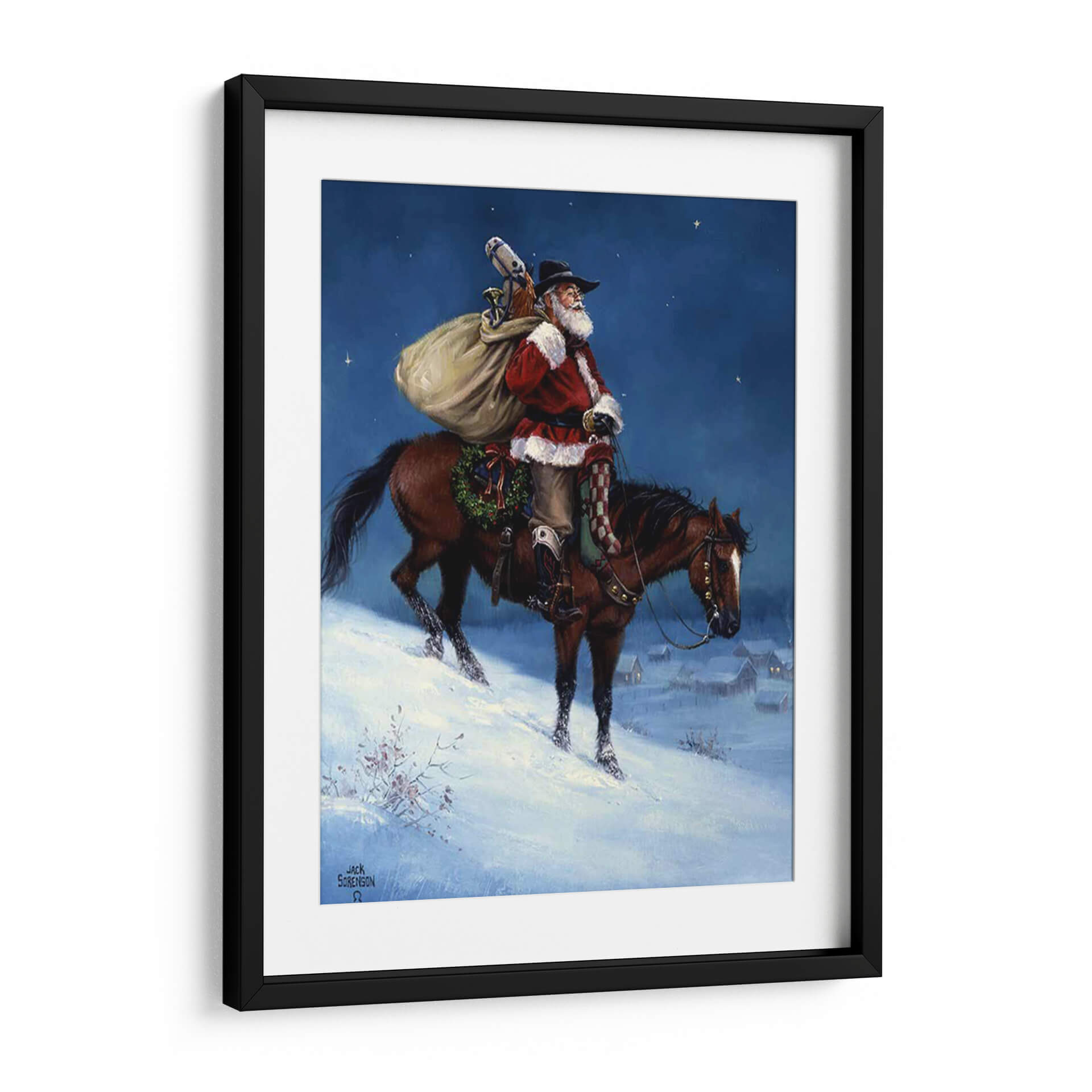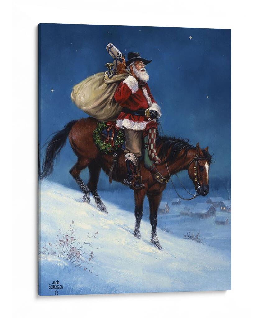 Celebra la magia de la temporada con "Una Navidad Vaquero", una obra de arte que captura la esencia del espíritu navideño con un toque distintivo del oeste americano. Este cuadro decorativo presenta a un Papá Noel montado a caballo, descendiendo por una colina nevada bajo un cielo estrellado. La figura icónica de Santa Claus viste su tradicional traje rojo, pero con un sombrero de vaquero que le confiere un aire único y aventurero. Su gran saco de regalos, adornado con una corona festiva, promete sorpresas y alegría. La paleta de colores, dominada por azules profundos del cielo nocturno y blancos puros de la nieve, crea una atmósfera serena y mágica, mientras que los cálidos tonos del traje de Santa y el pelaje del caballo añaden un contraste reconfortante. La escena se desarrolla en un paisaje rural invernal, con pequeñas casas iluminadas a lo lejos, sugiriendo un pueblo acogedor que espera la llegada de los regalos. El estilo realista y detallado de Jack Sorenson da vida a cada elemento, desde la textura de la nieve hasta la expresión del personaje. "Una Navidad Vaquero" es la pieza ideal para añadir un encanto rústico y festivo a tu sala de estar, comedor u oficina, convirtiéndose en un punto focal que evoca calidez, tradición y la emoción de la Navidad.