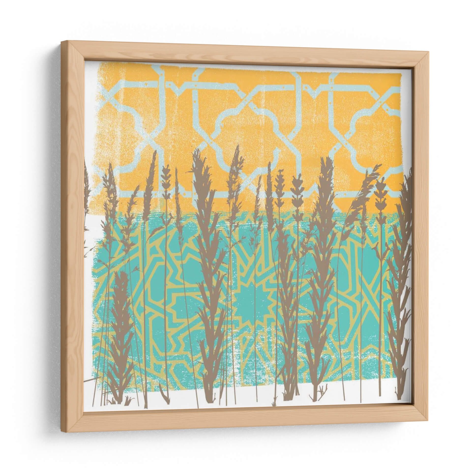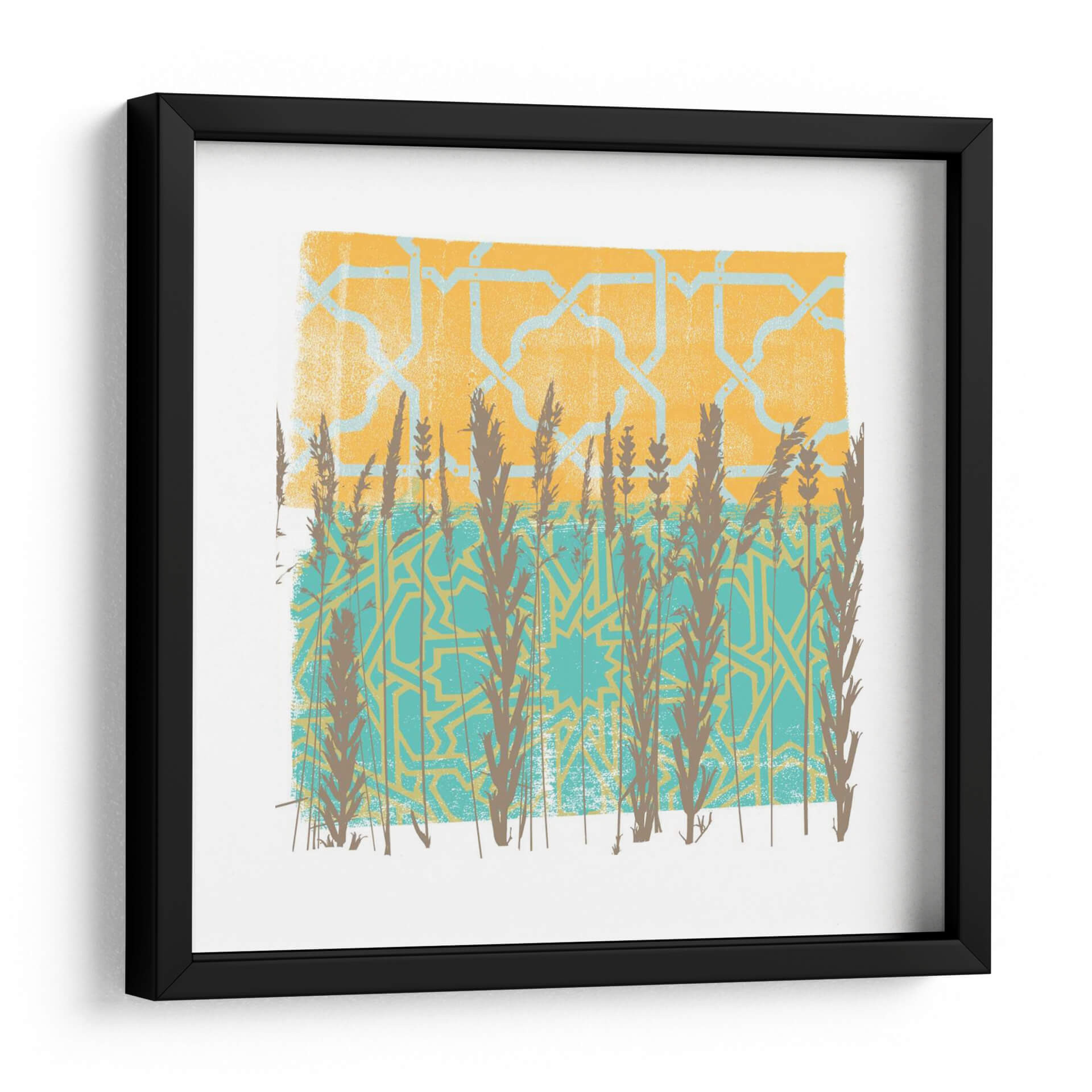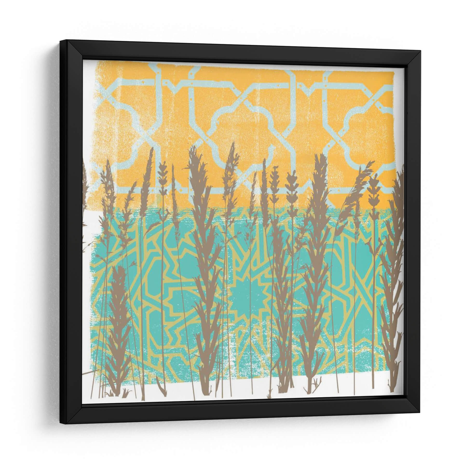 Sumérgete en la atmósfera vibrante de 'A Lo Largo De La Cerca II', una obra de arte contemporáneo de Alonzo Saunders que fusiona elementos orgánicos y geométricos con una audacia cromática cautivadora. La composición presenta una línea de horizonte sutilmente definida por cañas estilizadas en tonos tierra, cuyas siluetas se alzan sobre un vibrante telón de fondo. Este fondo se divide en dos secciones: una superior de un ocre intenso, texturizada y salpicada de un patrón geométrico de líneas azul turquesa entrelazadas, y una sección inferior con el mismo patrón geométrico sobre un intenso azul turquesa, creando un contraste visual dinámico y lleno de energía. La yuxtaposición del patrón repetitivo y la espontaneidad de las cañas evoca una sensación de orden natural y abstracción moderna. Este cuadro decorativo es ideal para inyectar personalidad y un toque de color sofisticado a cualquier espacio, ya sea una sala de estar moderna, un comedor o una oficina que busque inspiración. Su diseño único y contemporáneo lo convierte en una pieza central que invita a la contemplación y añade profundidad a tu decoración.