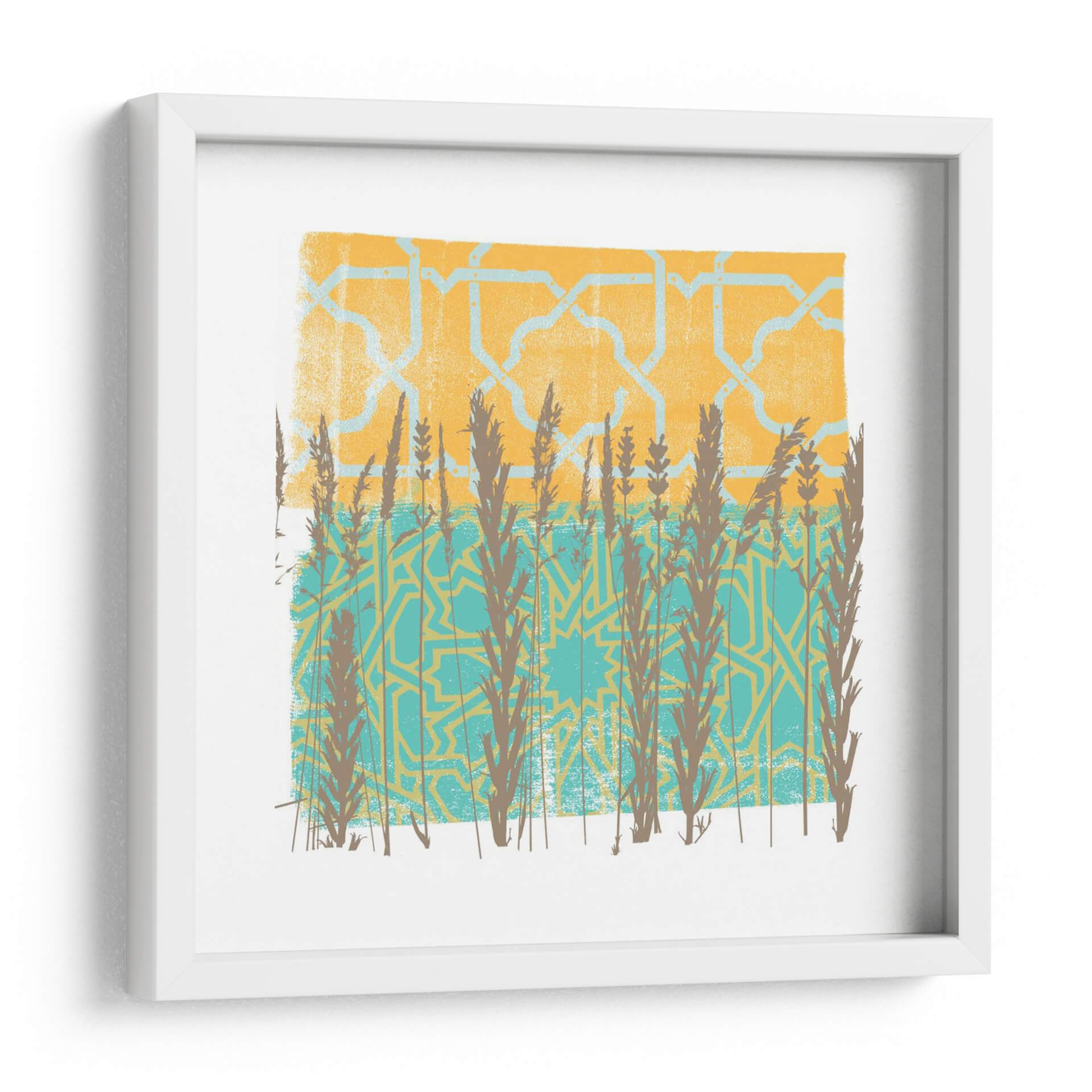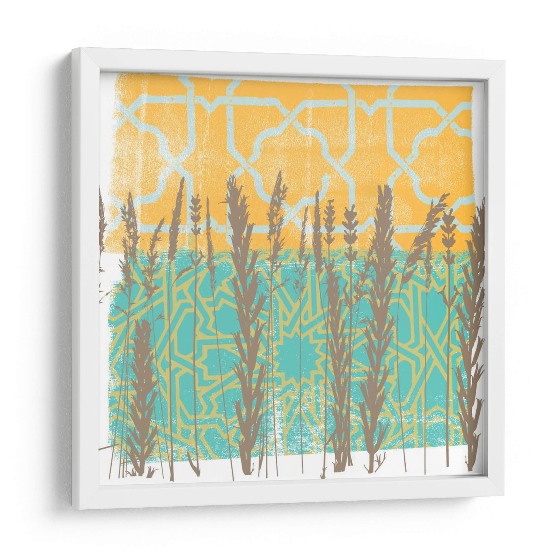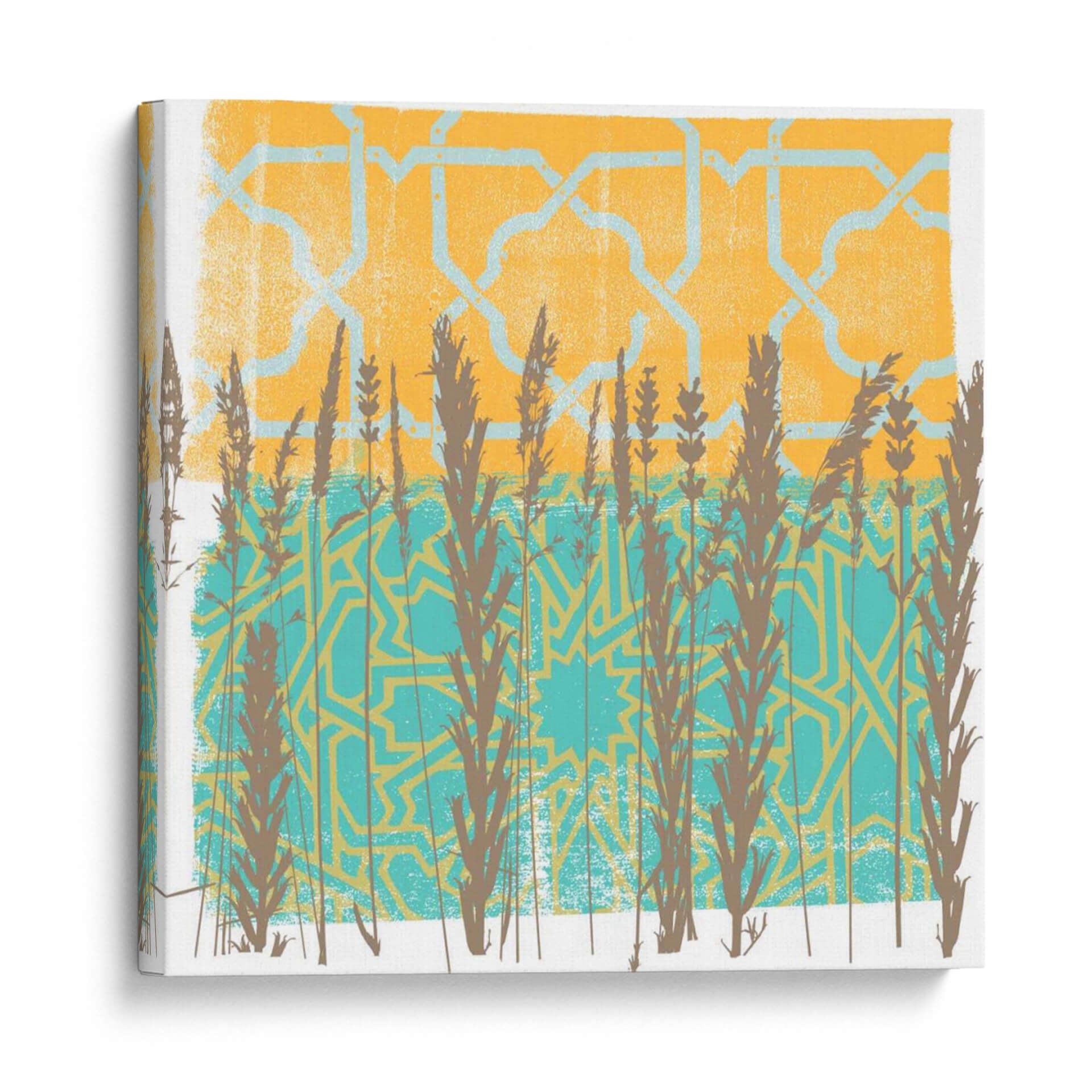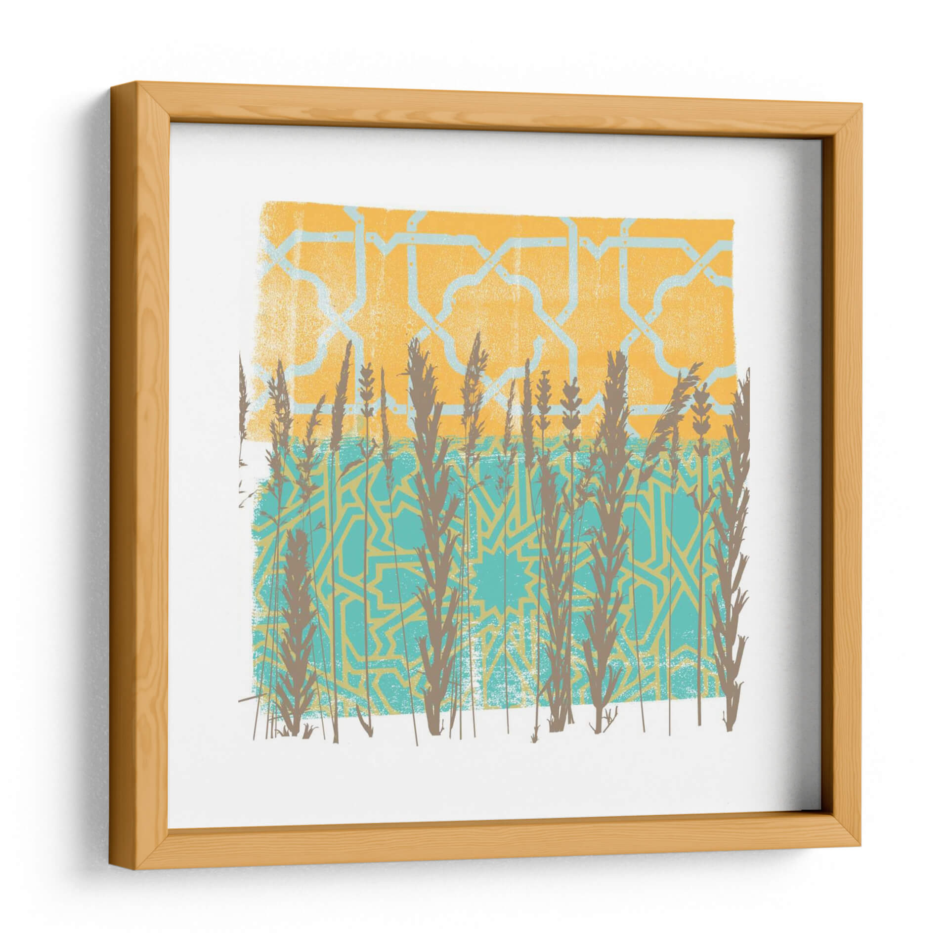 Sumérgete en la atmósfera vibrante de 'A Lo Largo De La Cerca II', una obra de arte contemporáneo de Alonzo Saunders que fusiona elementos orgánicos y geométricos con una audacia cromática cautivadora. La composición presenta una línea de horizonte sutilmente definida por cañas estilizadas en tonos tierra, cuyas siluetas se alzan sobre un vibrante telón de fondo. Este fondo se divide en dos secciones: una superior de un ocre intenso, texturizada y salpicada de un patrón geométrico de líneas azul turquesa entrelazadas, y una sección inferior con el mismo patrón geométrico sobre un intenso azul turquesa, creando un contraste visual dinámico y lleno de energía. La yuxtaposición del patrón repetitivo y la espontaneidad de las cañas evoca una sensación de orden natural y abstracción moderna. Este cuadro decorativo es ideal para inyectar personalidad y un toque de color sofisticado a cualquier espacio, ya sea una sala de estar moderna, un comedor o una oficina que busque inspiración. Su diseño único y contemporáneo lo convierte en una pieza central que invita a la contemplación y añade profundidad a tu decoración.