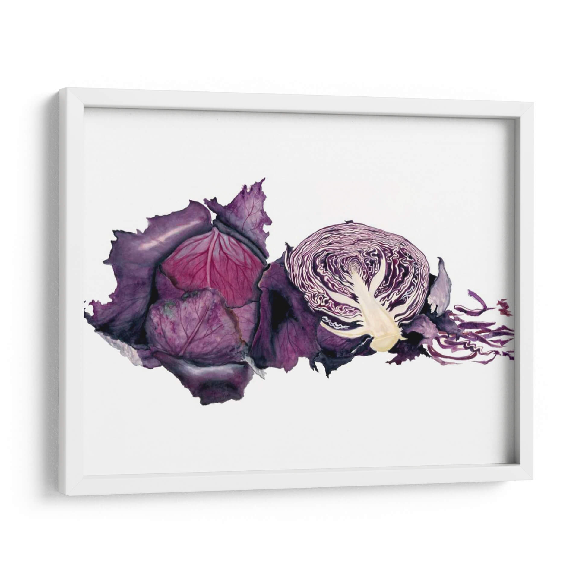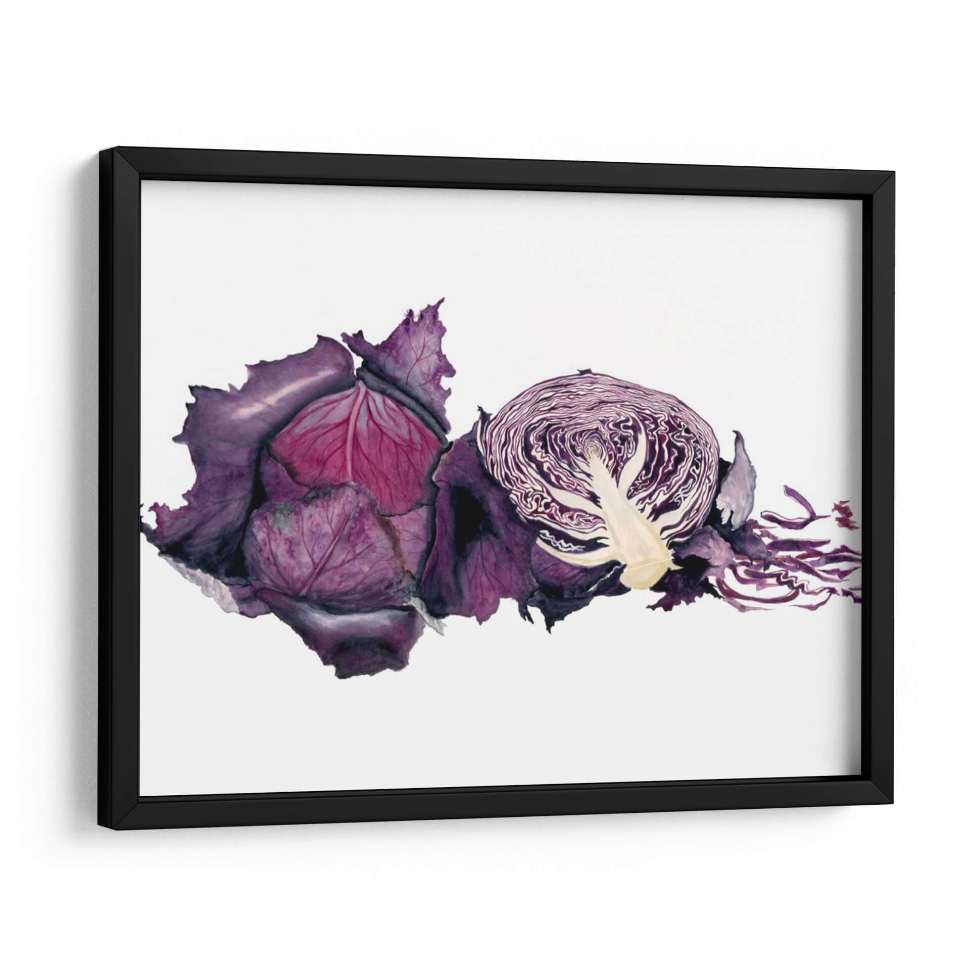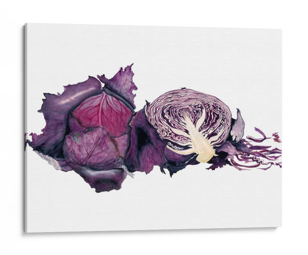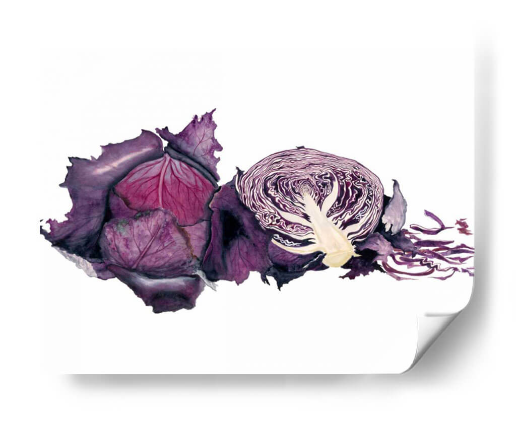 Sumérgete en la vibrante y detallada representación de "Acuarela Col Púrpura" de Michael Willett, una obra de arte que captura la esencia botánica con una delicadeza excepcional. Este cuadro decorativo, realizado con la técnica de acuarela, resalta las profundidades del color púrpura, desde los tonos más oscuros y aterciopelados de las hojas exteriores hasta los matices rosados y violáceos del interior. La composición presenta una col morada entera y otra cortada por la mitad, revelando la intrincada estructura de sus capas y el contraste de texturas. La frescura y la vitalidad de la verdura se transmiten a través de pinceladas fluidas y un juego de luces y sombras que le otorgan realismo y profundidad. Perfecta para añadir un toque de color y naturaleza a tu cocina, comedor o cualquier espacio que busque inspiración culinaria y estética. Este cuadro es ideal para quienes aprecian el arte contemporáneo con motivos orgánicos, aportando un elemento de sofisticación y un guiño a la abundancia de la naturaleza. Su estilo realista con toques expresivos lo convierte en una pieza versátil para diversos estilos decorativos, desde el rústico hasta el moderno.
