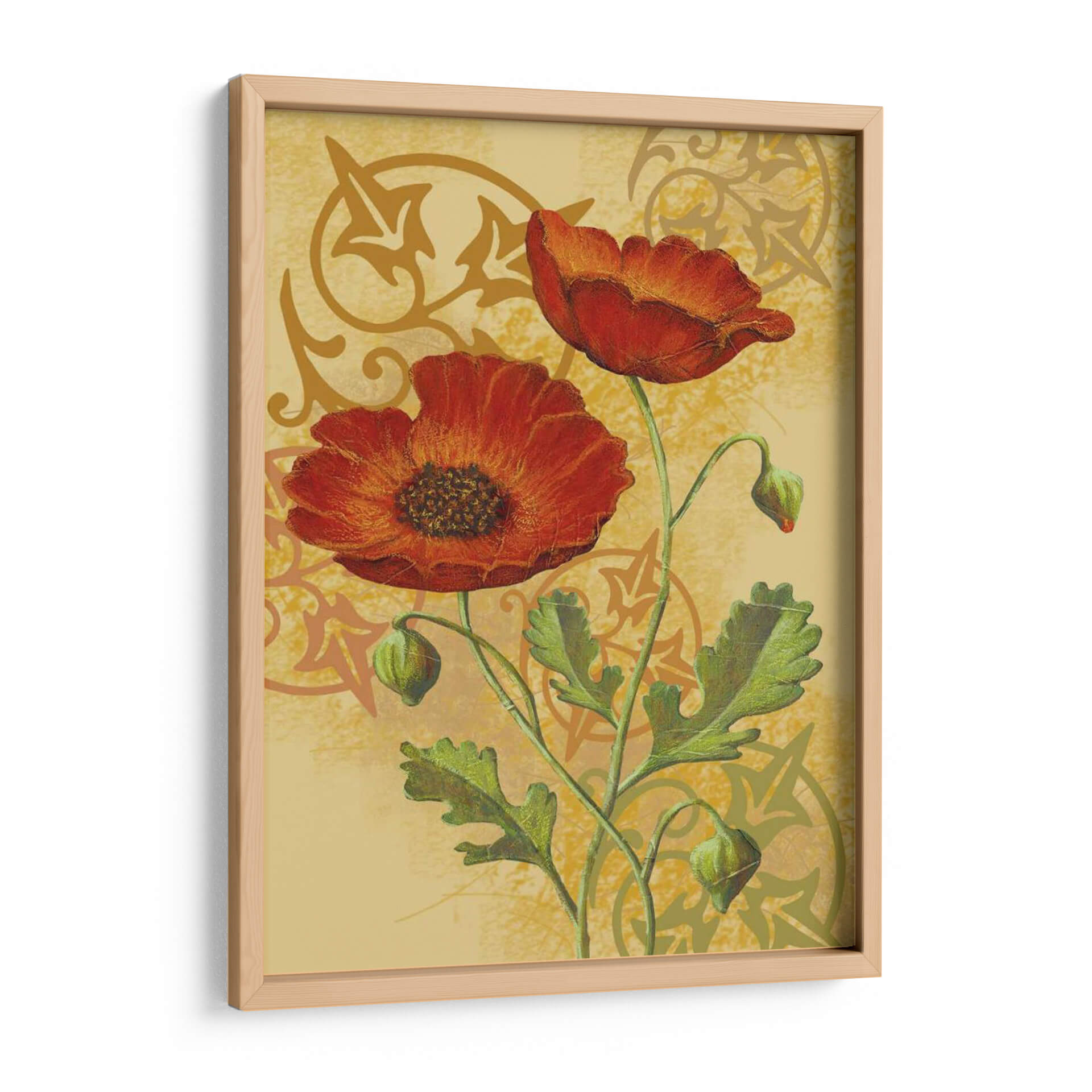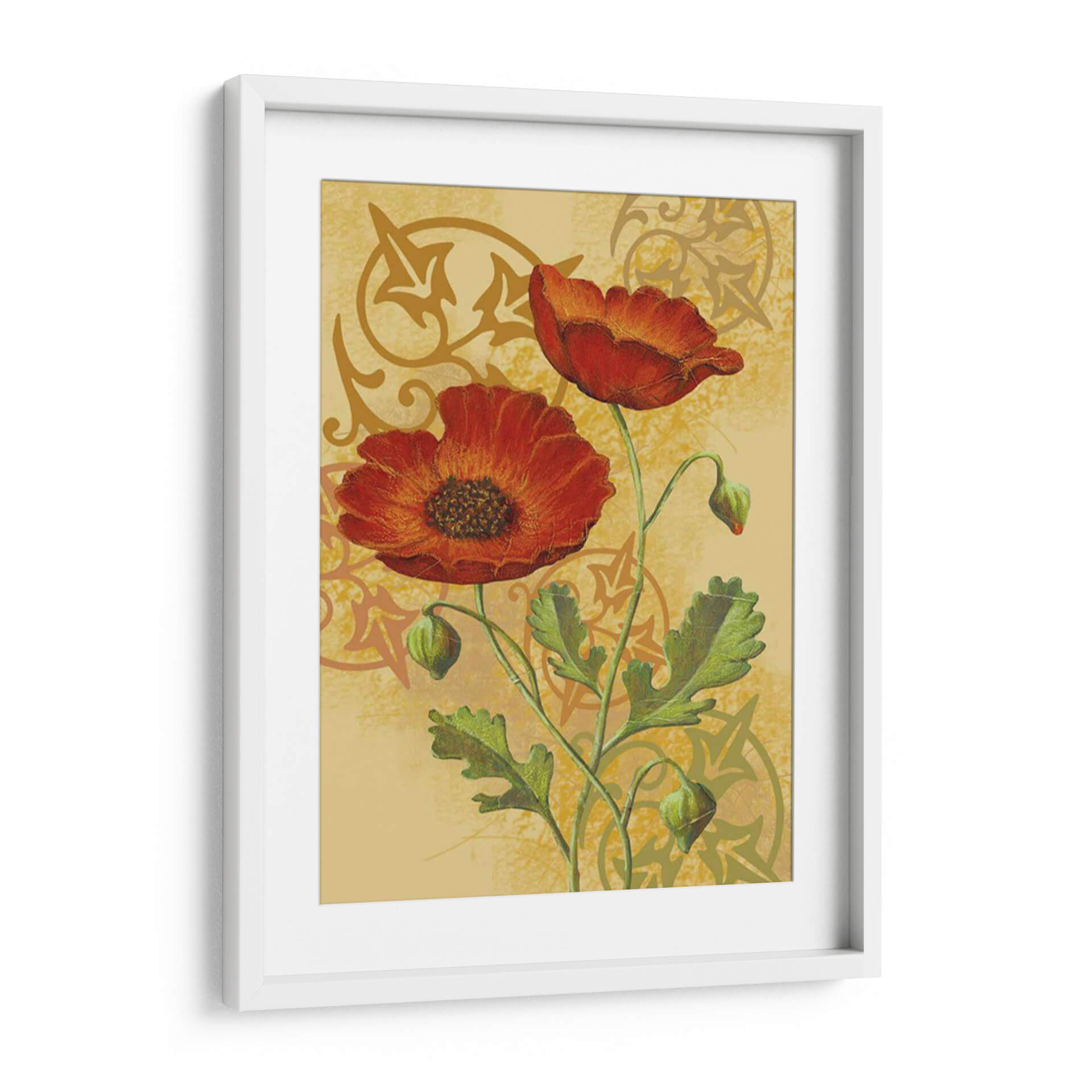 Embellezca su hogar u oficina con la vibrante obra "Amapolas en Oro I" de Louise Max. Este cautivador cuadro decorativo presenta dos amapolas rojas intensas que florecen con elegancia sobre un fondo texturizado en tonos dorados y ocres. Los detalles intrincados de los pétalos y las hojas verdes, junto con los sutiles motivos ornamentales en el fondo, crean una composición visualmente rica y armoniosa. La paleta de colores cálidos, dominada por los rojos profundos y los dorados luminosos, evoca una sensación de calidez, pasión y vitalidad. El estilo, que fusiona elementos realistas con toques de arte decorativo, hace que esta pieza sea versátil para diversos estilos de decoración, desde el clásico hasta el contemporáneo. "Amapolas en Oro I" es ideal para infundir un toque de color y sofisticación en su sala de estar, comedor o estudio, sirviendo como un punto focal que inspira alegría y aprecio por la belleza natural. La delicada representación de las amapolas y sus capullos añade un matiz de esperanza y renovación, convirtiendo este cuadro en una adición significativa a cualquier espacio que busque transmitir energía positiva y un refinado gusto estético.