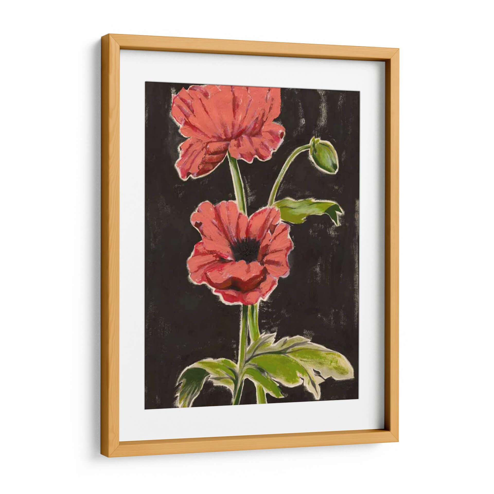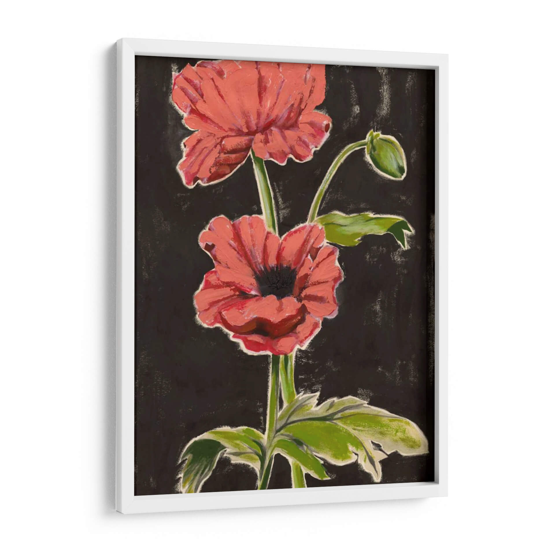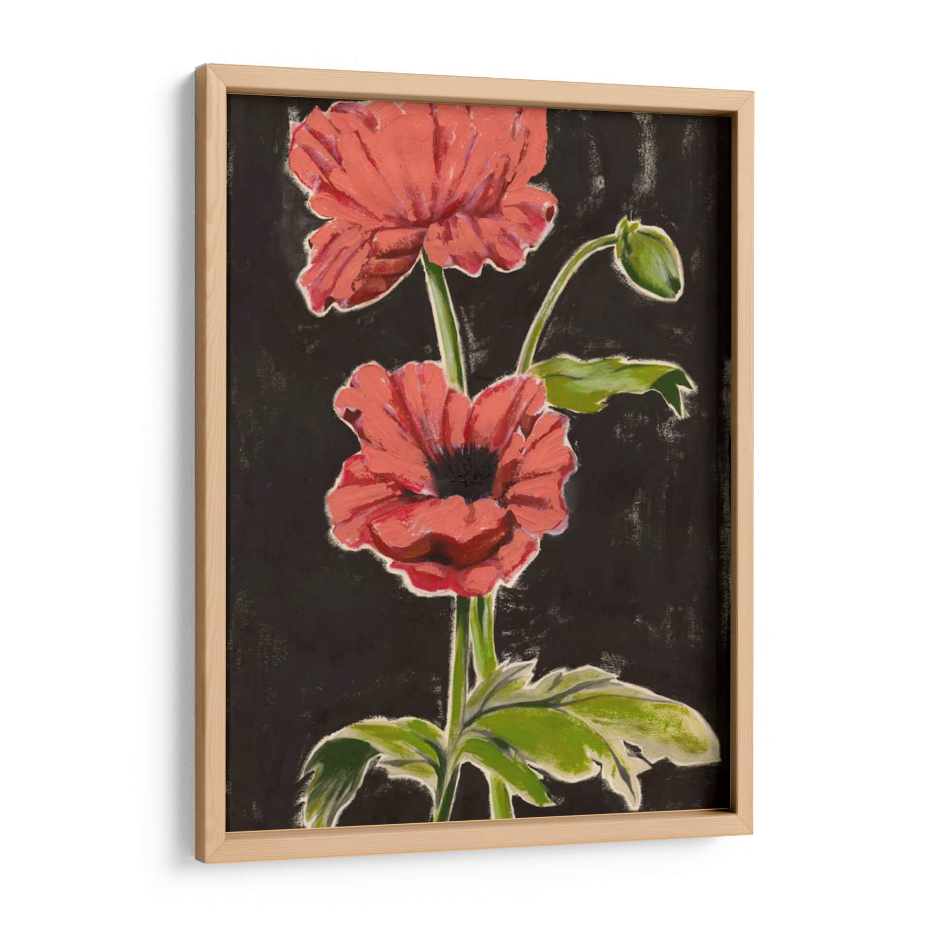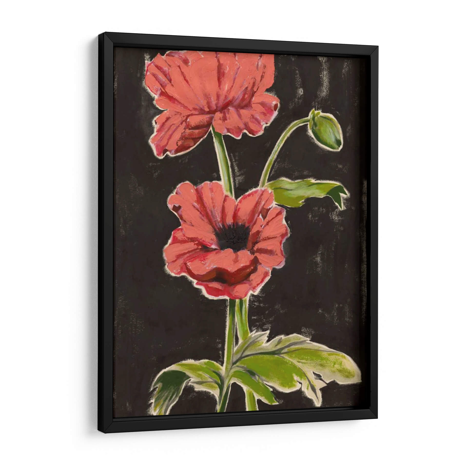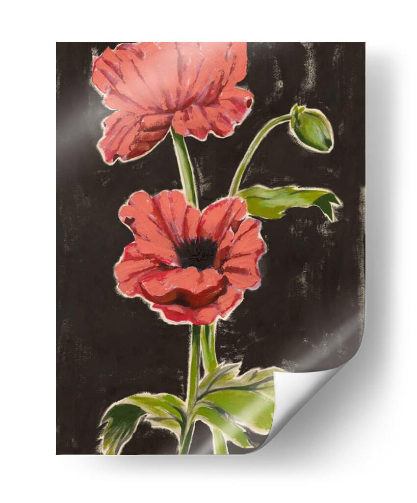 Sumérgete en la vibrante belleza de "Amapolas Haladas I", una obra de arte contemporáneo que captura la esencia de estas flores icónicas con una audacia cromática y una pincelada expresiva. El contraste entre los pétalos de un rojo coral intenso y un fondo oscuro y texturizado crea un efecto dramático y cautivador, atrayendo la mirada hacia el delicado capullo y las hojas verdes que acompañan el tallo principal. El estilo pictórico, que roza lo abstracto sin perder la figuración, evoca una sensación de energía vital y un toque de misterio natural. Esta pieza es perfecta para añadir un punto focal audaz y lleno de vida a cualquier estancia, desde una sala de estar moderna hasta un dormitorio sereno o un espacio de trabajo inspirador. "Amapolas Haladas I" no es solo un cuadro decorativo, sino una invitación a sentir la fuerza y la fragilidad de la naturaleza en tu propio hogar, aportando calidez y un aire artístico inconfundible a tu decoración.