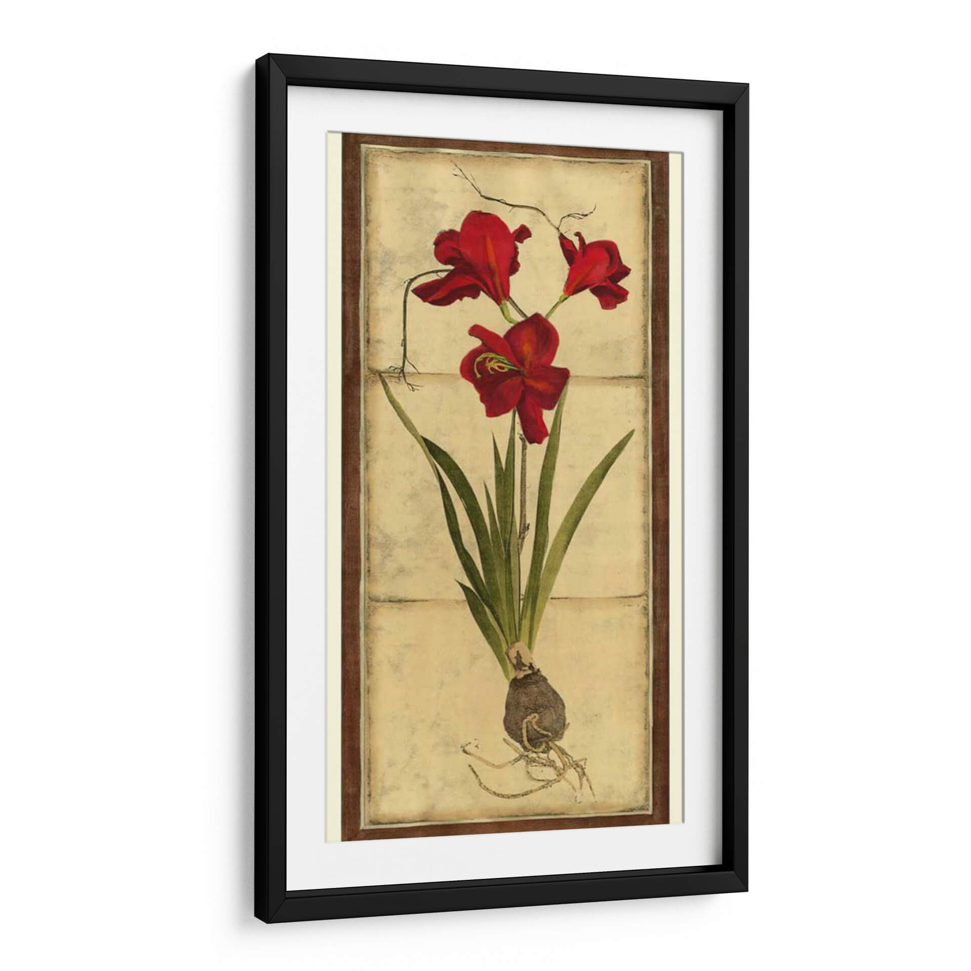 Embellezca su espacio con el 'Amaryllis Panel II', una obra de arte que captura la esencia de la naturaleza con una elegancia atemporal. Este cuadro decorativo presenta un vibrante ramo de amarilis rojas, detalladamente ilustradas con sus hojas verdes y raíces expuestas, evocando un sentido de crecimiento y vitalidad. El fondo, con texturas sutiles y un acabado envejecido en tonos beige y tierra, añade una profundidad visual y un aire de clasicismo, mientras que los marcos interiores de color marrón oscuro definen la composición. La paleta de colores, dominada por el rojo intenso de las flores y los tonos neutros del fondo, crea un contraste sofisticado y armonioso. Ideal para cualquier estancia que busque un toque de color y sofisticación botánica, esta pieza es perfecta para salas de estar, comedores o incluso como un acento inspirador en una oficina. Su estilo, que recuerda a las ilustraciones botánicas clásicas con un toque contemporáneo, asegura que se convierta en un punto focal que atrae miradas y conversaciones. Añada un toque de naturaleza y arte a su decoración con este exquisito cuadro de amarilis.