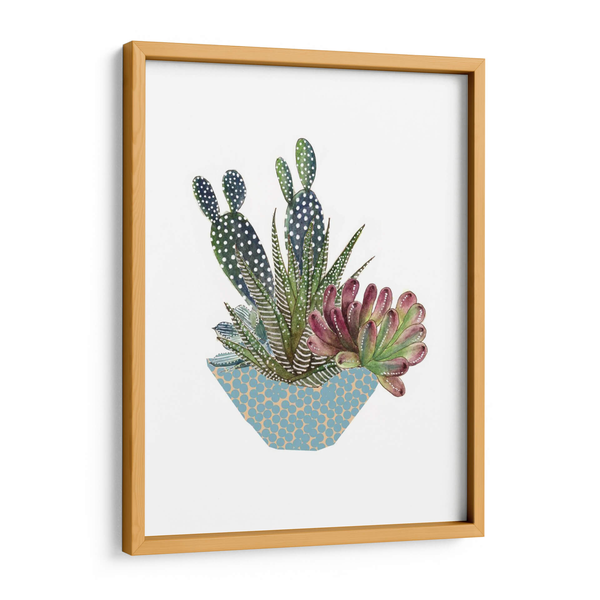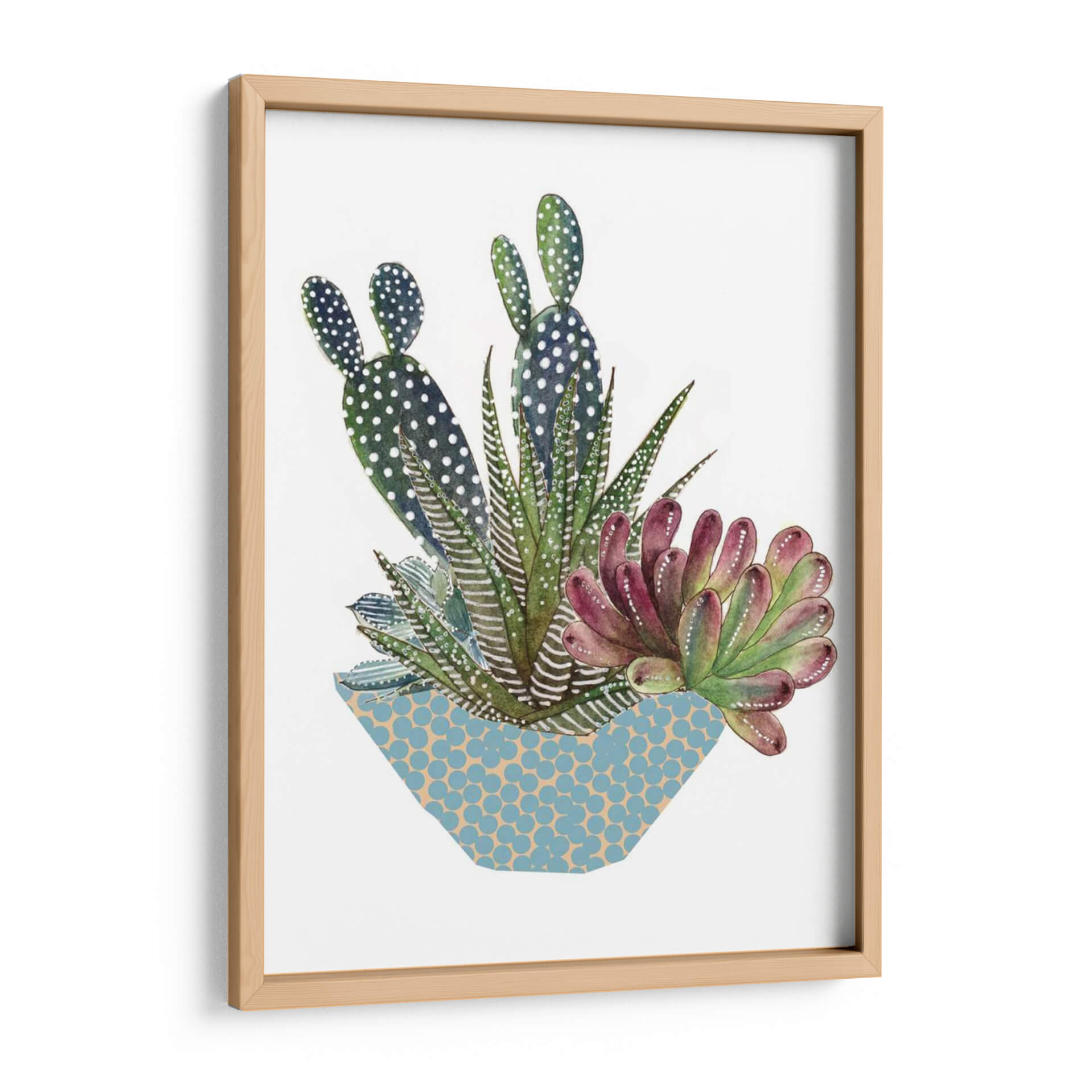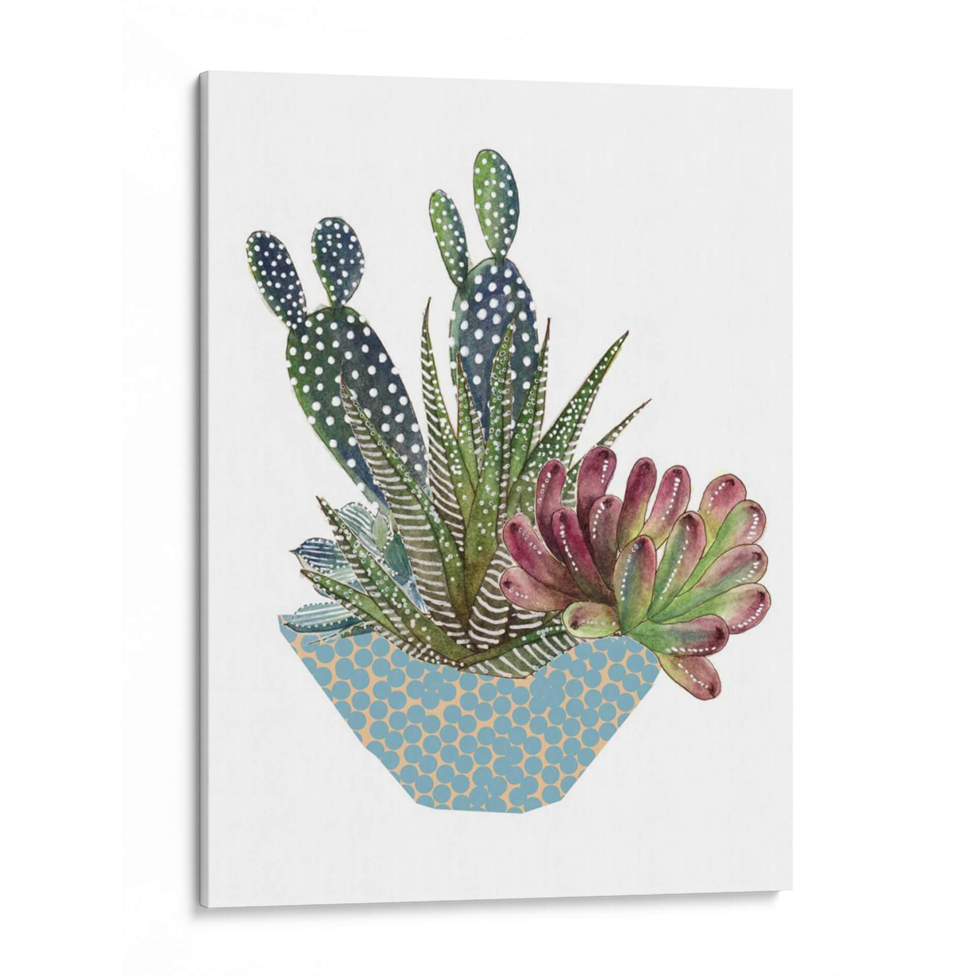 Embellece tu espacio con la delicada obra de arte 'Arreglo De Cactus I' de Melissa Wang. Esta pieza captura la belleza botánica de diversas suculentas y cactus, presentadas en un vibrante macetero azul con un patrón de puntos. La artista utiliza una técnica que evoca la acuarela, con pinceladas suaves y una paleta de colores que combina verdes profundos, tonos burdeos y toques de blanco, creando un contraste sutil pero cautivador contra el fondo neutro. La composición, centrada en el arreglo floral, irradia una sensación de calma, frescura y conexión con la naturaleza. Es una adición perfecta para quienes buscan infundir serenidad y un toque de vida a su hogar u oficina. Ideal para estilos decorativos modernos, bohemios o minimalistas, este cuadro decorativo se convierte en un punto focal encantador que aporta textura visual y un aire de sofisticación natural a cualquier habitación. Transforma tu pared en un jardín interior con esta exquisita representación artística de la resistencia y belleza de los cactus.