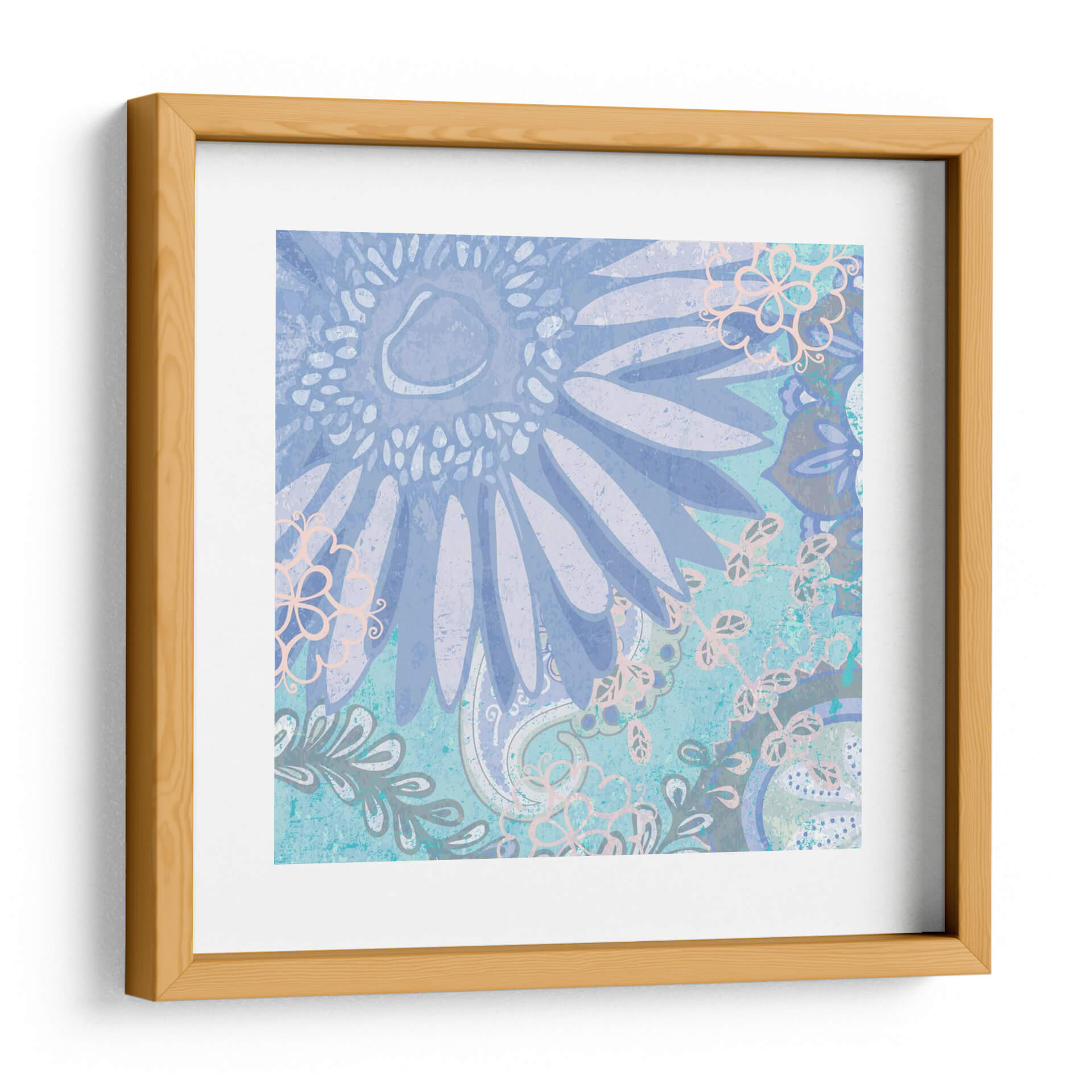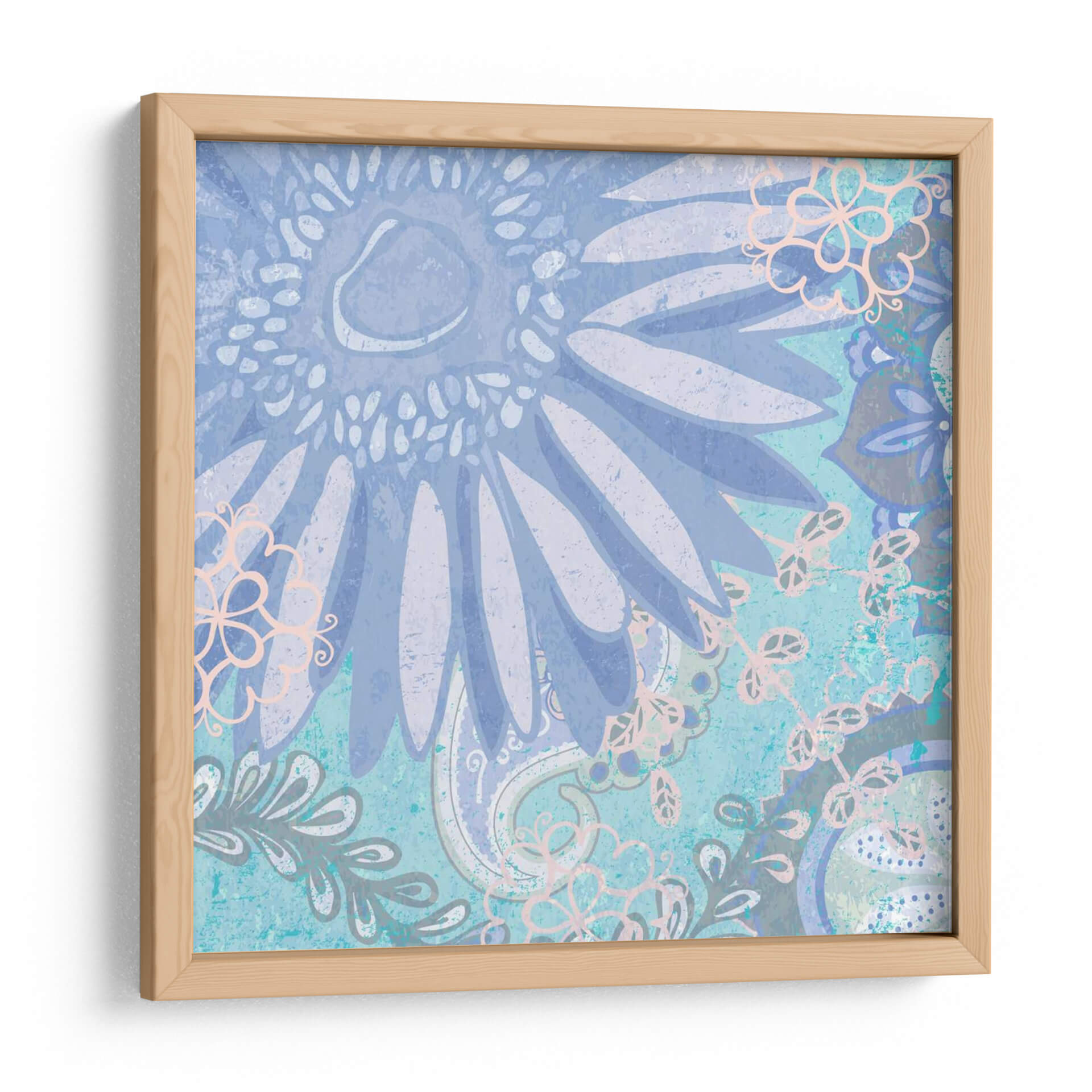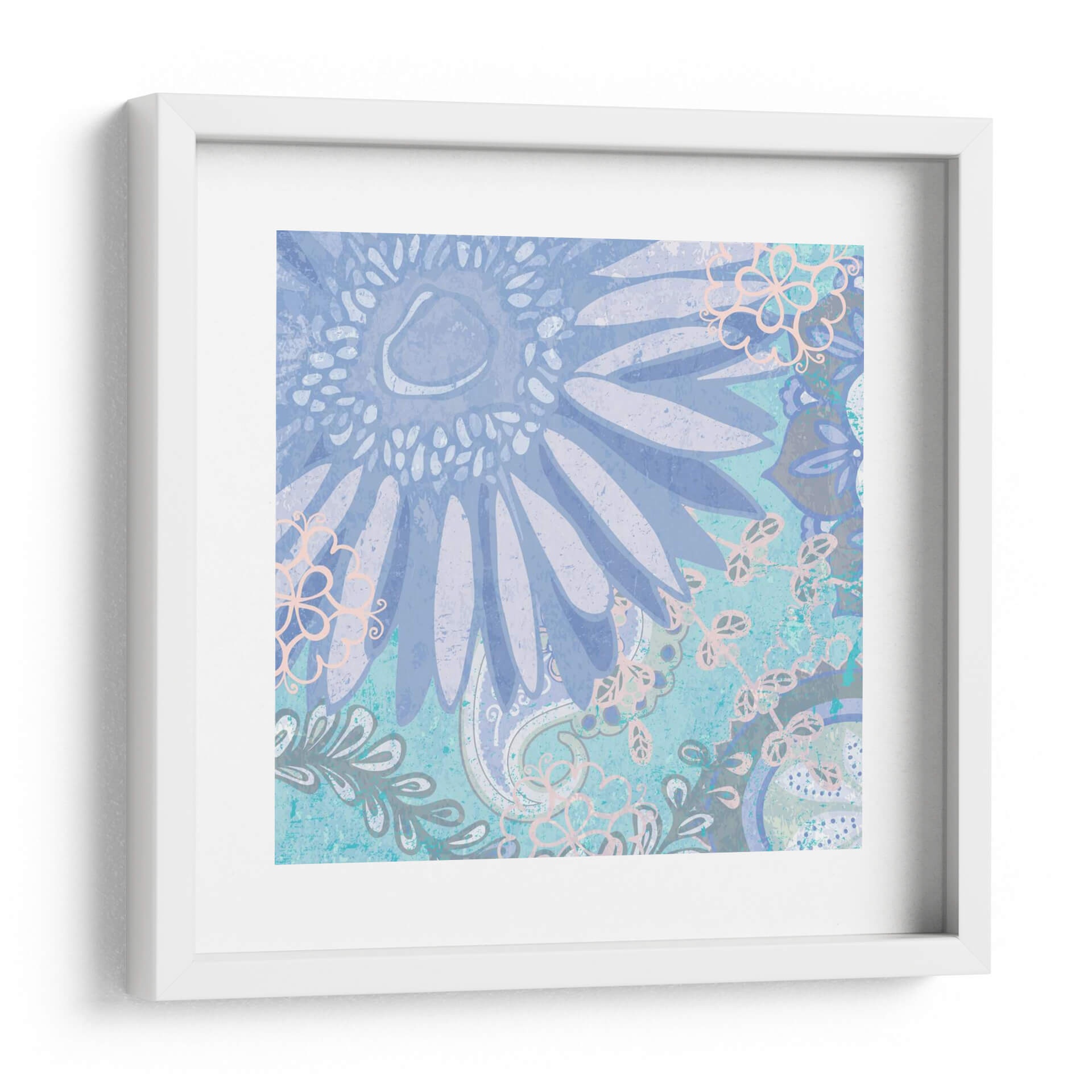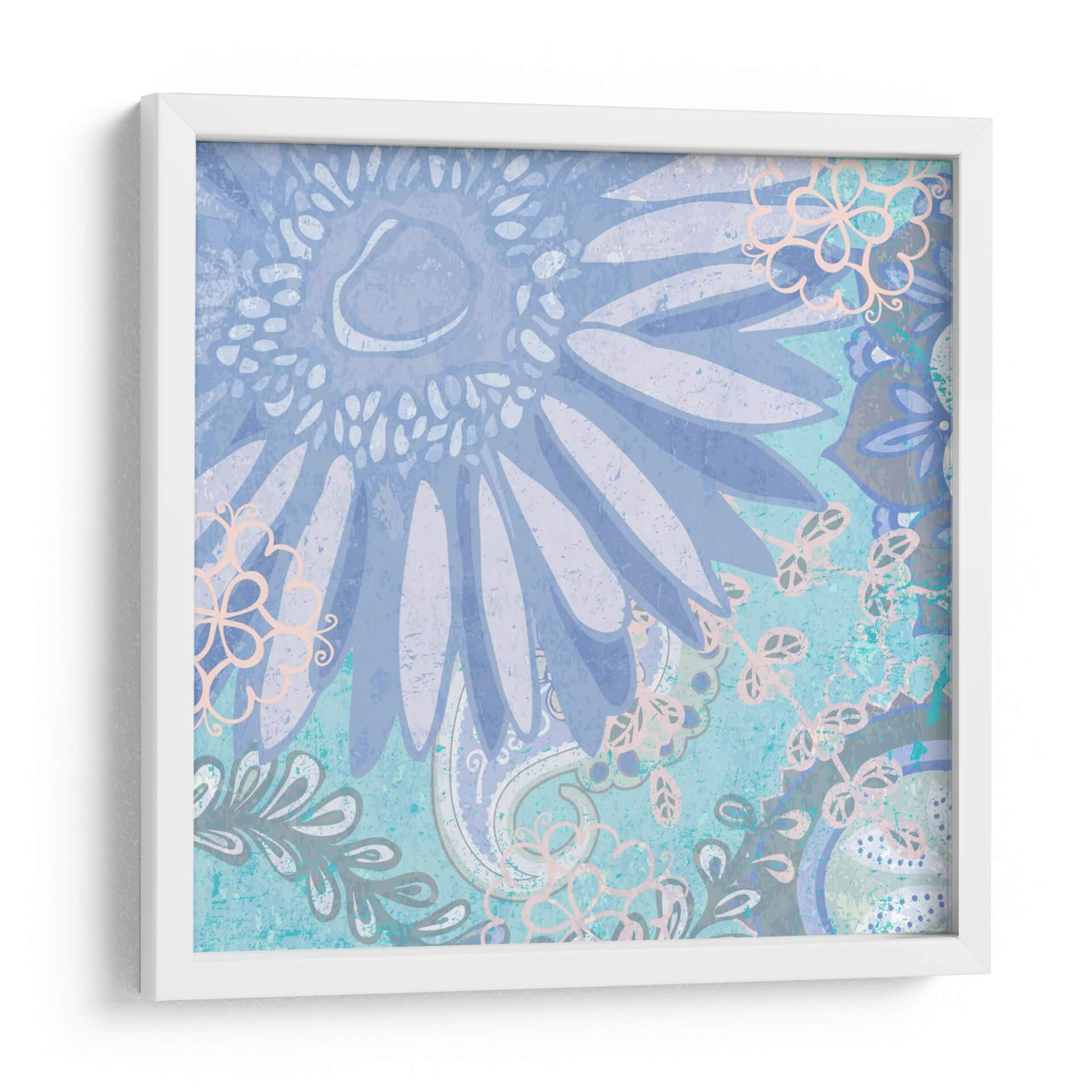 Sumérgete en la serena belleza de "Bailando Margarita Yo", una obra de arte contemporáneo de Leslie Mark que evoca calma y delicadeza. Este cuadro decorativo presenta un diseño intrincado y texturizado, dominado por tonos azules y lavandas que crean una atmósfera soñadora y relajante. La composición se centra en una gran flor central, reminiscent de una margarita, rodeada de elementos botánicos y patrones paisley en un estilo que fusiona lo orgánico con lo decorativo. Los toques sutiles de rosa pálido y gris añaden profundidad y un toque de sofisticación. La técnica visual, con su aparente textura de lienzo o papel envejecido, aporta una calidez y un carácter únicos, haciendo que esta pieza sea perfecta para añadir un toque de elegancia tranquila a tu dormitorio, sala de estar o estudio. "Bailando Margarita Yo" es más que una simple decoración; es una invitación a la contemplación y a la apreciación de la belleza sutil de la naturaleza, un elemento decorativo que transformará cualquier espacio en un oasis de paz y estilo. Ideal para quienes buscan arte de pared que inspire serenidad y eleve el ambiente de su hogar.