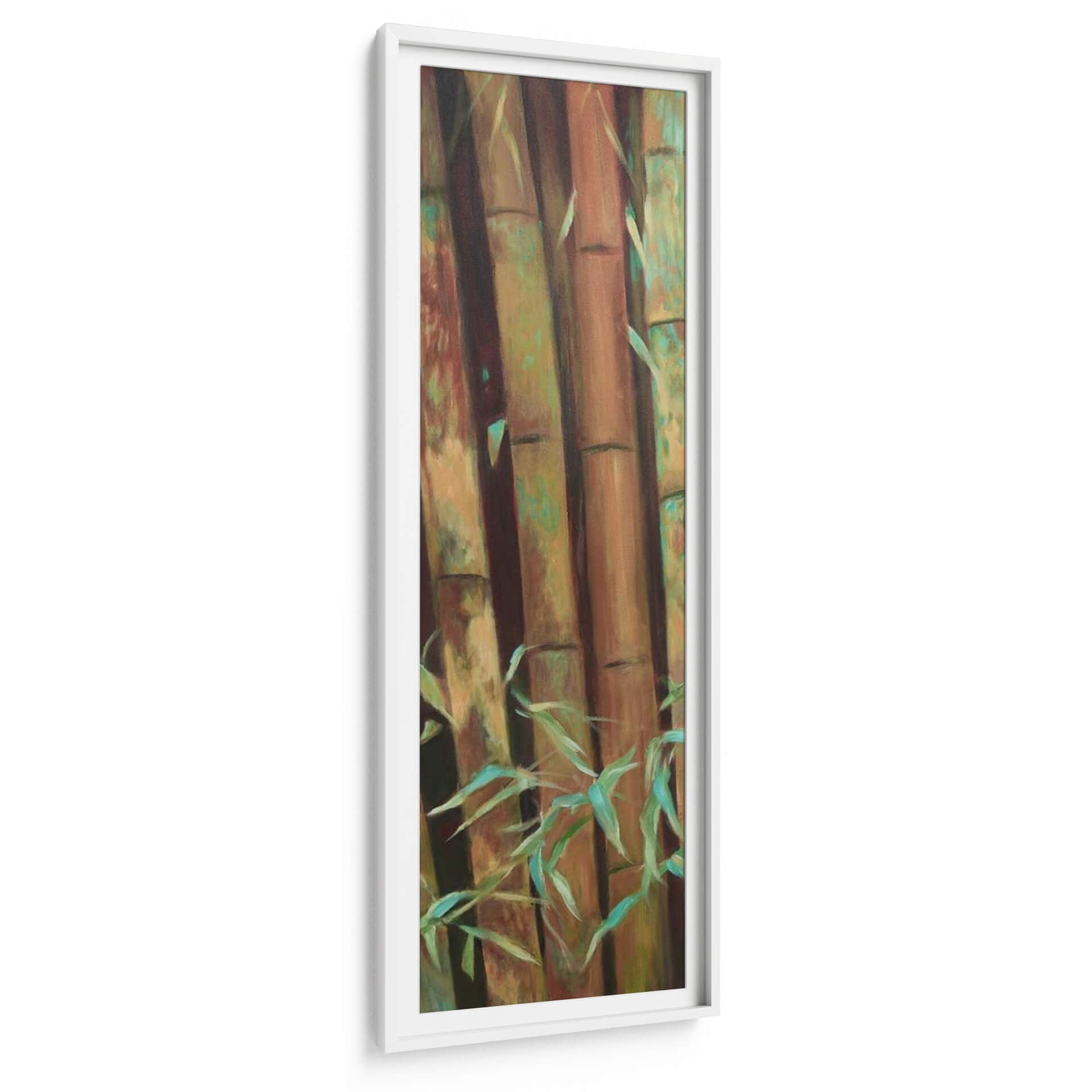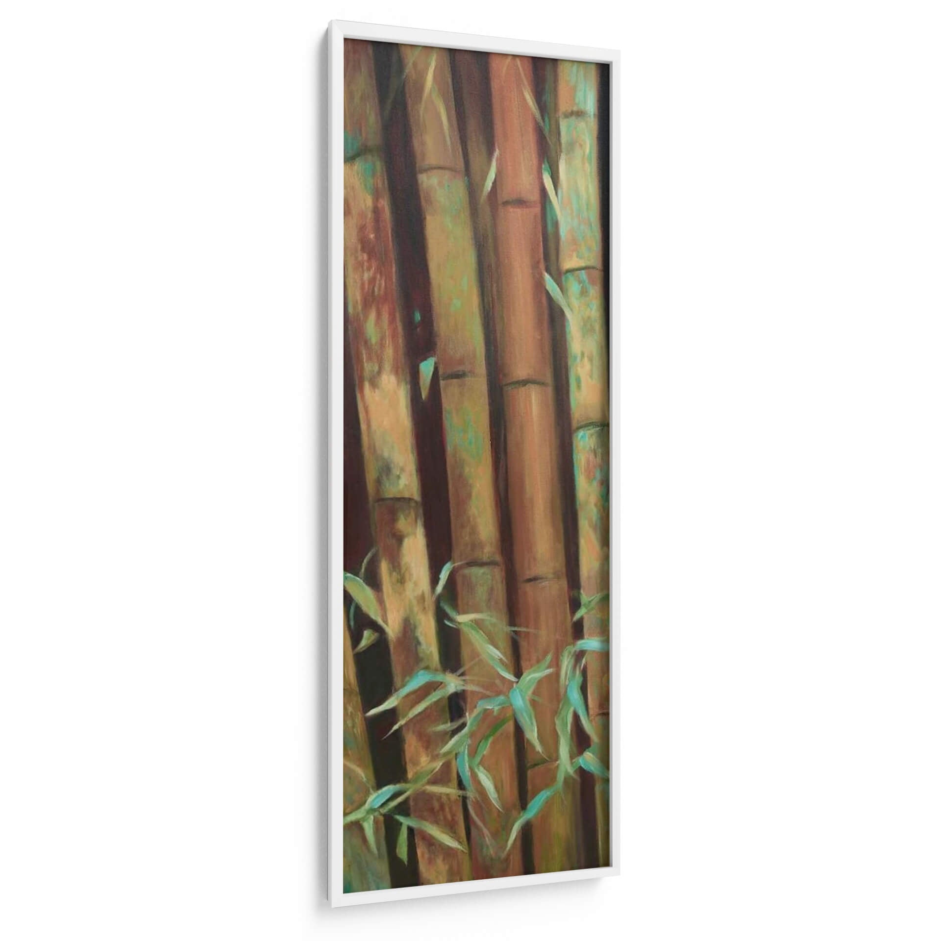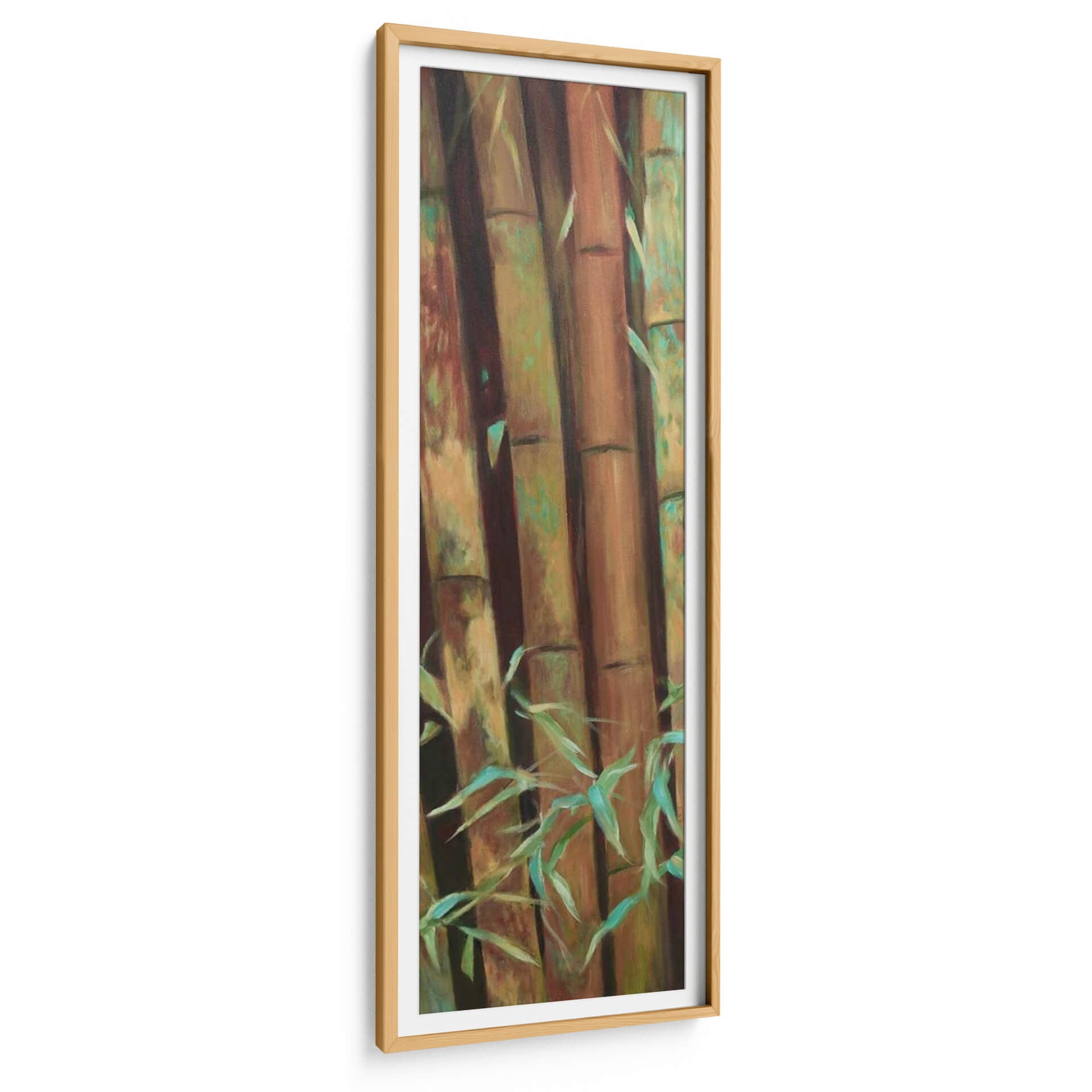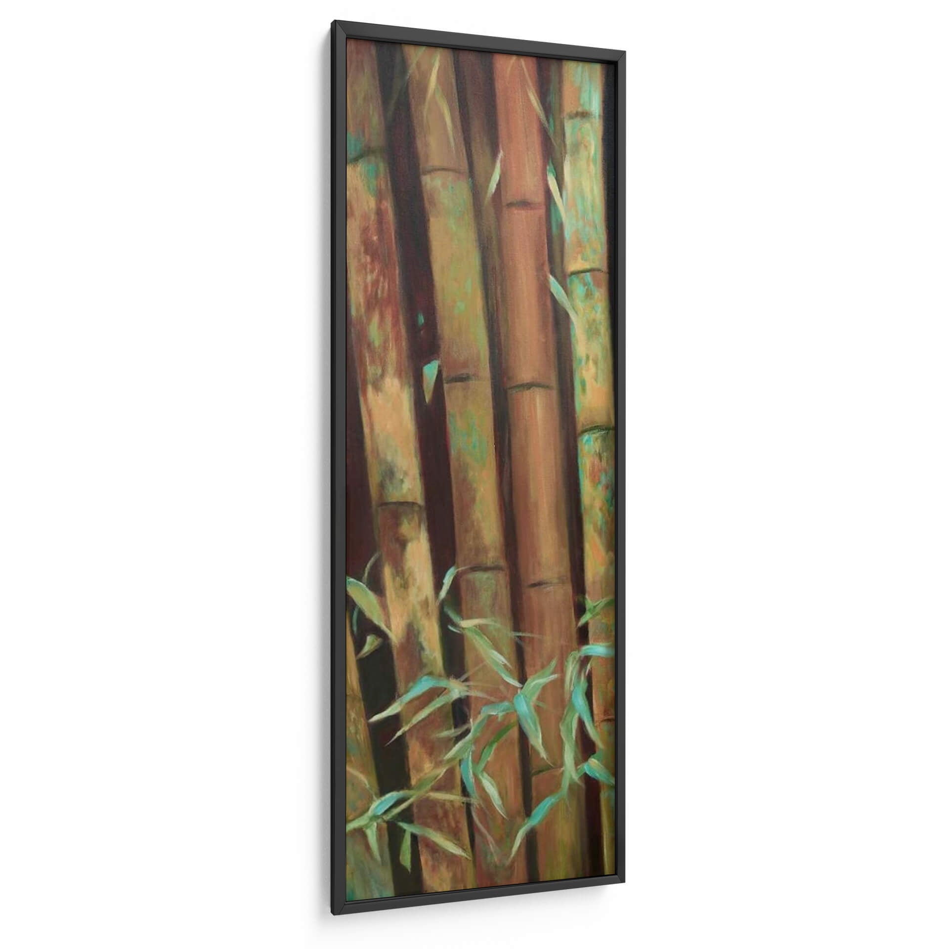 Sumérgete en la serenidad natural con "Bambú Final I", una obra de arte contemporáneo que captura la esencia de los cañaverales con una paleta de colores cálidos y terrosos, realzada por toques vibrantes de verde azulado. La artista Suzanne Wilkins presenta un estudio detallado de los tallos de bambú, utilizando pinceladas expresivas y una composición vertical que evoca crecimiento y estabilidad. Los tonos rojizos y dorados del bambú contrastan delicadamente con las hojas etéreas en tonos turquesa, creando una atmósfera de calma y contemplación. Este cuadro decorativo es perfecto para añadir un toque de naturaleza y sofisticación a cualquier espacio, desde salones modernos hasta estudios zen. Su estilo pictórico invita a la reflexión, transformando una escena botánica en una experiencia emocional. "Bambú Final I" no es solo una pieza decorativa, sino una ventana a la tranquilidad, ideal para quienes buscan una conexión visual con la armonía del mundo natural. Su formato alargado lo hace ideal para pasillos, o como un acento vertical que estiliza y eleva la decoración de tu hogar u oficina, aportando una sensación de paz y equilibrio.